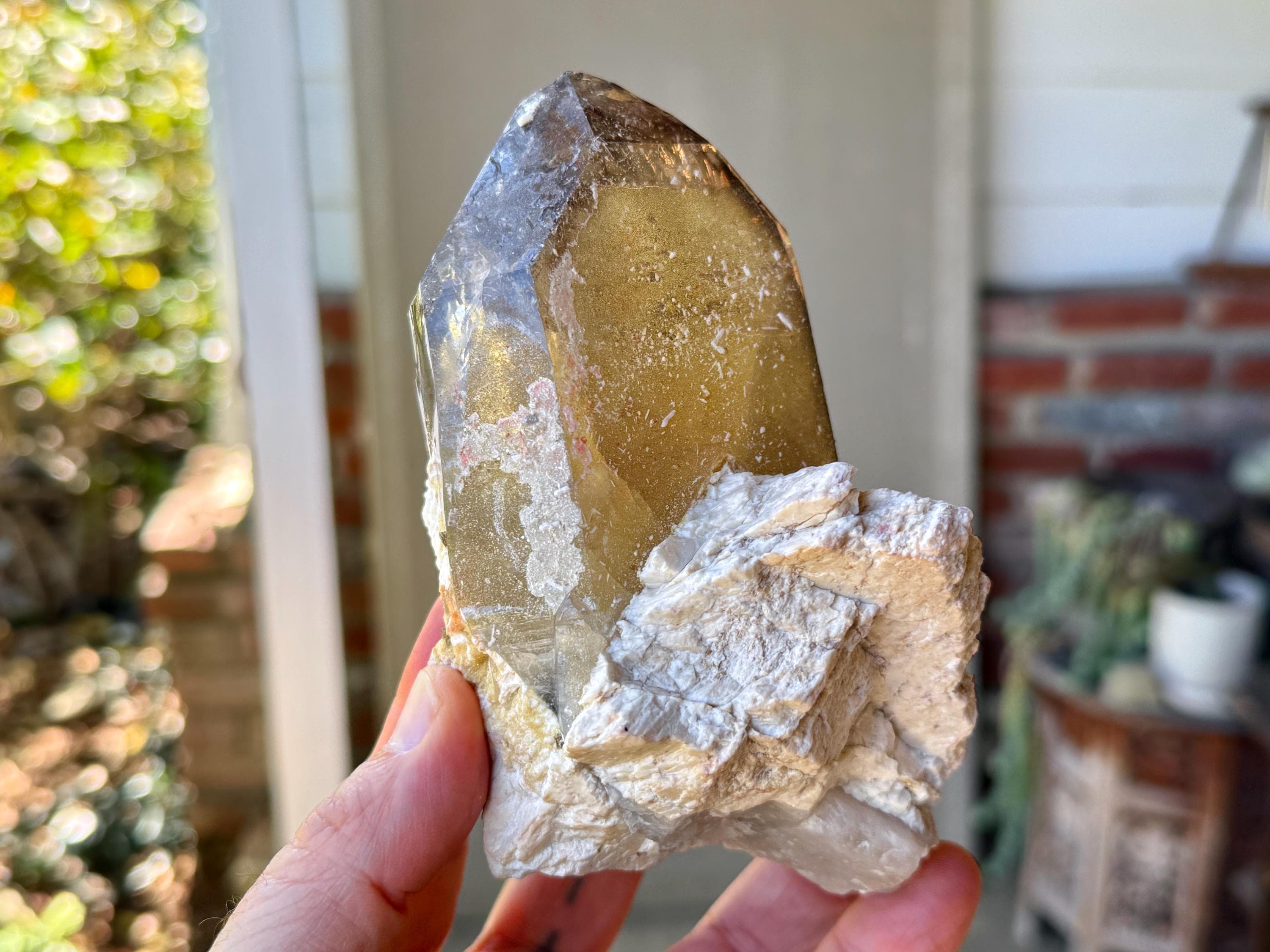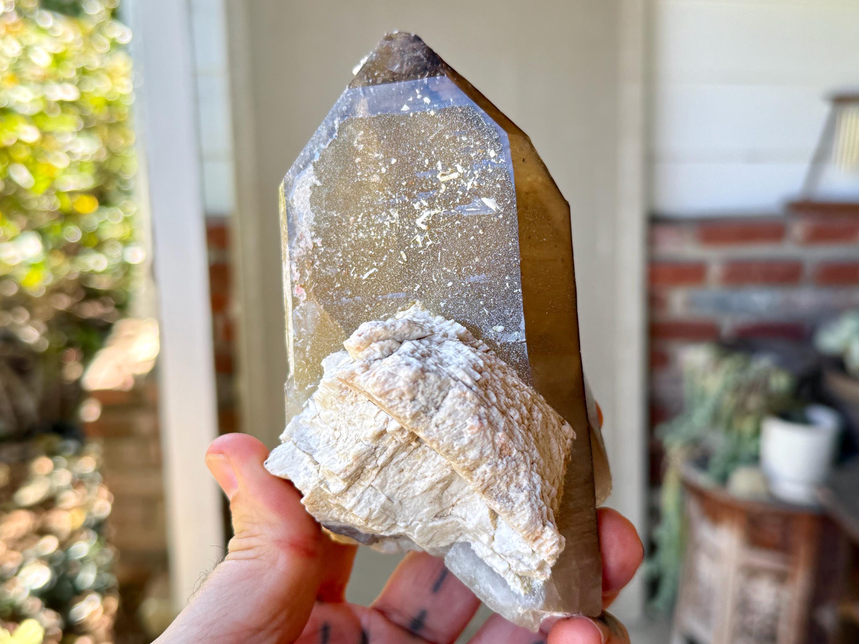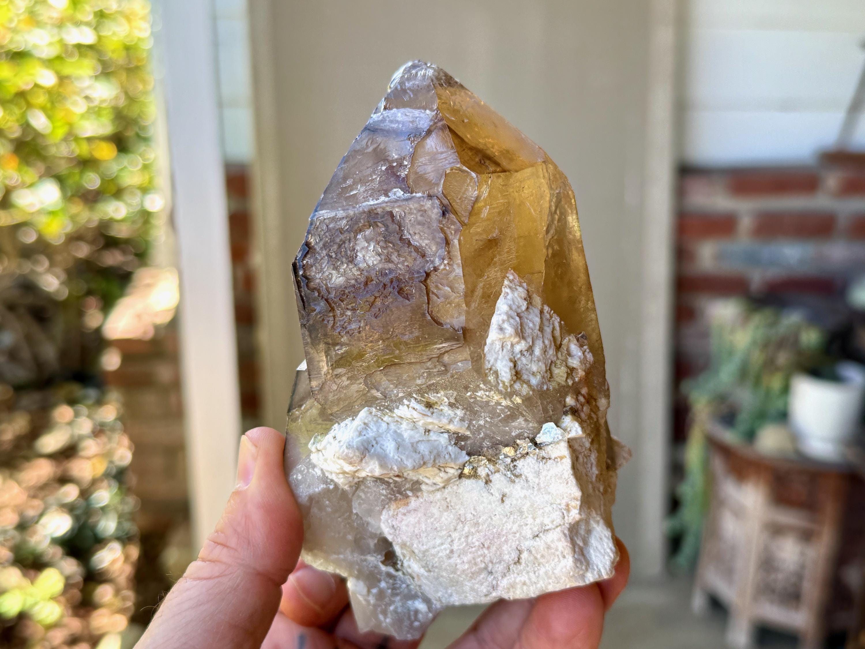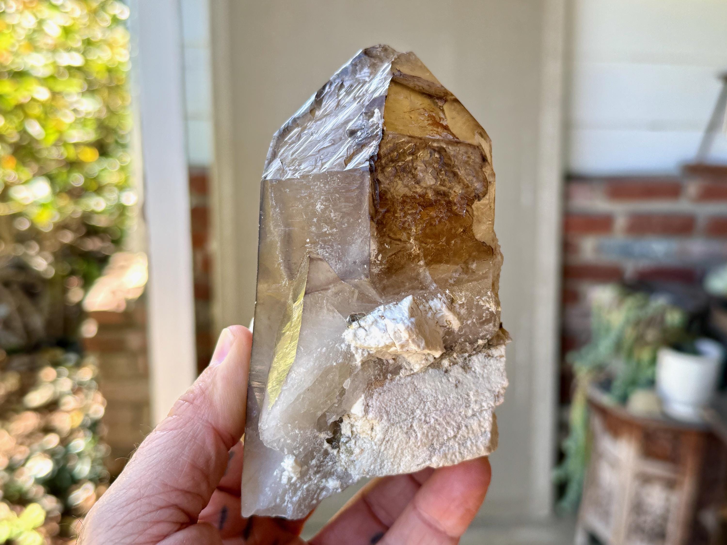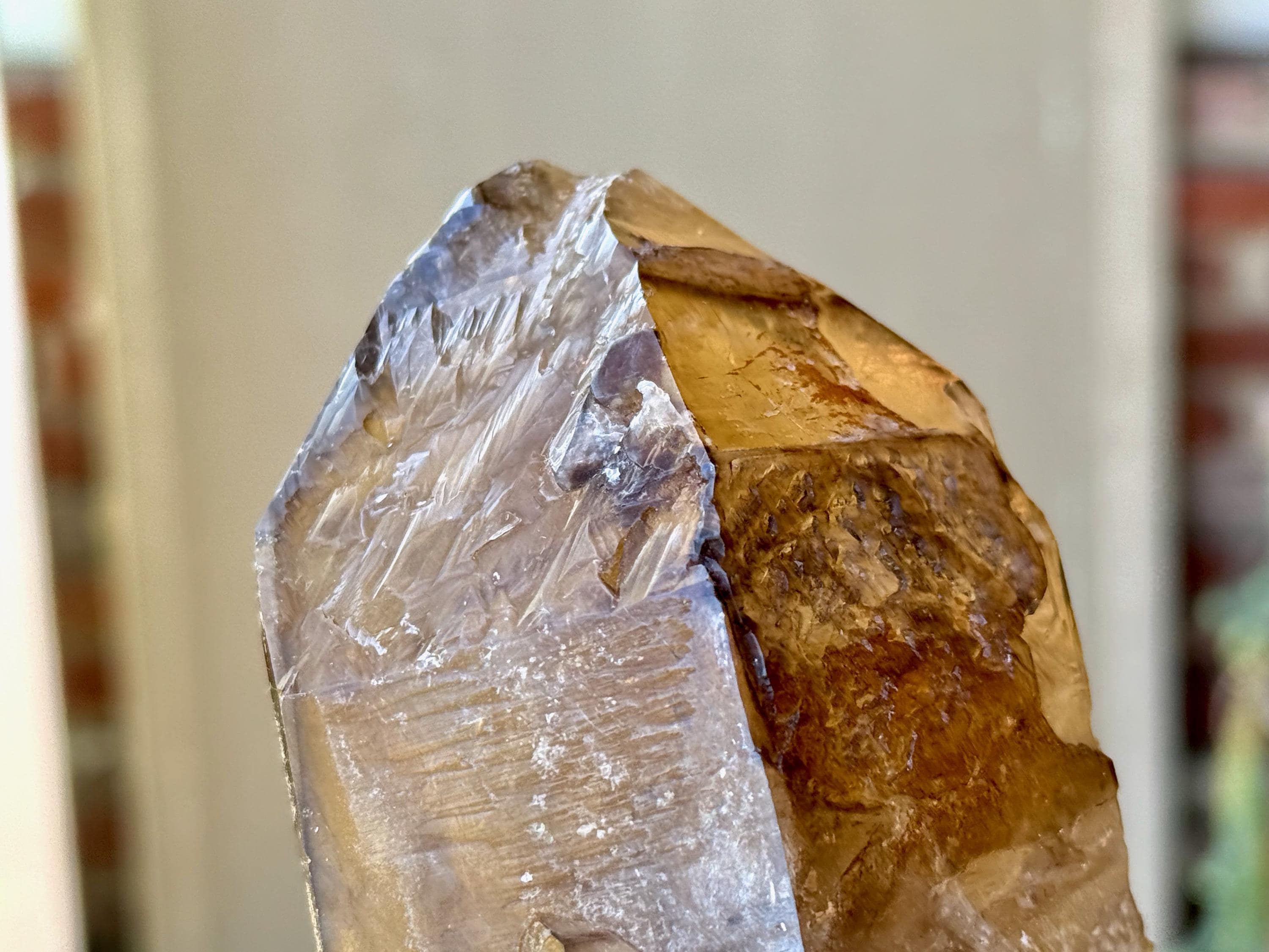 This is a large and lustrous, all-natural Smoky Citrine crystal with a broad formation and so many natural etchings on both its body and main facet area. These etchings and textures intermingle with the smoky highlights and golden tones of the crystal, giving it so much depth and contrast.