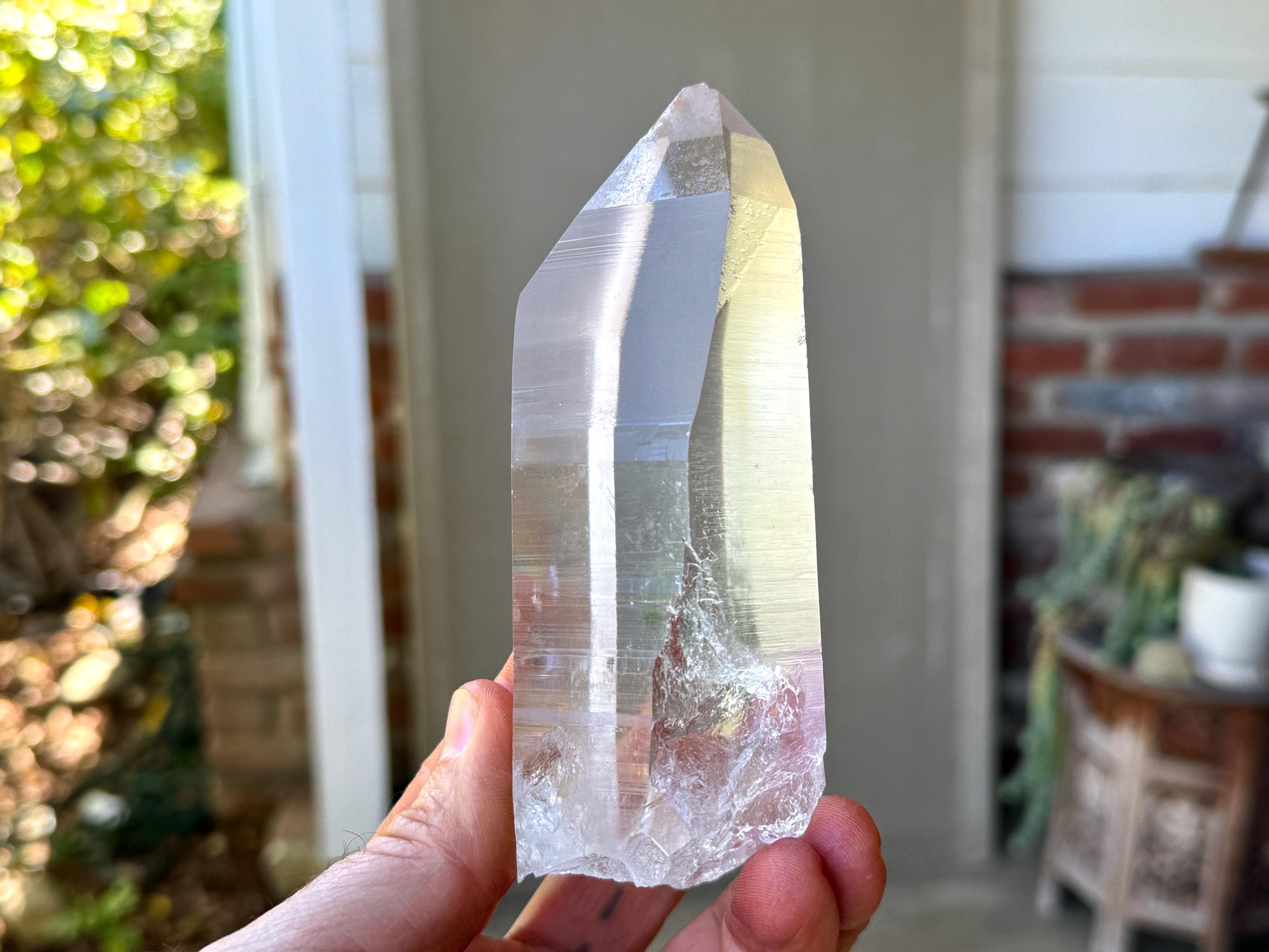 What's most unique about this piece, however, is the inclusion of mossy Green Chlorite suspended near the base of the crystal inside. This is the only crystal from this collection we've seen with this inclusion. You may also detect a *very* mild pinkish tinge at the top, characteristic of the crystals from this find.