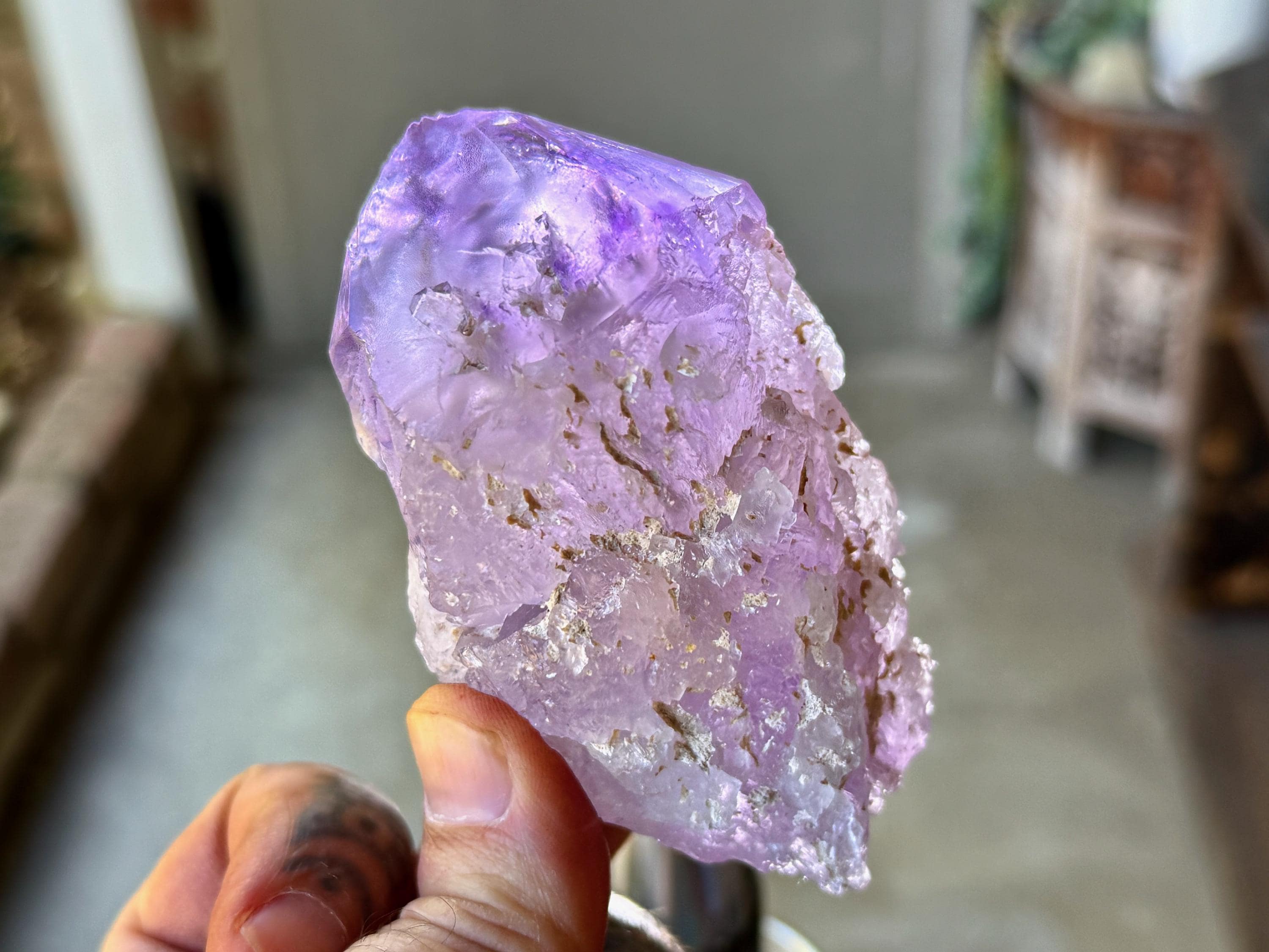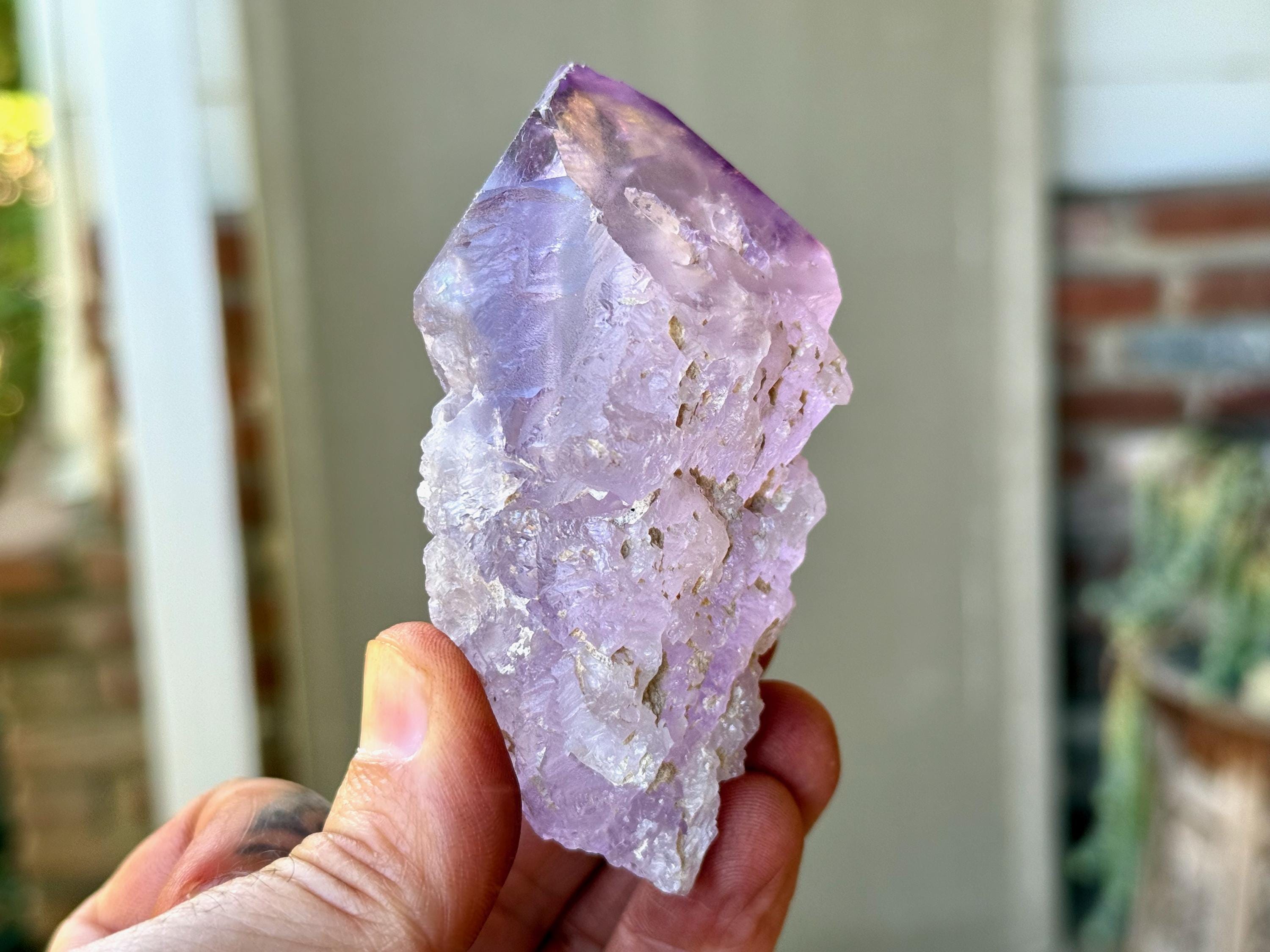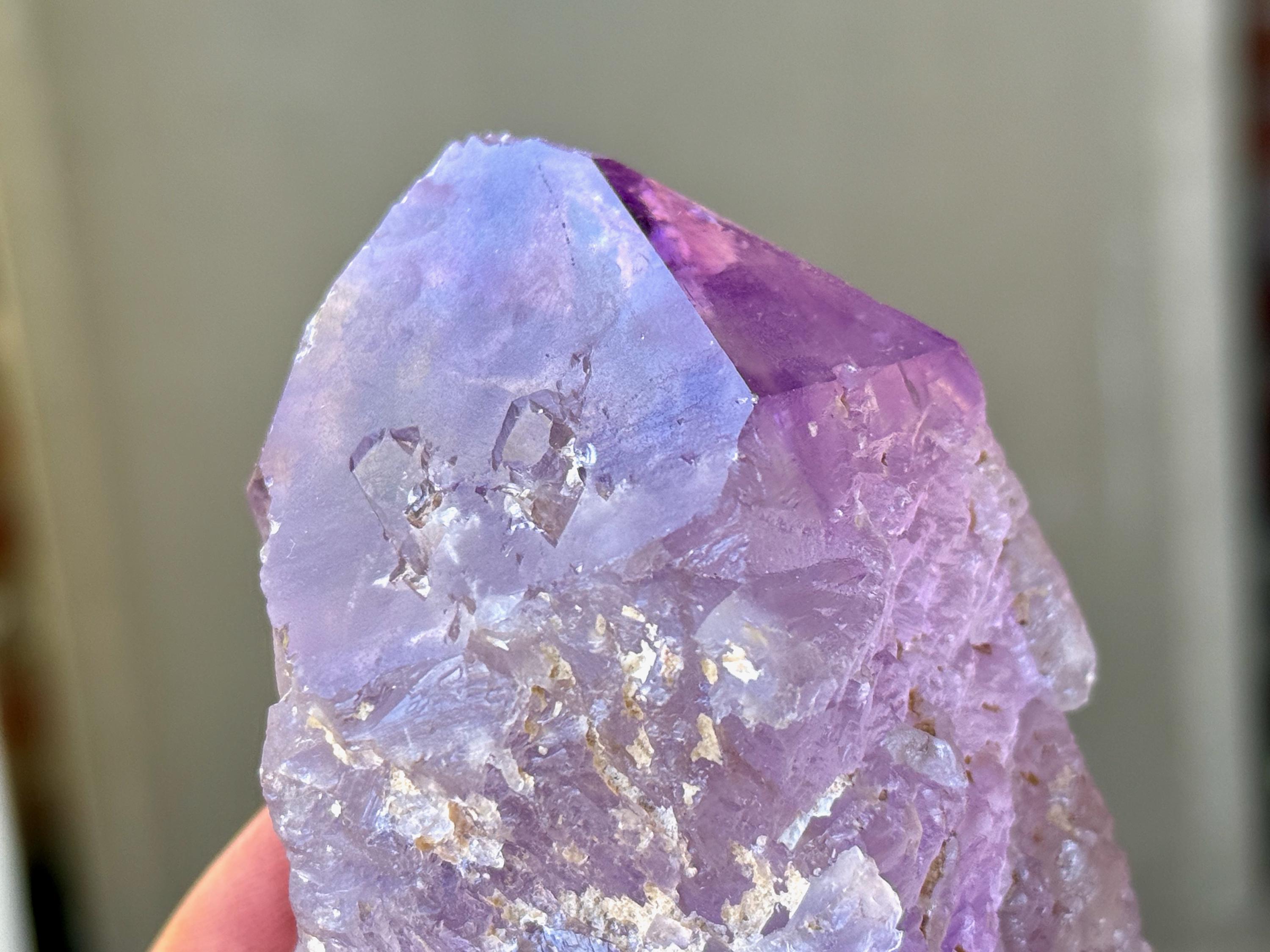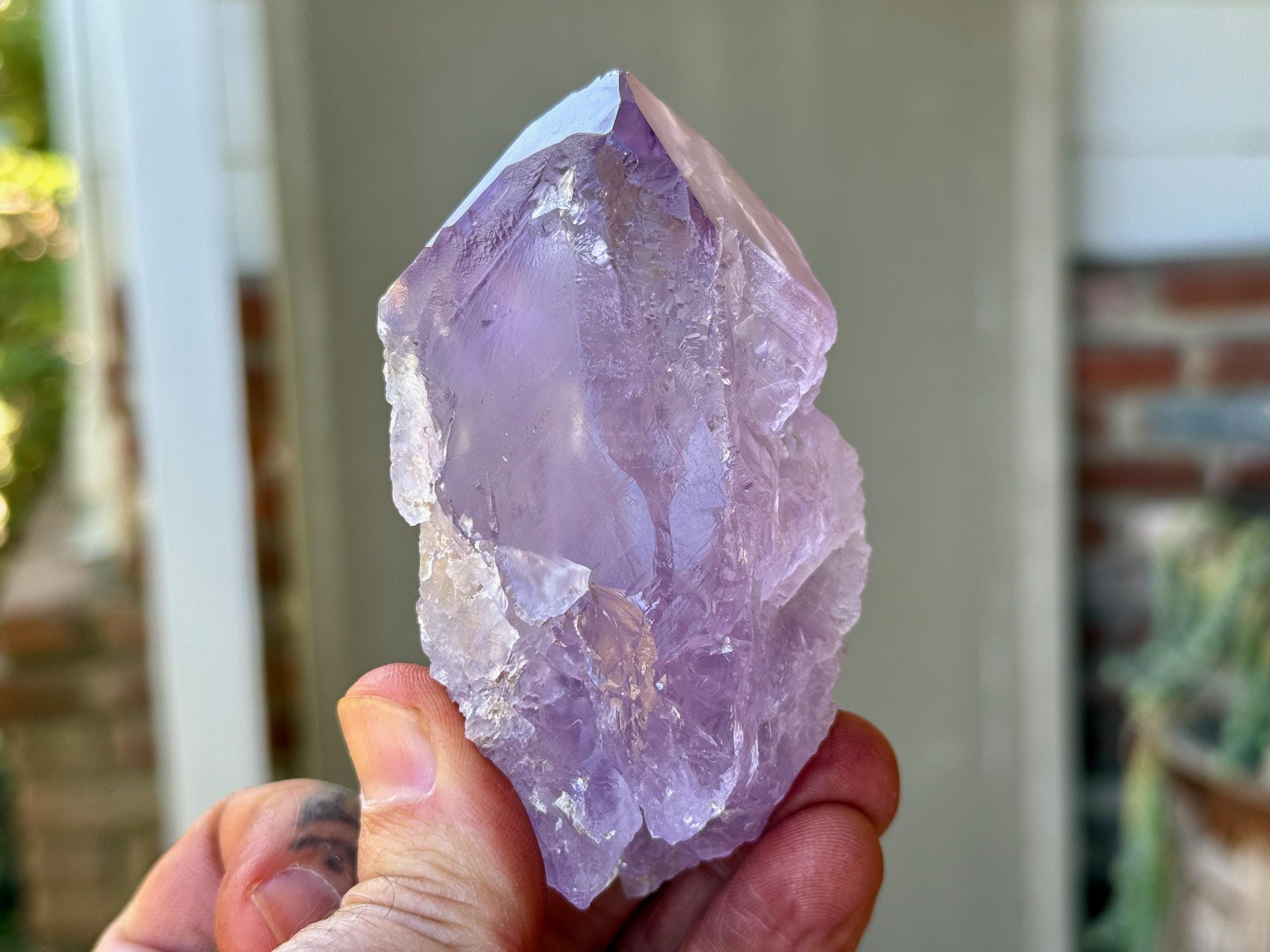 This piece has a vibrant lilac hue that is especially saturated in the main facet area. When backlit, as in Photos 3-5, this crystal lights up brilliantly!