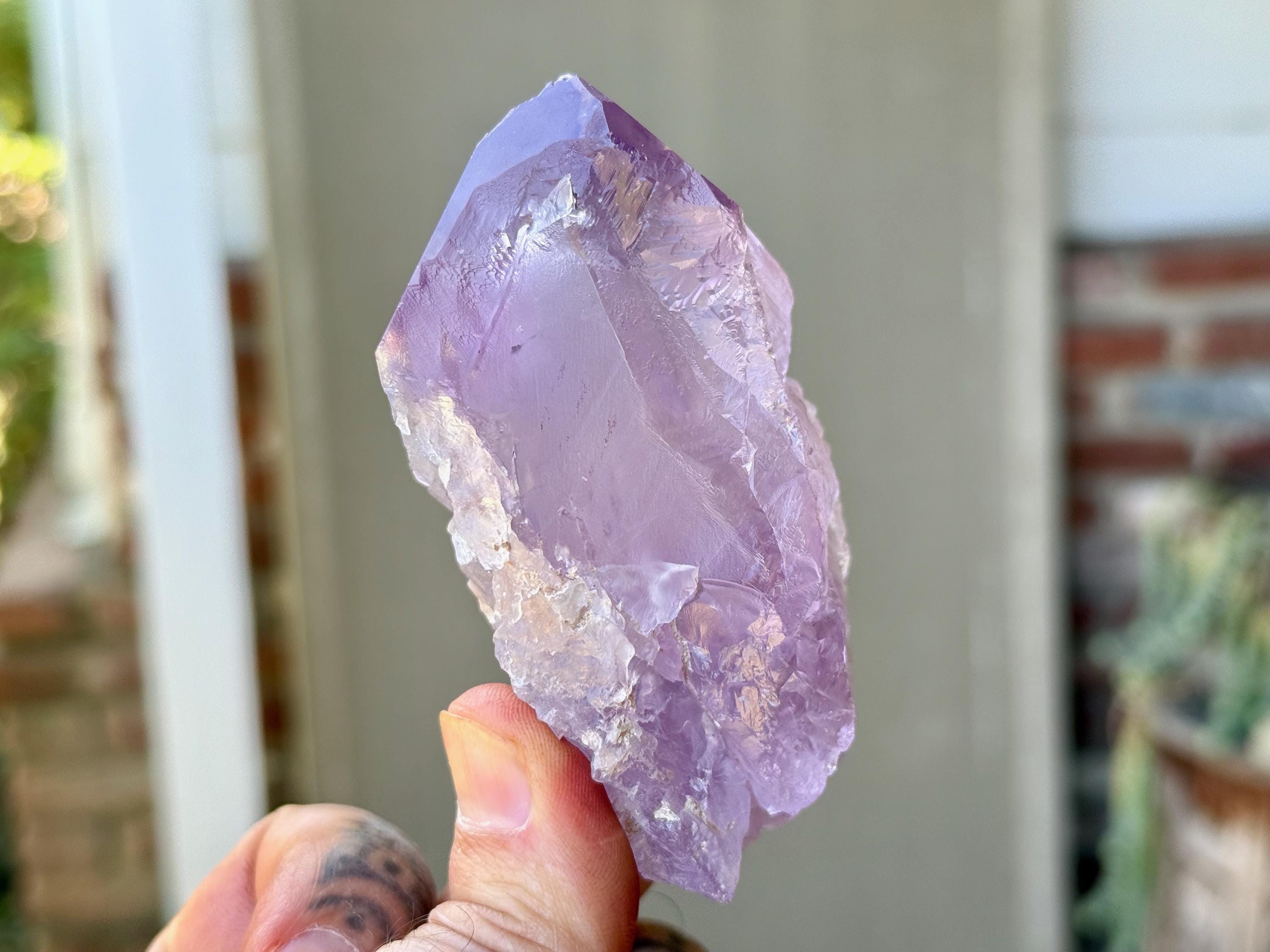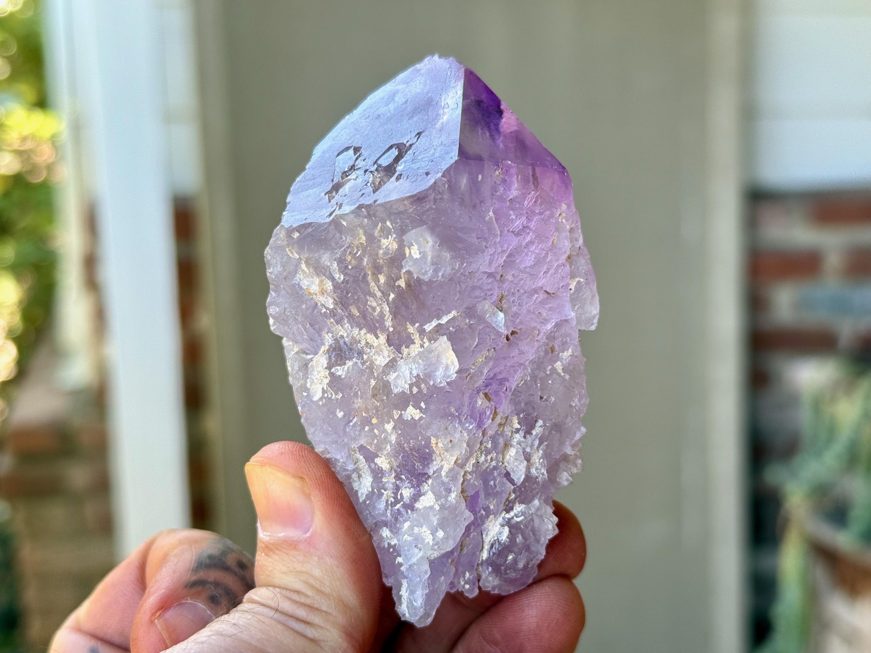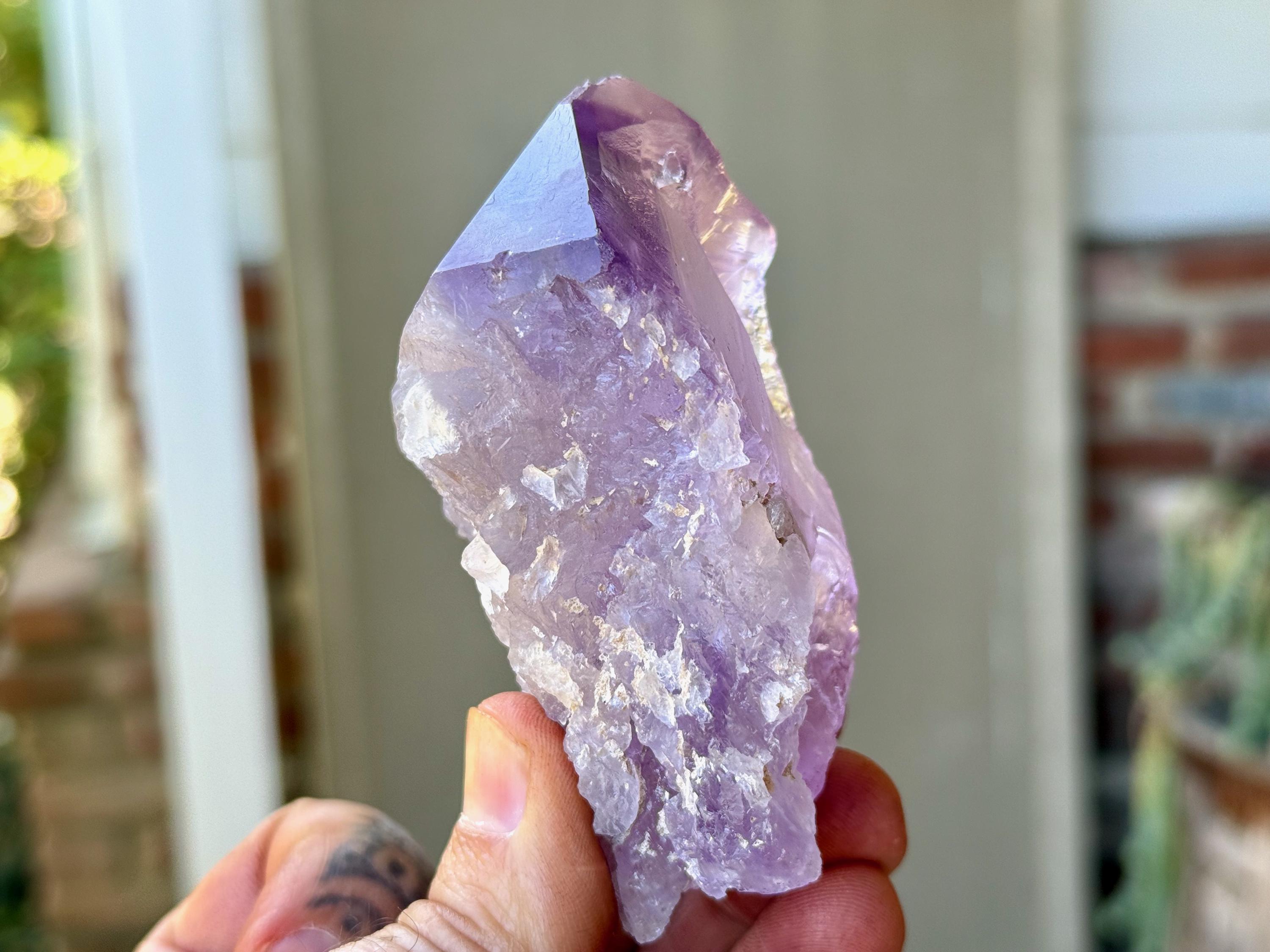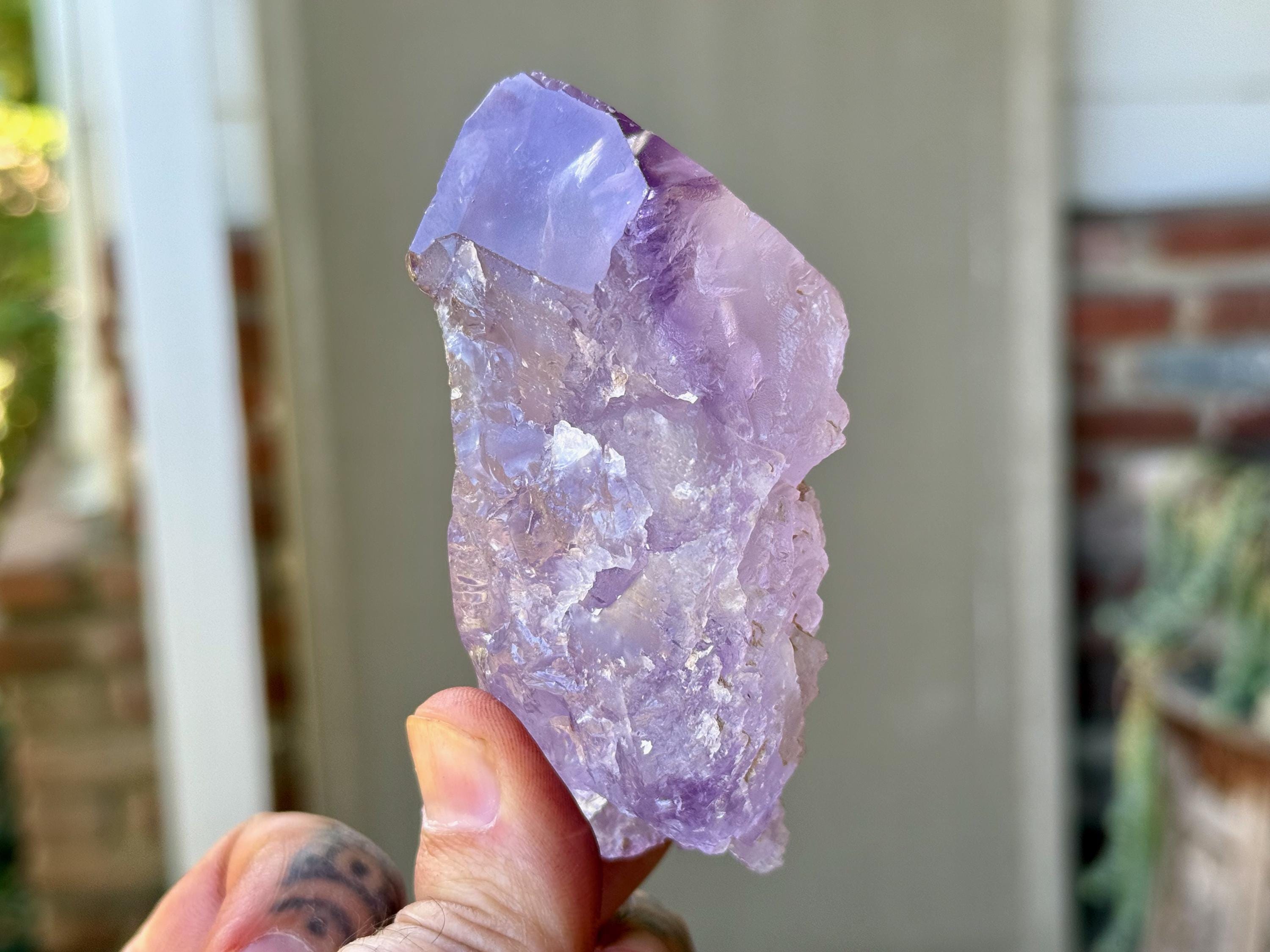 This piece has a vibrant lilac hue that is especially saturated in the main facet area. When backlit, as in Photos 3-5, this crystal lights up brilliantly!