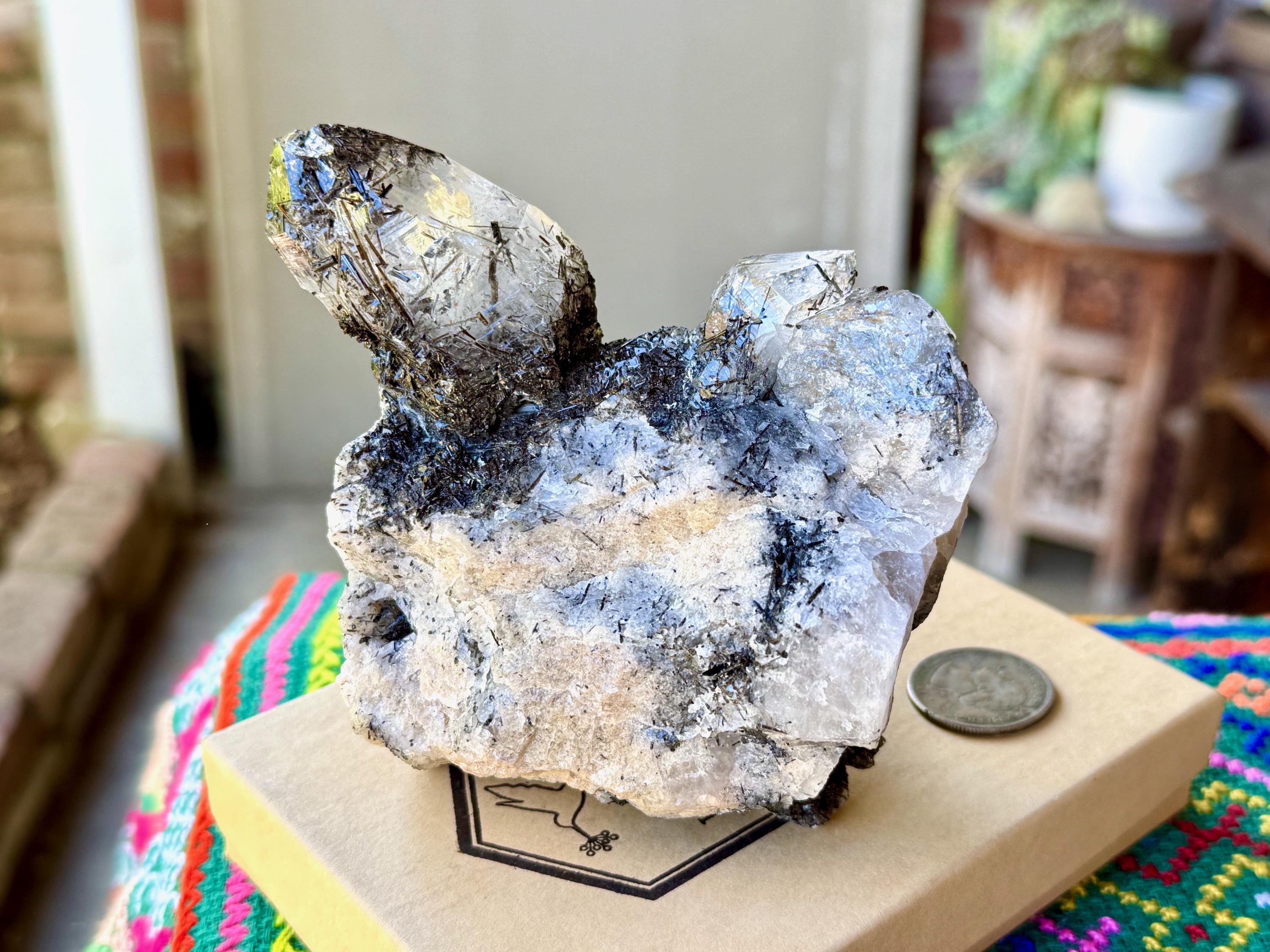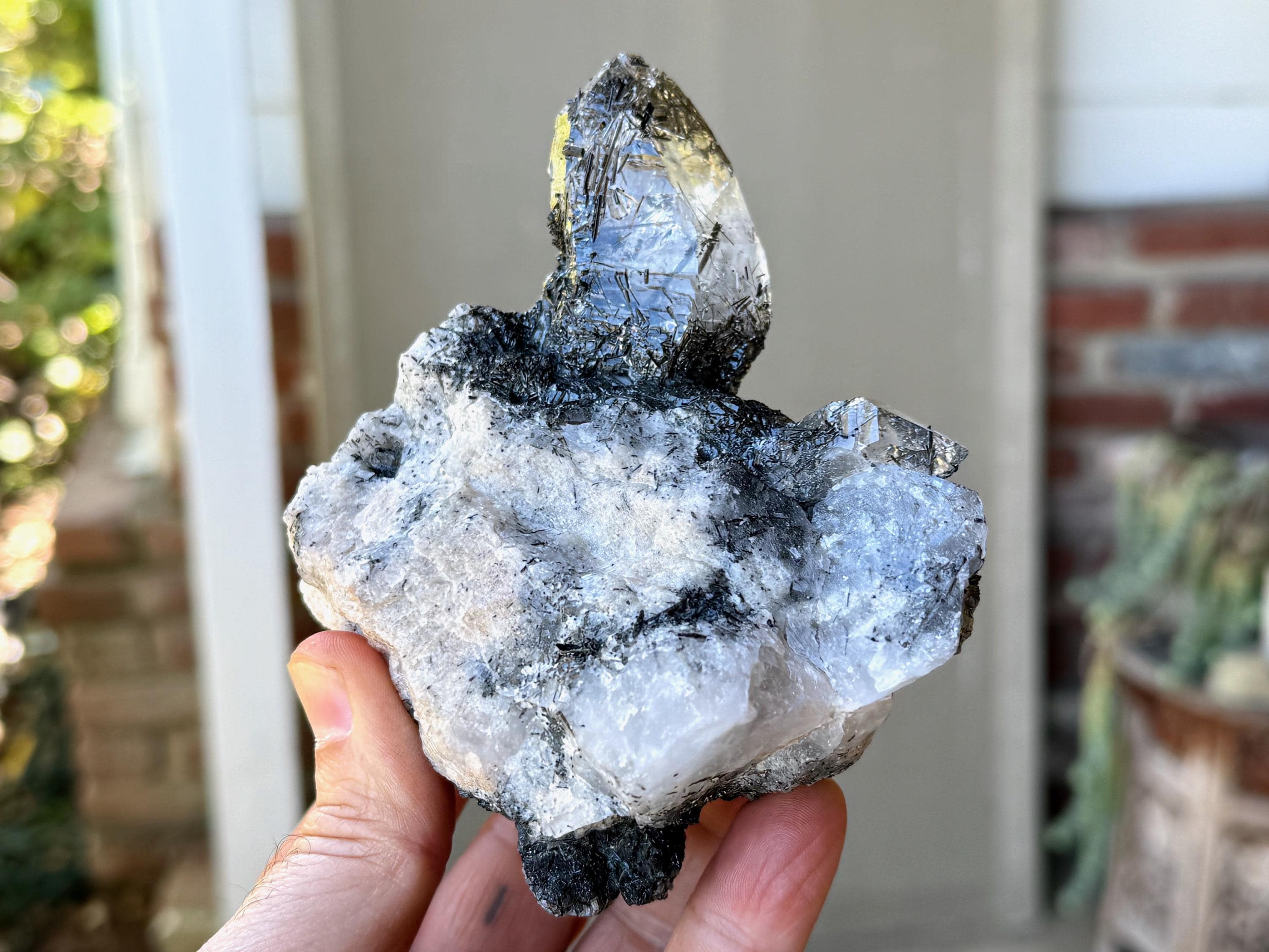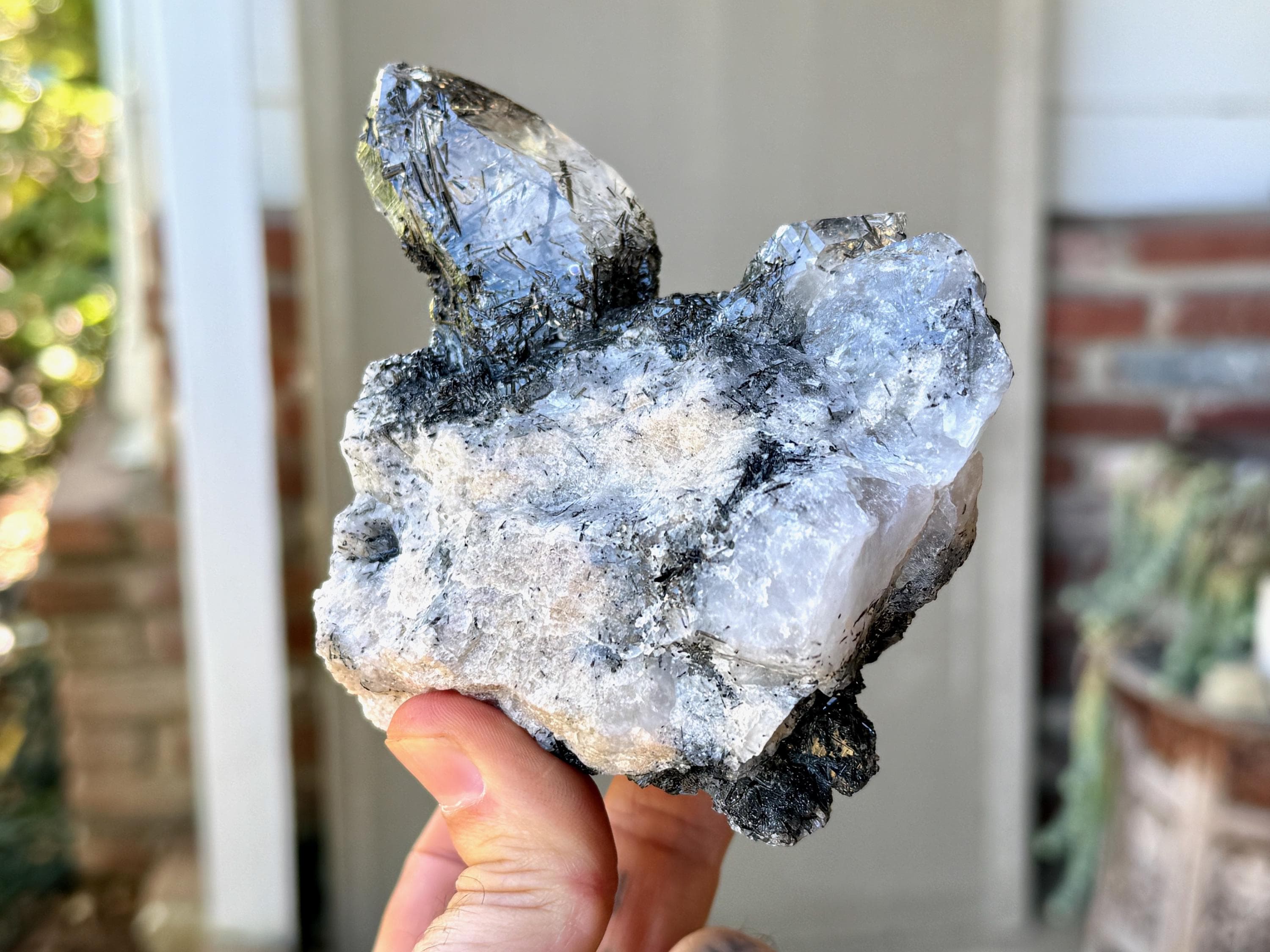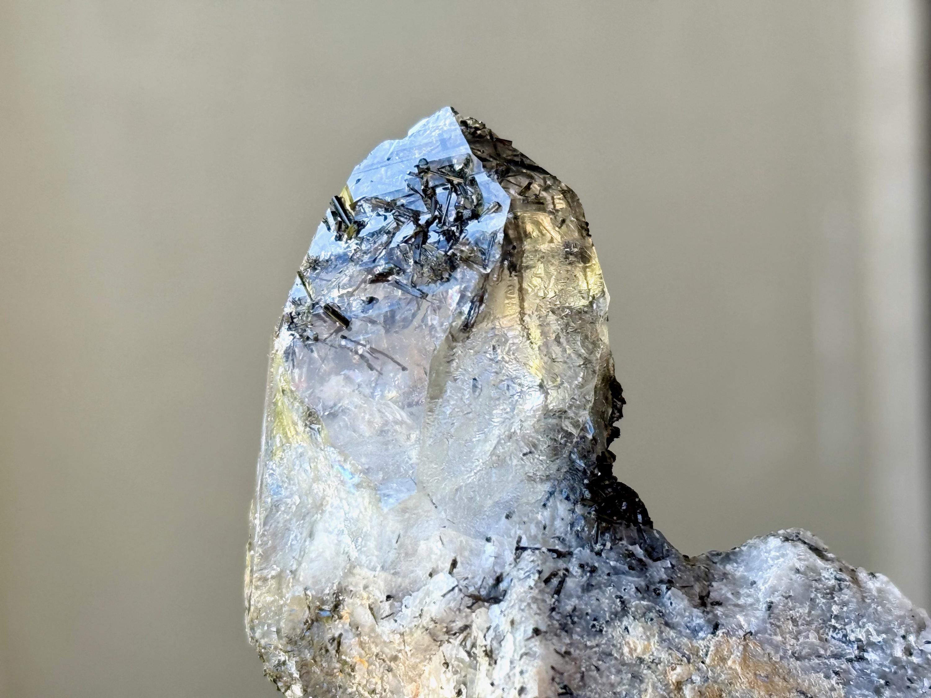 The luster of the Quartz, in combination with the dark elegance of the Dravite inclusions is magnificent. The terminations on the Quartz are excellent. It's a rare one and a true stunner for display.