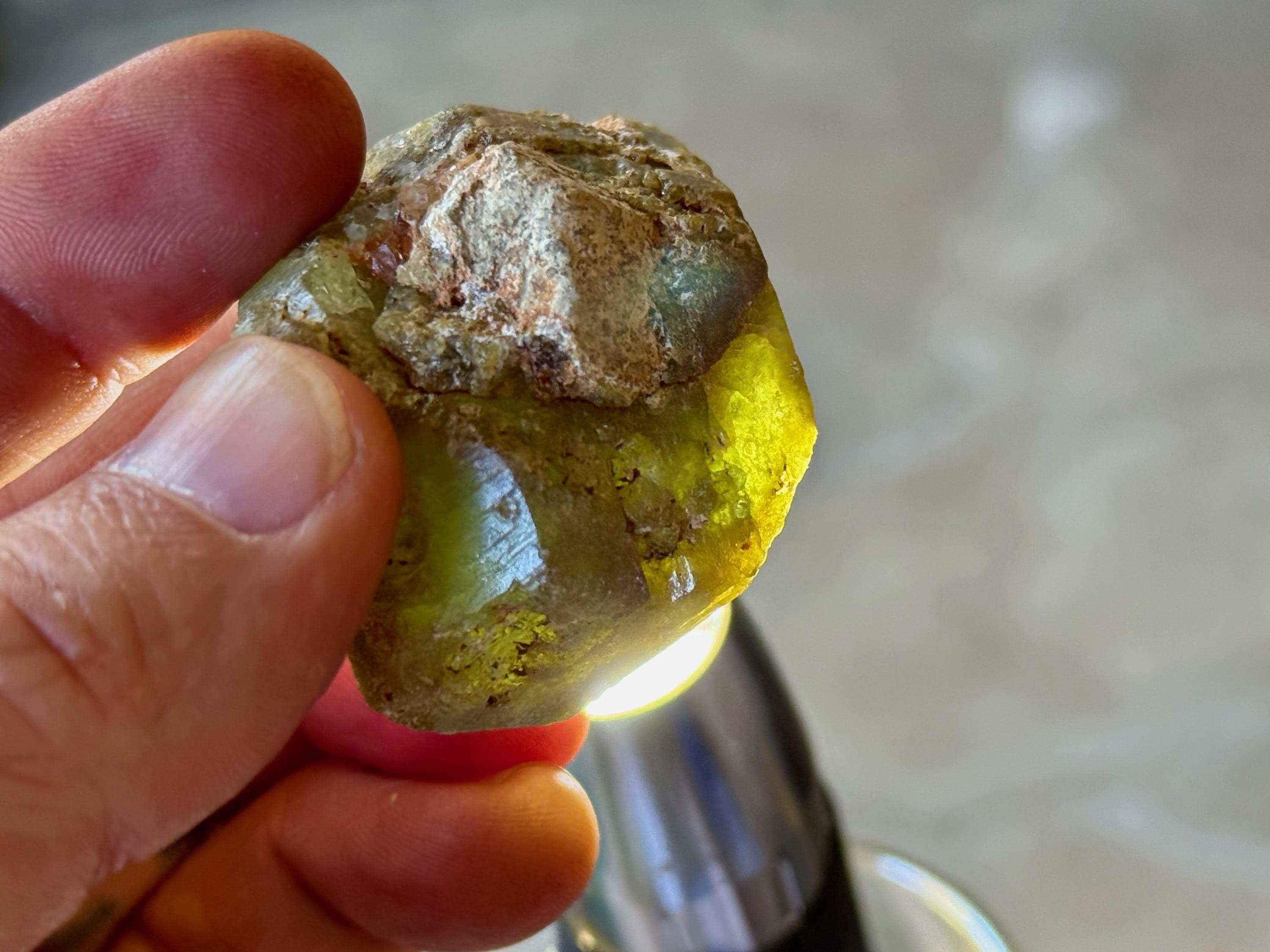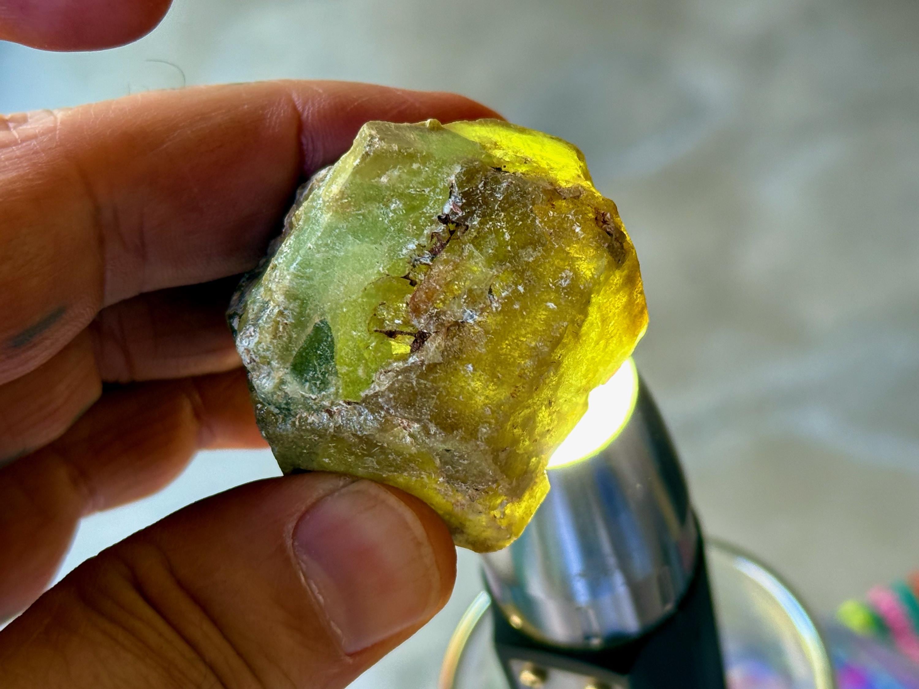 This spectacular Green Garnet possesses a vibrant olive green hue with hints of yellow overgrowth and even some orange in some areas. It features a lustrous and almost waxy complexion that is so unique! When backlit, we can see that it passes light nicely around the edges (Photos 2-4).