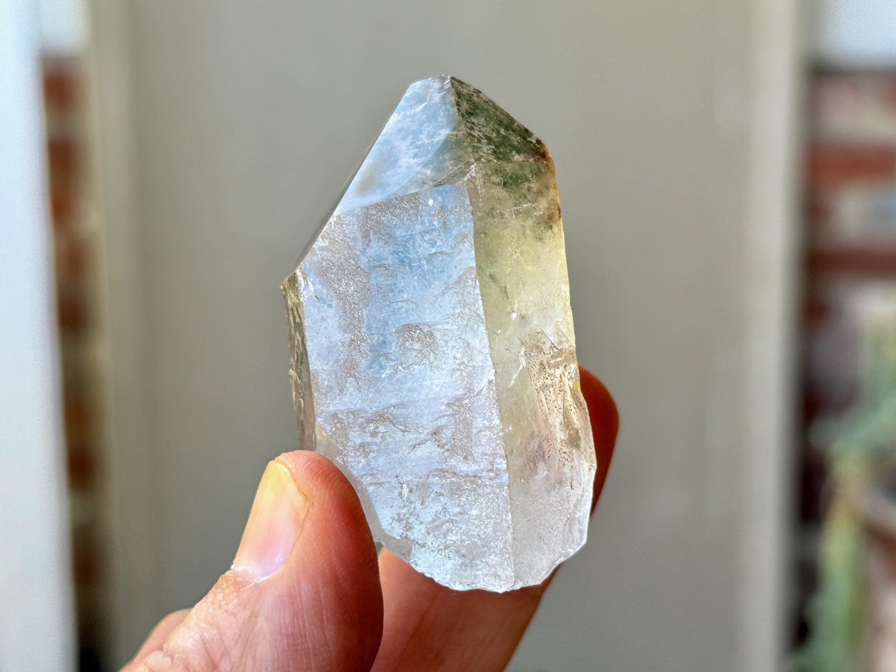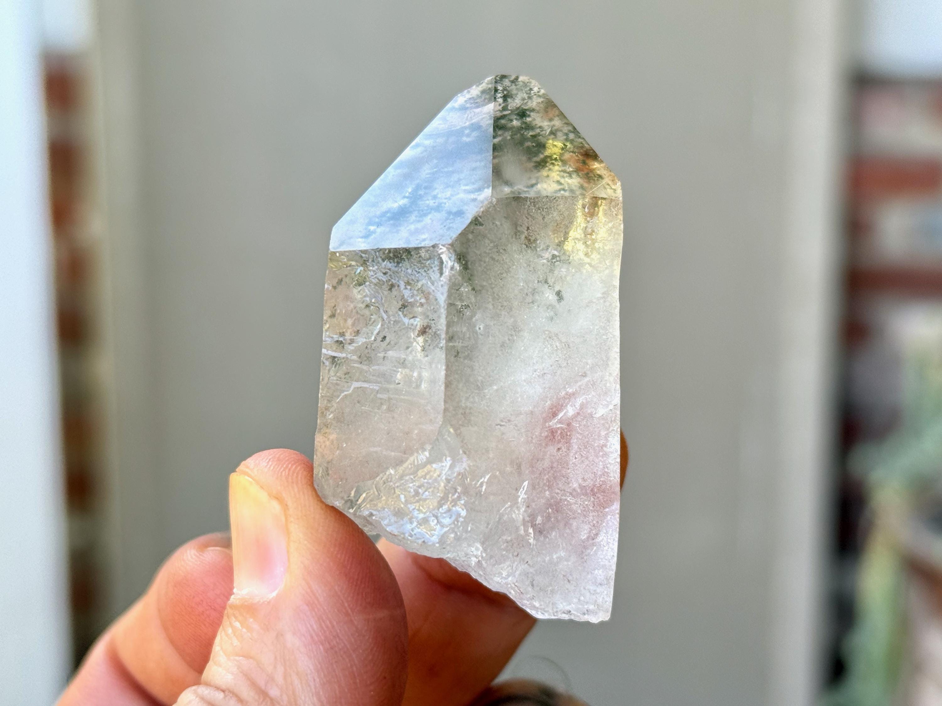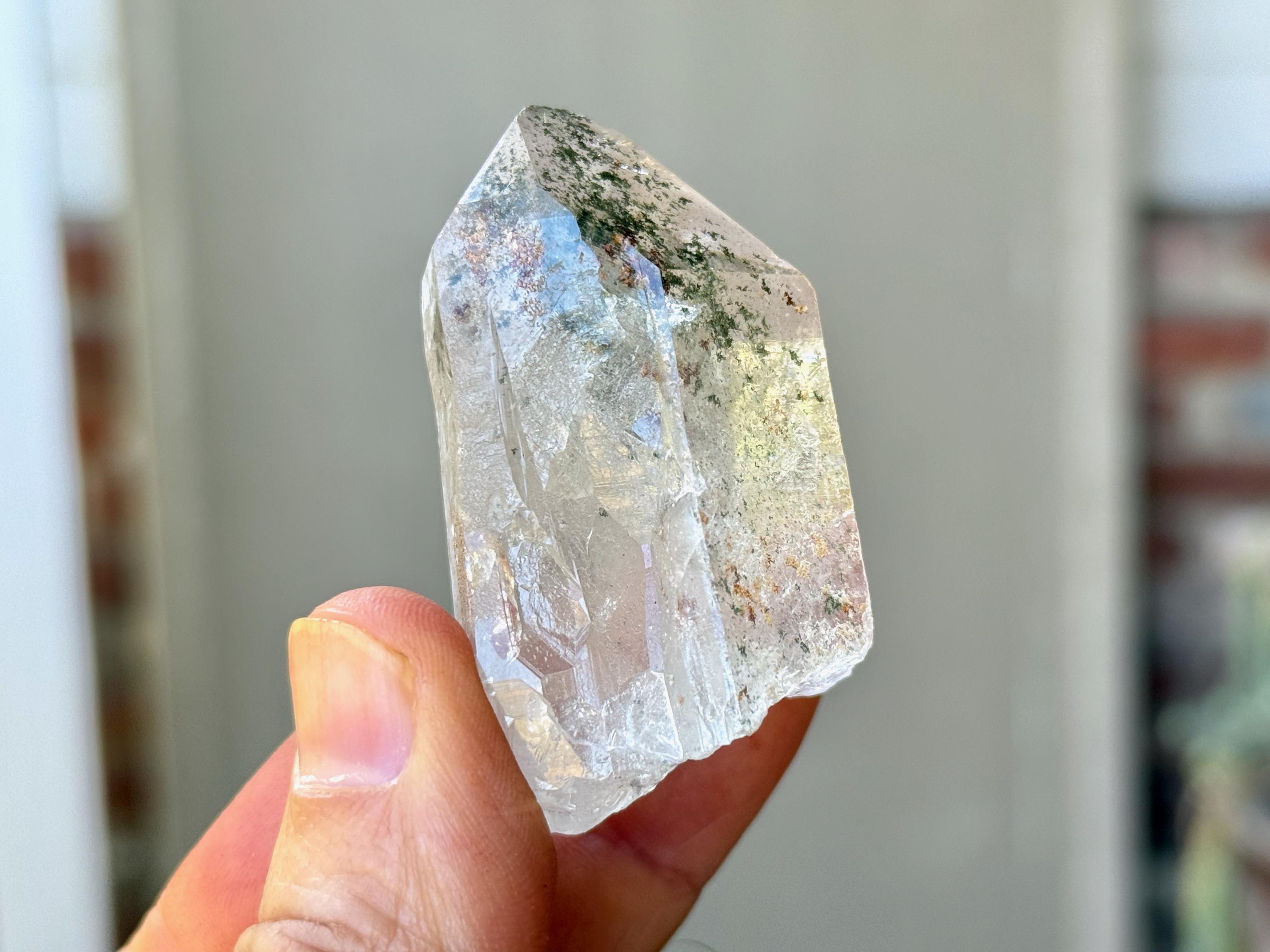 Exceptional clarity and outstanding quality to this Phantom Quartz crystal with a beautiful inclusions of vibrant Green Chlorite within. These inclusions are primarily in the main facet area, suspended like a hologram and very beautiful! Excellent termination as well.