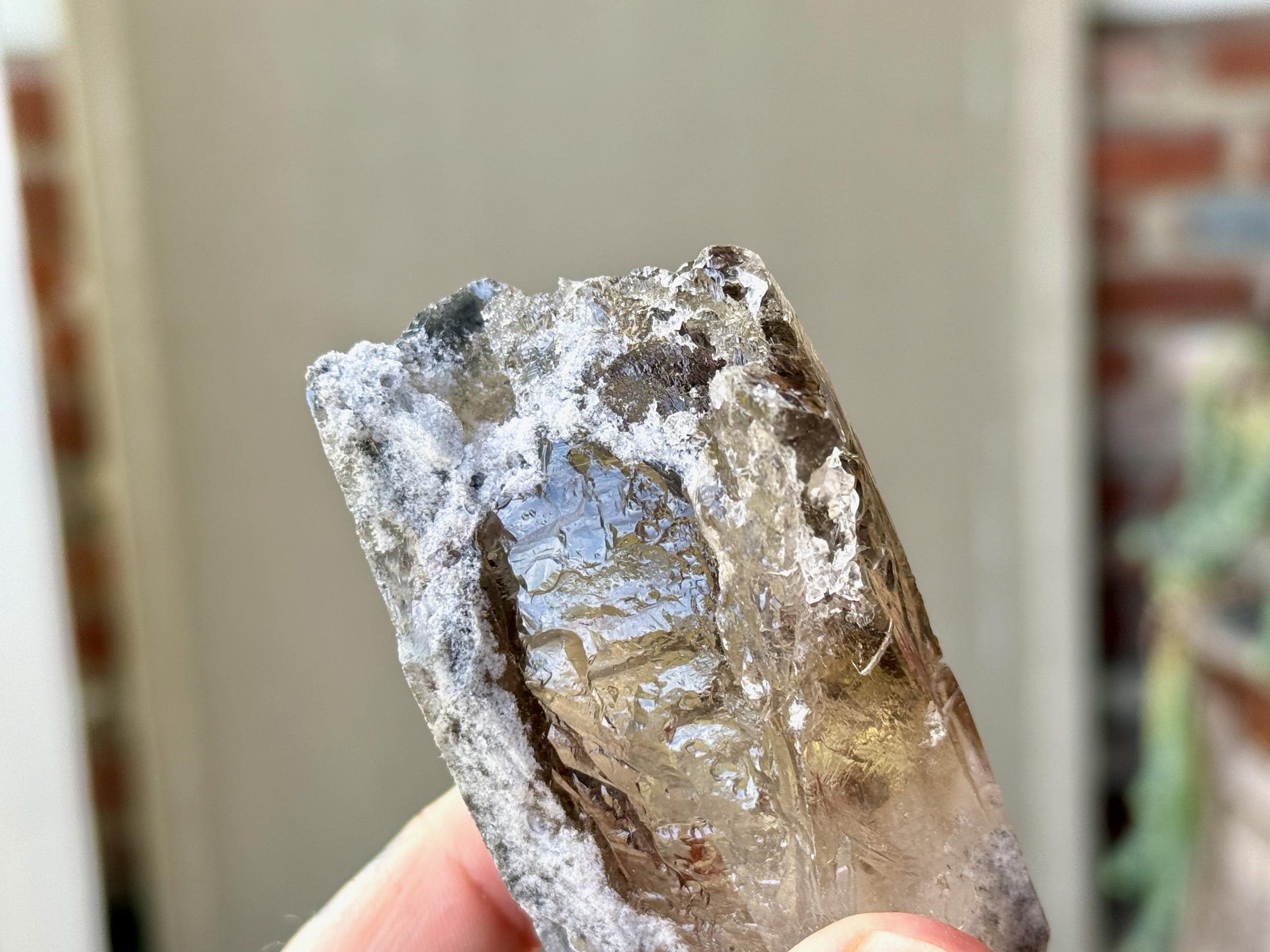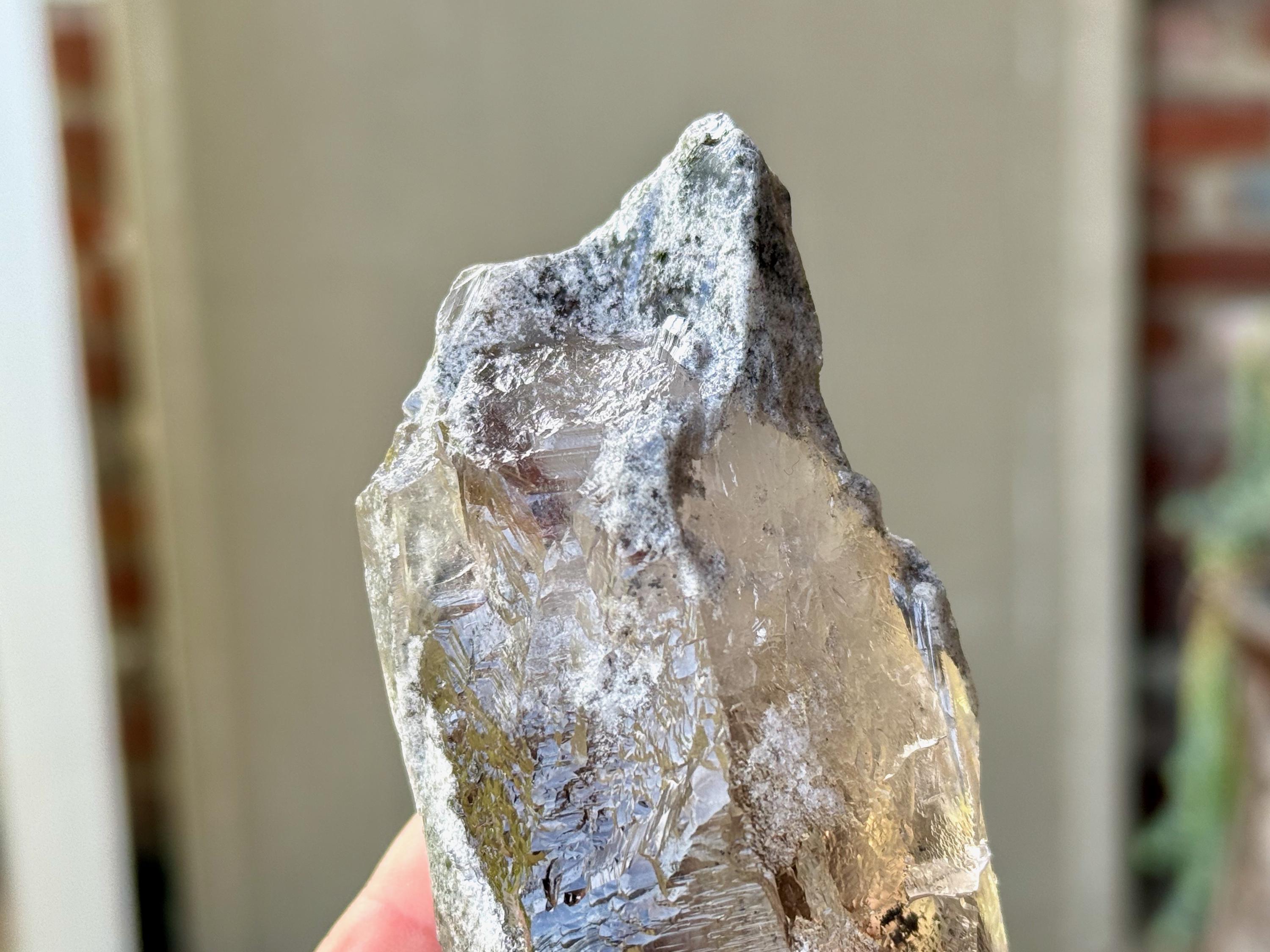 Beautiful textures and hydrothermally etched imprints to this lustrous Black Phantom Lemurian with an array of both black Anthraxolite inclusions and white Kaolinite. We love the contact "key" imprints on both ends, displaying deep crevices or "casts" where other minerals once grew while still in the Earth.
