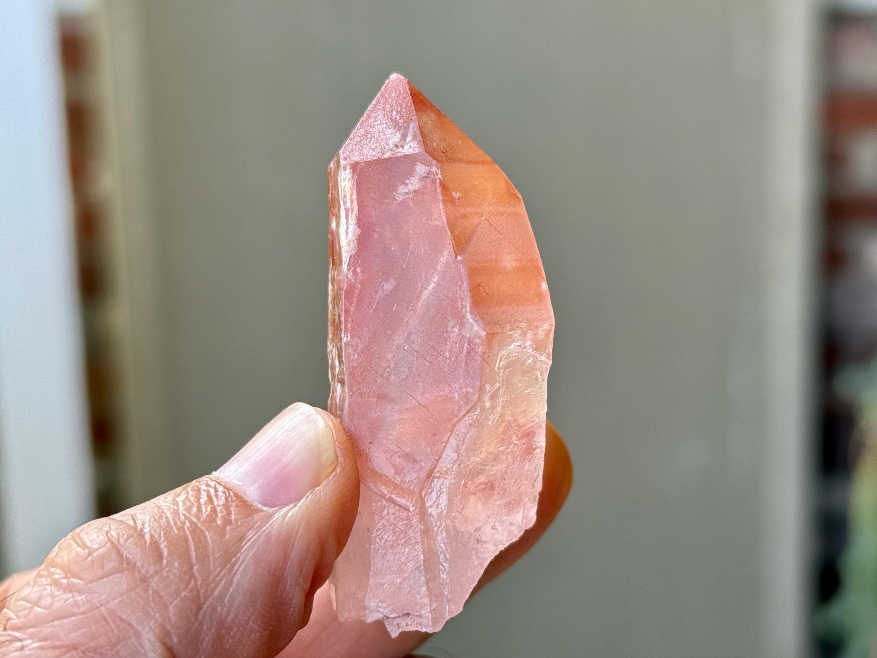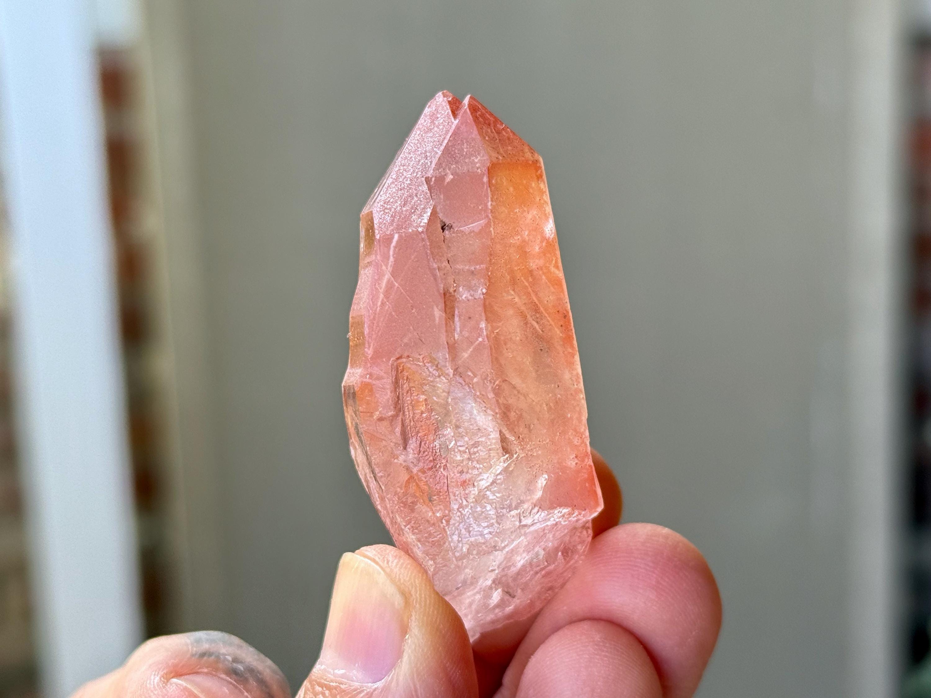 A deeply saturated pink color to this superb Scarlet Temple Pink Lemurian Quartz in a Tantric Twin formation, where the crystals have grown almost entirely together. When backlit, as in Photos 4-5, this crystal lights up brilliantly. Excellent termination to this one as well.