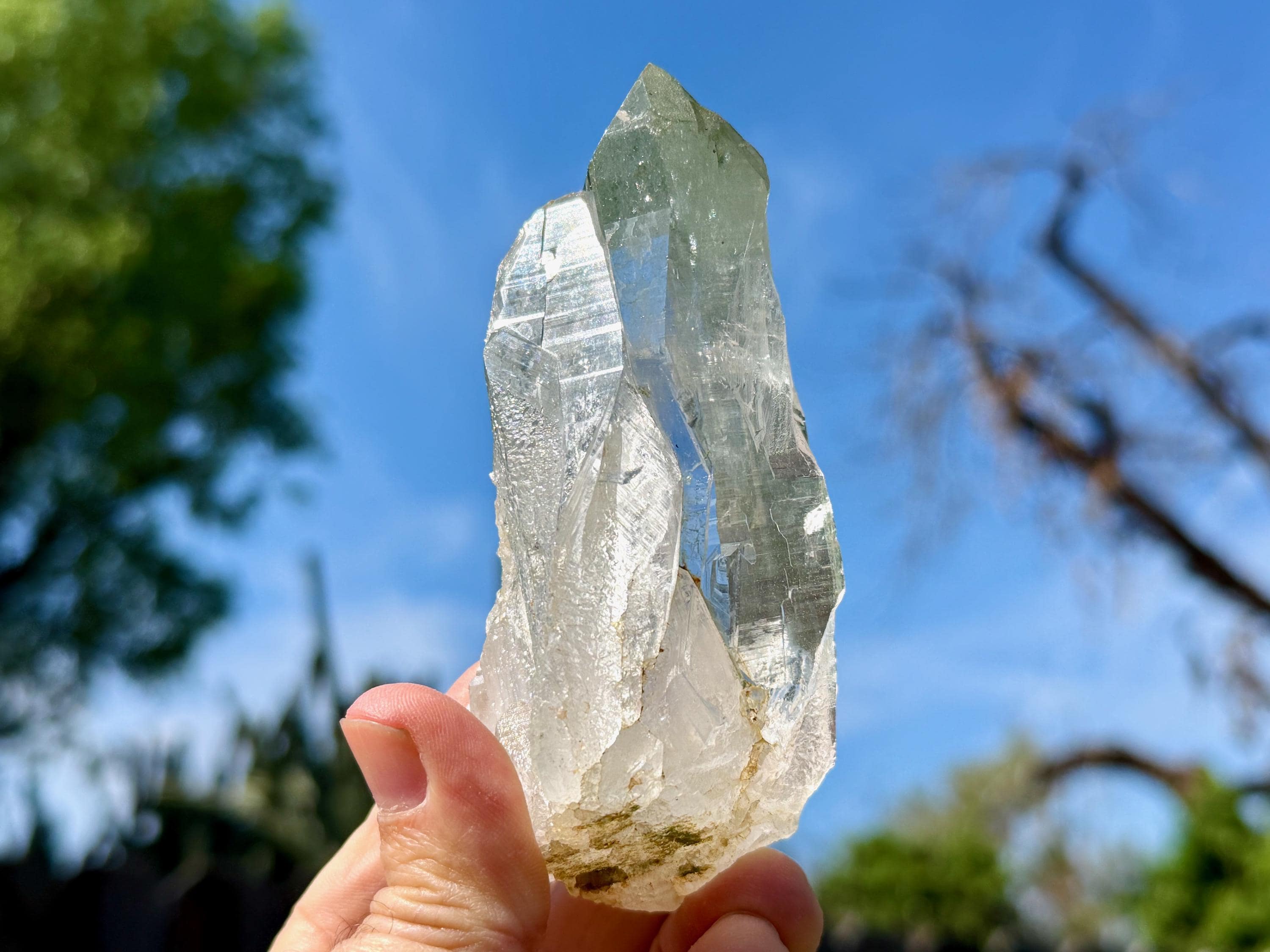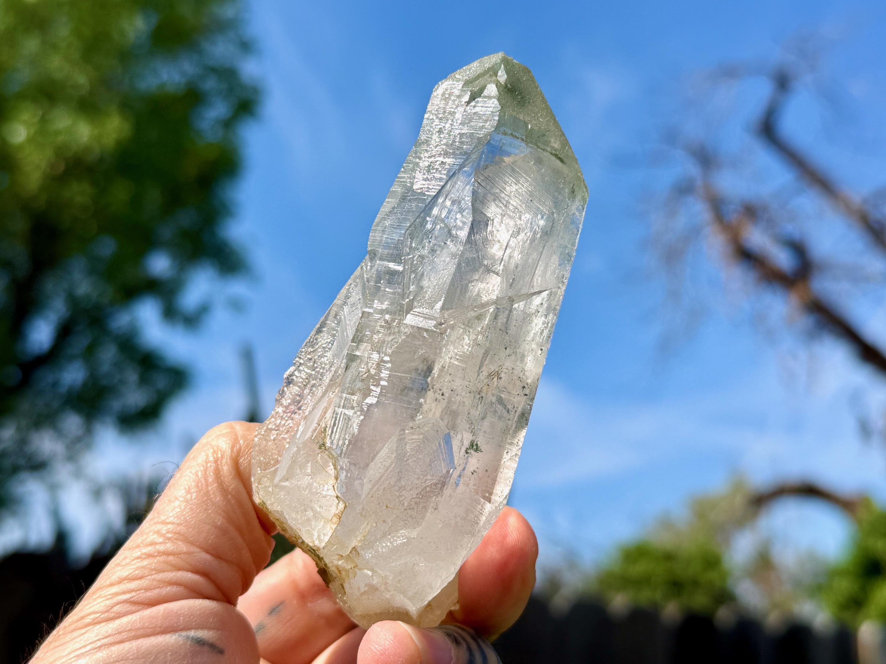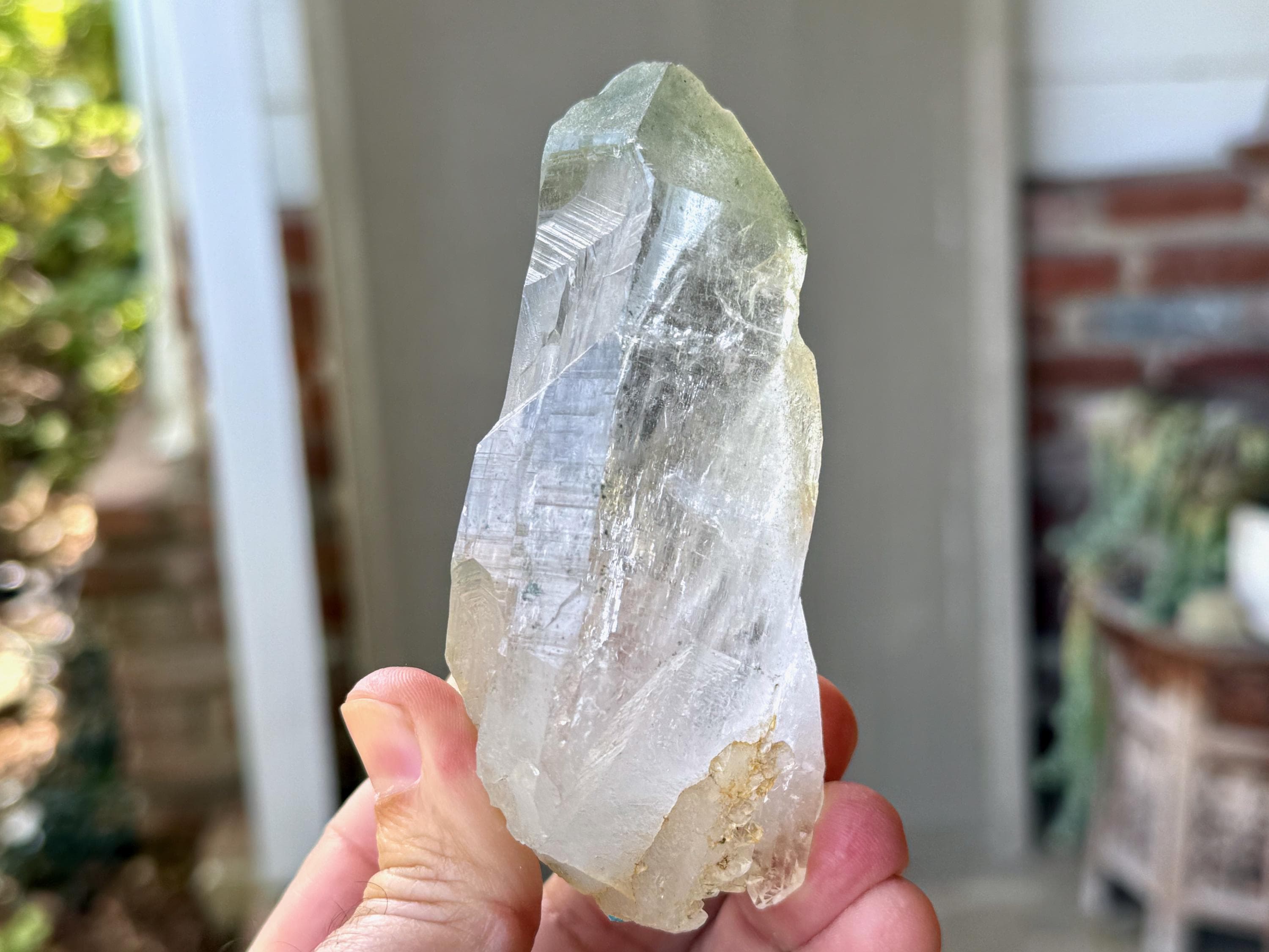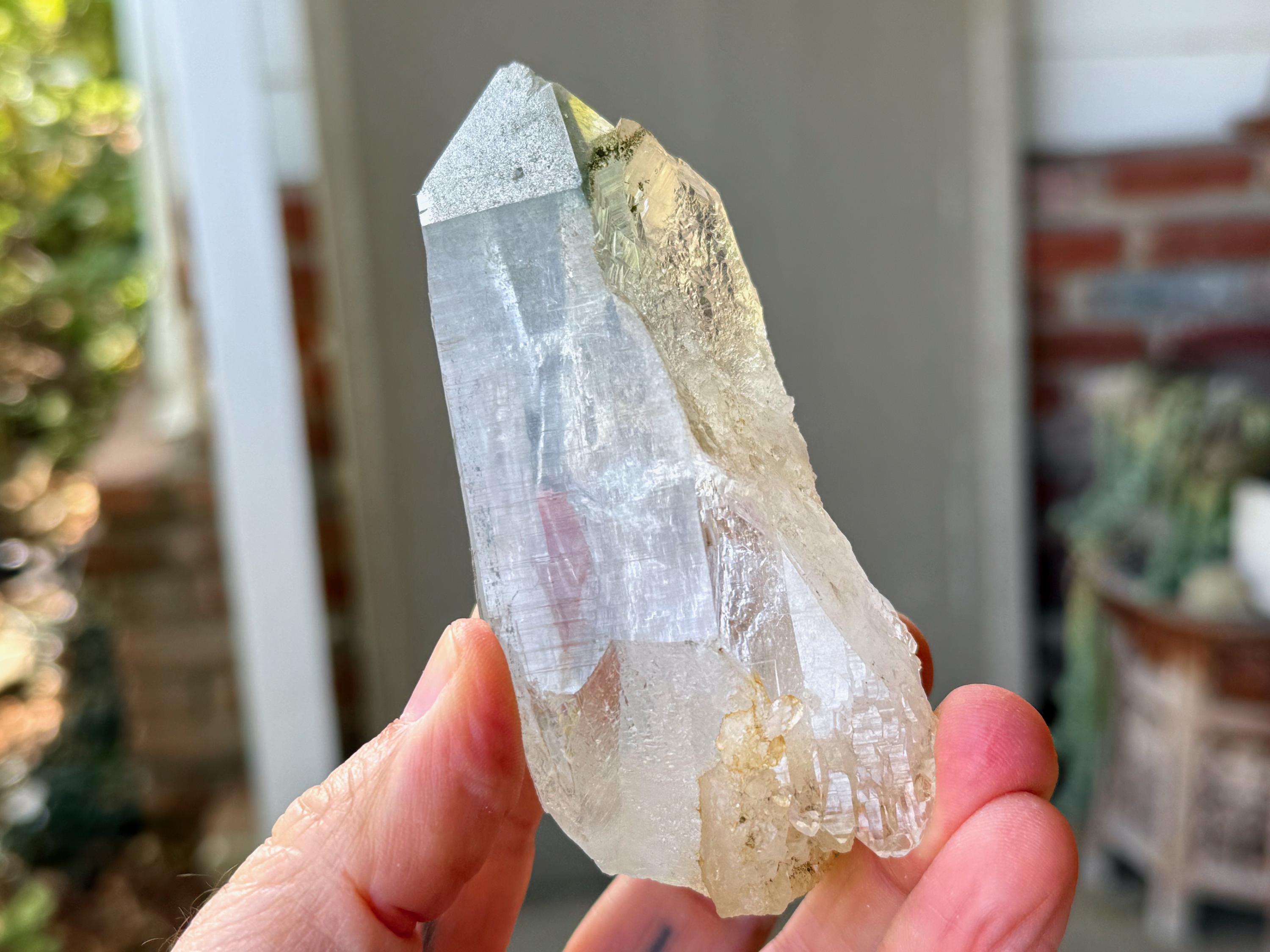 Exquisite, water-clear clarity and brilliant luster to this superb Himalayan Quartz crystal in an elongated formation. This crystal exhibits mild, linear striations on the sides and a vibrant inclusion of Green Chlorite in the main facet area.
