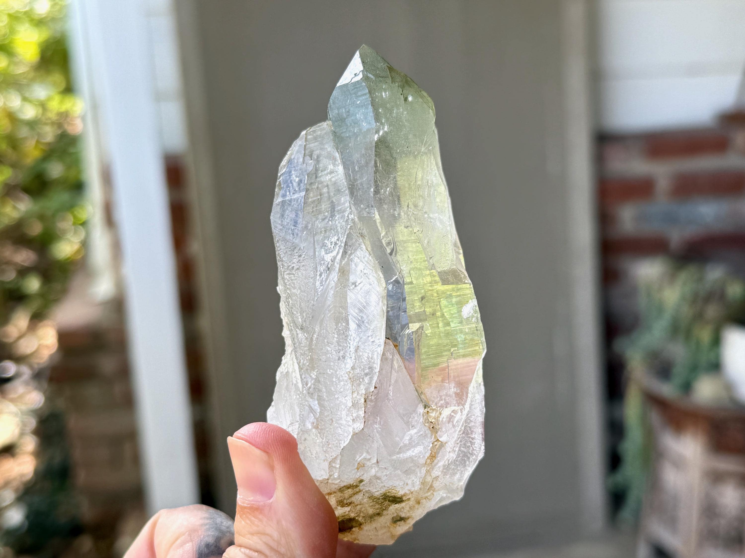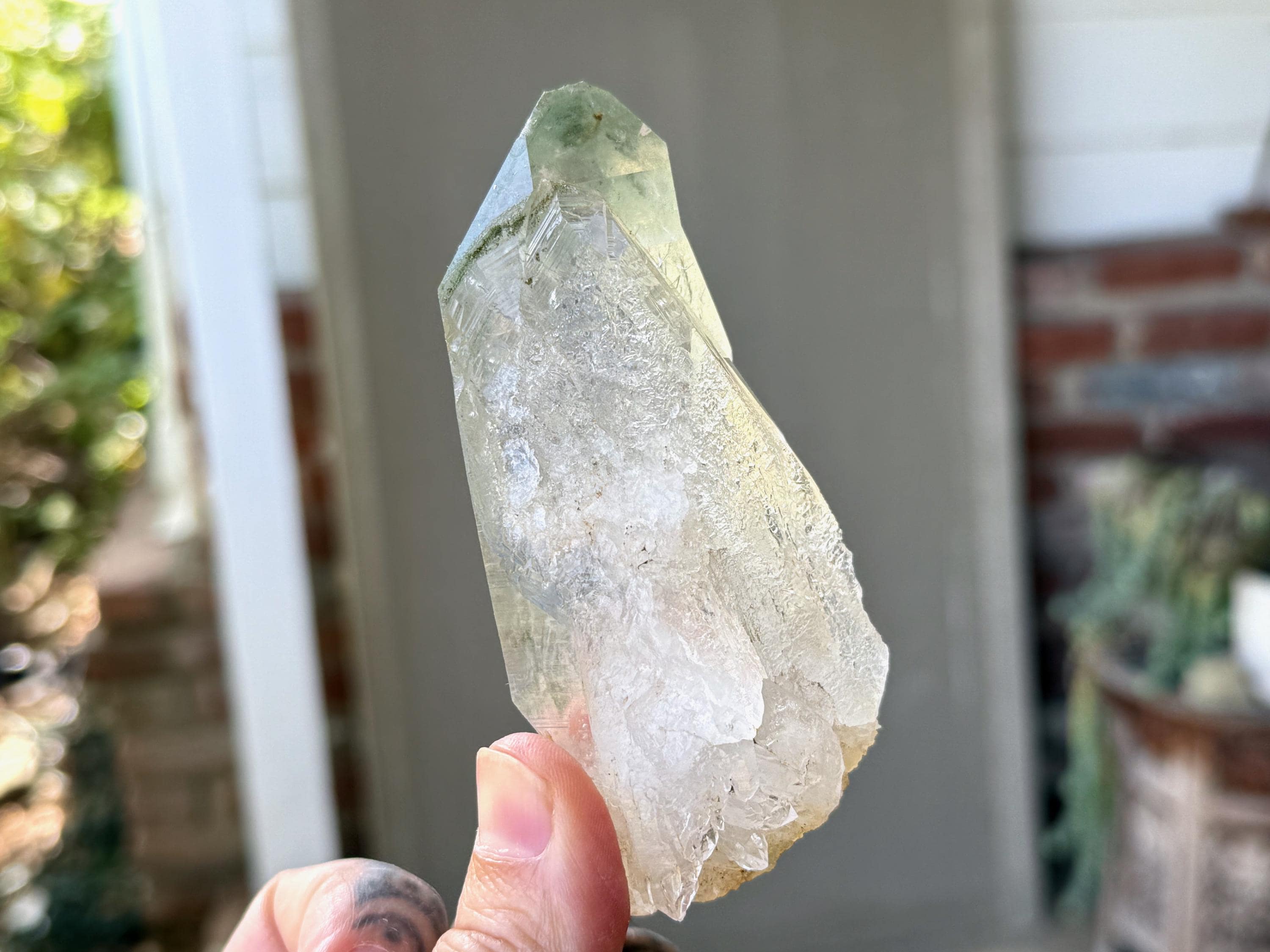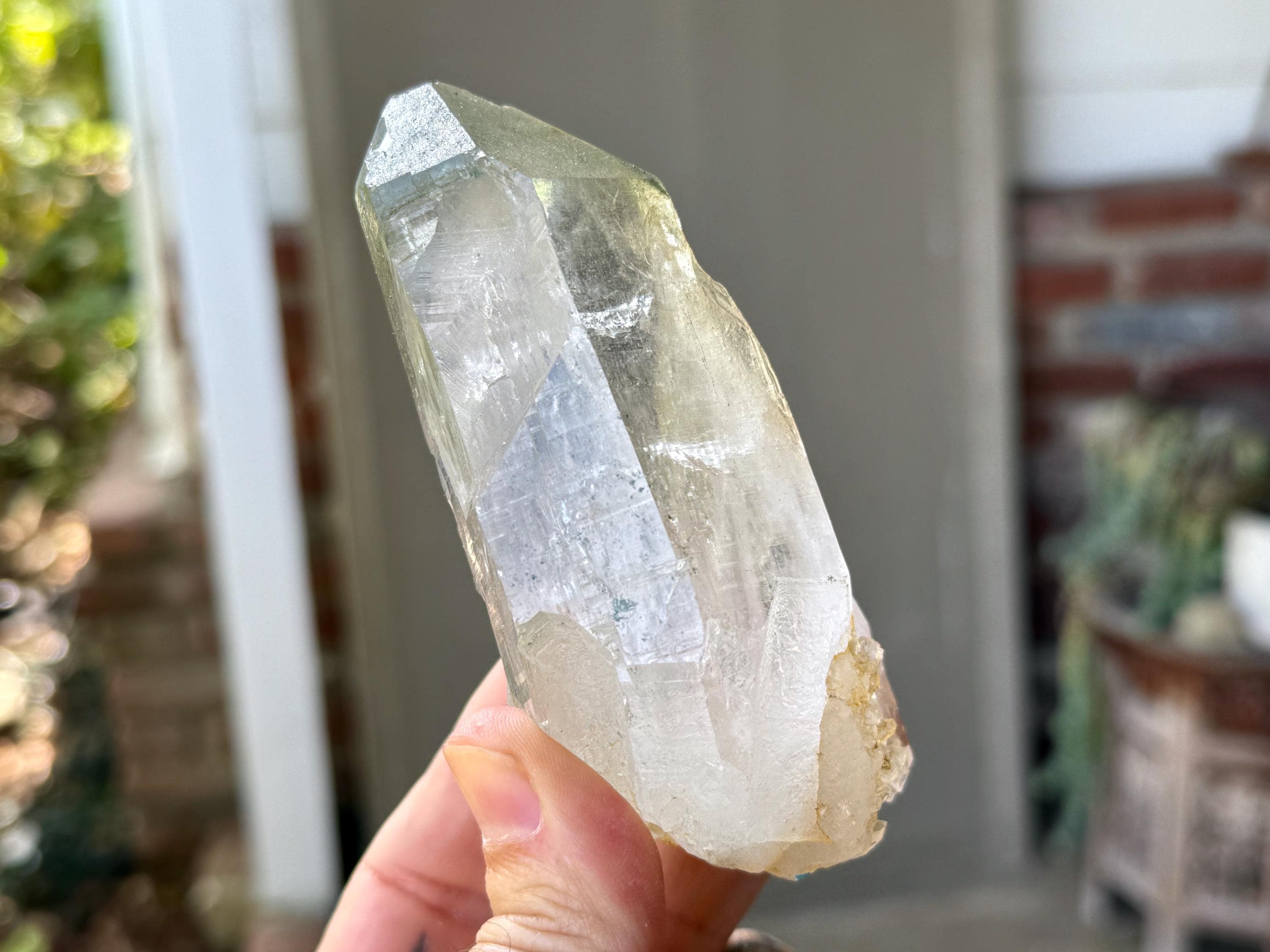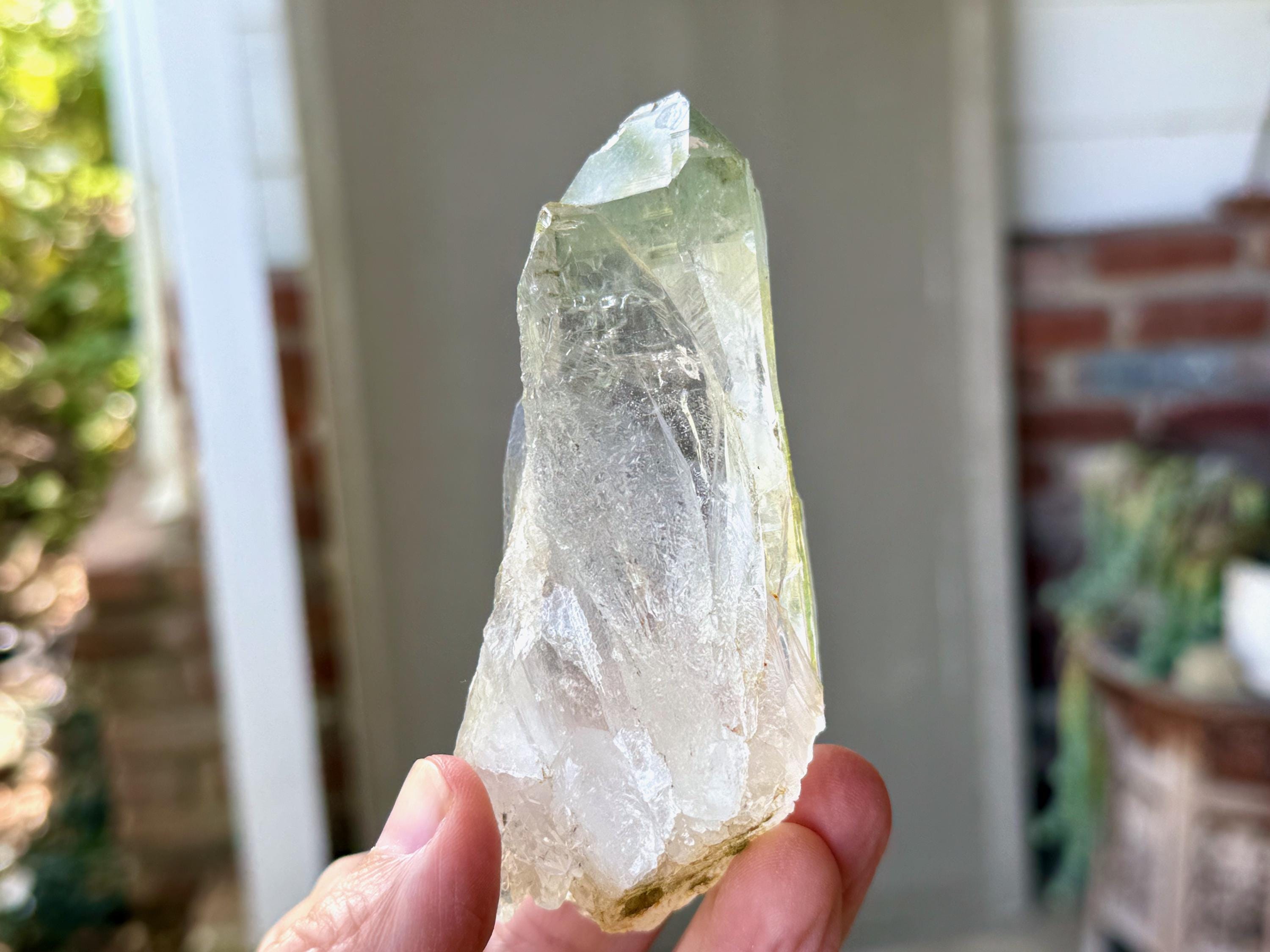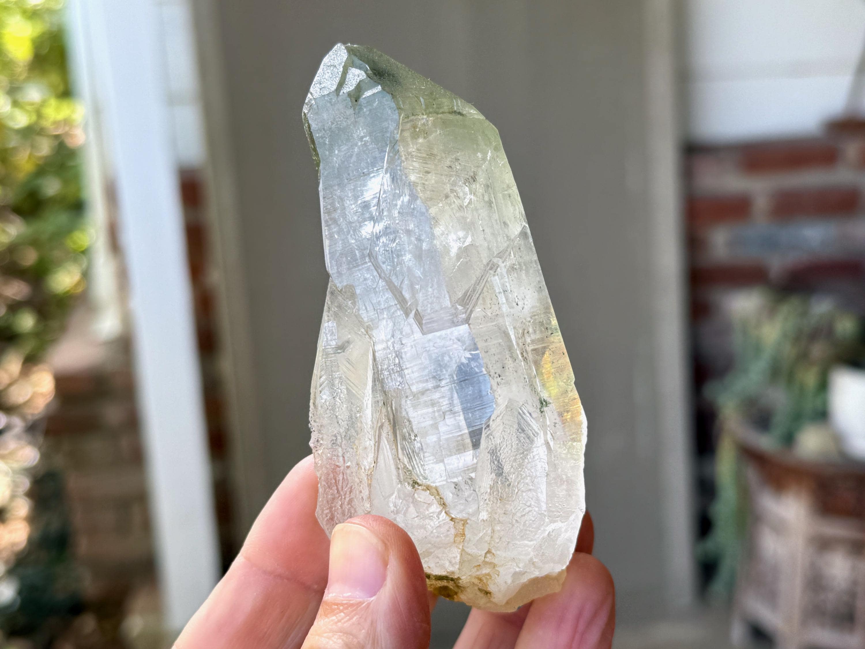 Exquisite, water-clear clarity and brilliant luster to this superb Himalayan Quartz crystal in an elongated formation. This crystal exhibits mild, linear striations on the sides and a vibrant inclusion of Green Chlorite in the main facet area.