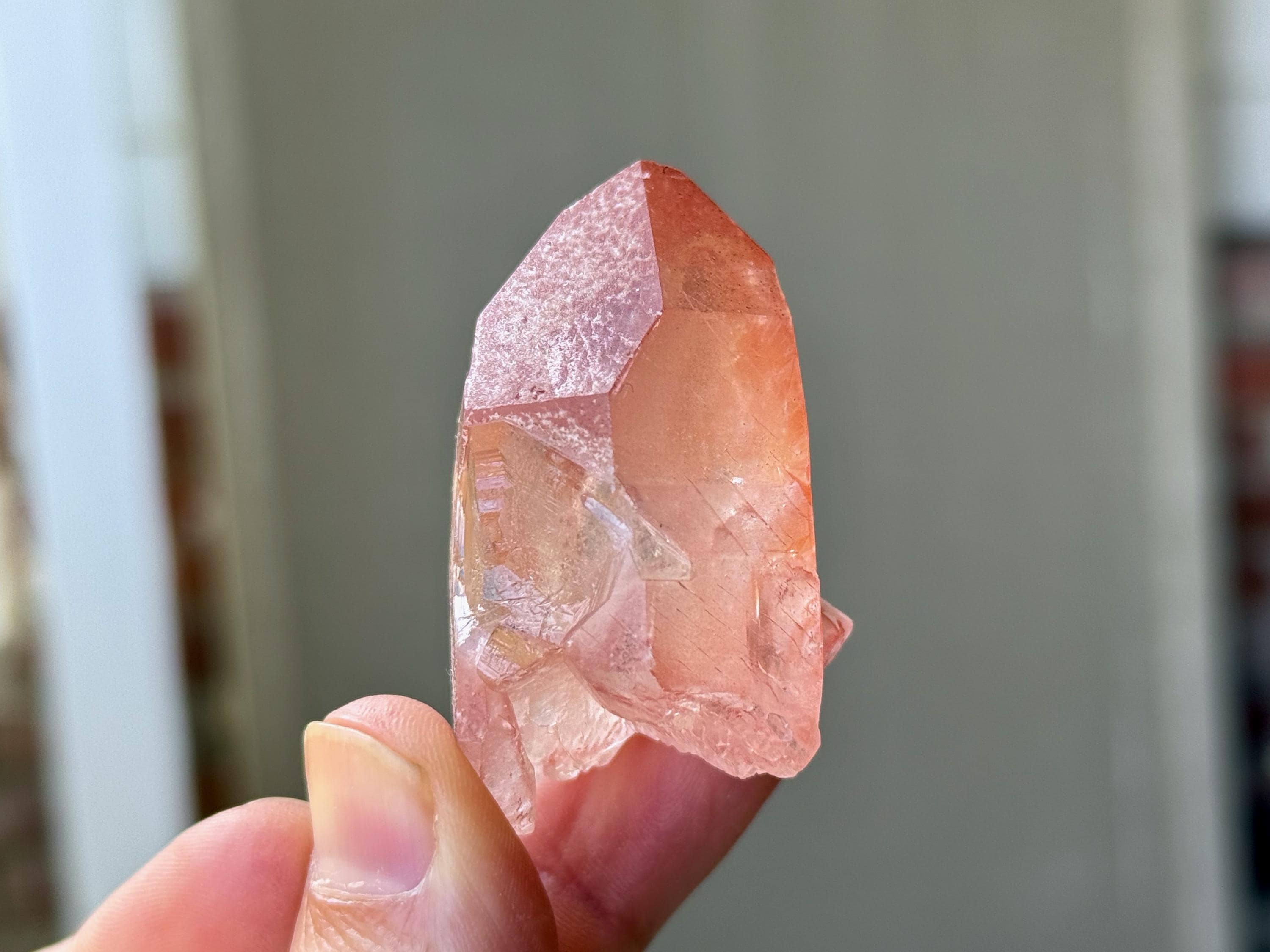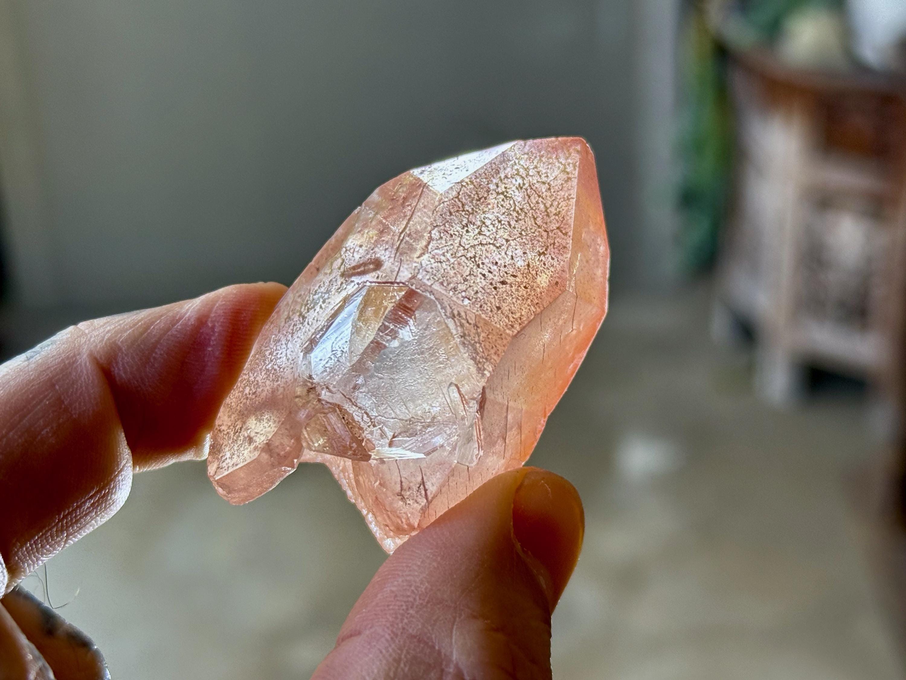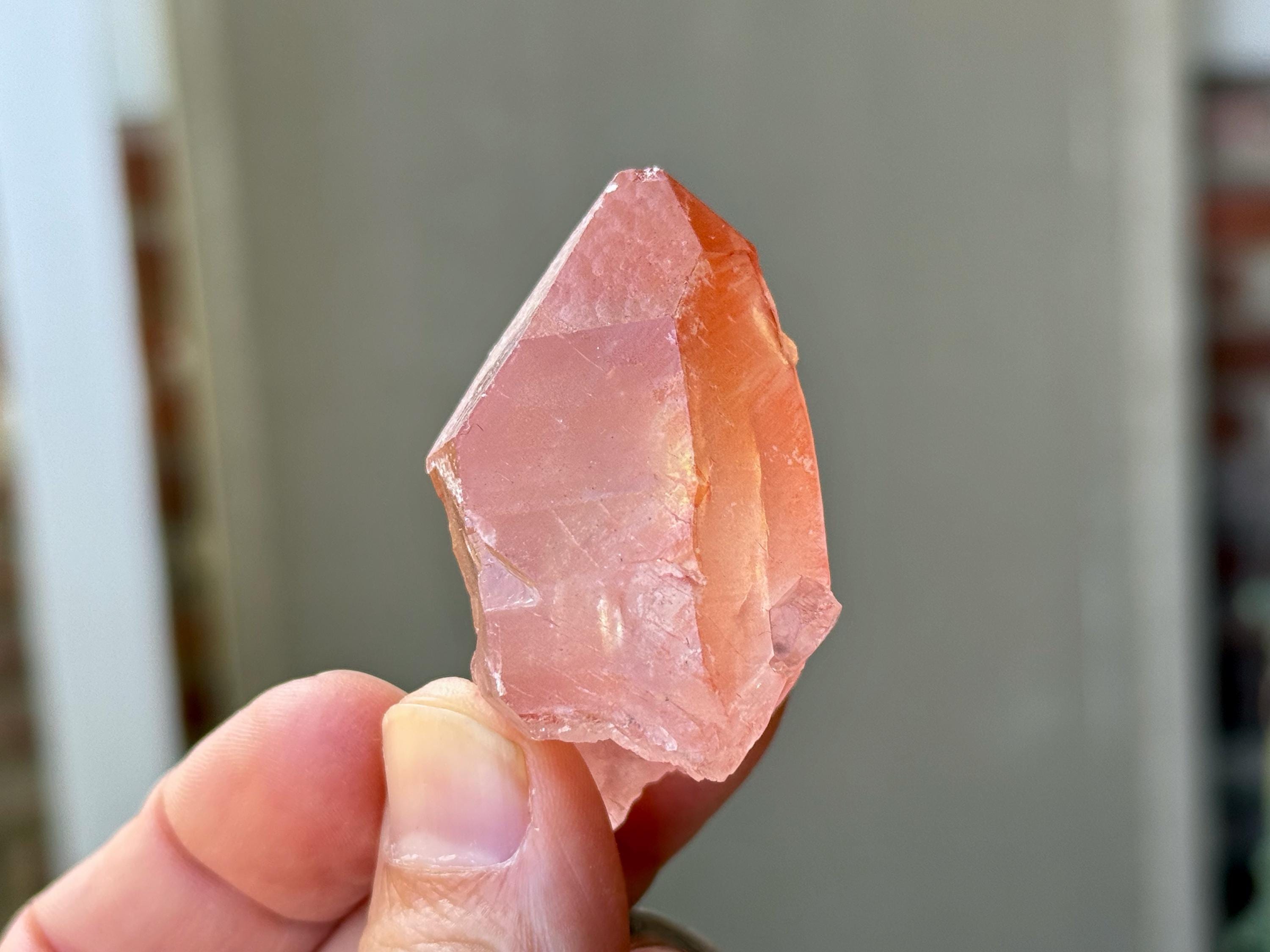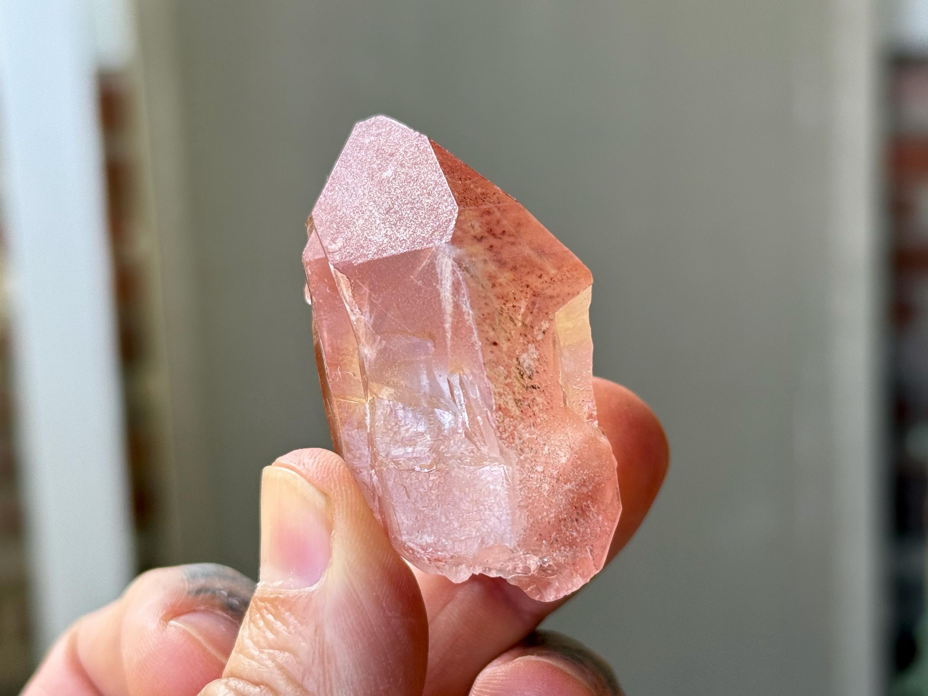 Vibrant pink color to this exquisite Scarlet Temple Pink Lemurian Quartz. This crystal exhibits some mild contact impressions on its sides, and when backlit, it lights up beautifully (Photos 4-5). Excellent termination as well.
