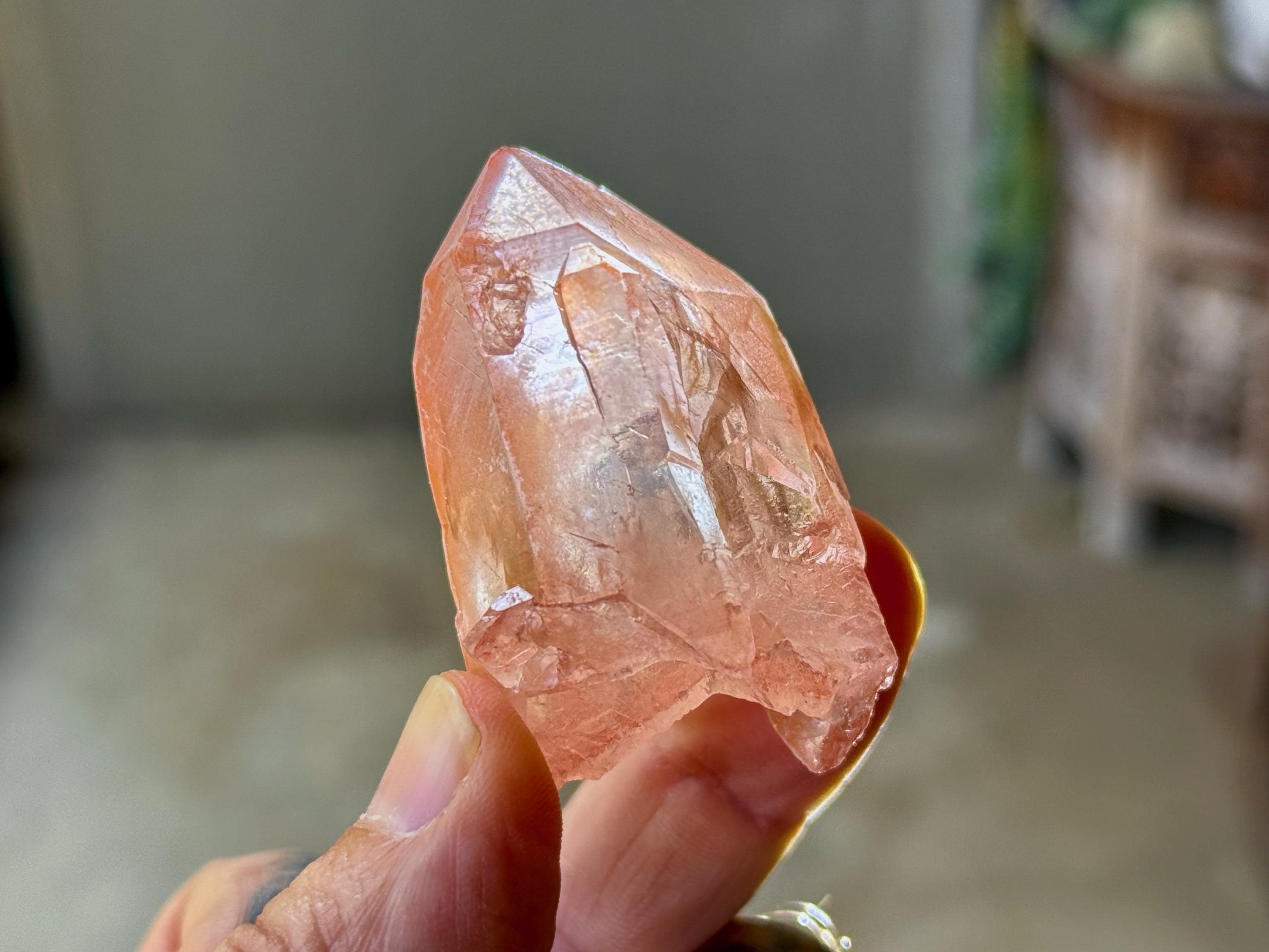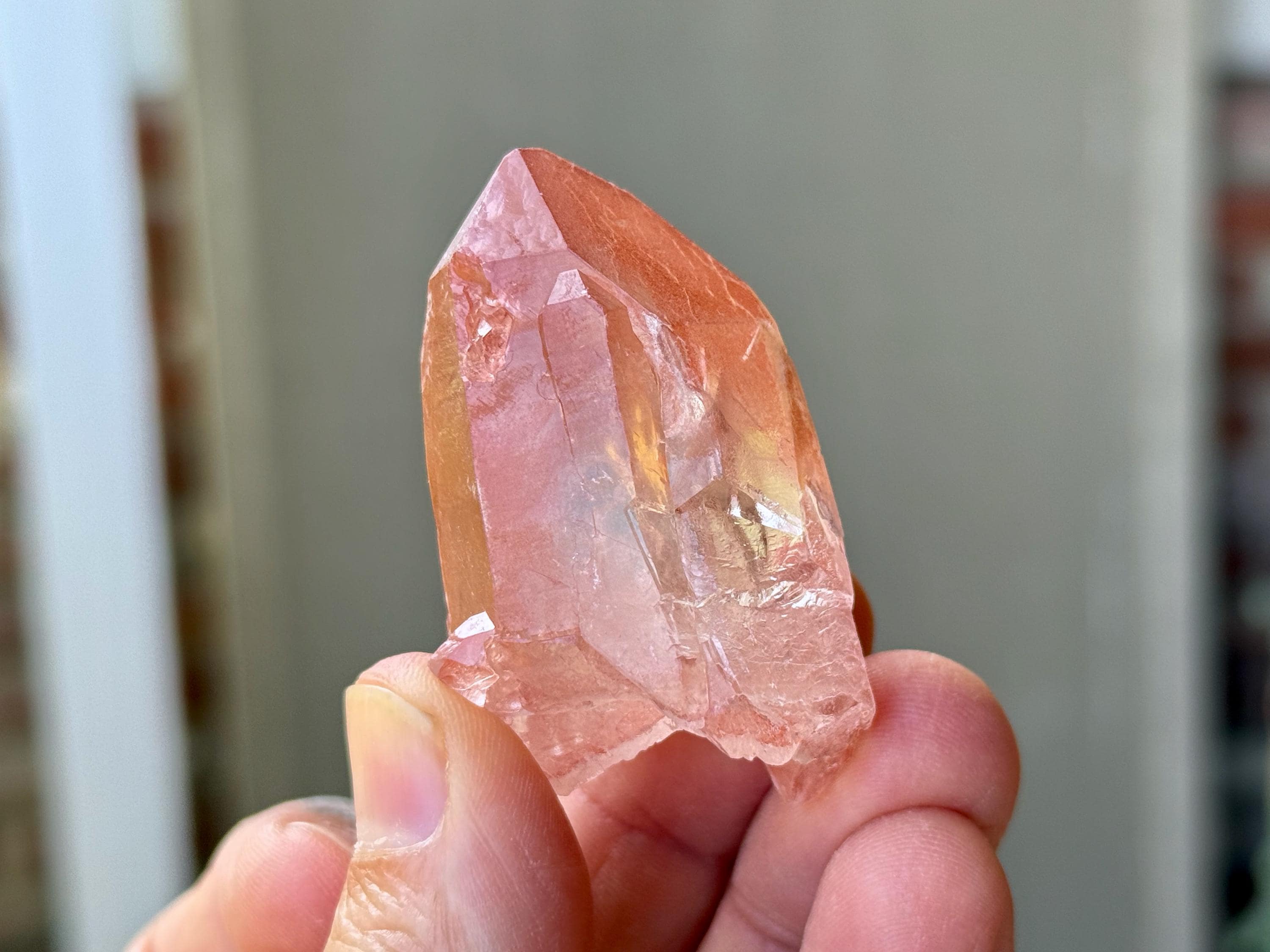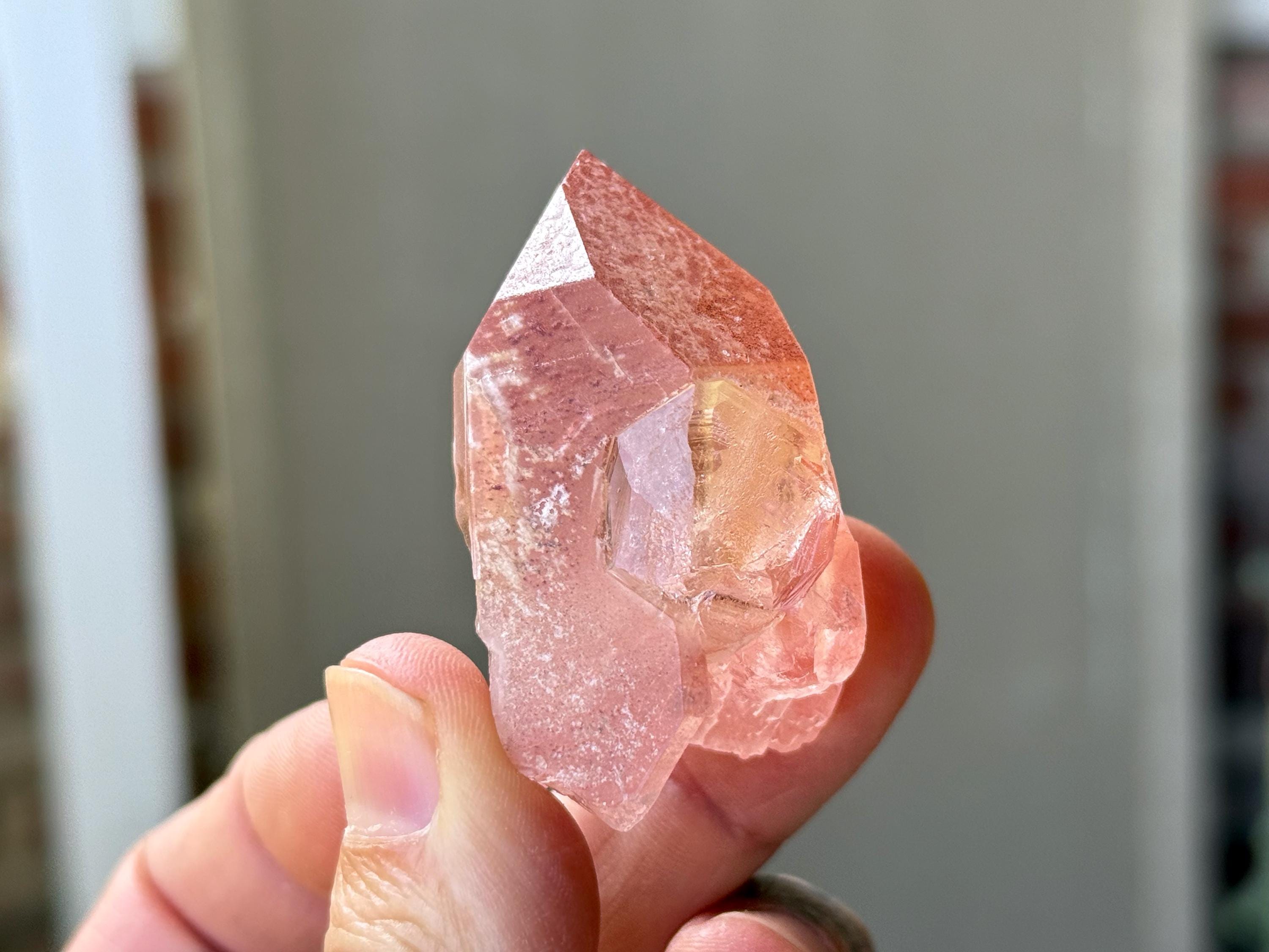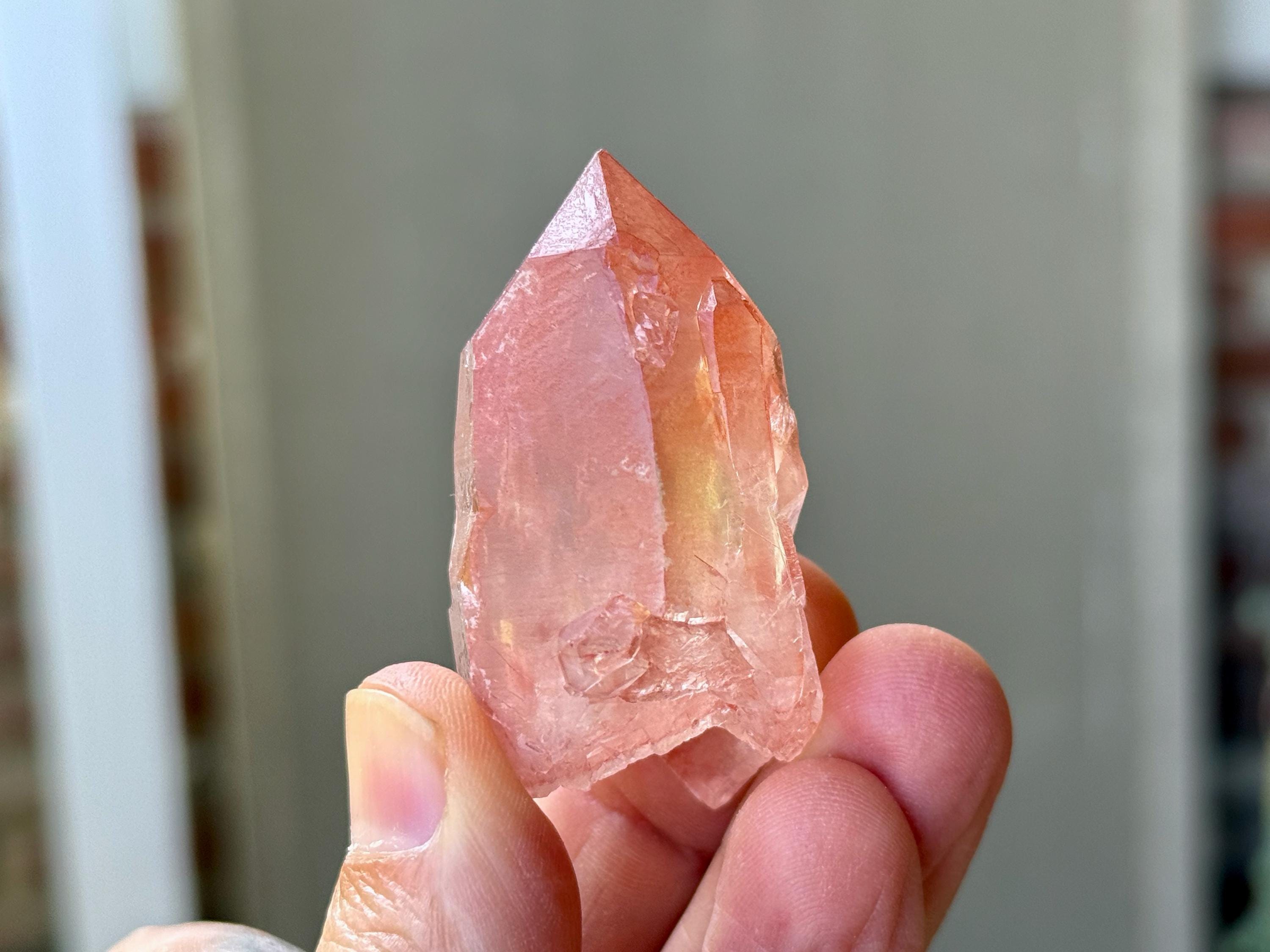 Vibrant pink color to this exquisite Scarlet Temple Pink Lemurian Quartz. This crystal exhibits some mild contact impressions on its sides, and when backlit, it lights up beautifully (Photos 4-5). Excellent termination as well.