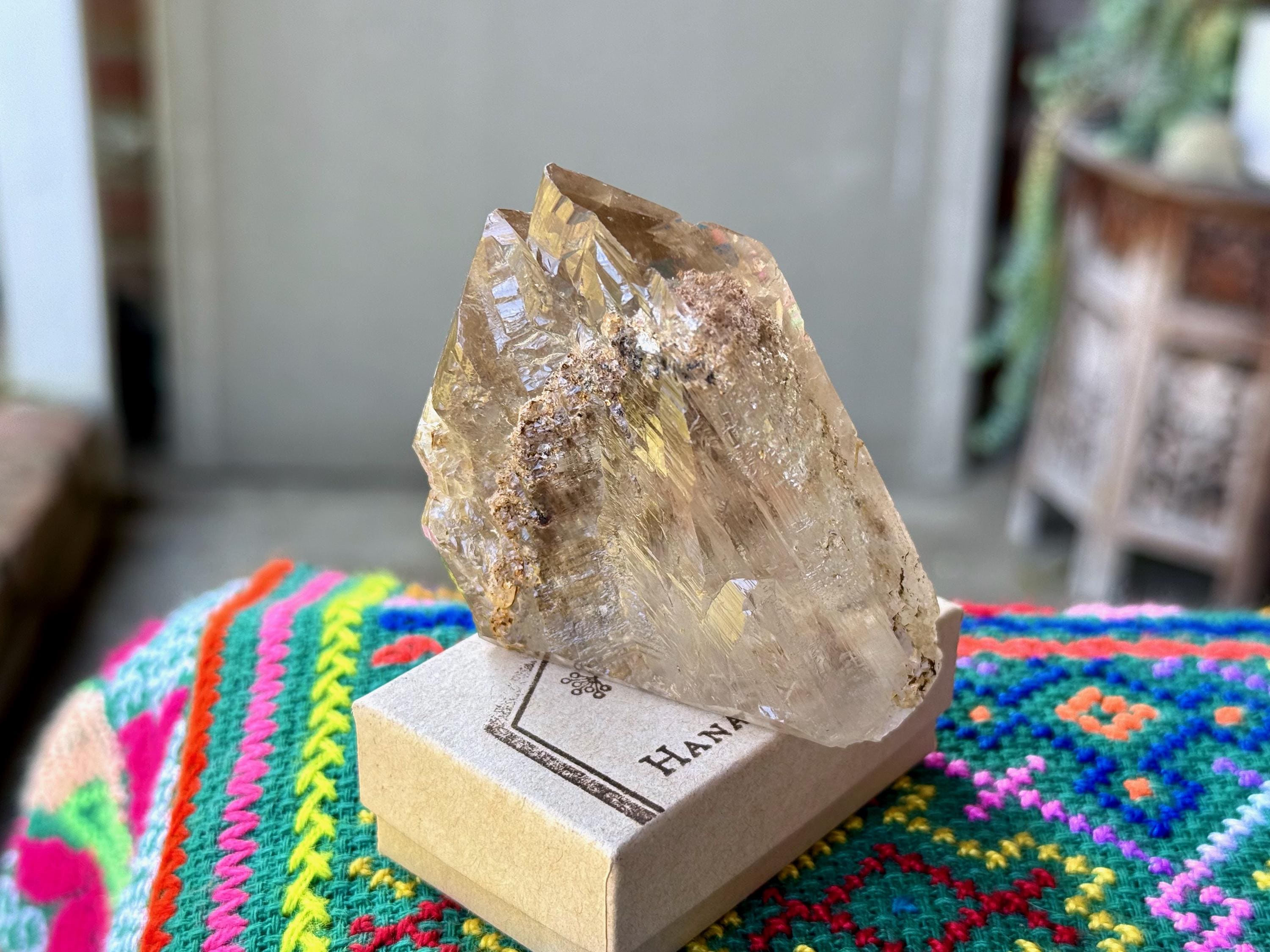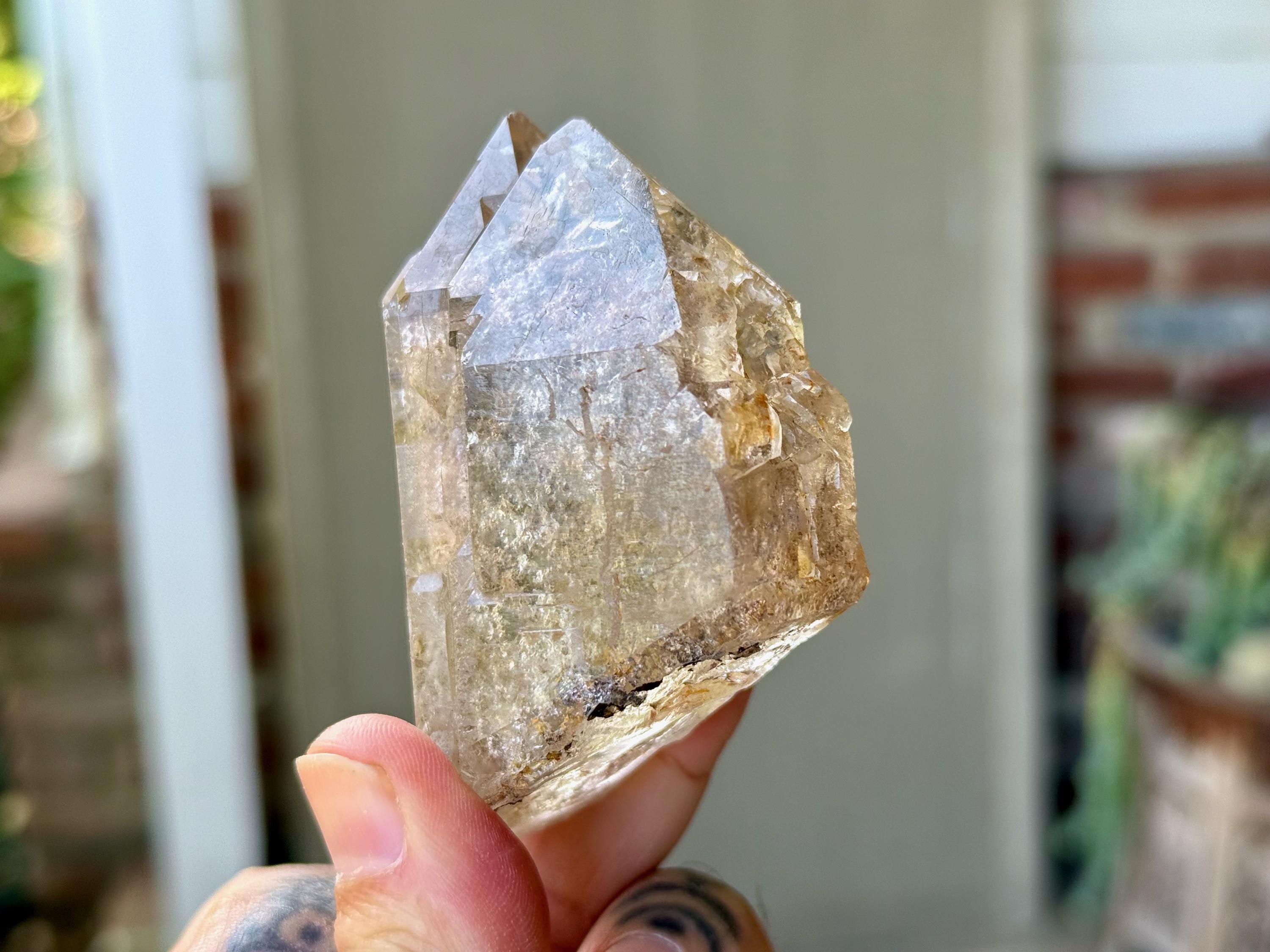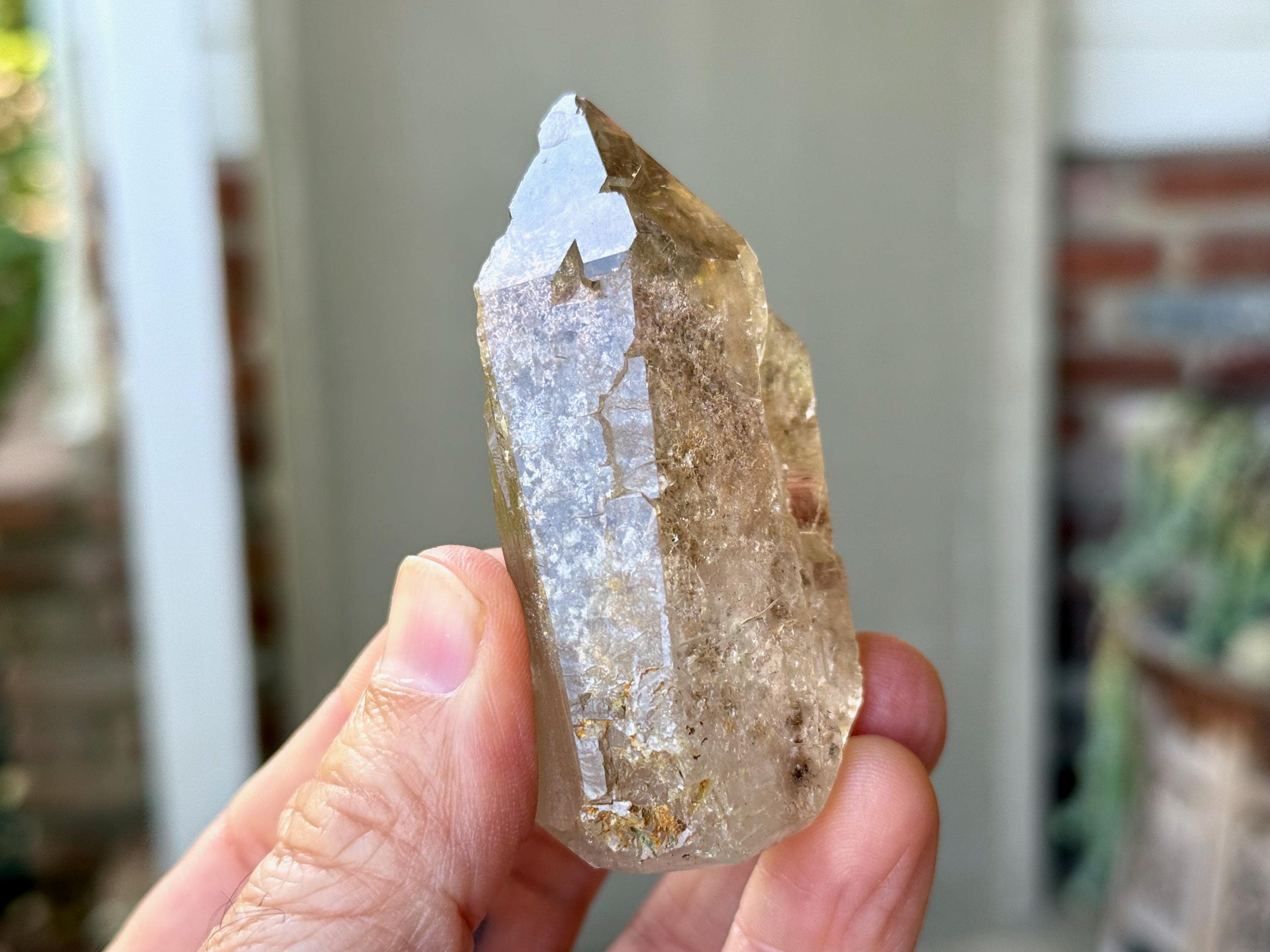 This unique Golden Lodolite Quartz crystal comes from a recent find in Diamantina, Brazil. This crystal came from a very small pocket where the crystals had beautiful inclusions of mossy Lodolite and white Kaolinite.