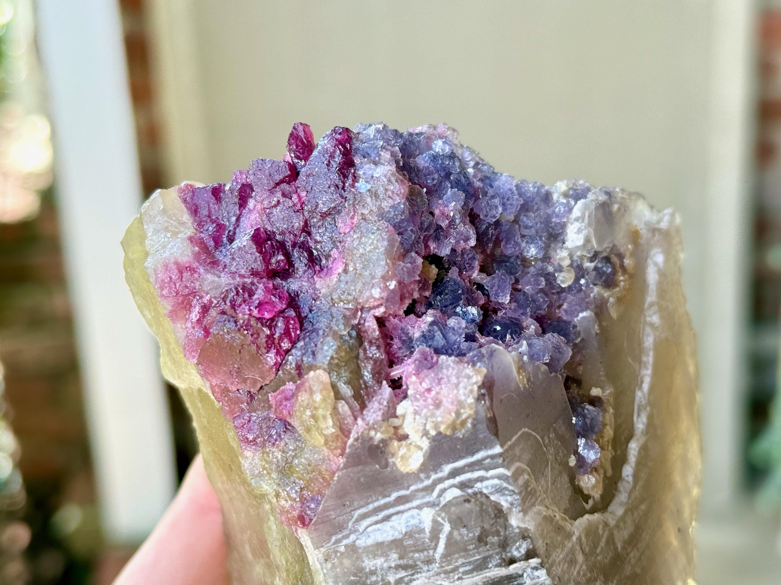 The crystals from this find include unique combinations of Quartz, Citrine, Lepidolite, Albite, Cleavelandite and Feldspar, with vividly colored Tourmalines in lovely hues of green, pink, purple and blue. Crystals with combinations of these minerals are sometimes referred to as "Unicorn Stones."