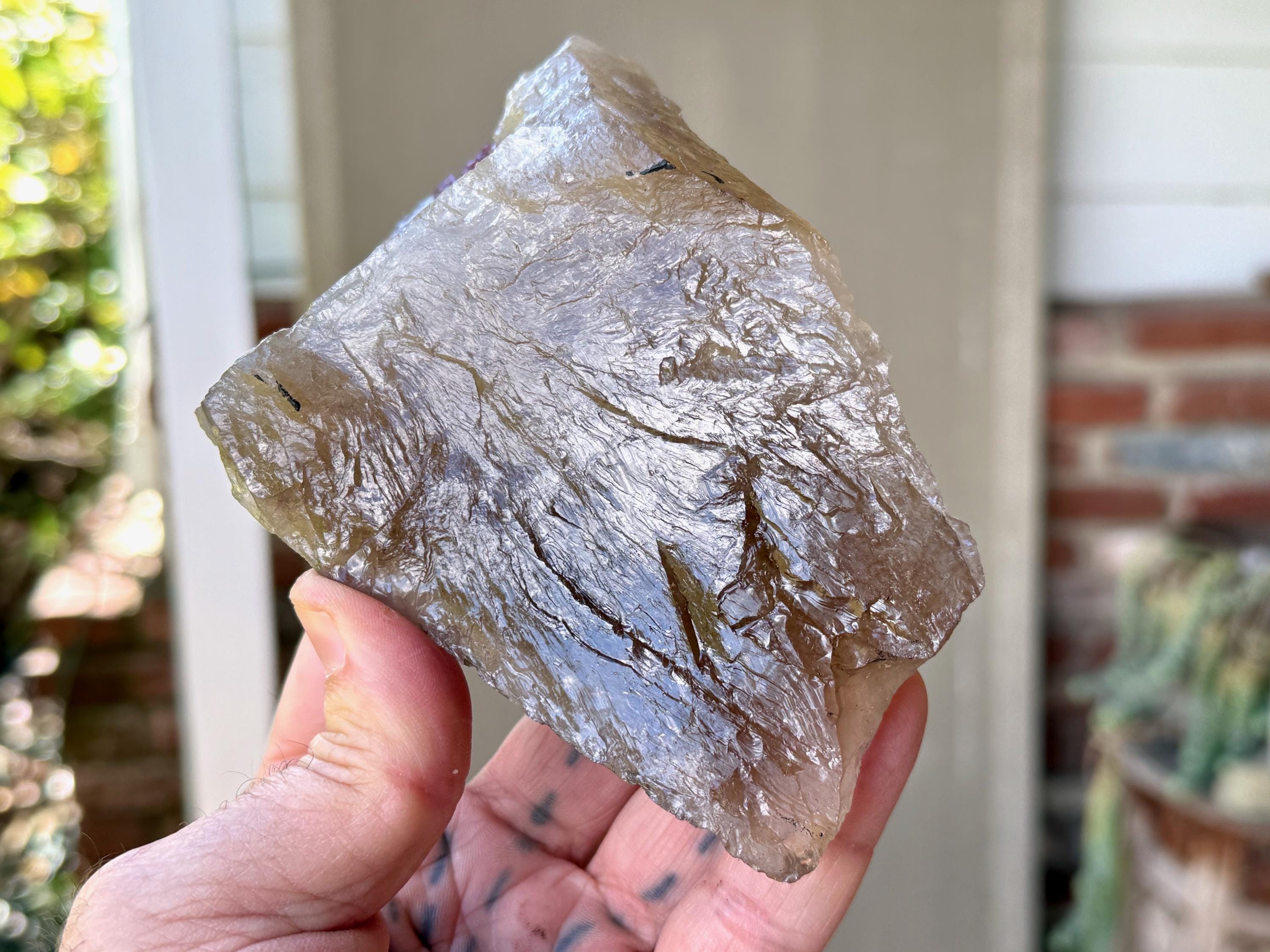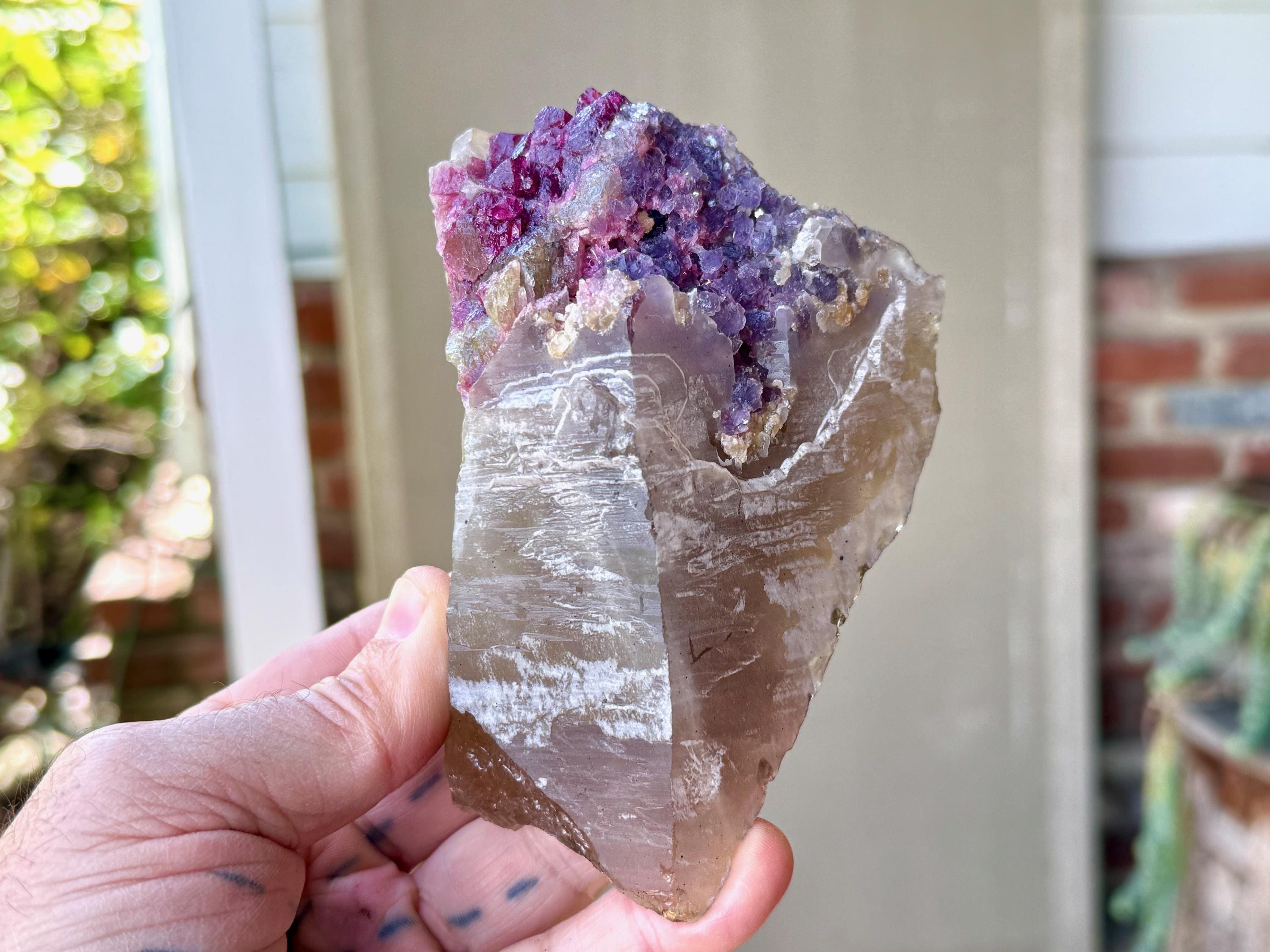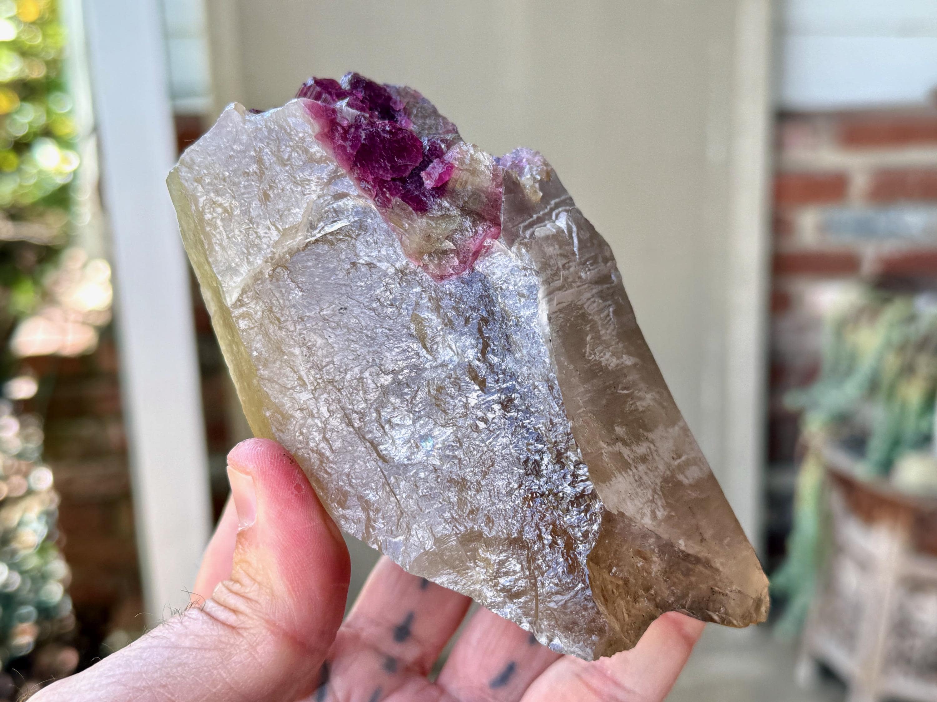 This crystal possesses a primary matrix of Citrine, which is embedded at the top with colorful inclusions of Pink Tourmaline and Purple Lepidolite. When backlit, the entire crystal lights up beautifully, with the golden colors of Citrine coming through, as well as the inclusions at the top (Photos 3-4).