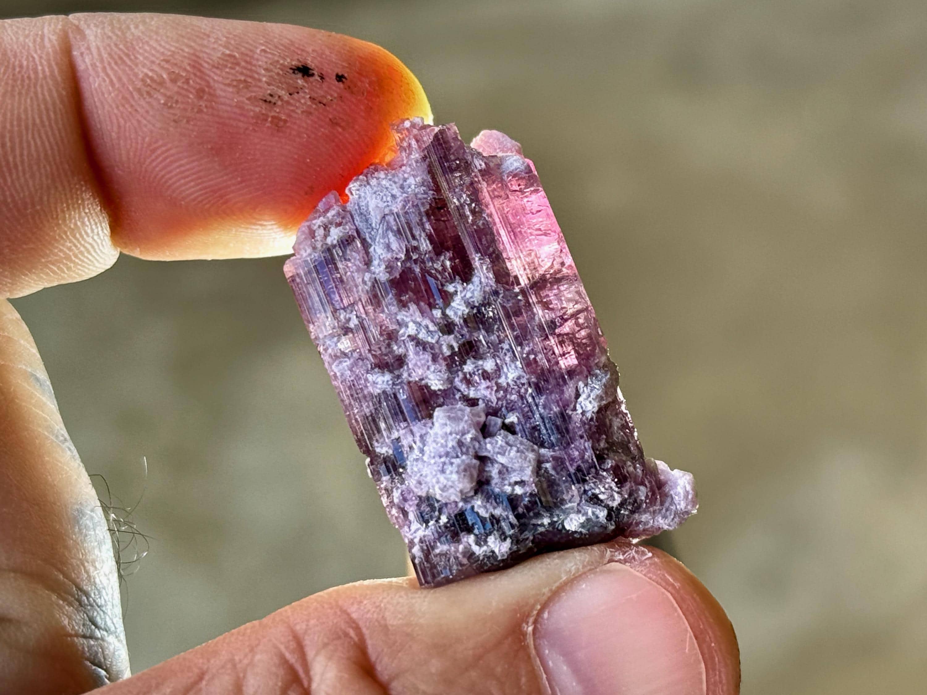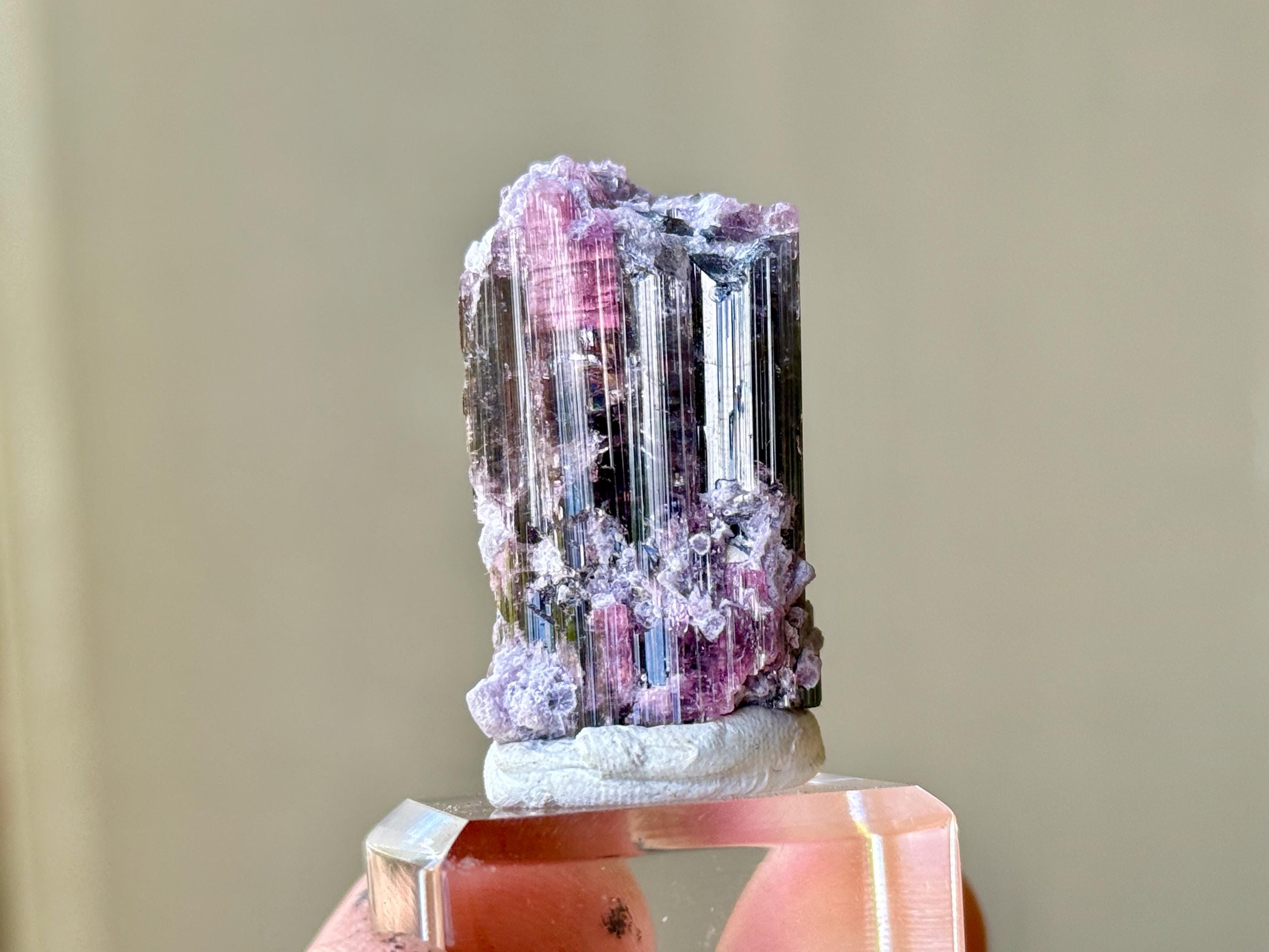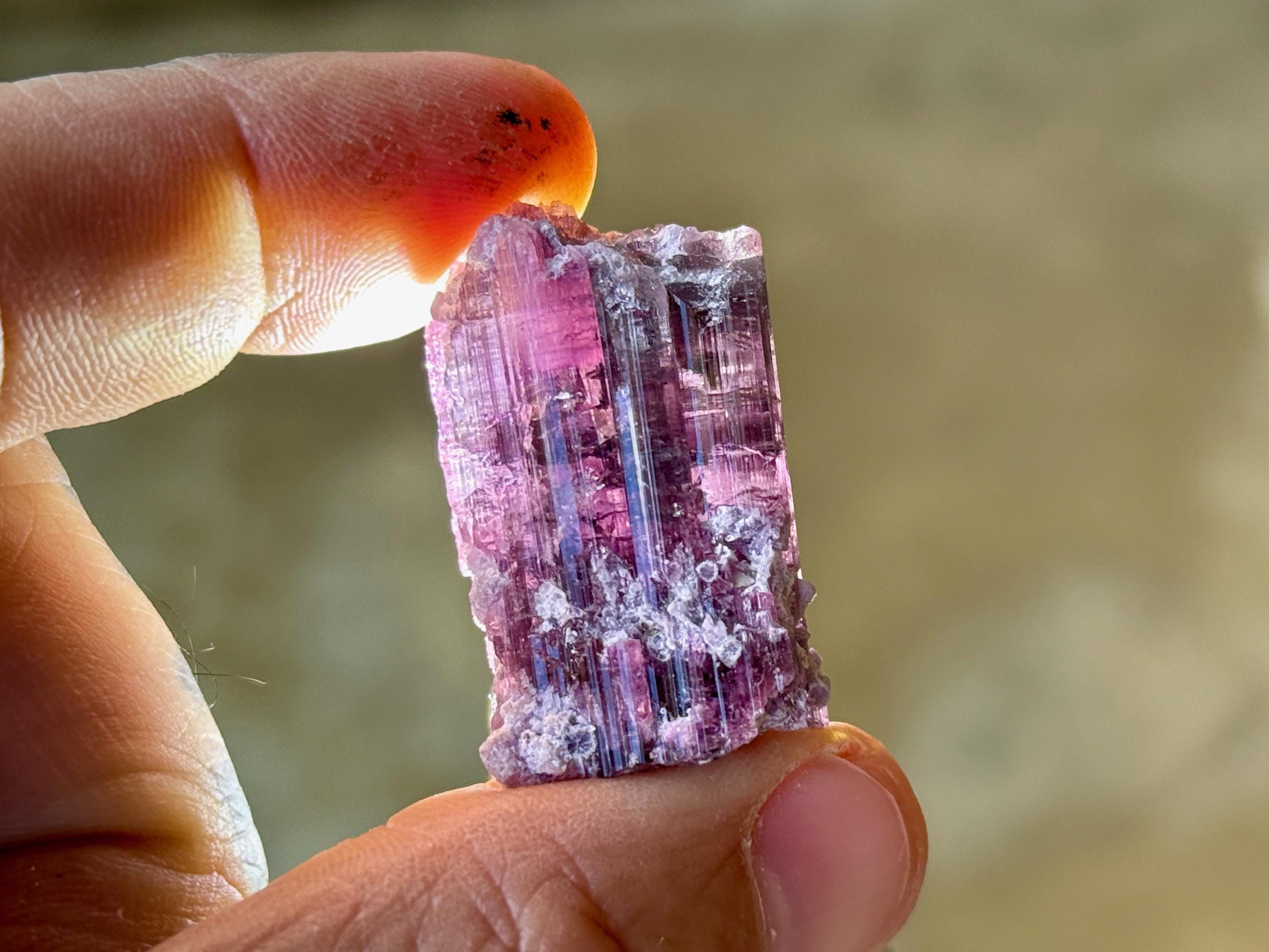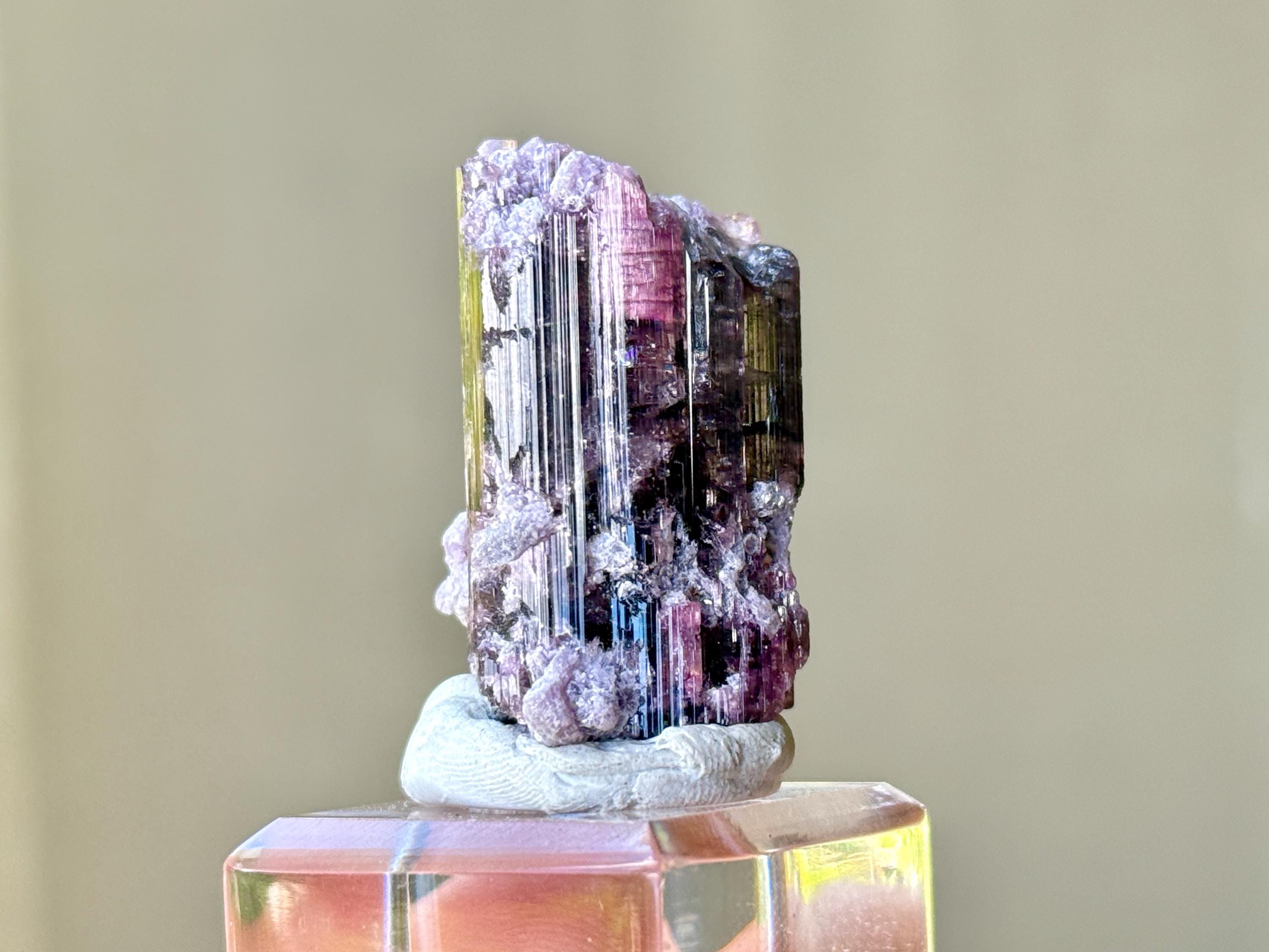 This crystal is most likely a Pink Tourmaline that has absorbed some purple color from the Lepidolite inclusions that shared that pocket with it, some of which we can see encrusted on the exterior. In some light and angles, it will appear more pink, and at others we can see the purple colors come out more. When backlit, as in Photos 3-5 and 10-11, we can really see how beautifully it passes light.