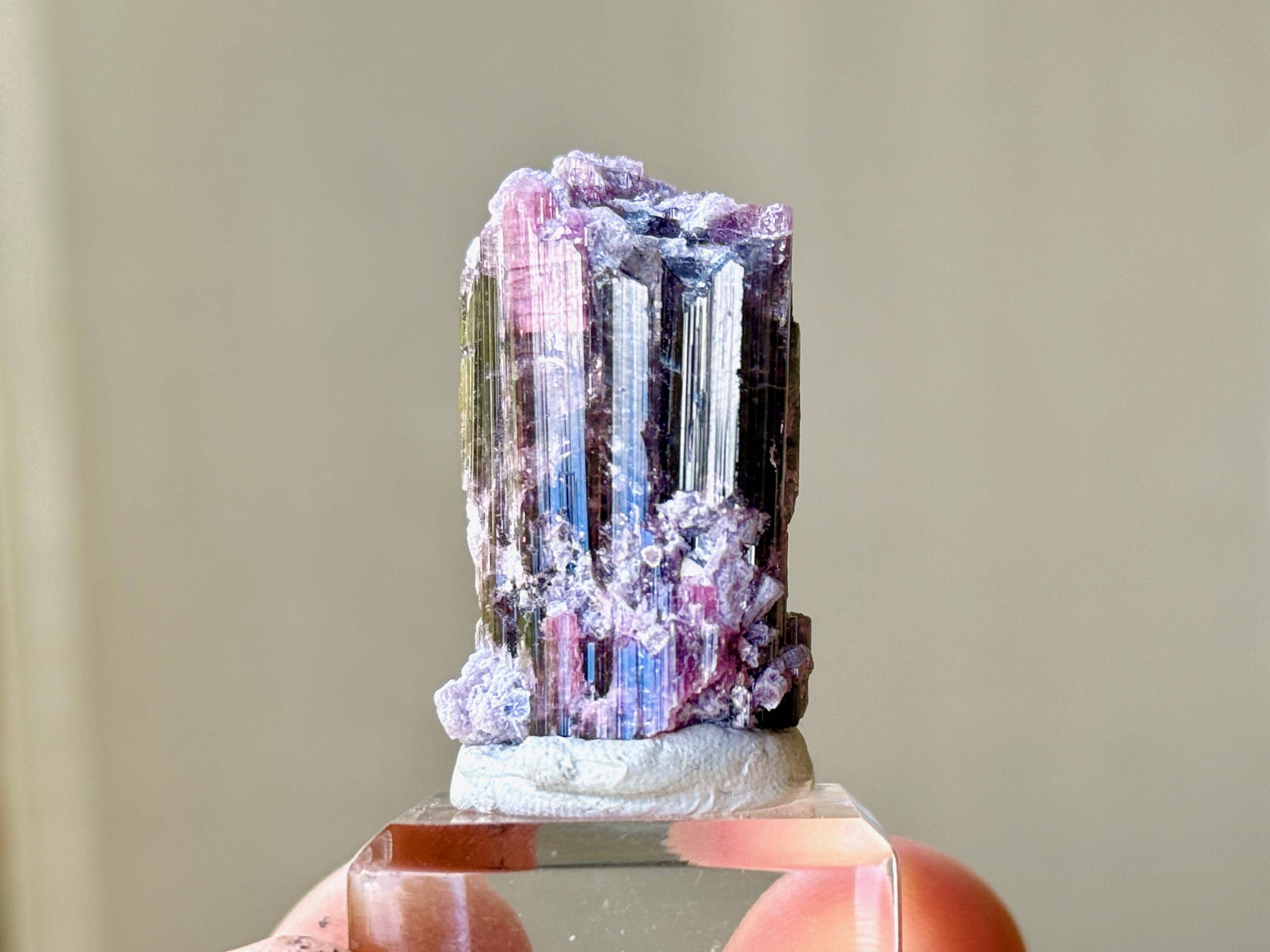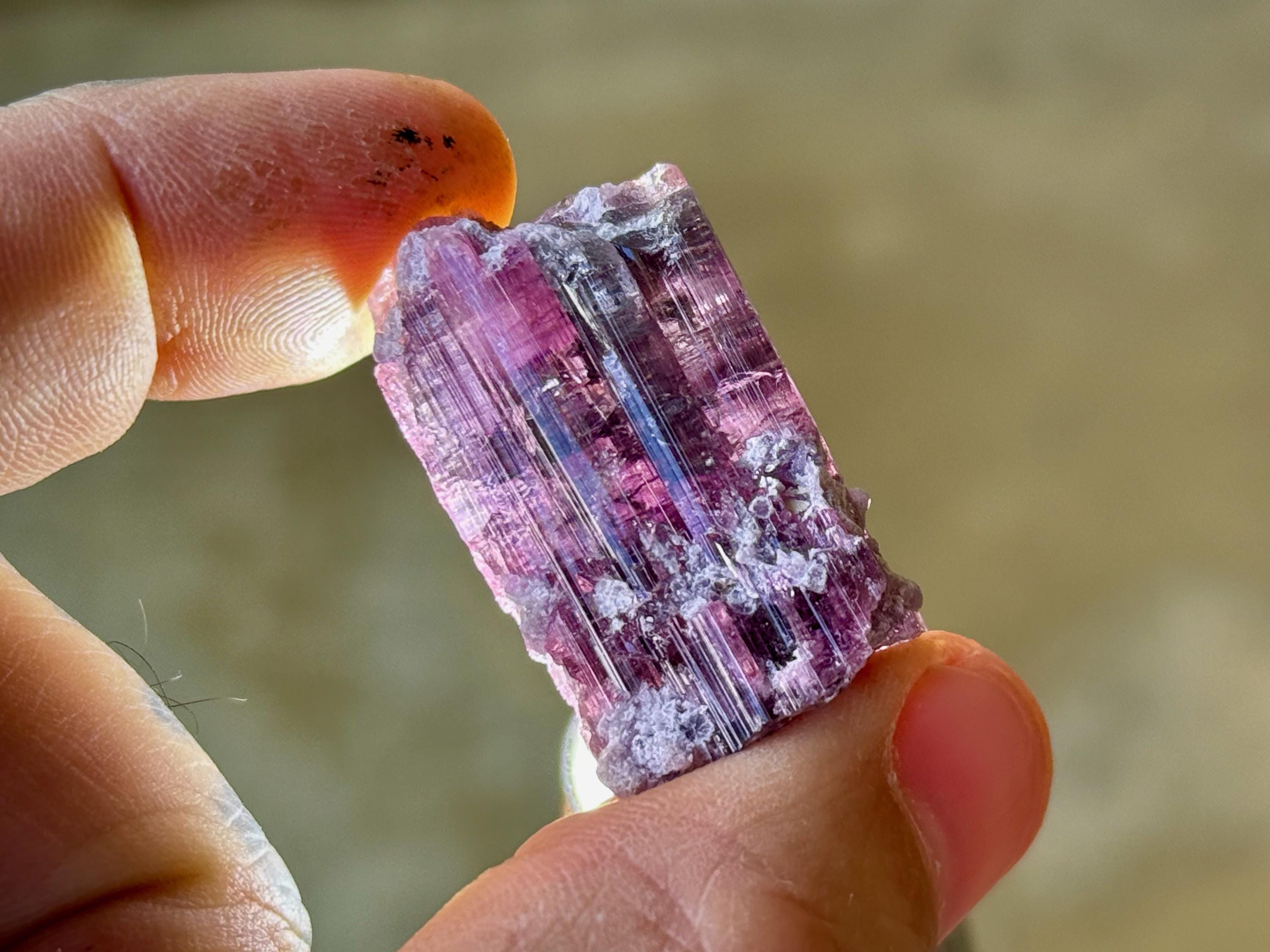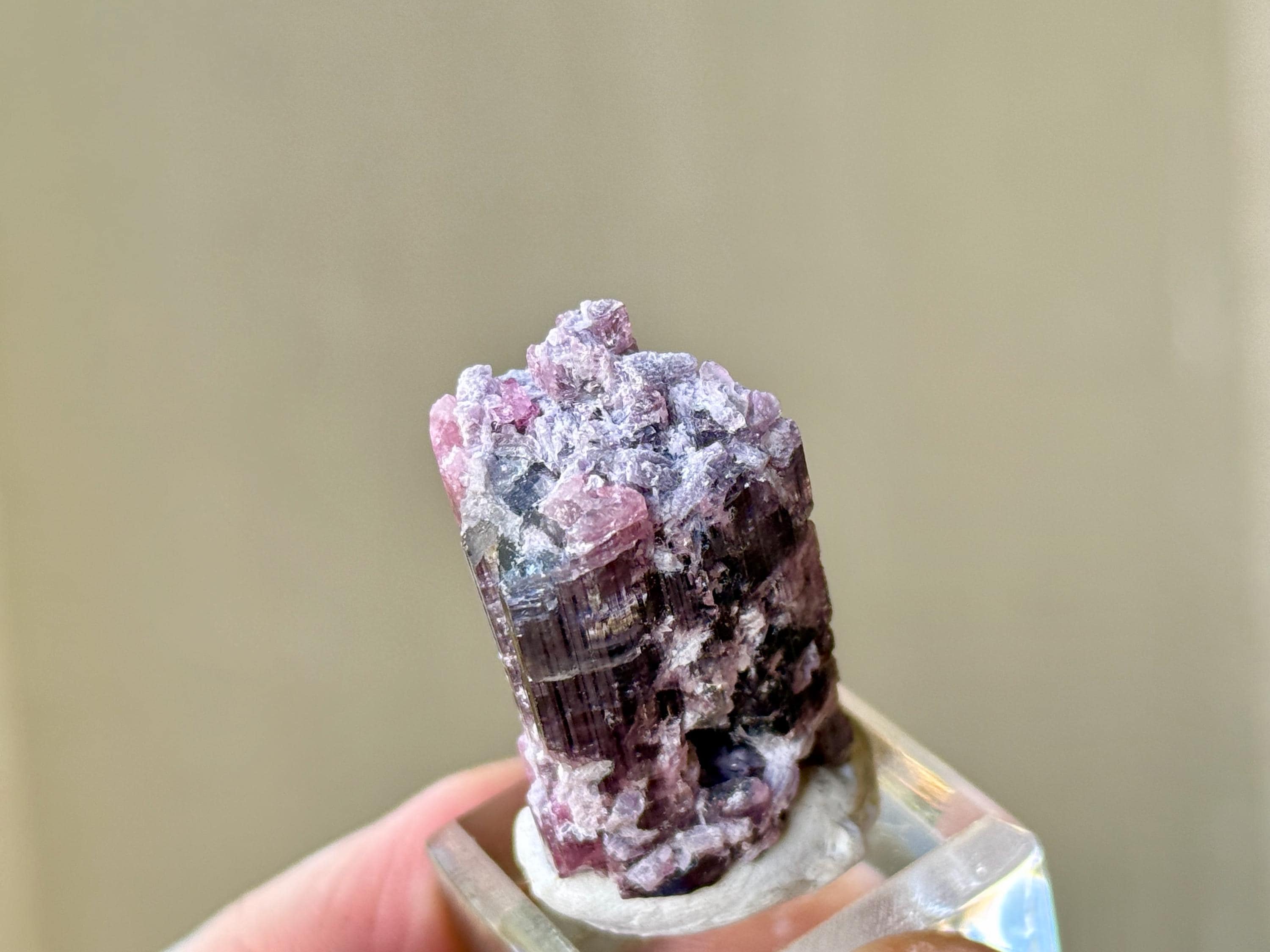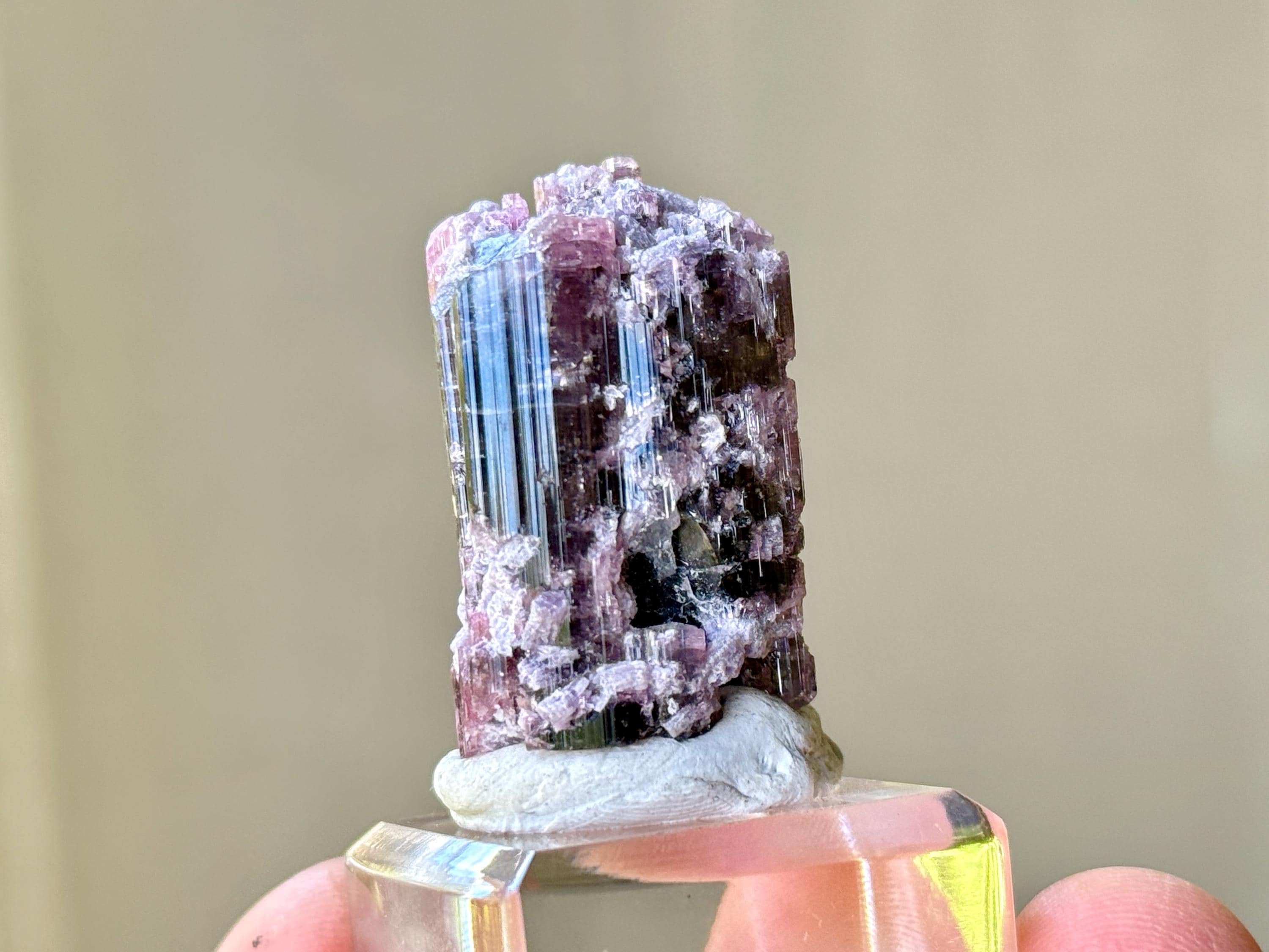 This crystal is most likely a Pink Tourmaline that has absorbed some purple color from the Lepidolite inclusions that shared that pocket with it, some of which we can see encrusted on the exterior. In some light and angles, it will appear more pink, and at others we can see the purple colors come out more. When backlit, as in Photos 3-5 and 10-11, we can really see how beautifully it passes light.