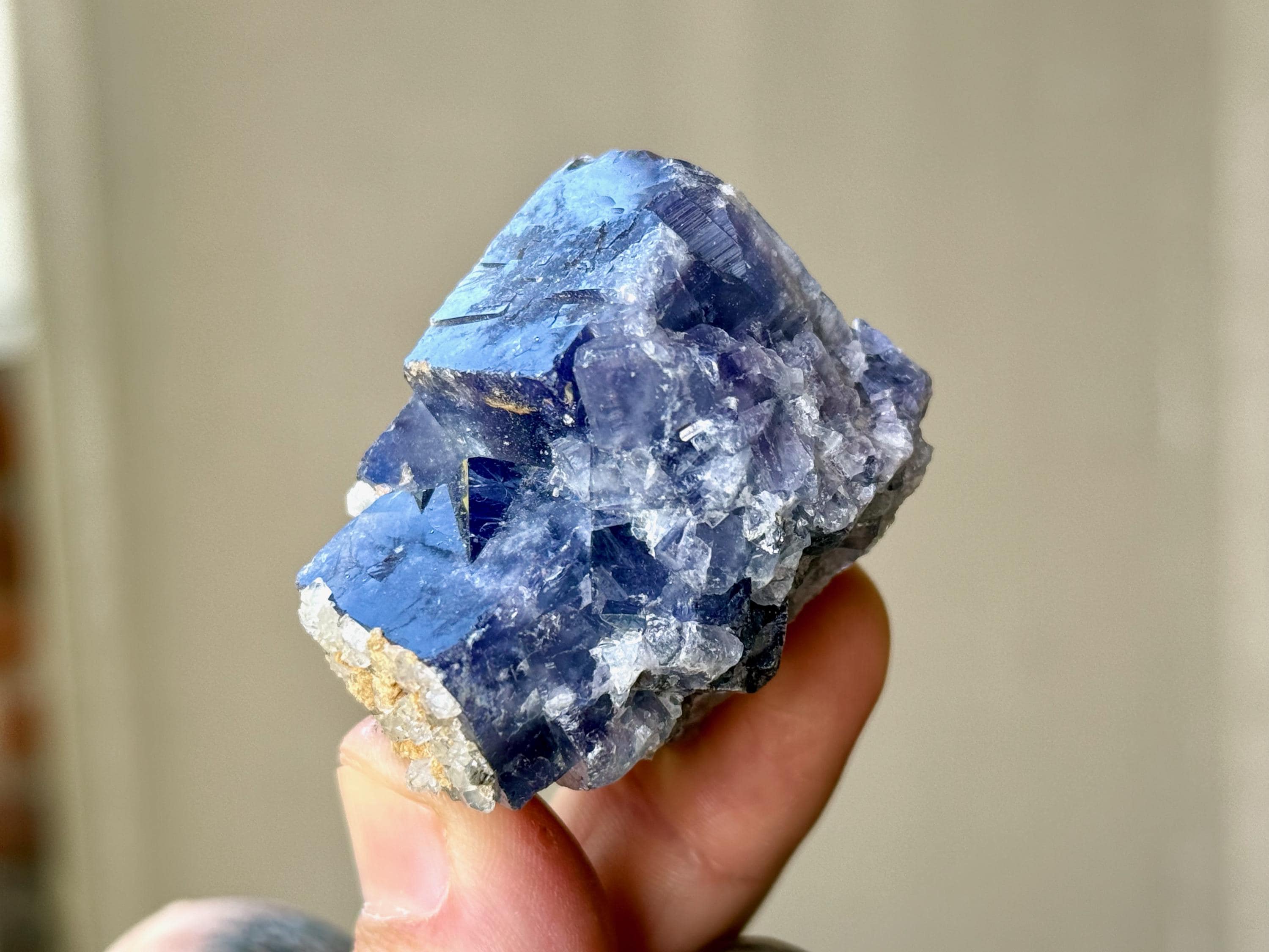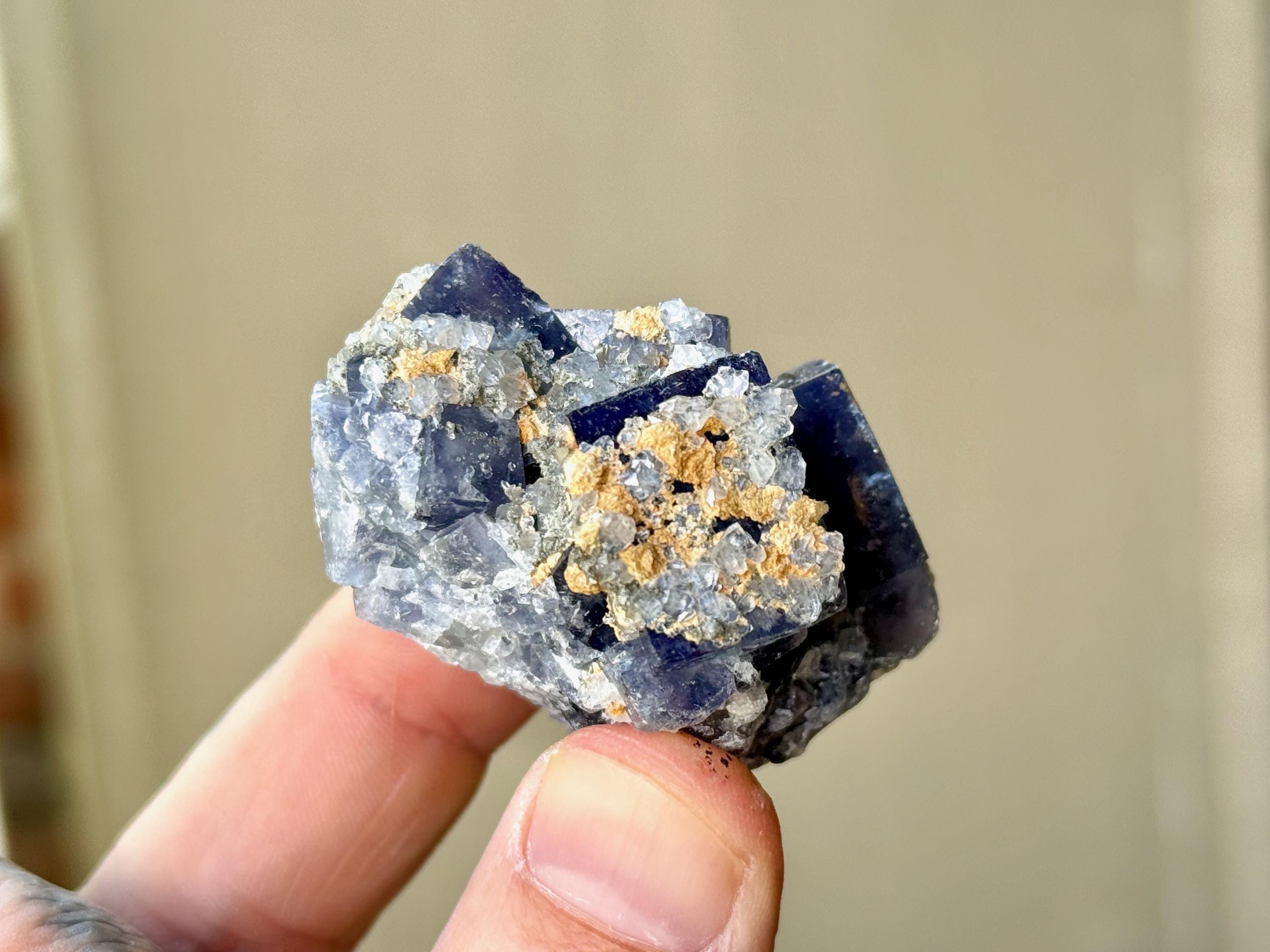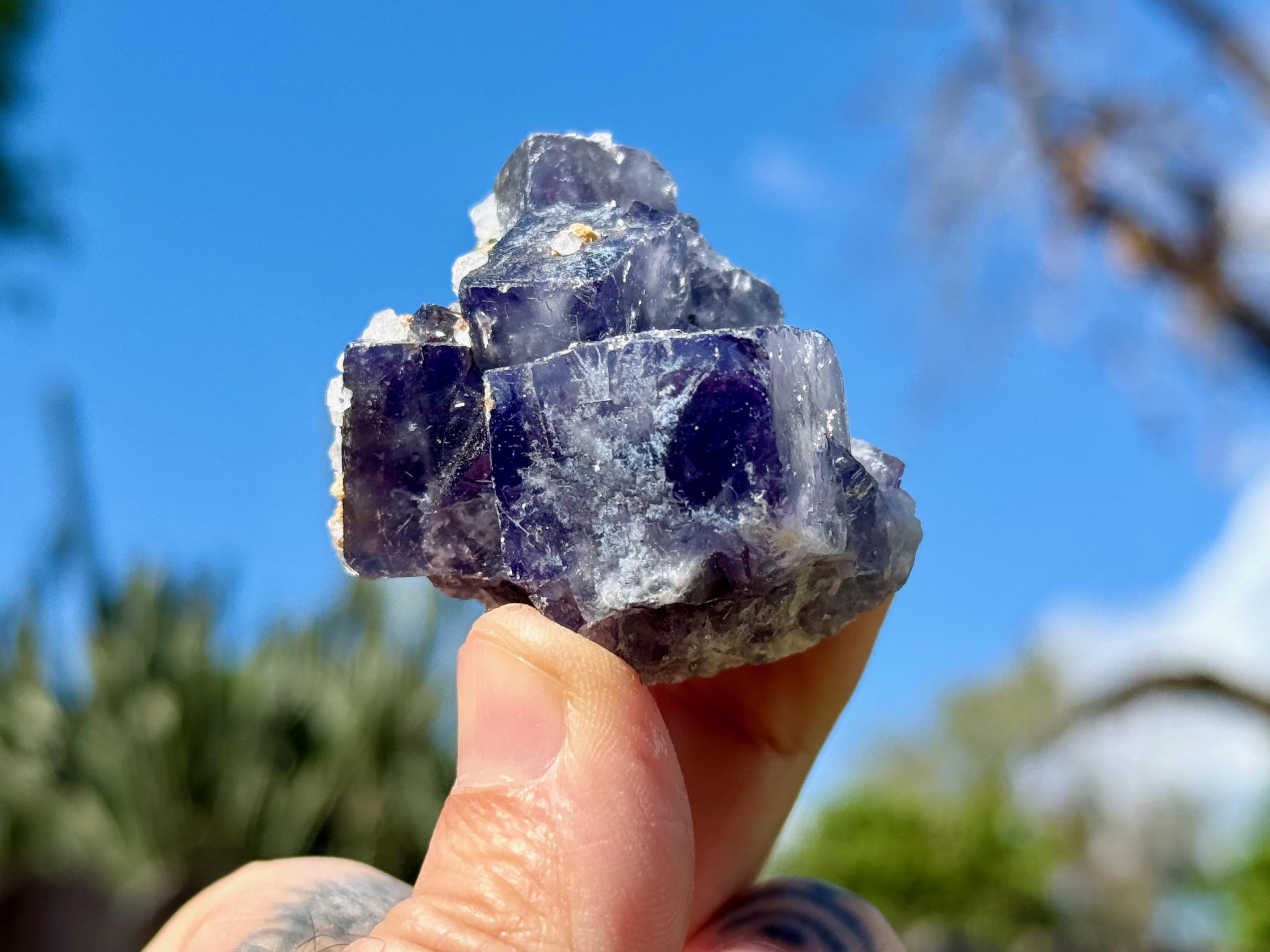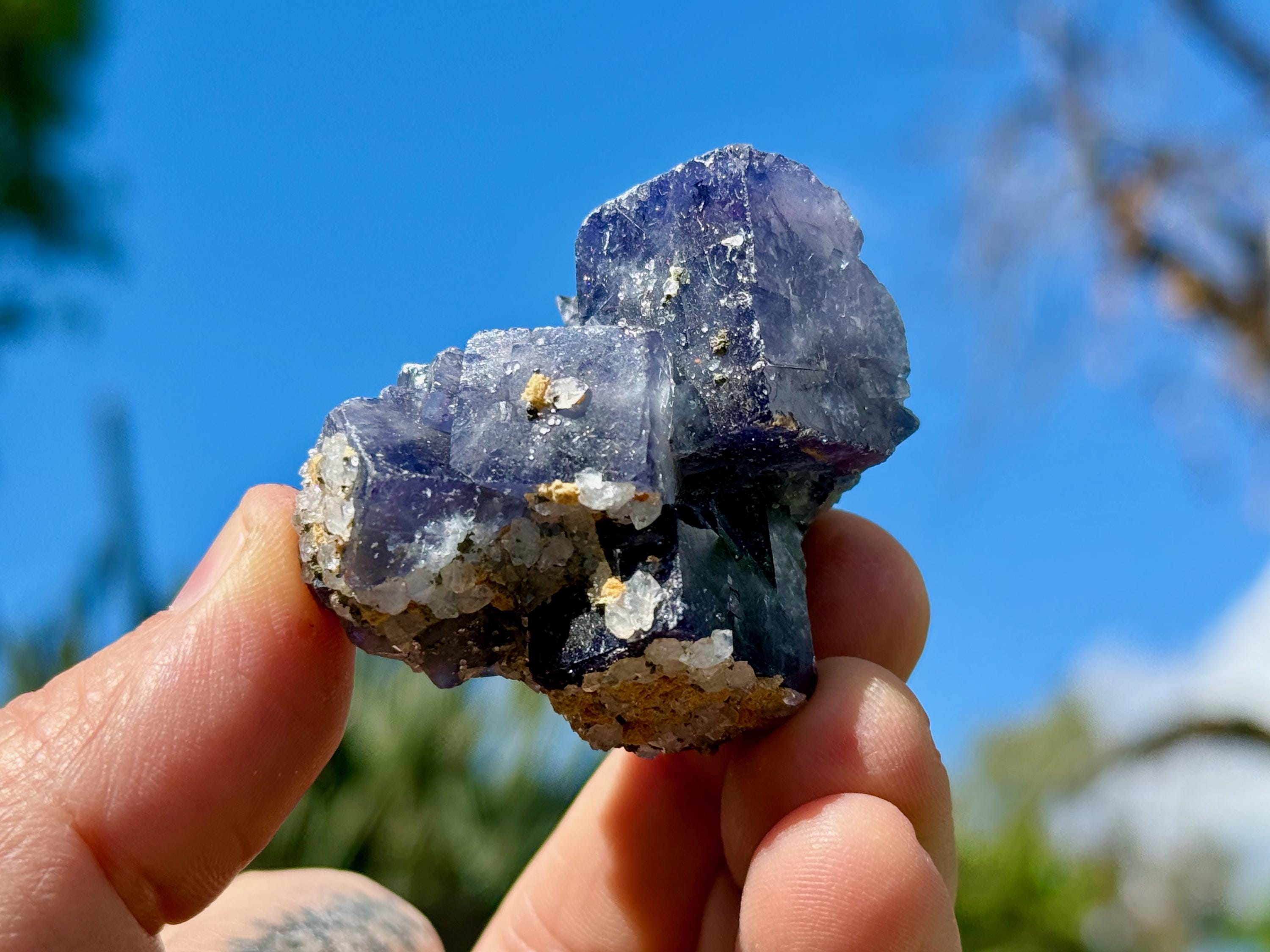 **PLEASE NOTE we've included photos that were taken in 1) partially shaded outdoor lighting 2) natural direct sunlight 3) backlighting to show off their translucency and hues and 4) with direct UV light to show their UV reactivity. We've done our best to faithfully represent these unique crystals in a variety of light environments. Please be aware that these Fluorites can appear differently depending on the environment in which you are enjoying them.