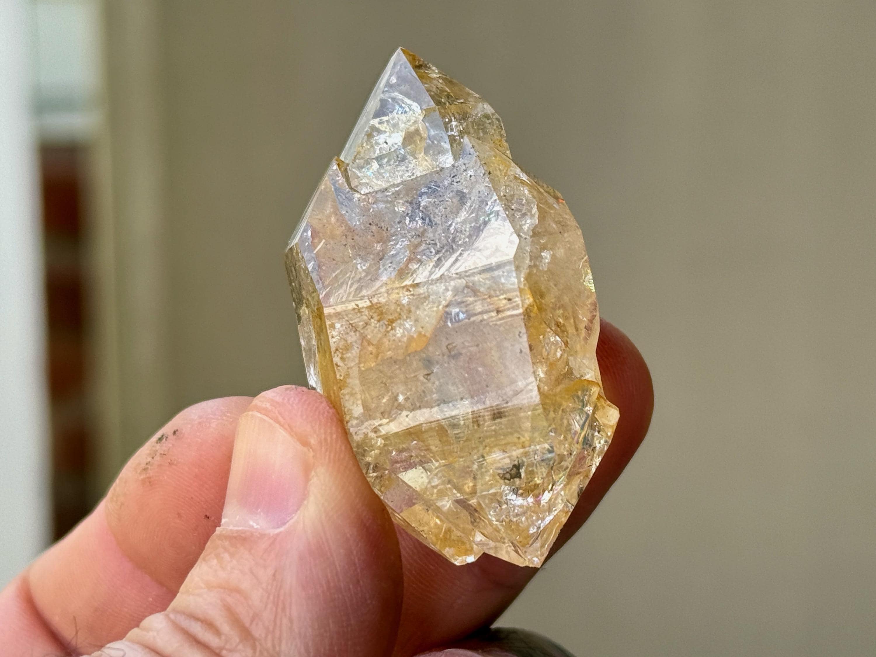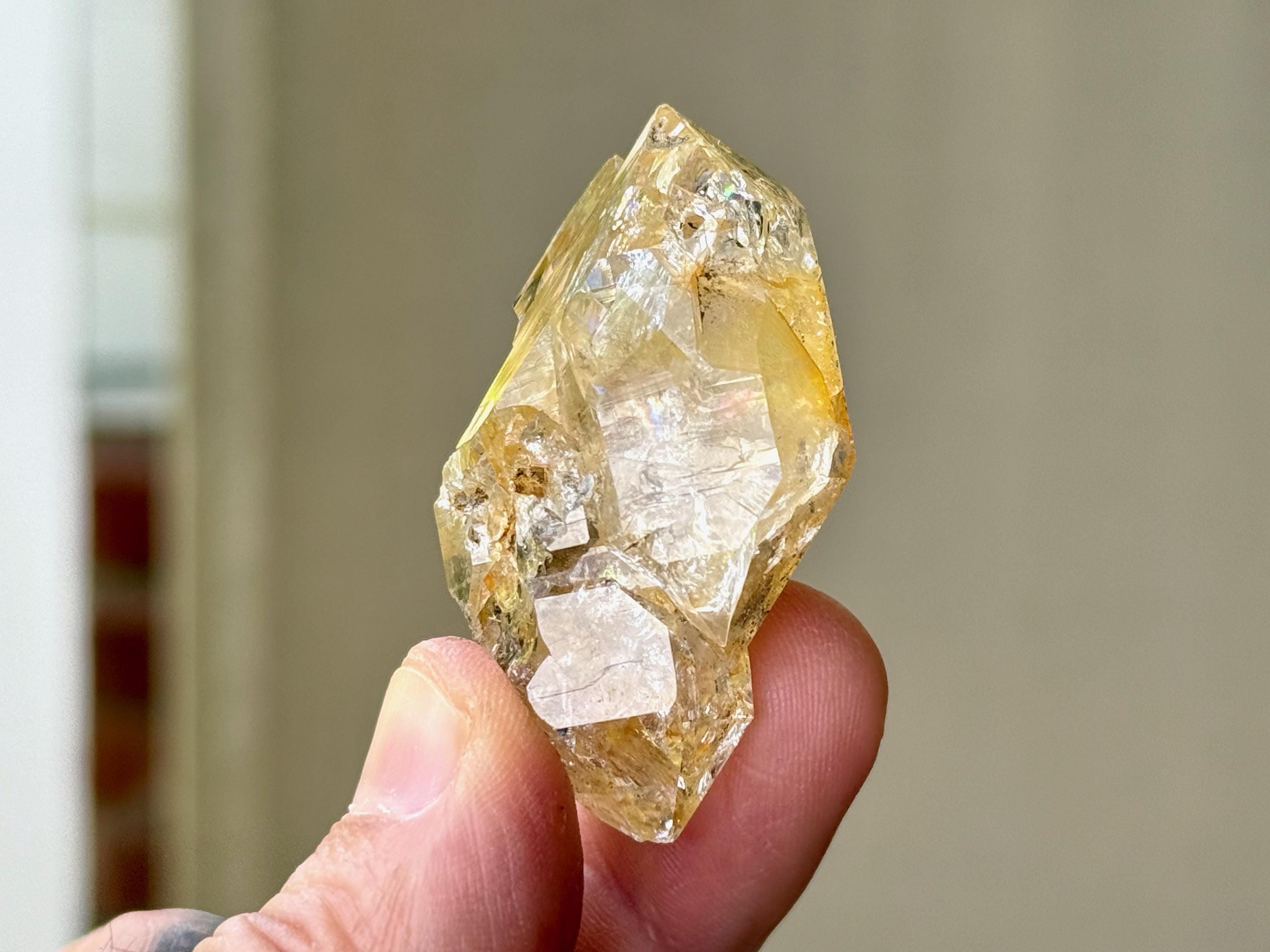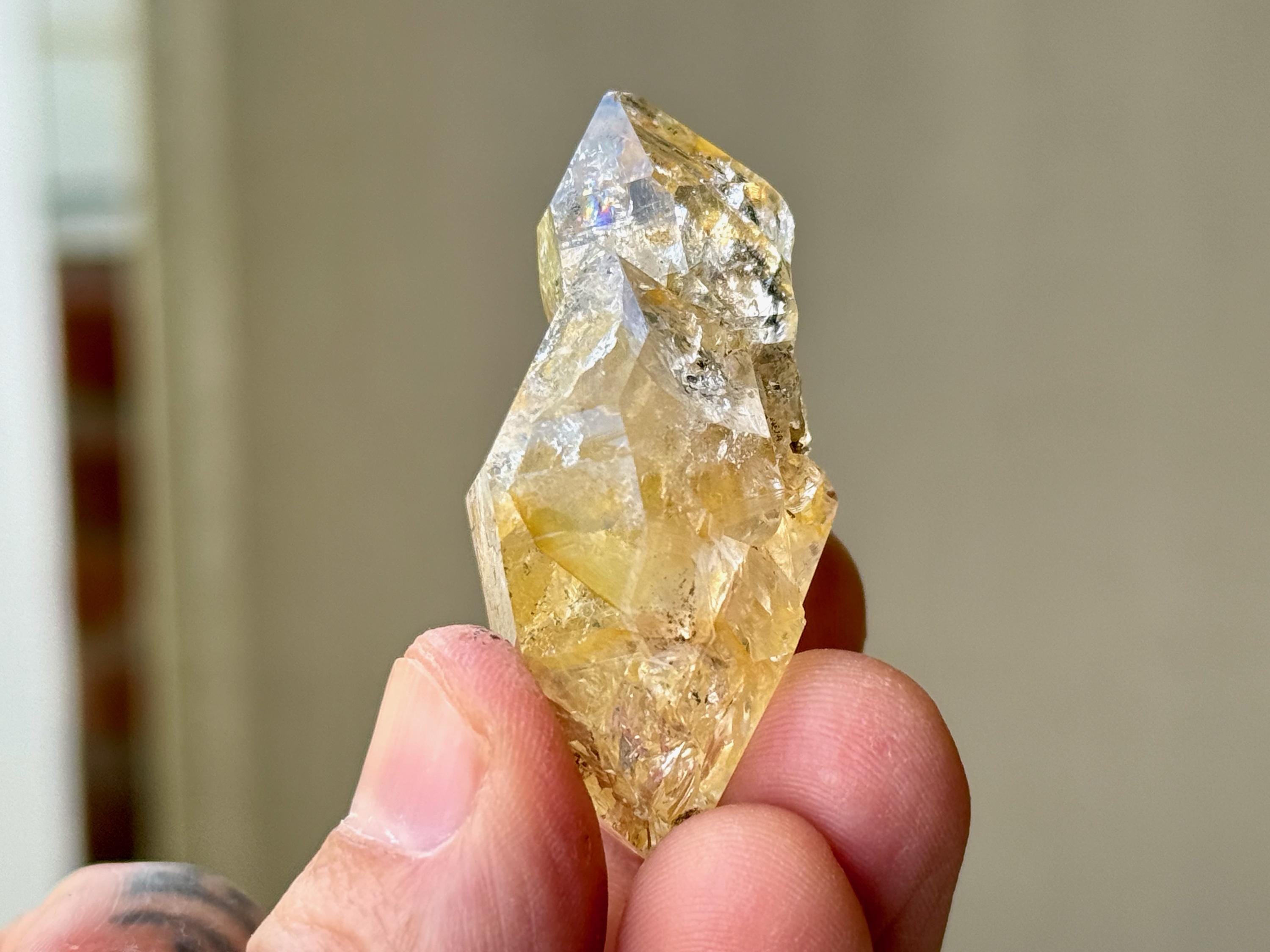 Vibrant golden color, superb clarity and supreme luster to this gorgeous Golden Healer Herkimer Diamond Quartz. It's the excellent clarity that invites us to see all the lovely crystalline structures within. The absolute star of the show here is the vivid rainbow in the tip (Photo 1).