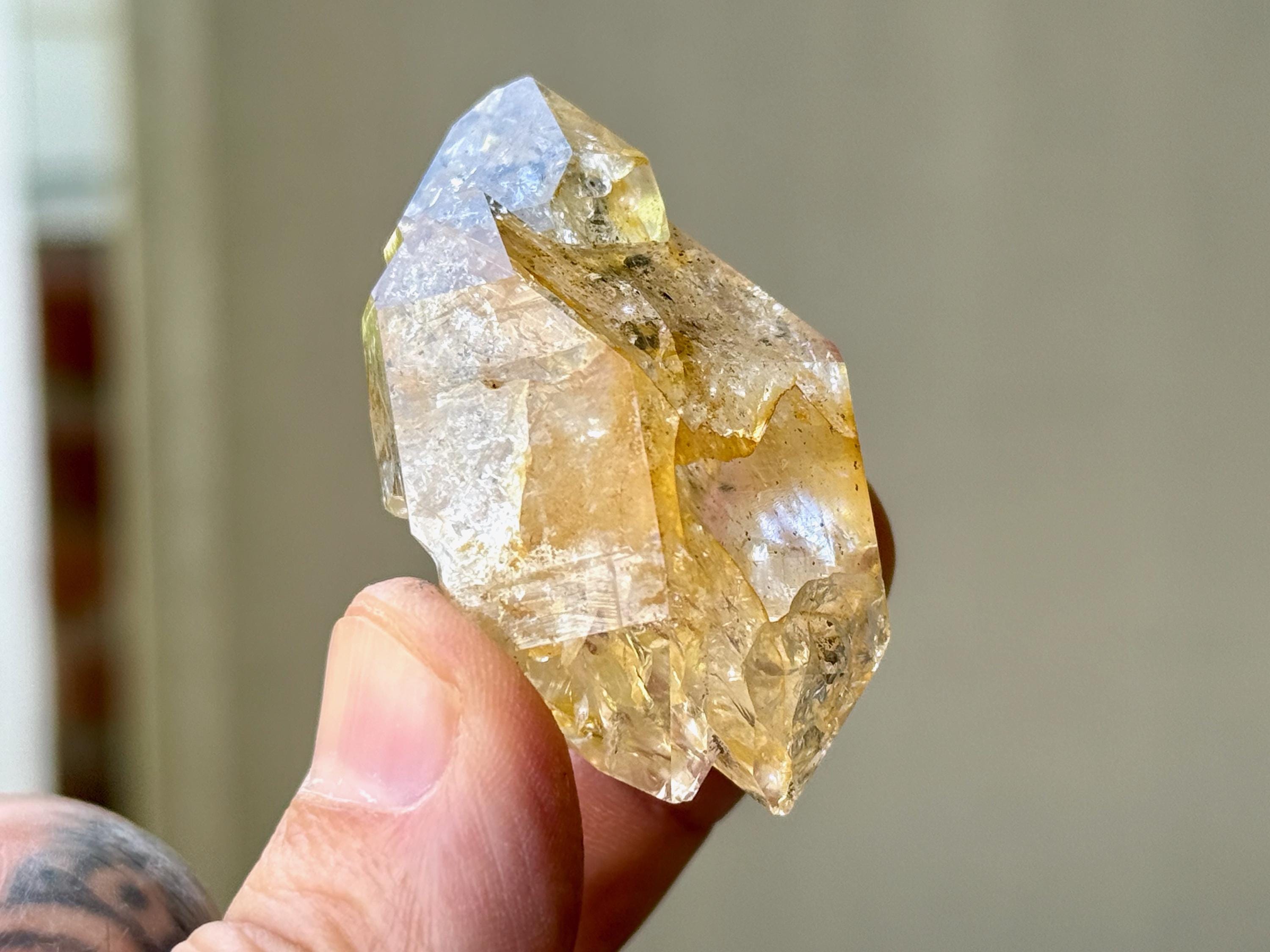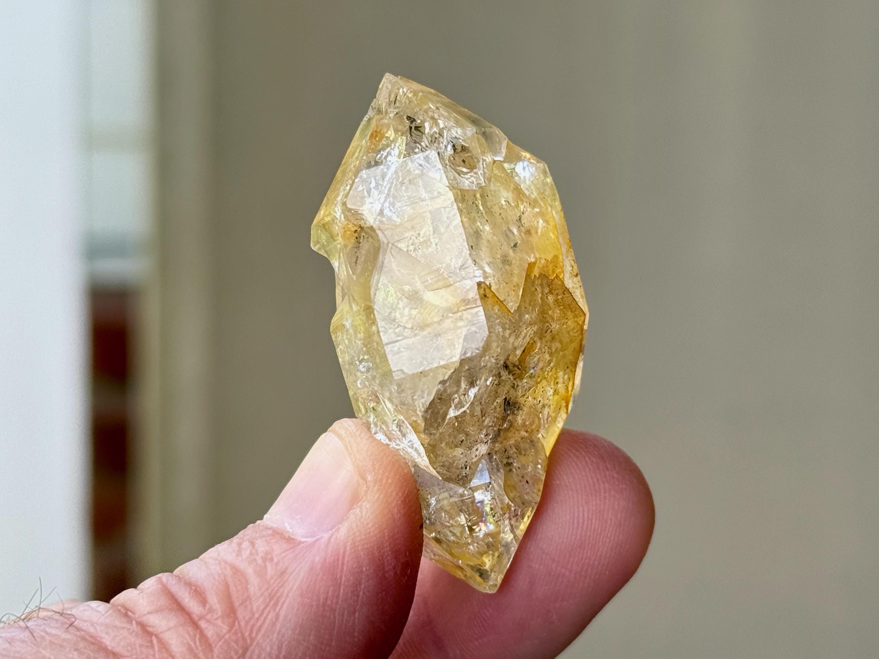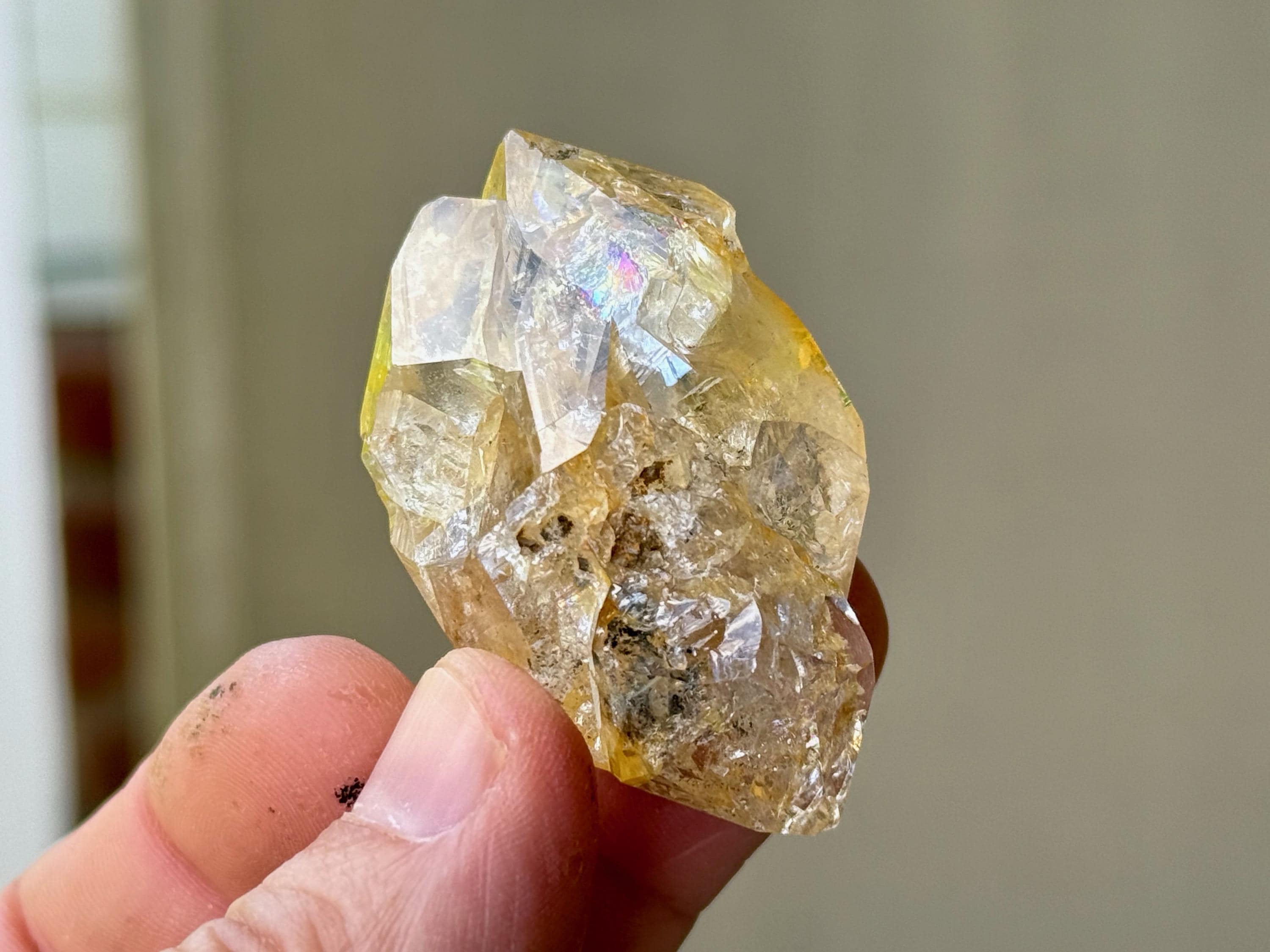 Vibrant golden color, superb clarity and supreme luster to this gorgeous Golden Healer Herkimer Diamond Quartz. It's the excellent clarity that invites us to see all the lovely crystalline structures within. The absolute star of the show here is the vivid rainbow in the tip (Photo 1).