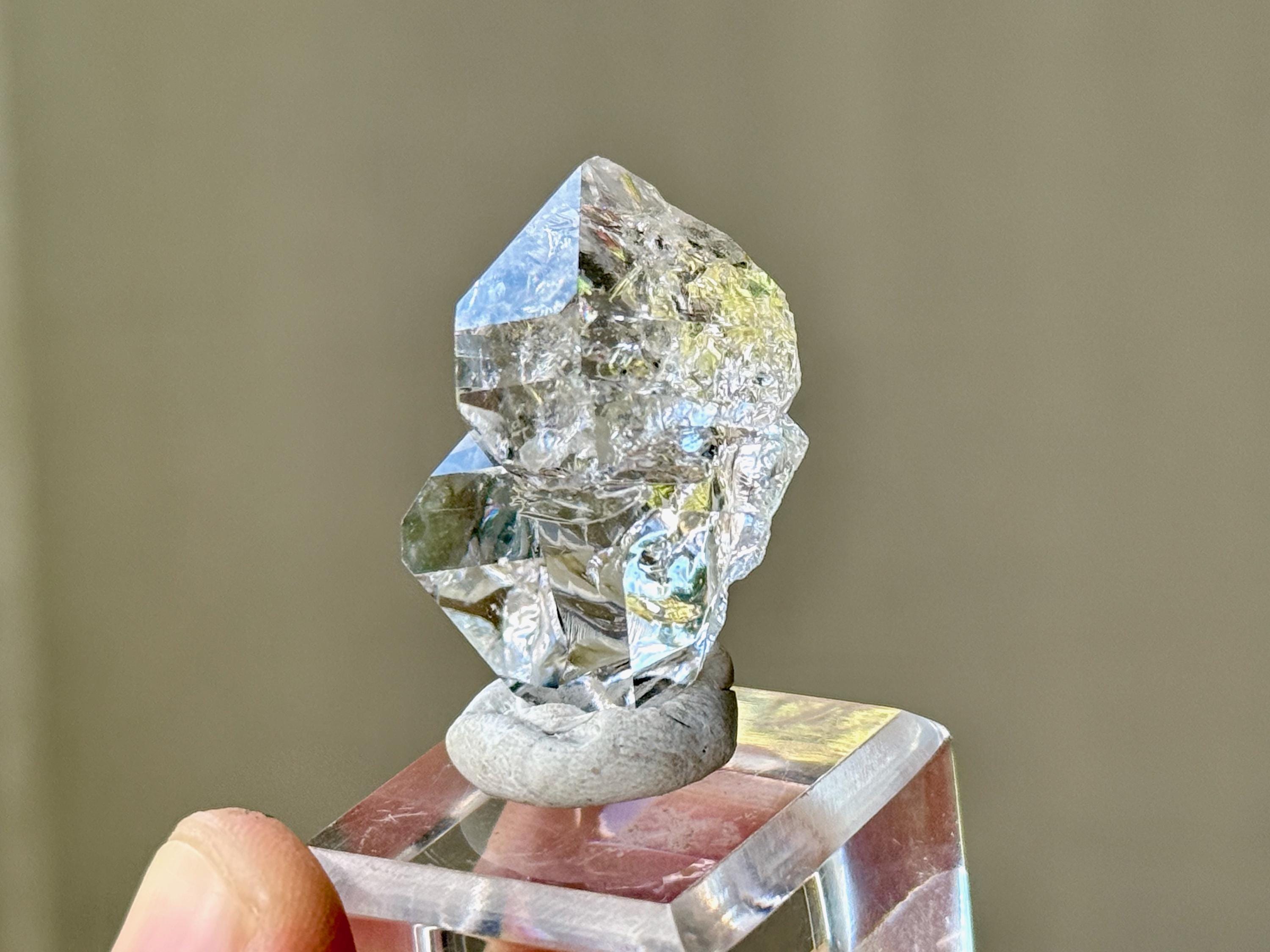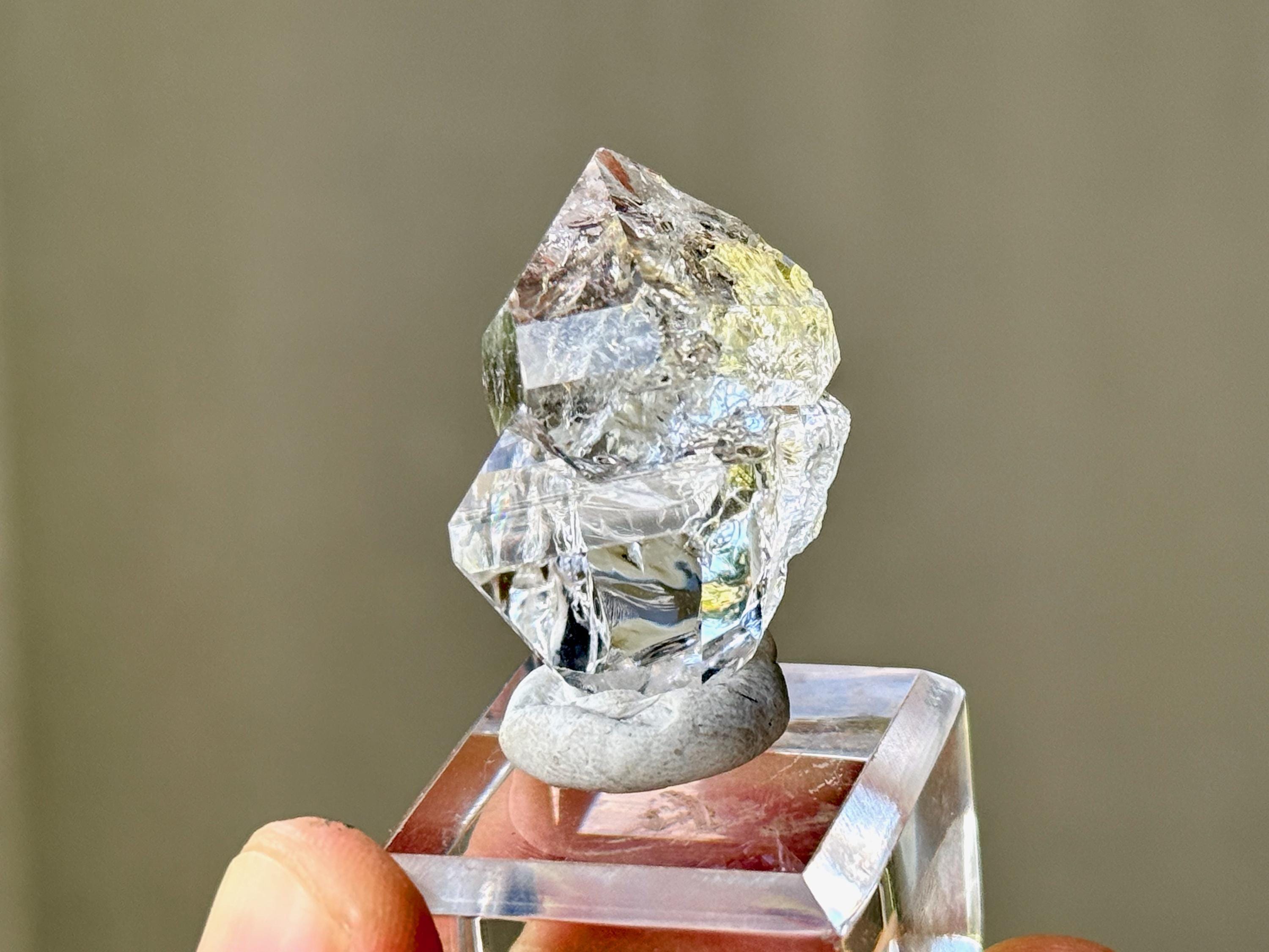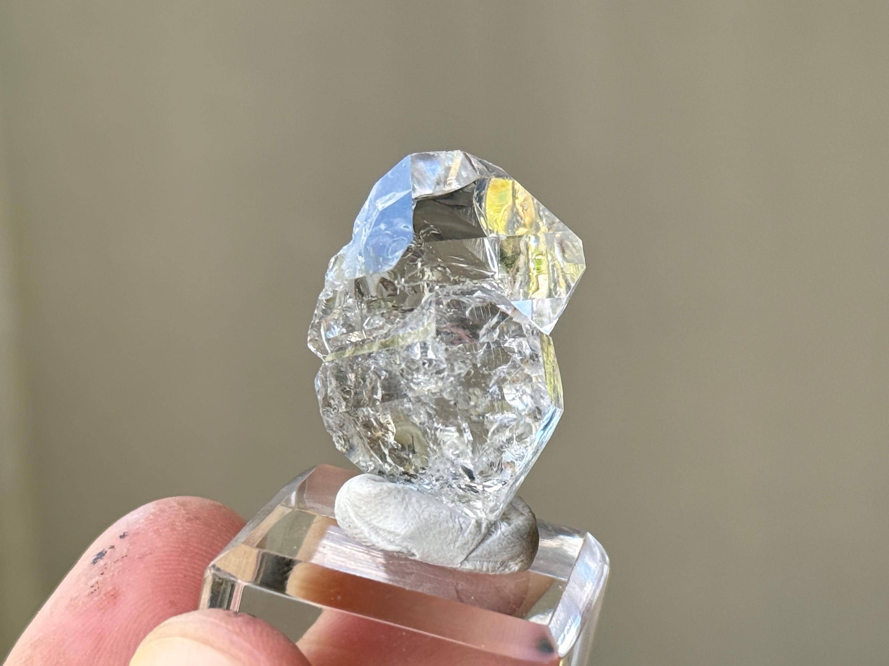One of the finest quality Herkimer Diamonds from this collection, this crystal exhibits water-clear clarity and light-bearing luster. Its basically optical, as the form and clarity produces a bit of a prismatic effect at certain angles (Photo 2).