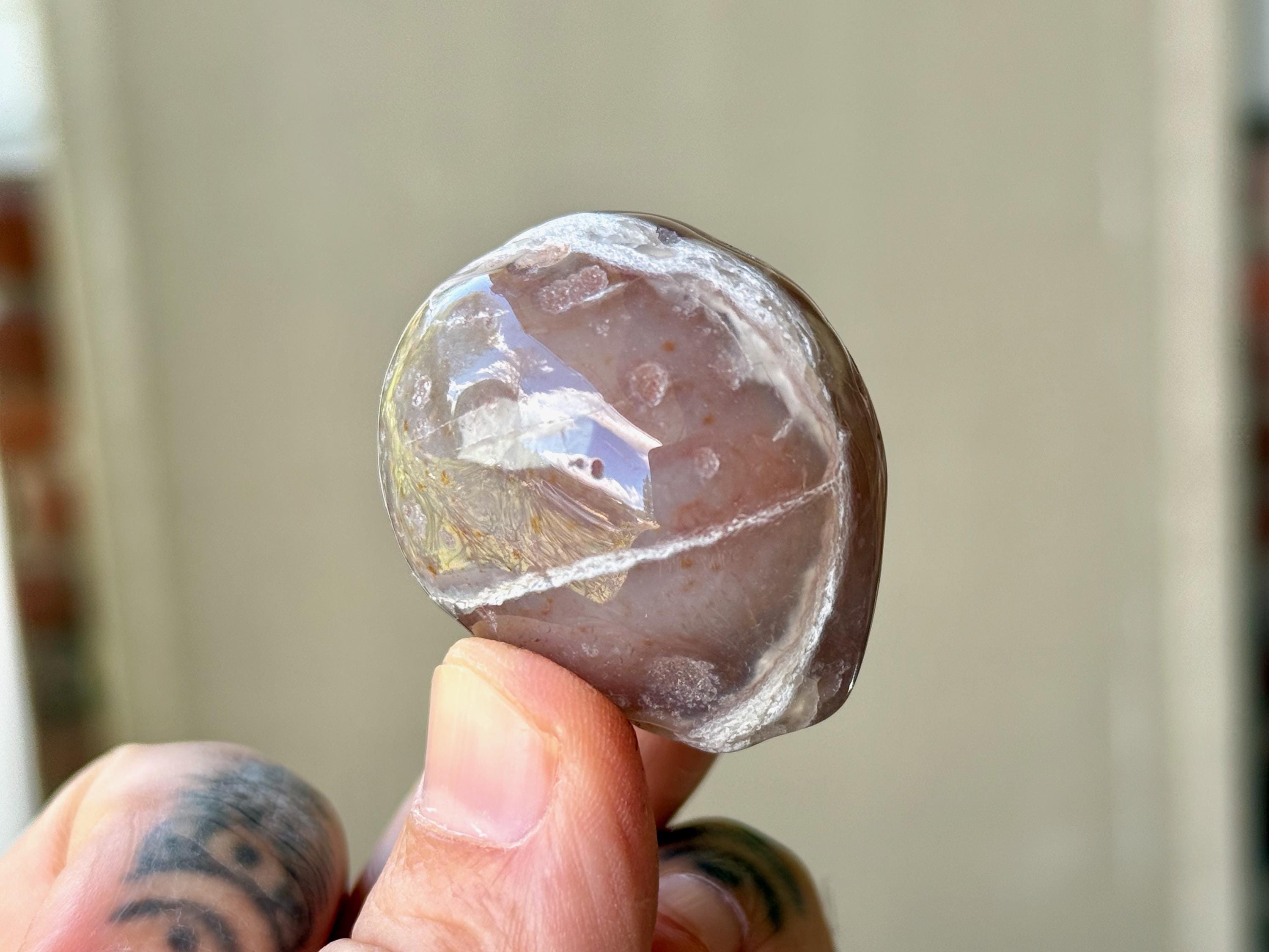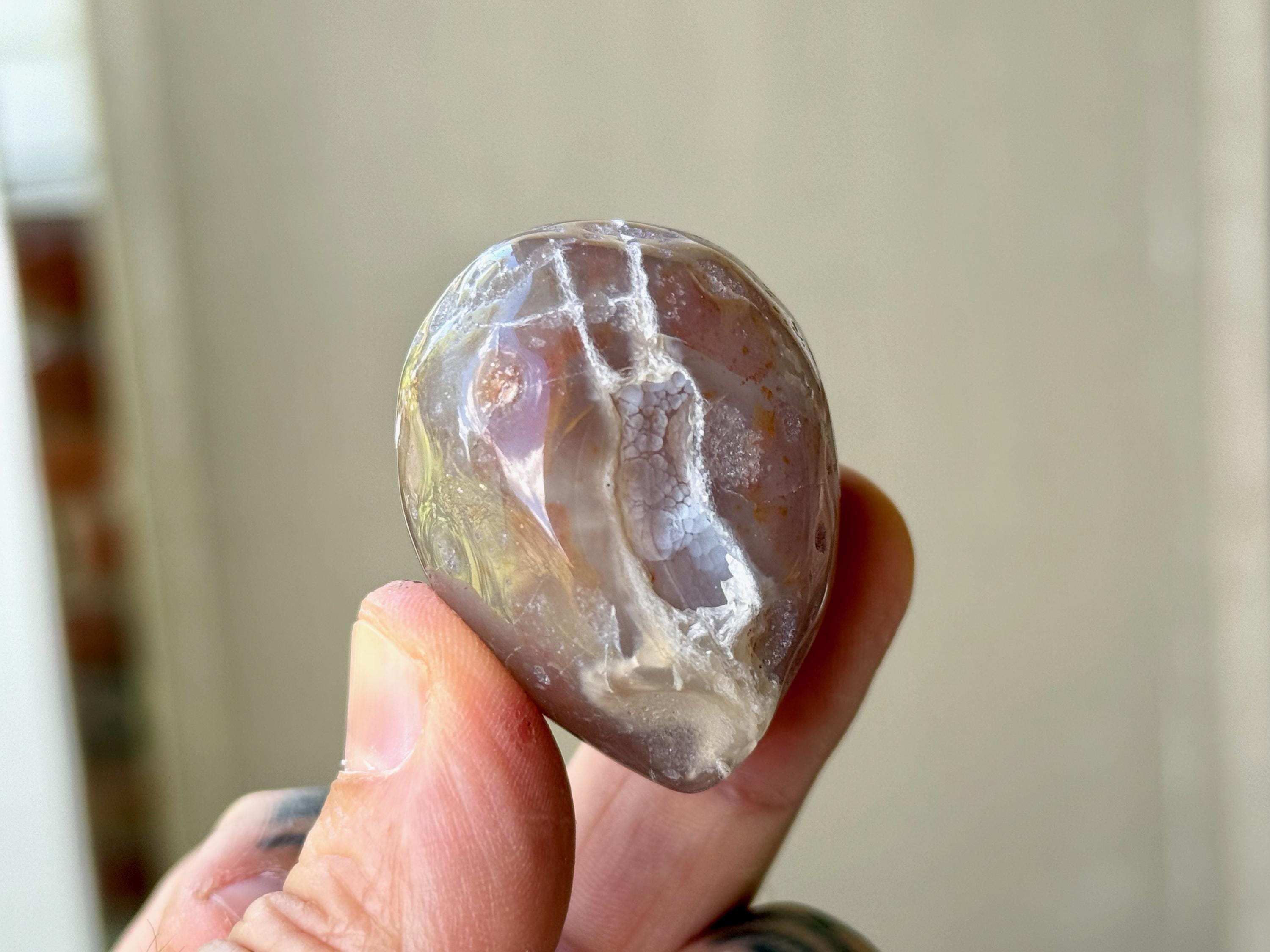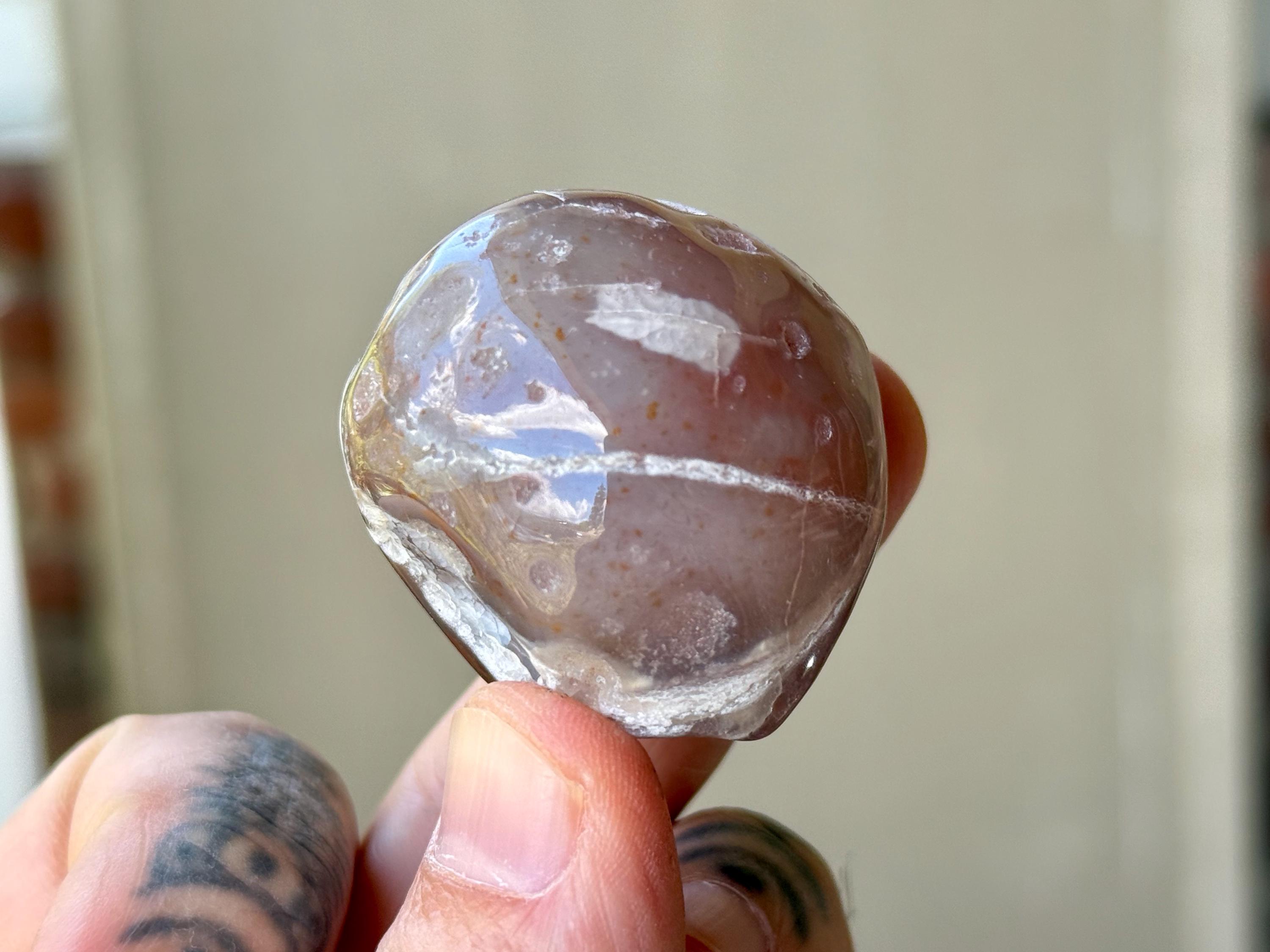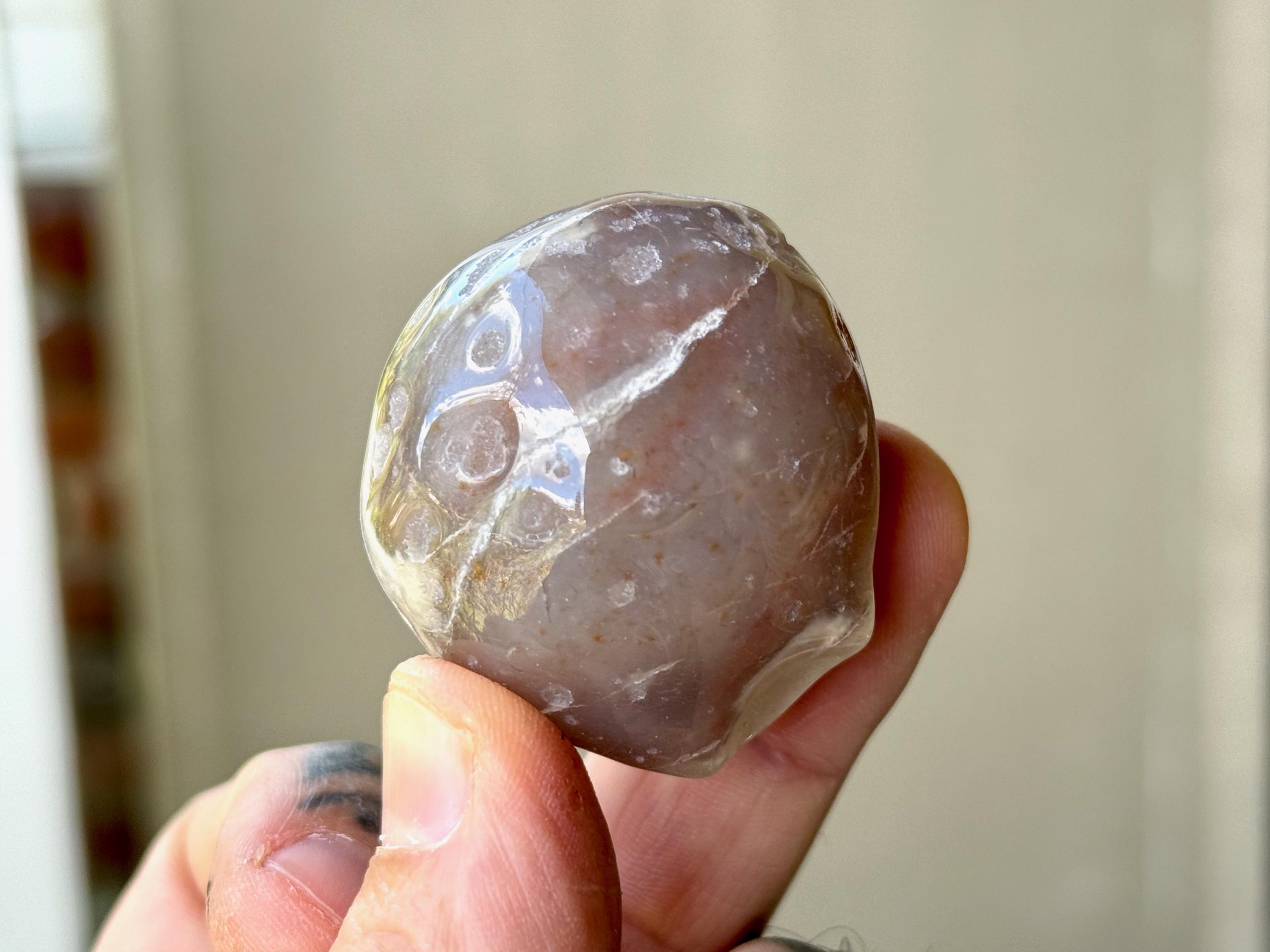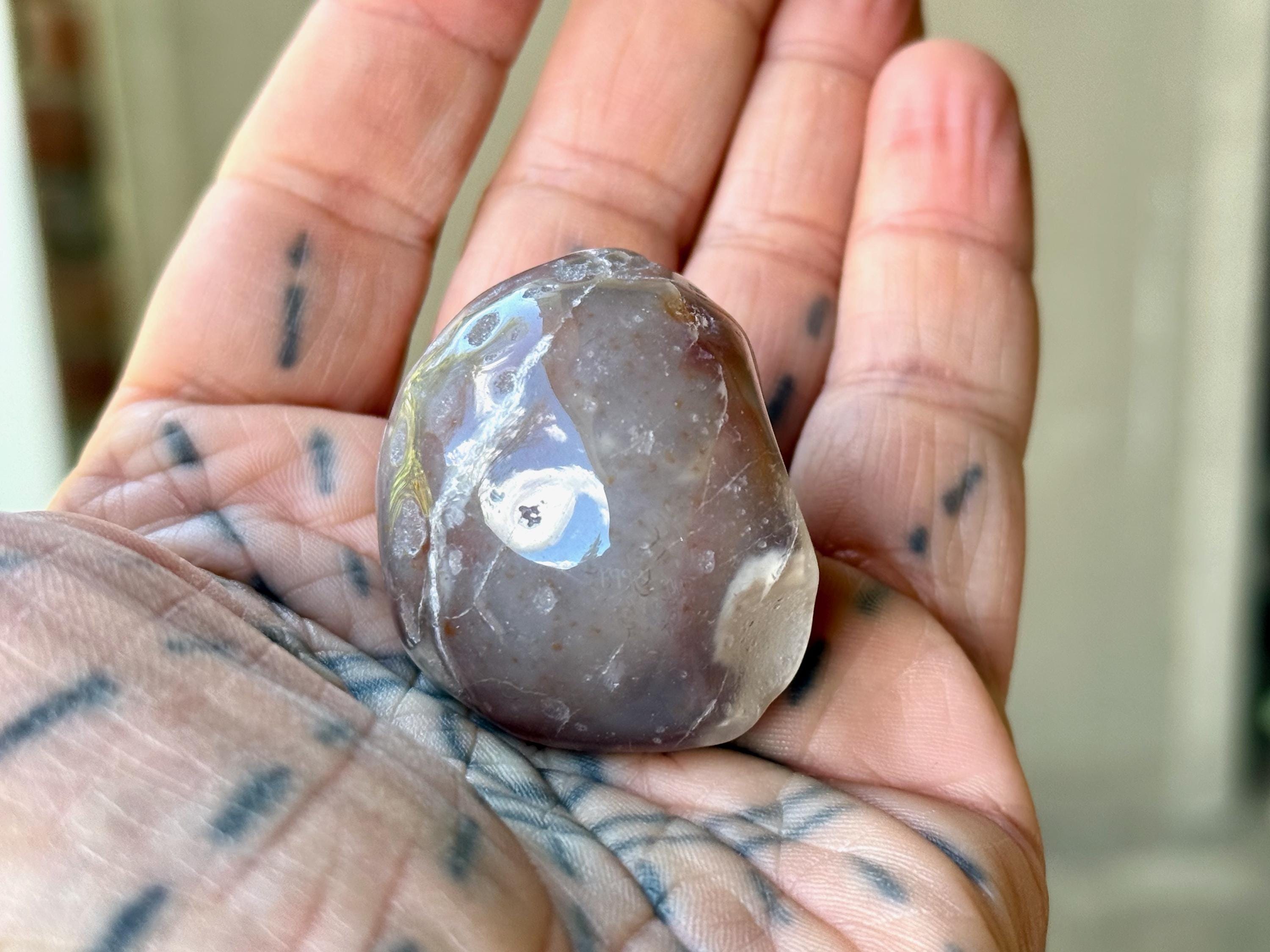 The Enhydro Agate brings a balance between the elements of the Earth and Water. Agate is a stone with the gentle protective energy of stability and composure, encouraging self-confidence and self-reliance. The inclusion of ancient water, brings an energy of increased empathy and spiritual receptivity. This is a beautiful stone for meditation and deep inner journeying.