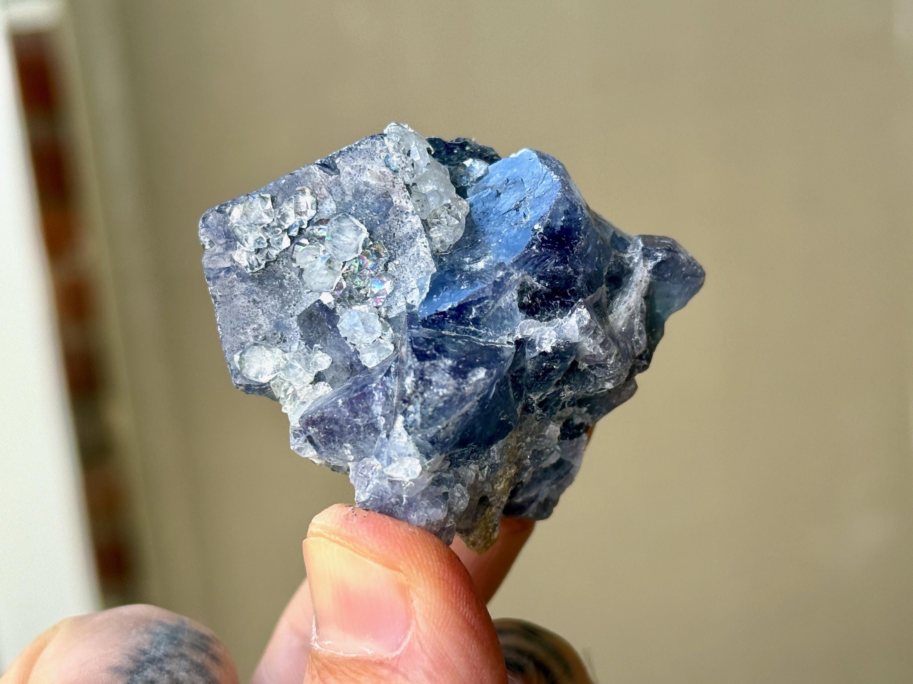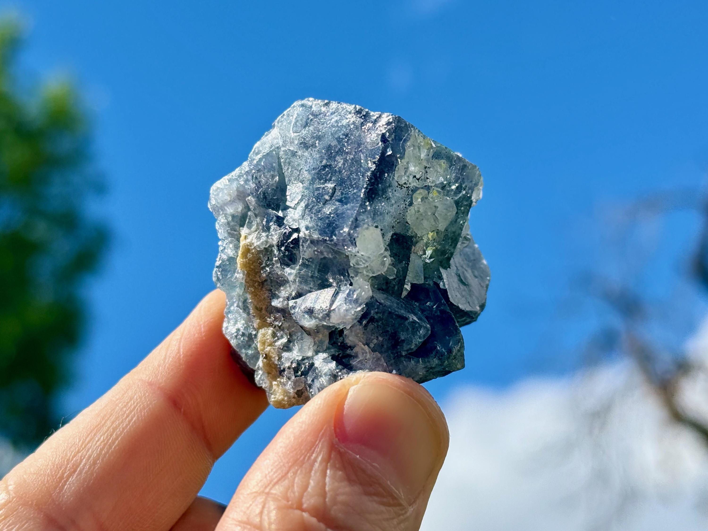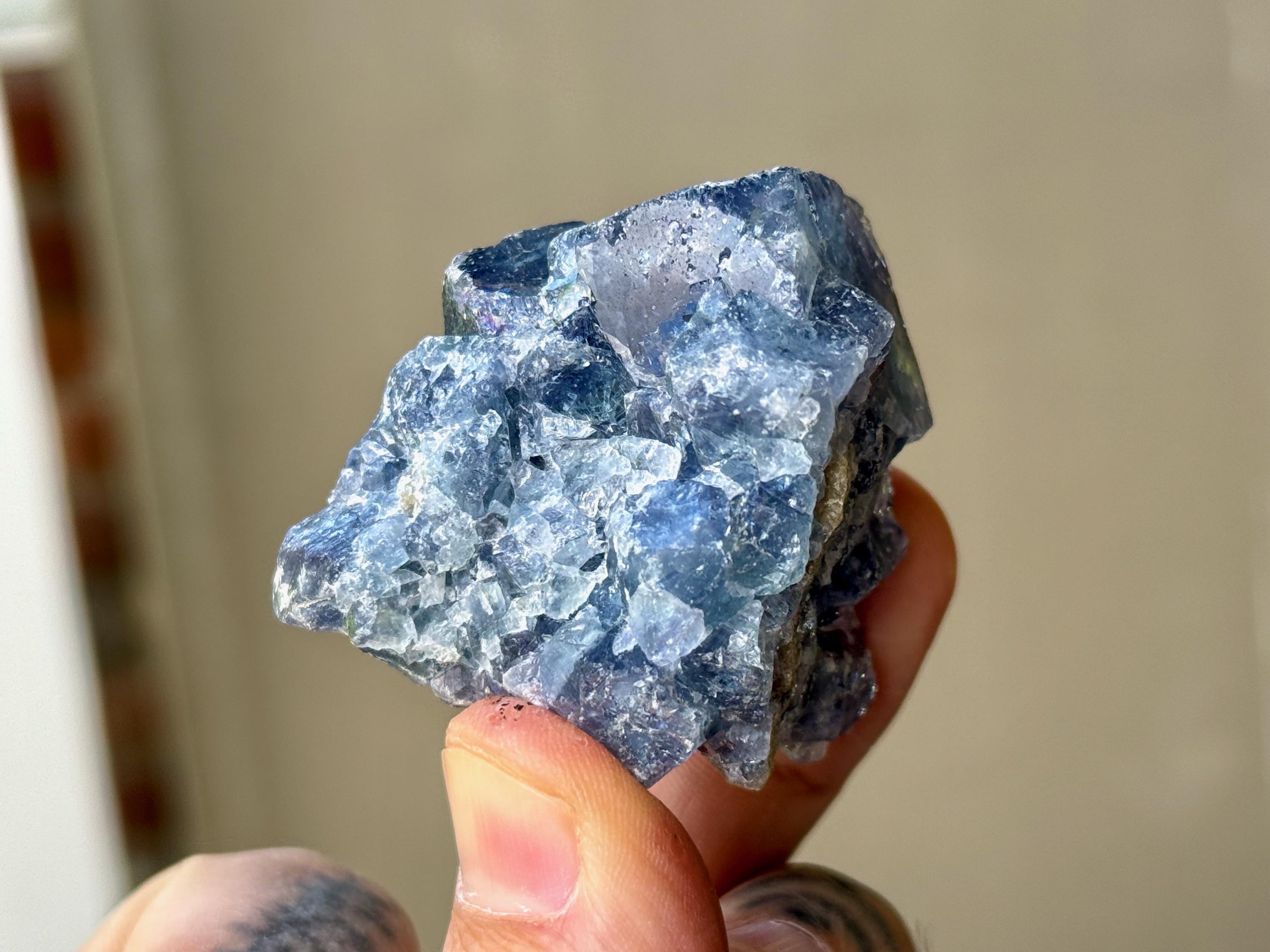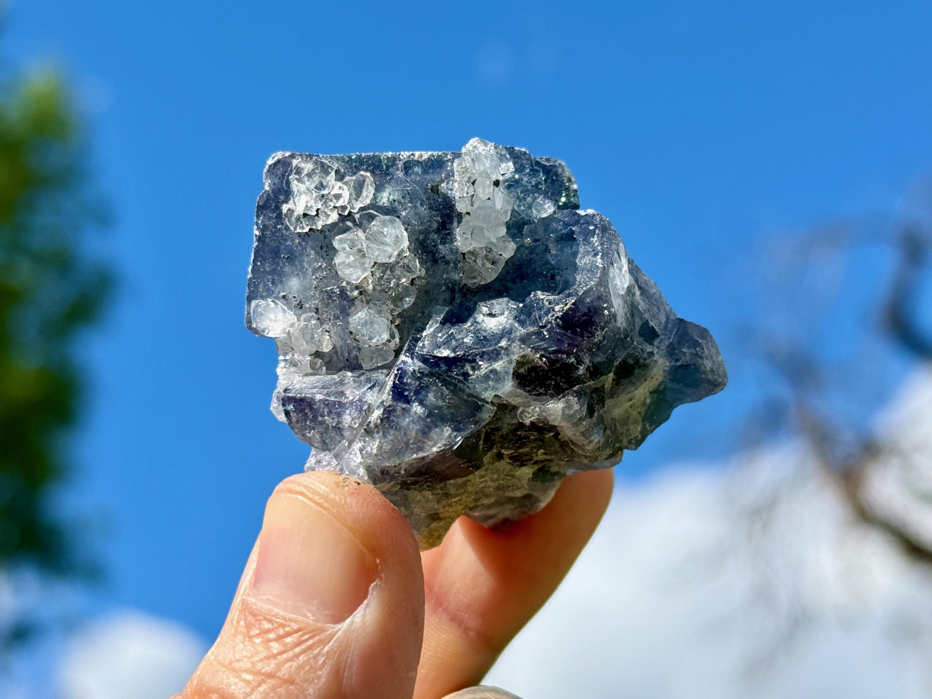 **PLEASE NOTE we've included photos that were taken in 1) partially shaded outdoor lighting 2) natural direct sunlight 3) backlighting to show off their translucency and hues and 4) with direct UV light to show their UV reactivity. We've done our best to faithfully represent these unique crystals in a variety of light environments. Please be aware that these Fluorites can appear differently depending on the environment in which you are enjoying them.