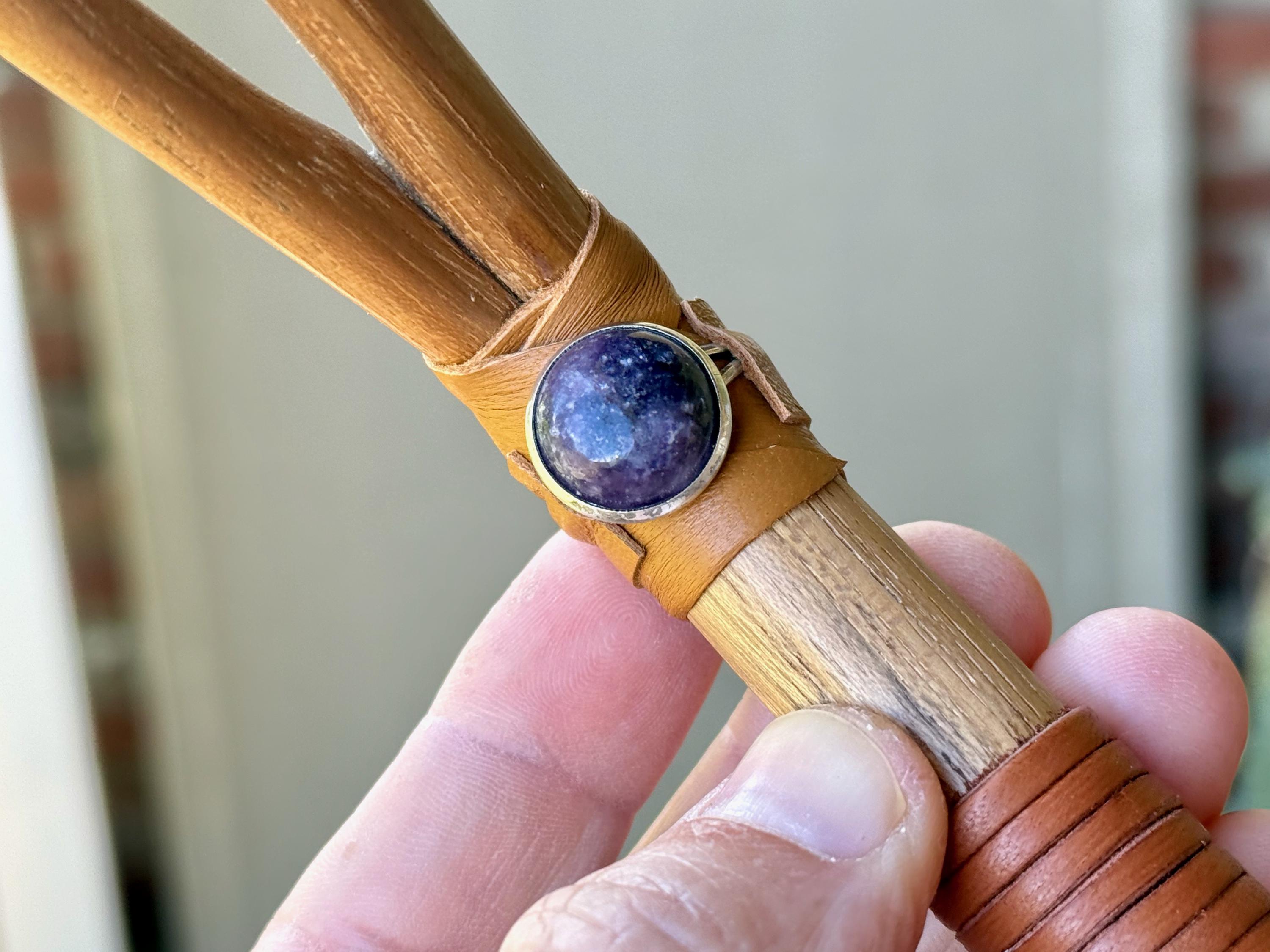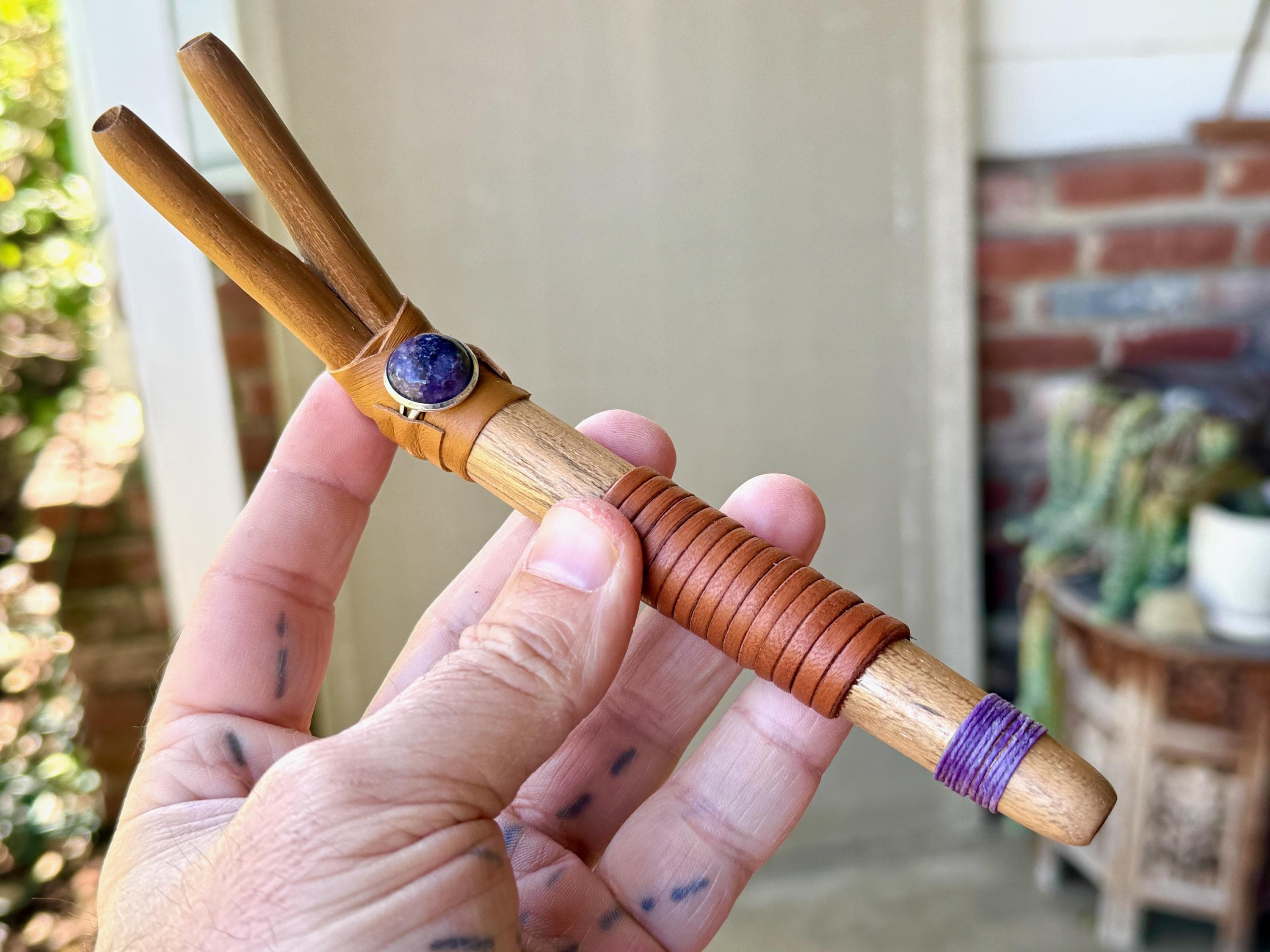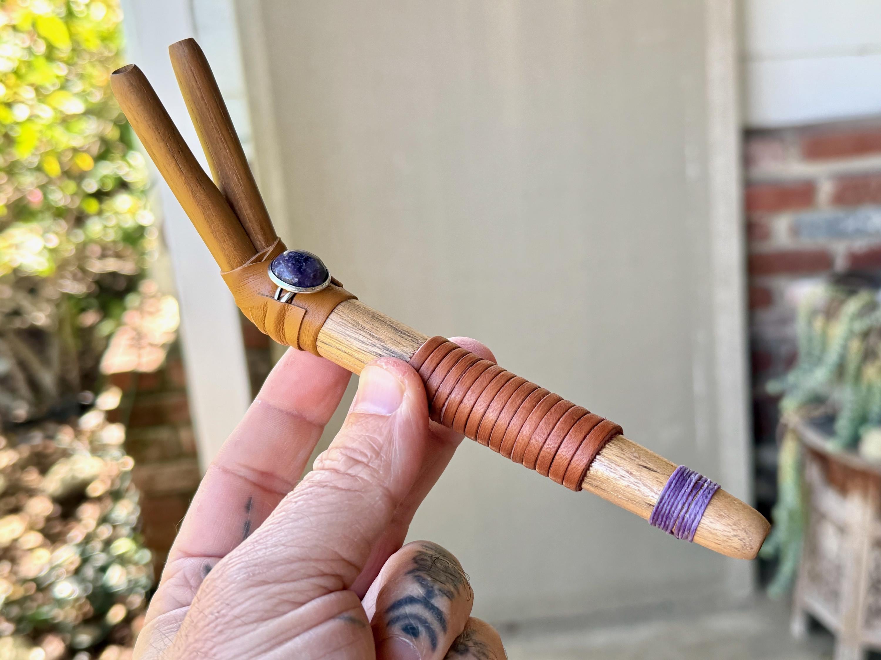 This traditional Double Tepi pipe is handmade from natural Teak Wood and adorned with leather wrapping and a natural Purple Lepidolite cabochon.