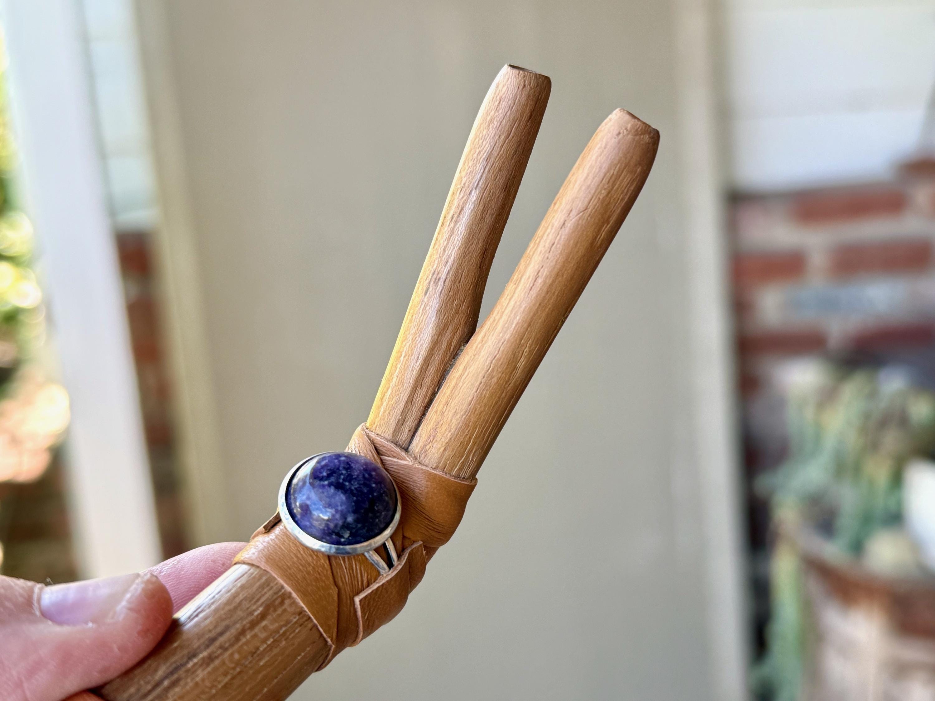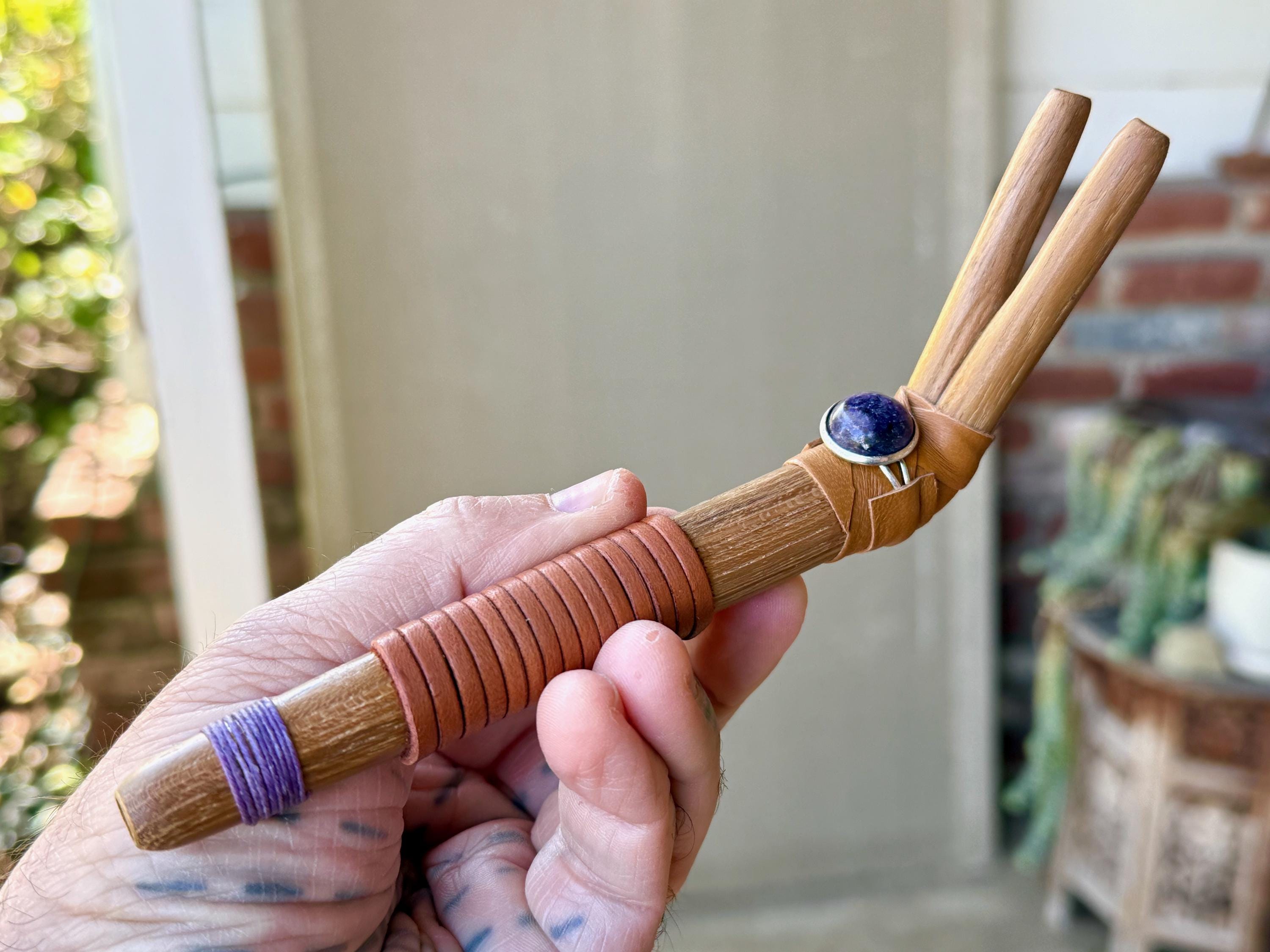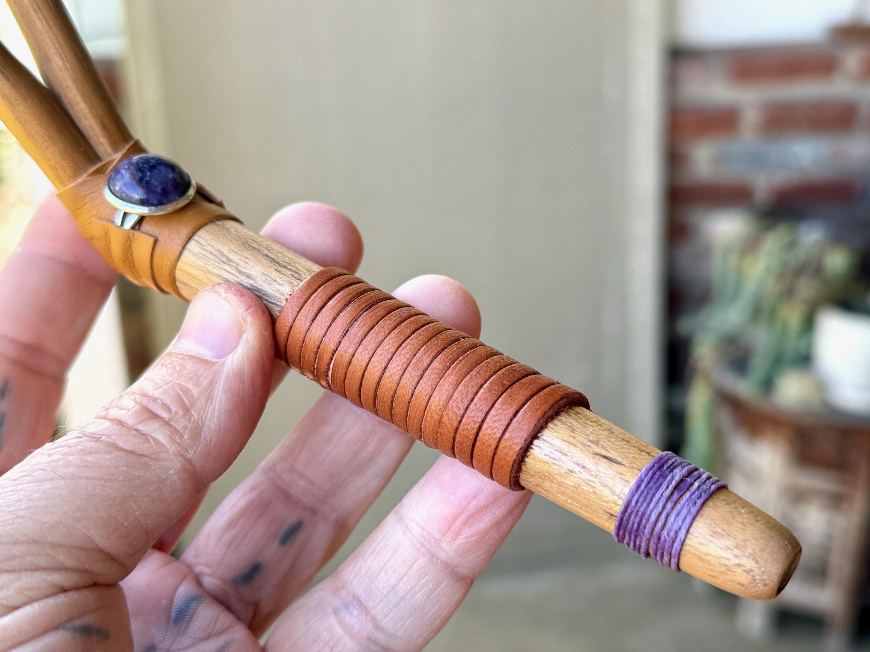 This traditional Double Tepi pipe is handmade from natural Teak Wood and adorned with leather wrapping and a natural Purple Lepidolite cabochon.
