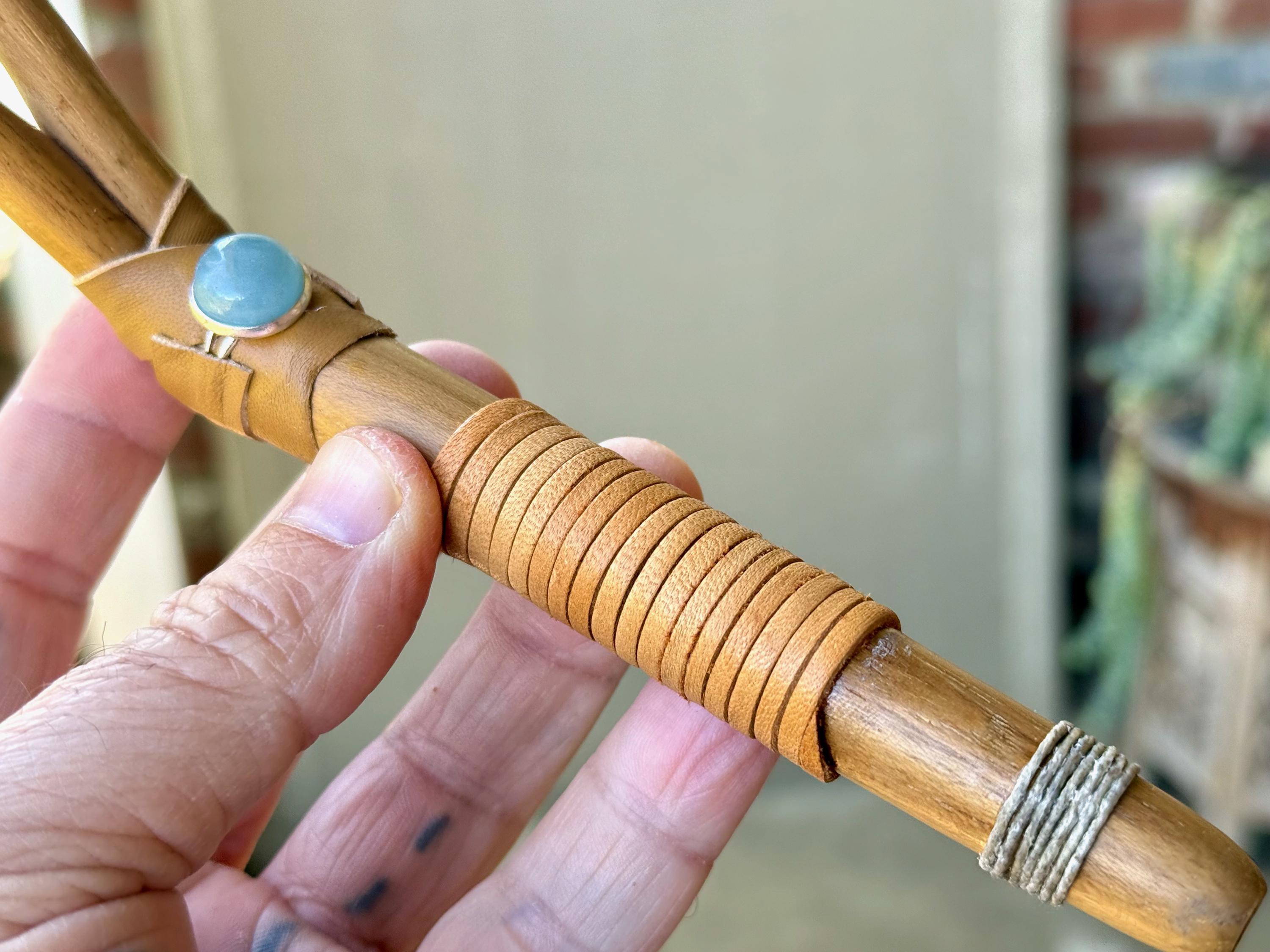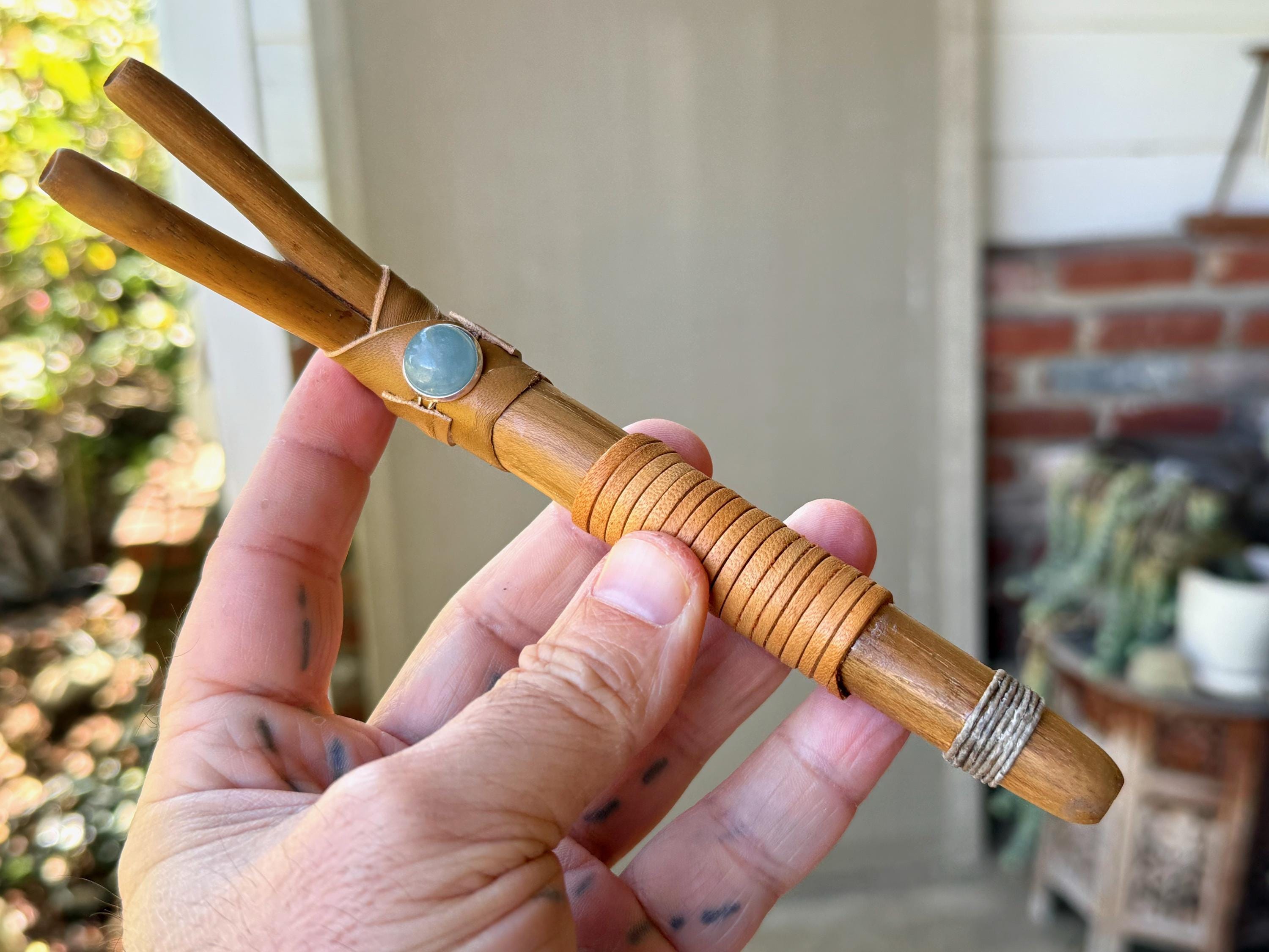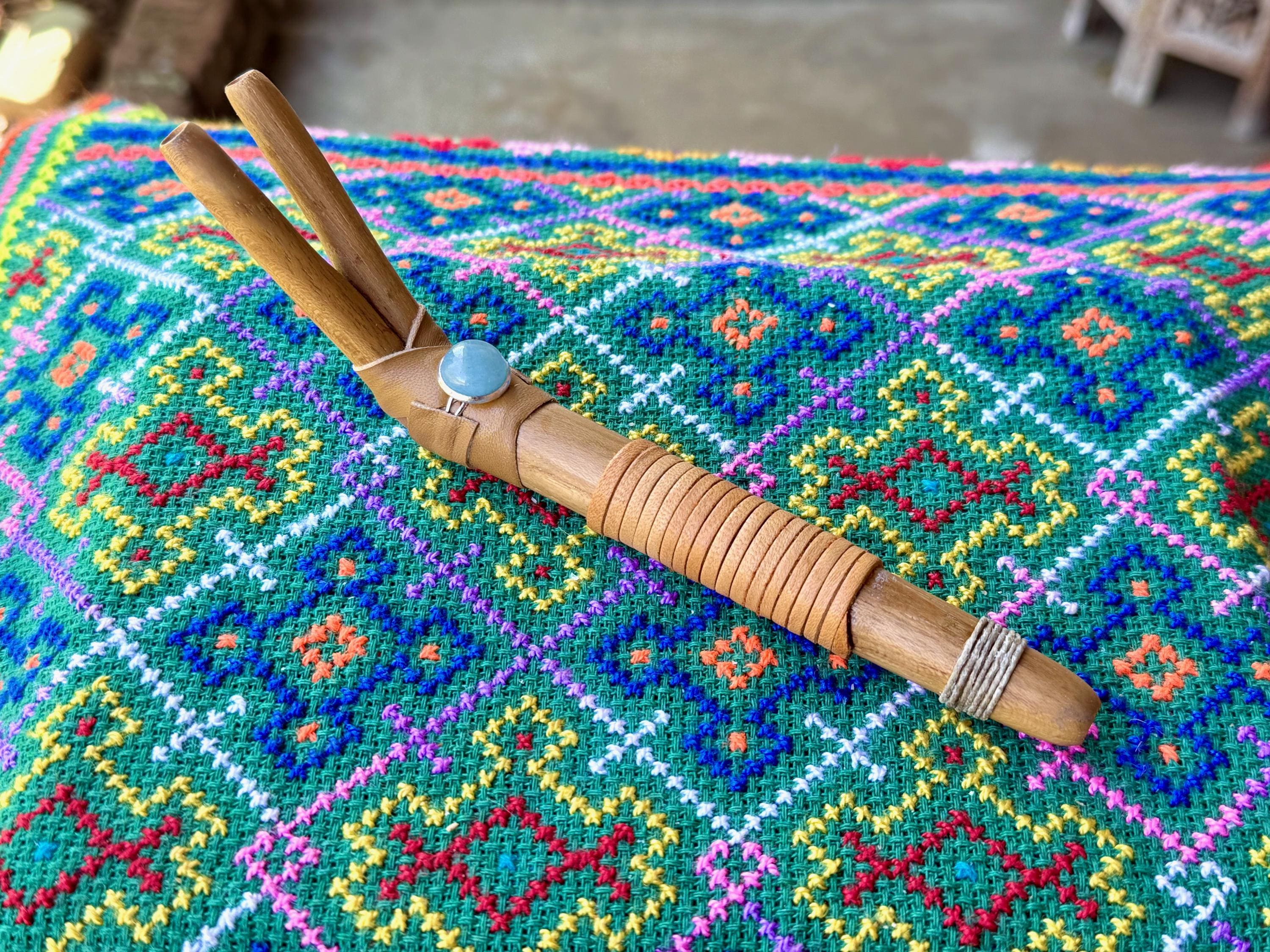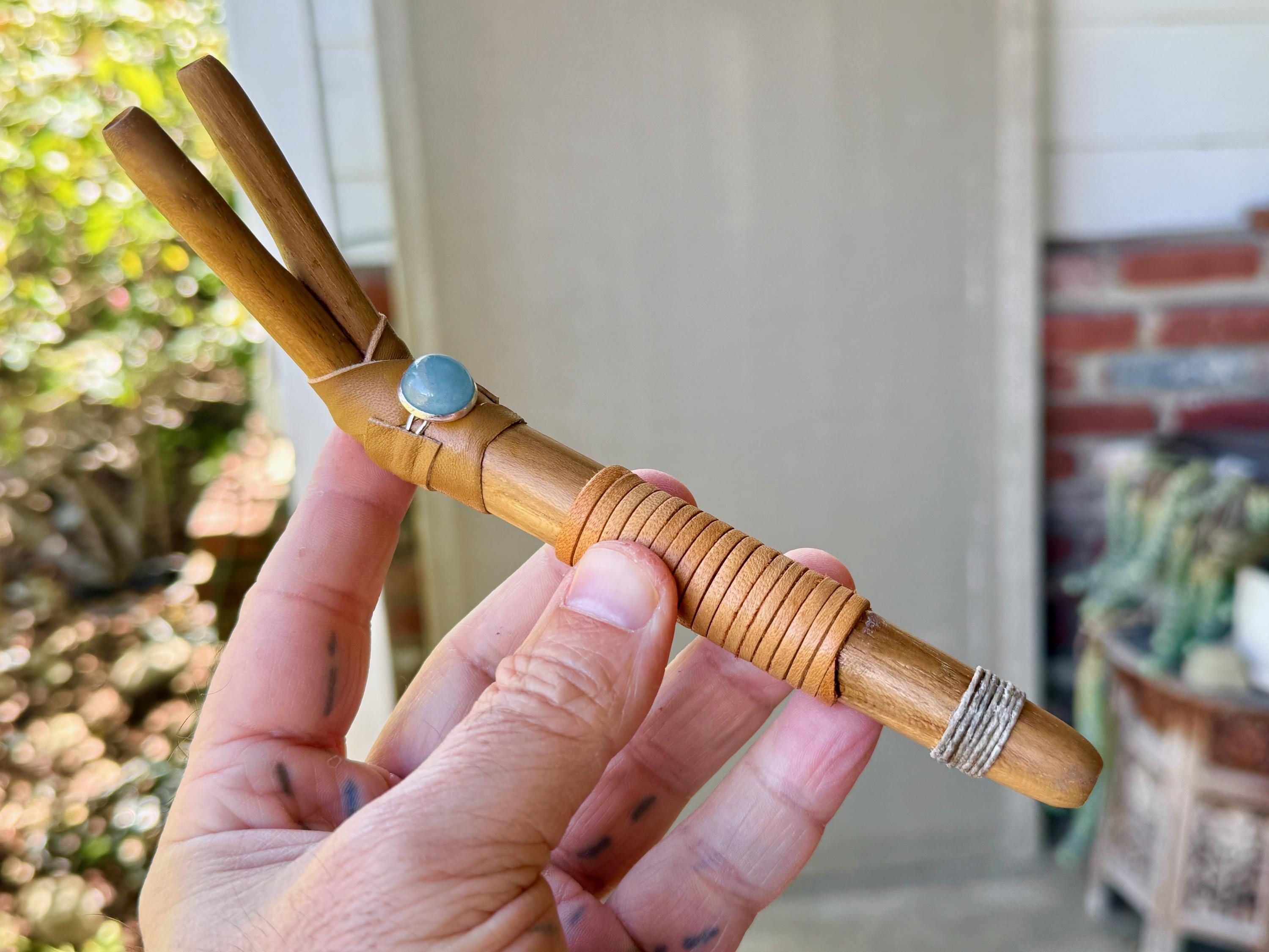 This traditional Double Tepi pipe was crafted from natural, high-quality Teak Wood and adorned with leather wrapping and a natural Aquamarine cabochon.