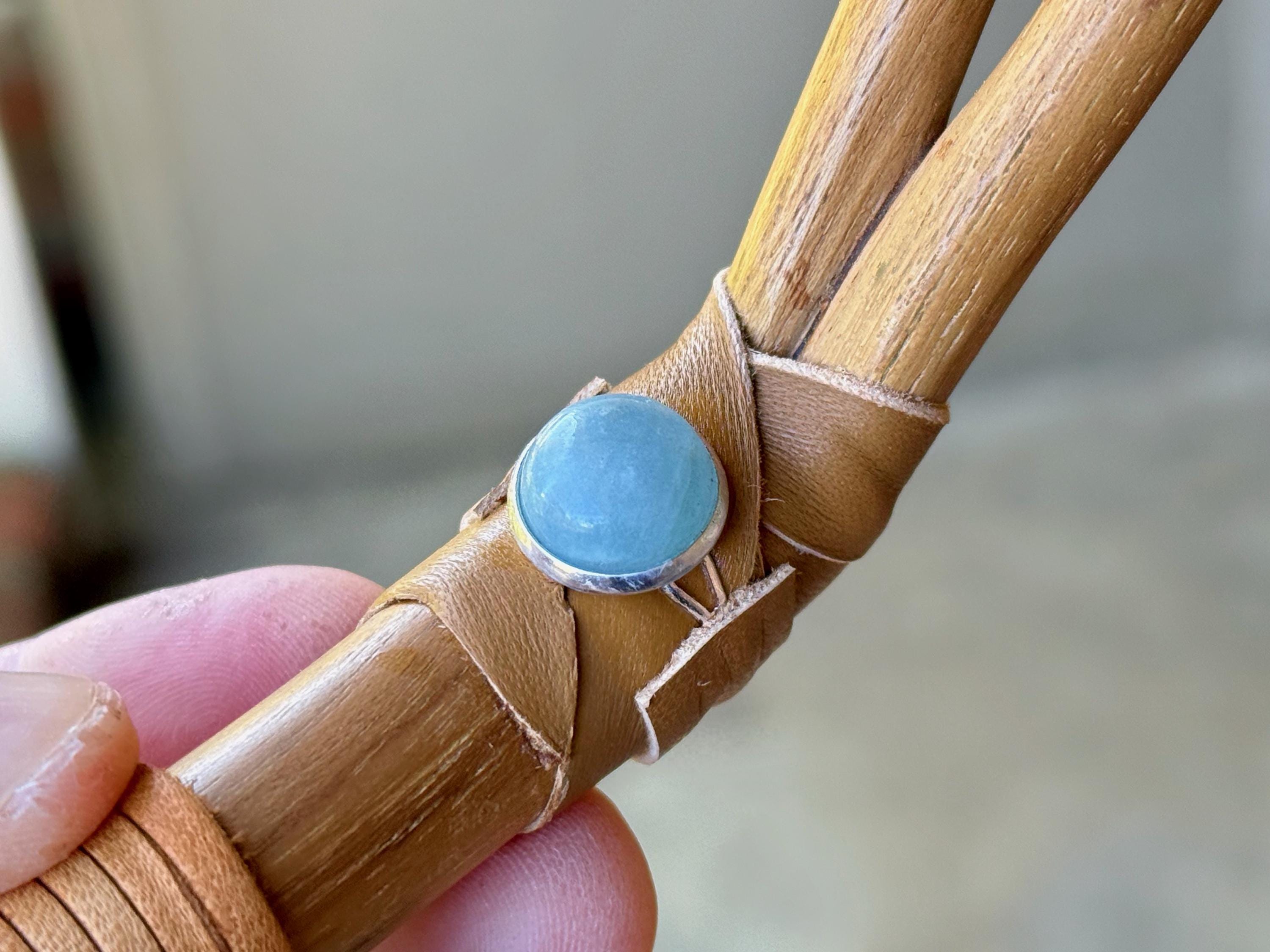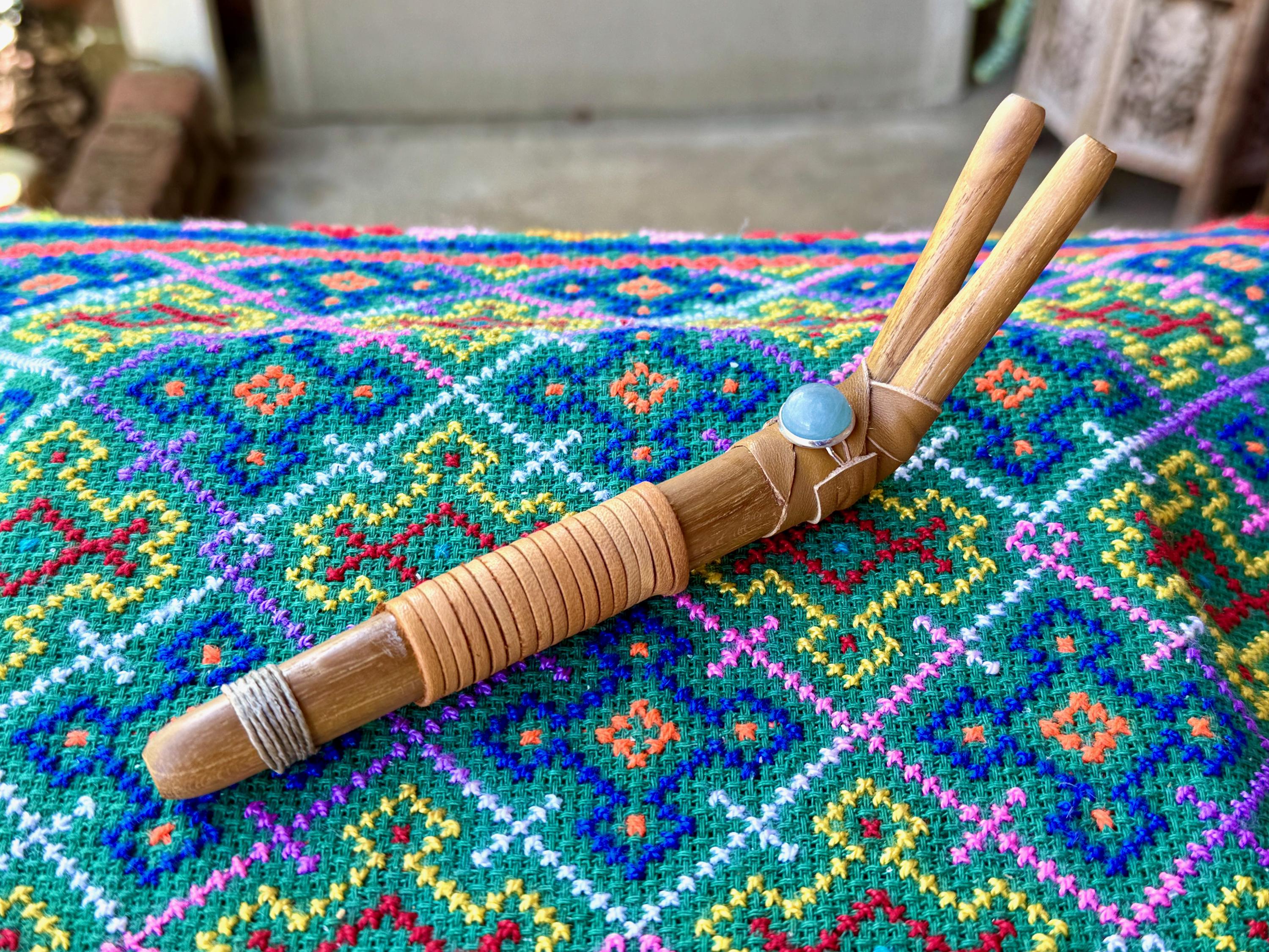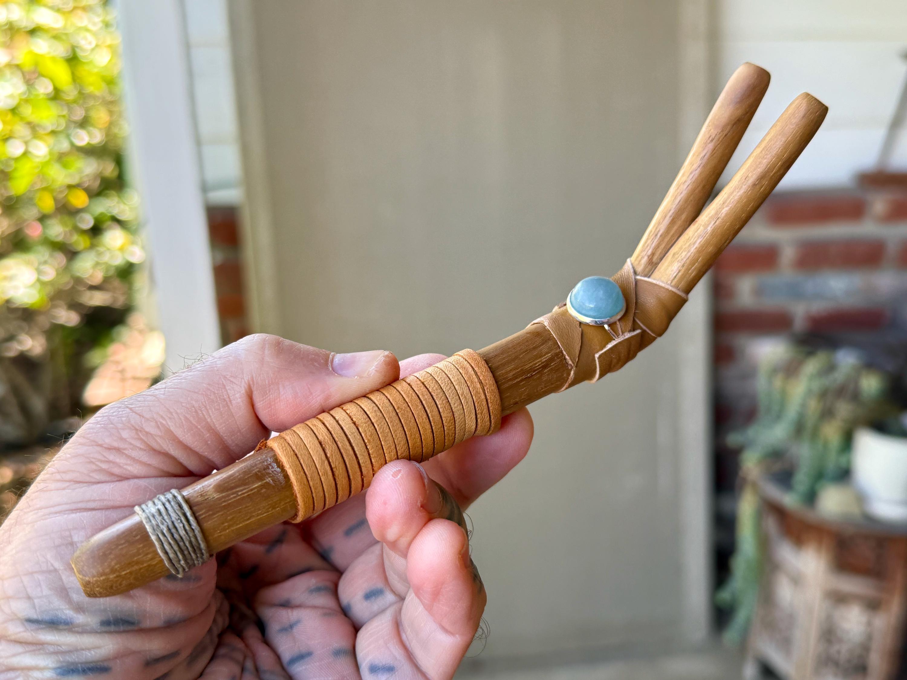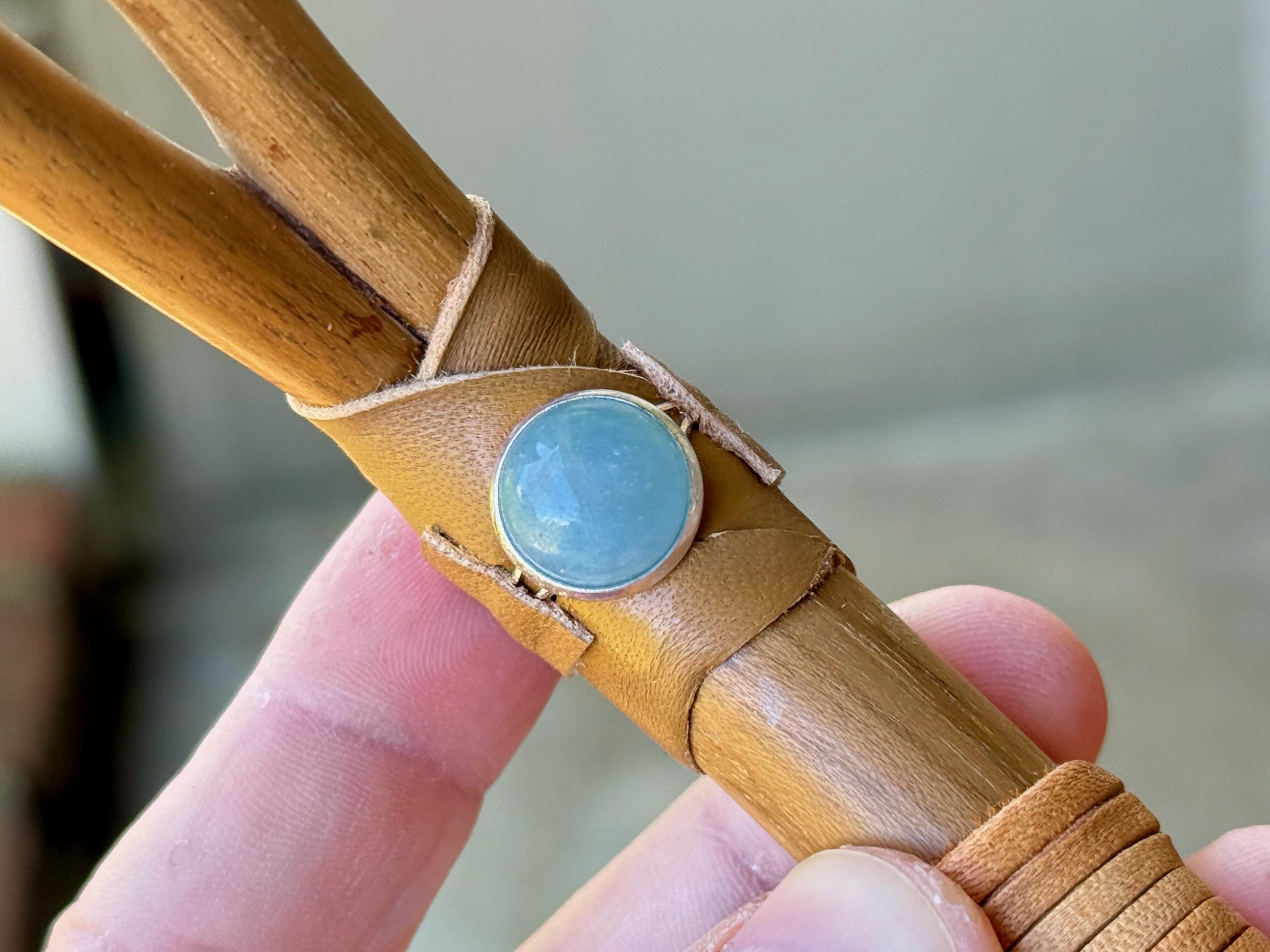 This traditional Double Tepi pipe was crafted from natural, high-quality Teak Wood and adorned with leather wrapping and a natural Aquamarine cabochon.