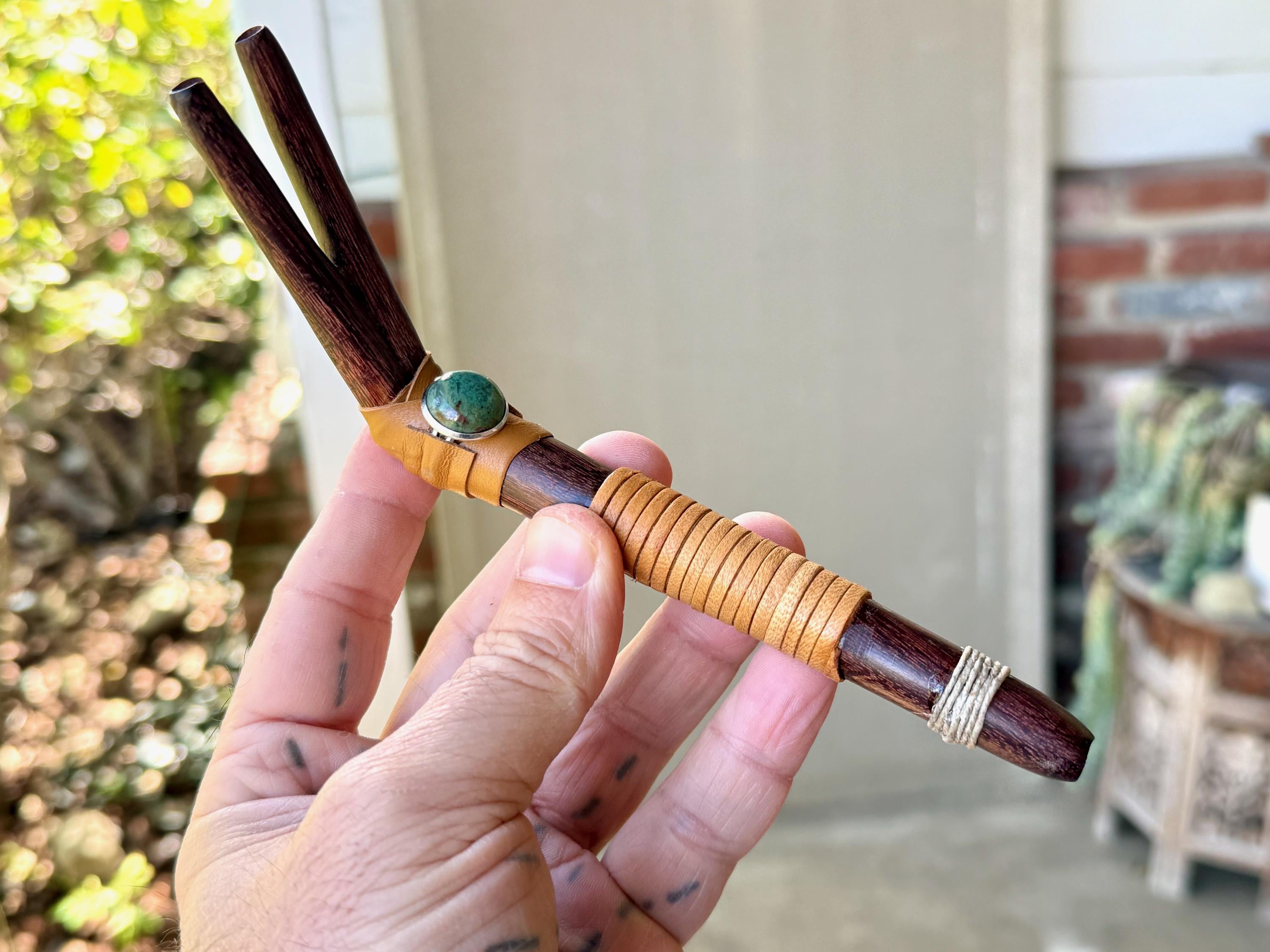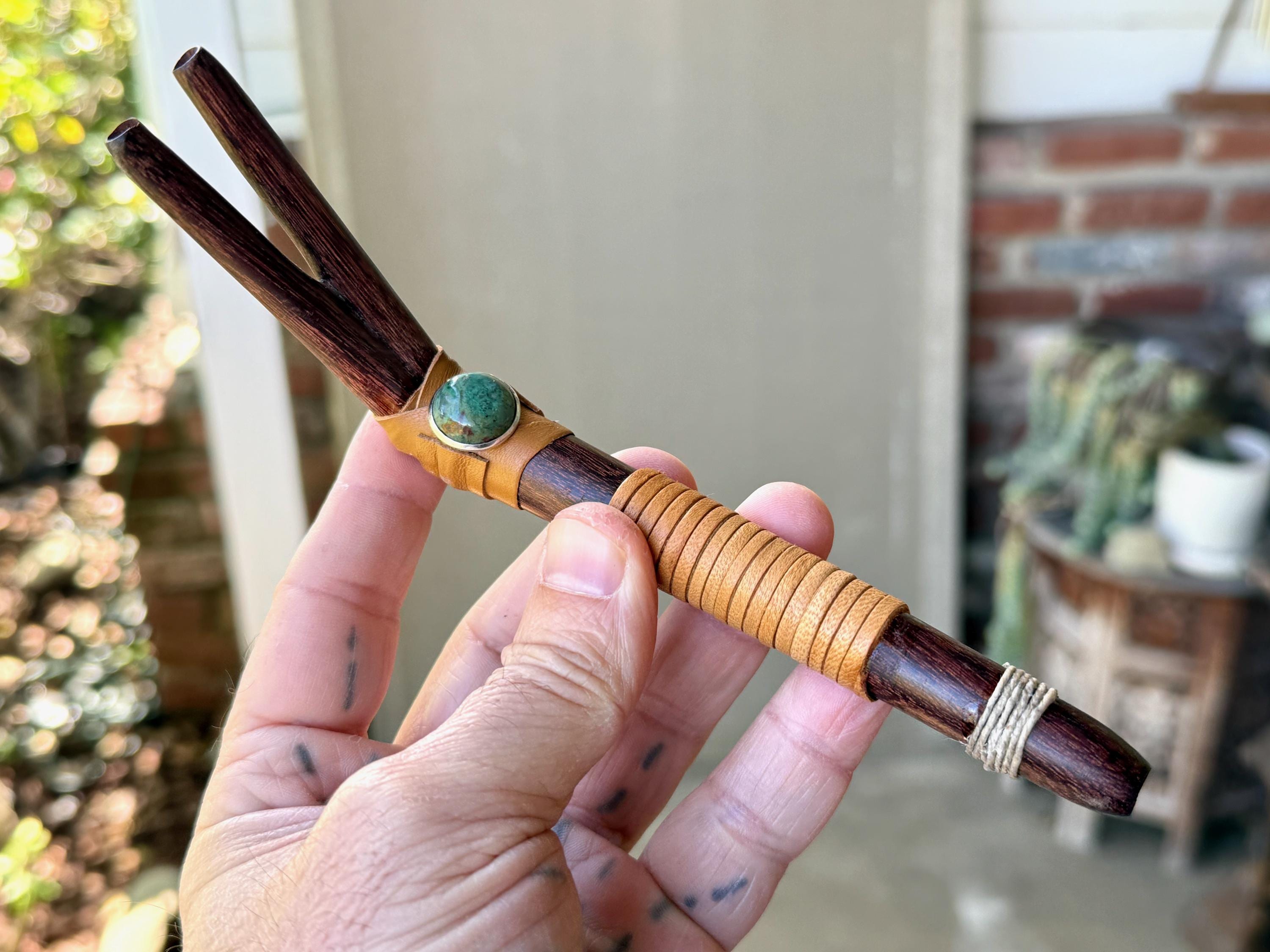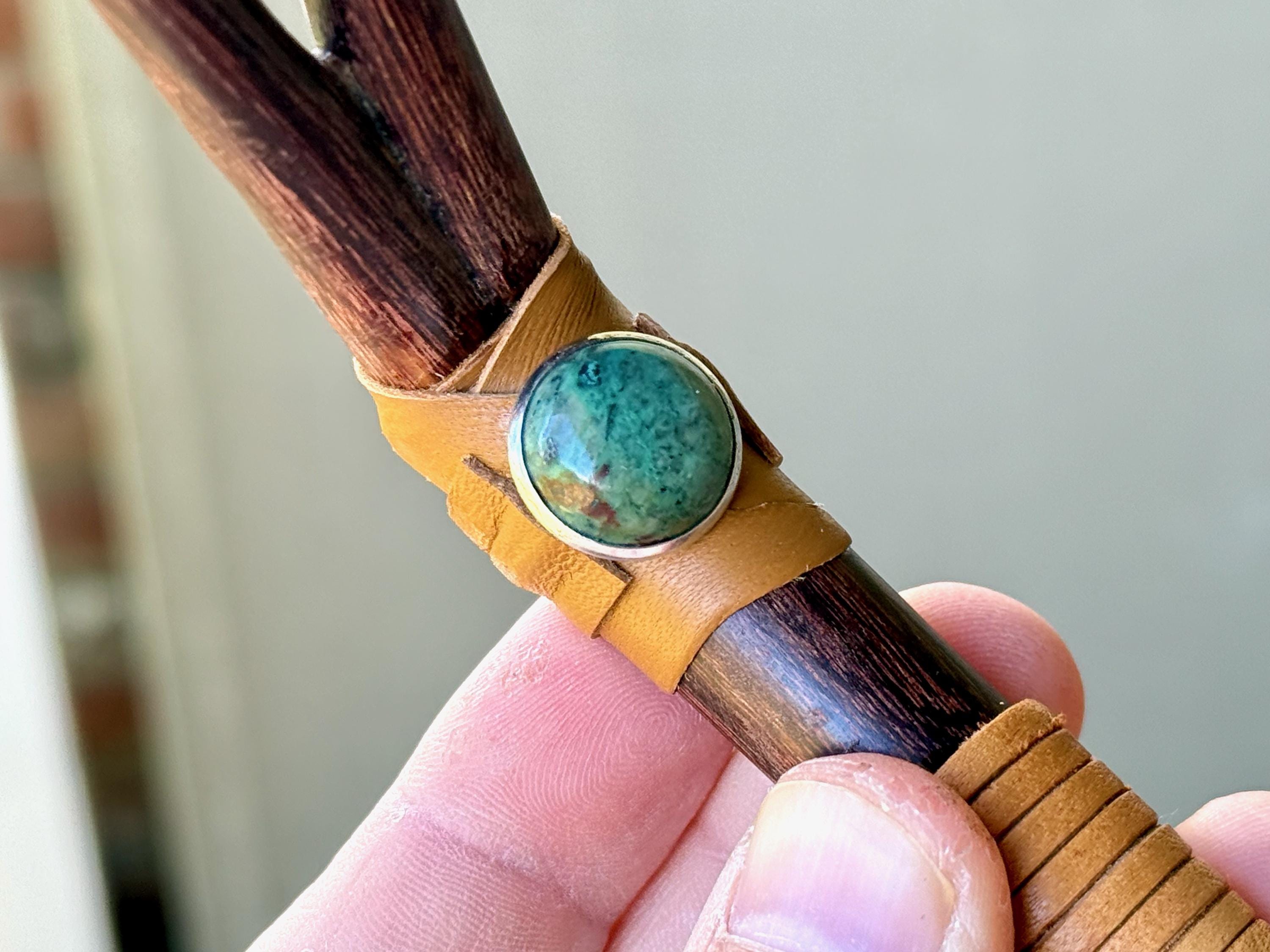 This traditional Double Tepi Pipe is handcrafted from natural Tamarind Wood and adorned with leather wrapping and a Chrysocolla cabochon.