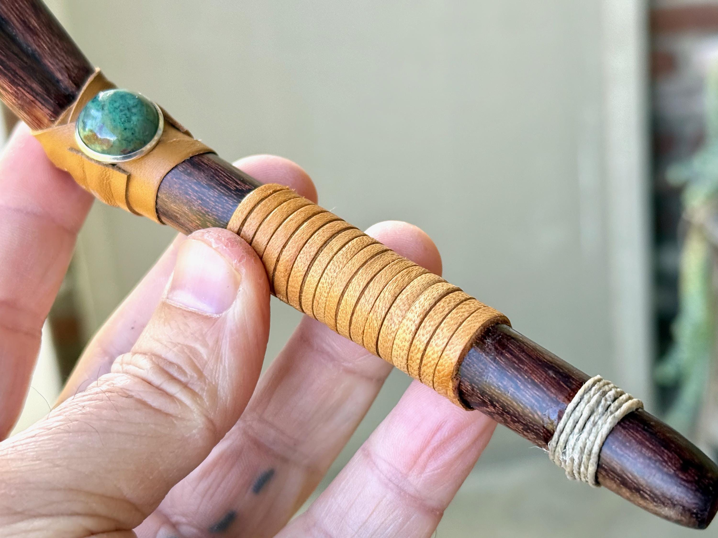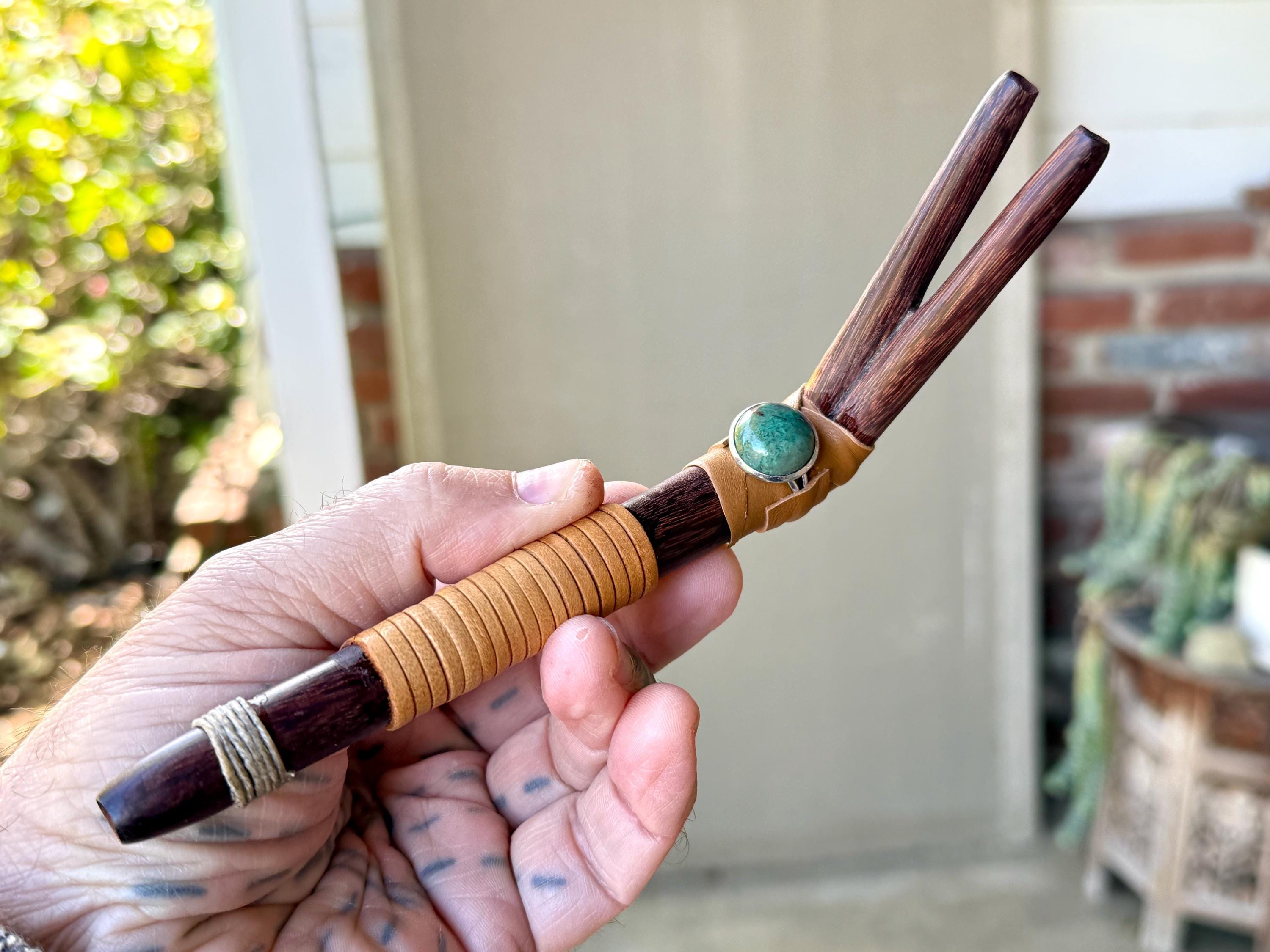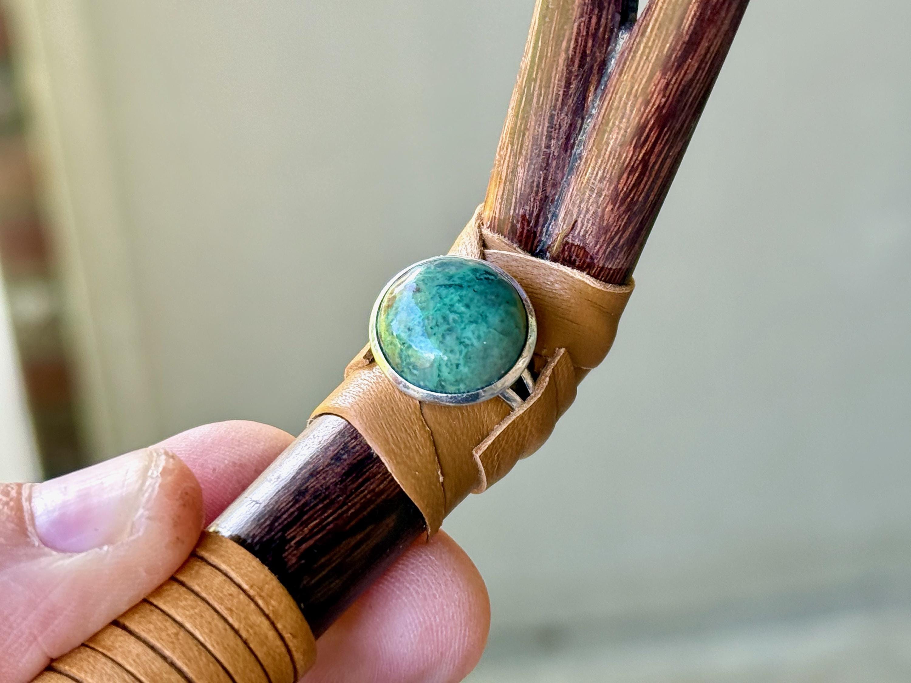 This traditional Double Tepi Pipe is handcrafted from natural Tamarind Wood and adorned with leather wrapping and a Chrysocolla cabochon.