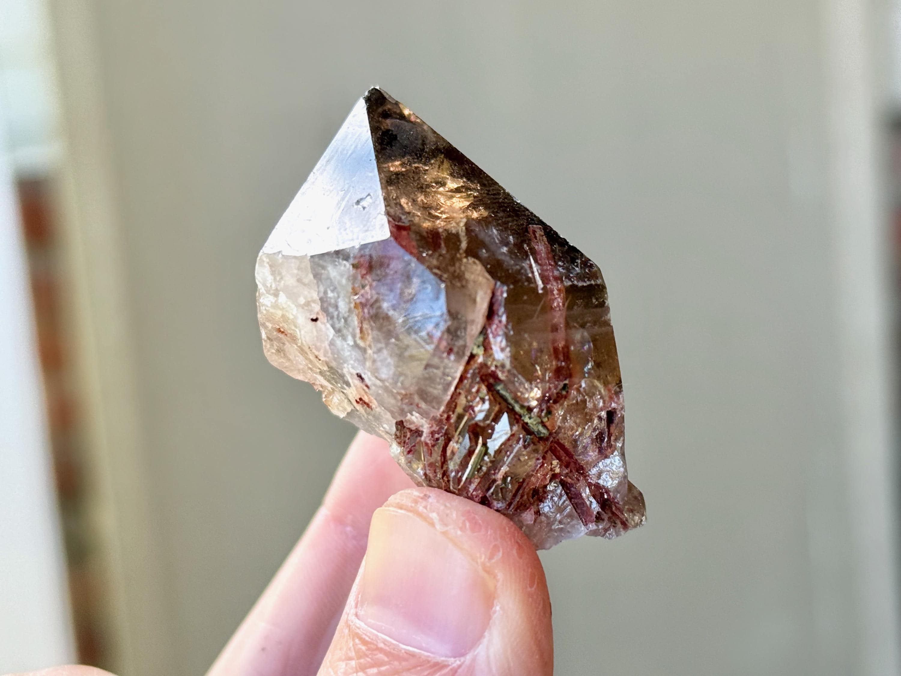 This natural Smoky Quartz with Red Epidote inclusions comes from Itamarandiba, Minas Gerais, Brazil. Red Epidote is also known as Piemontite, a mineral with an energy that moves directly to the heart, filling it with strength, courage, and a sense of purpose.