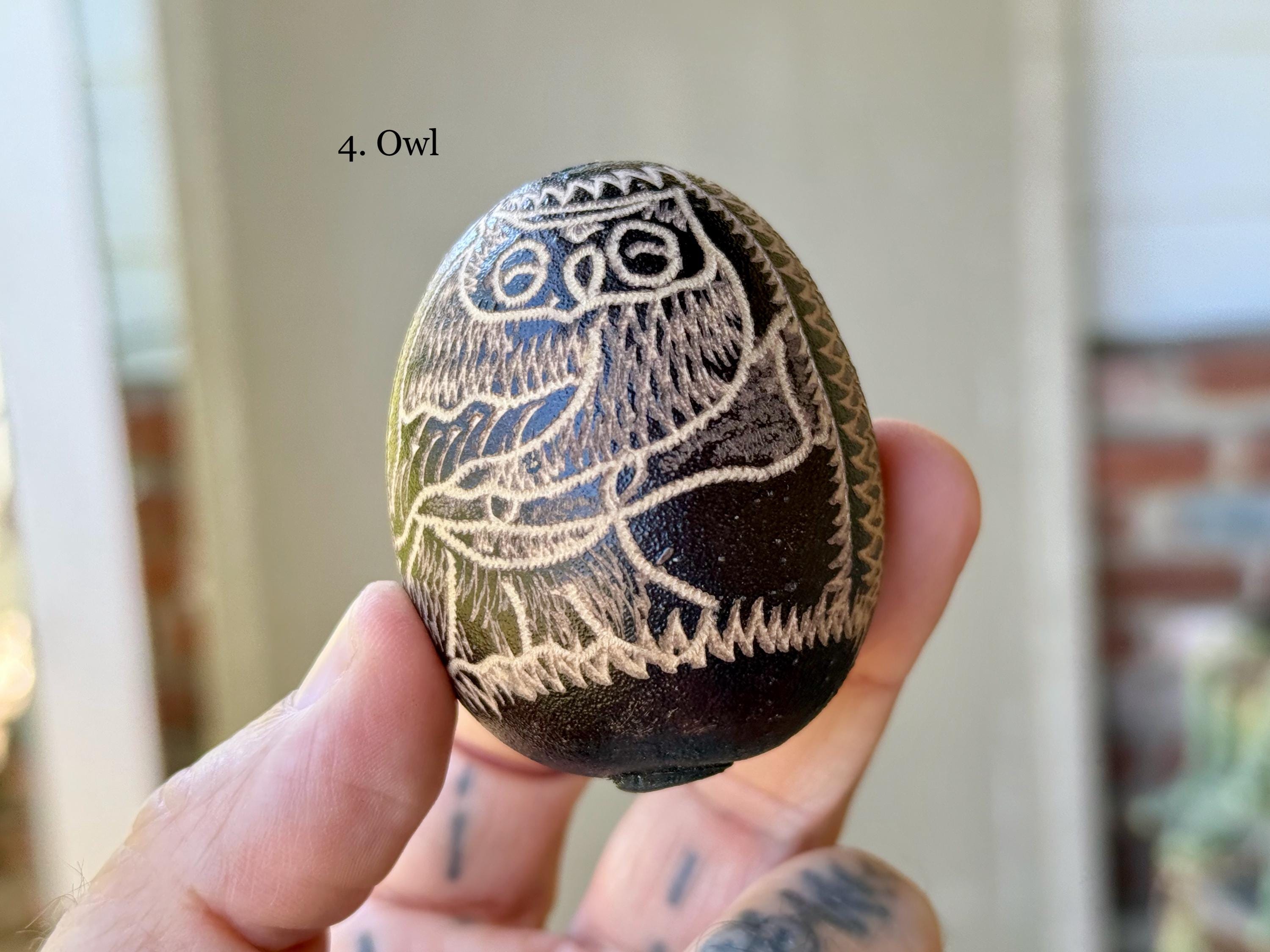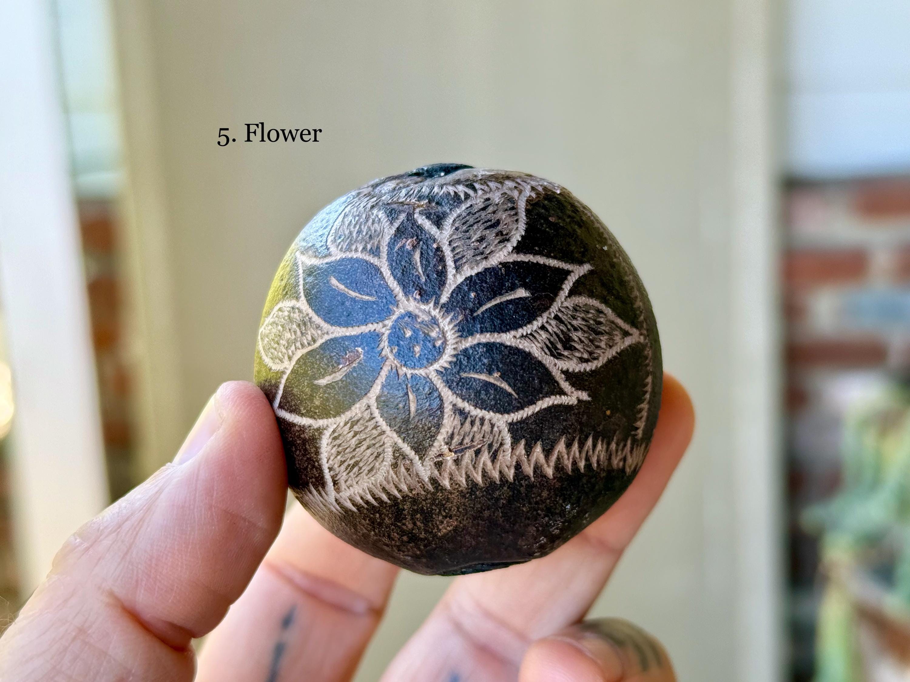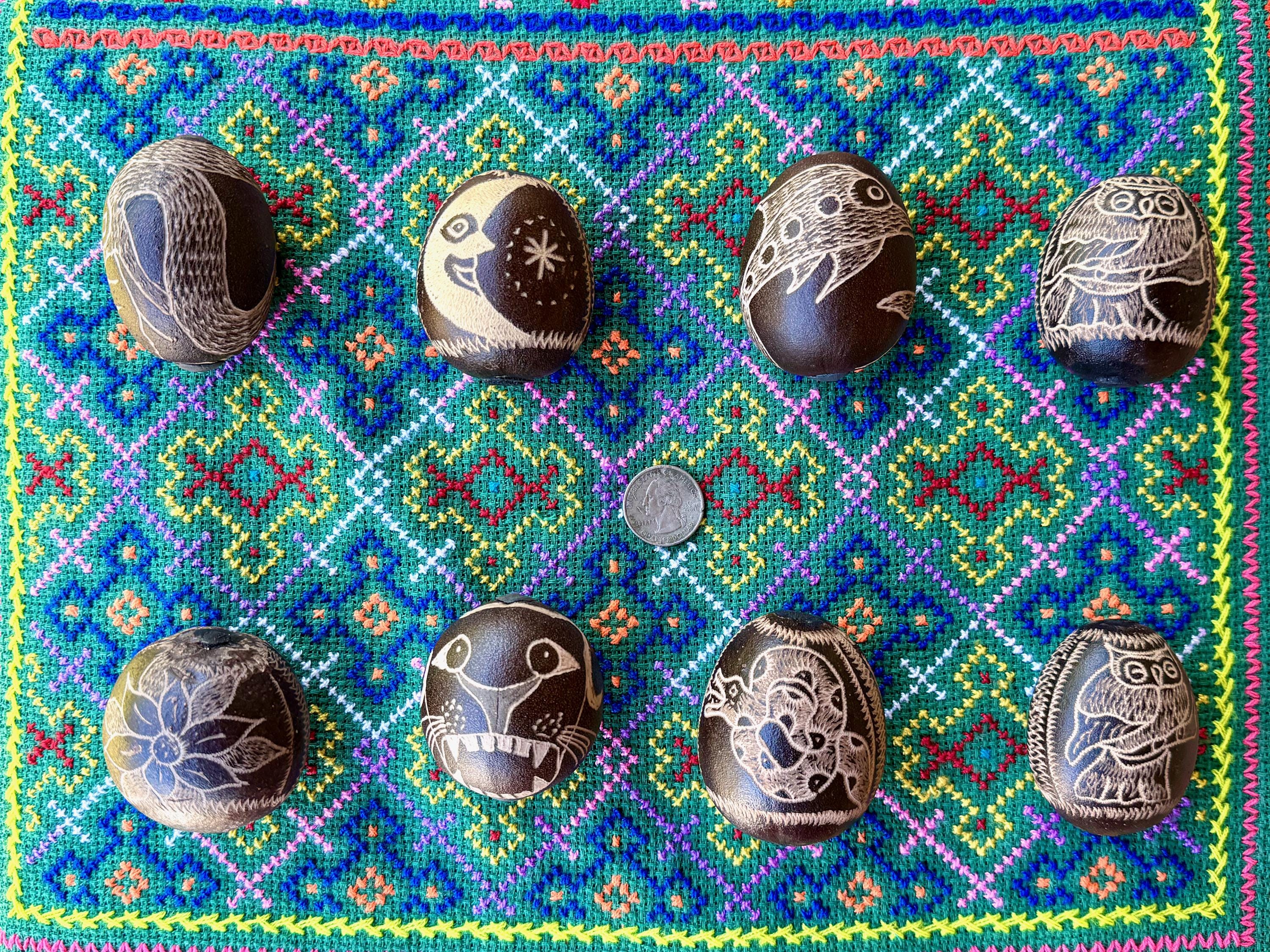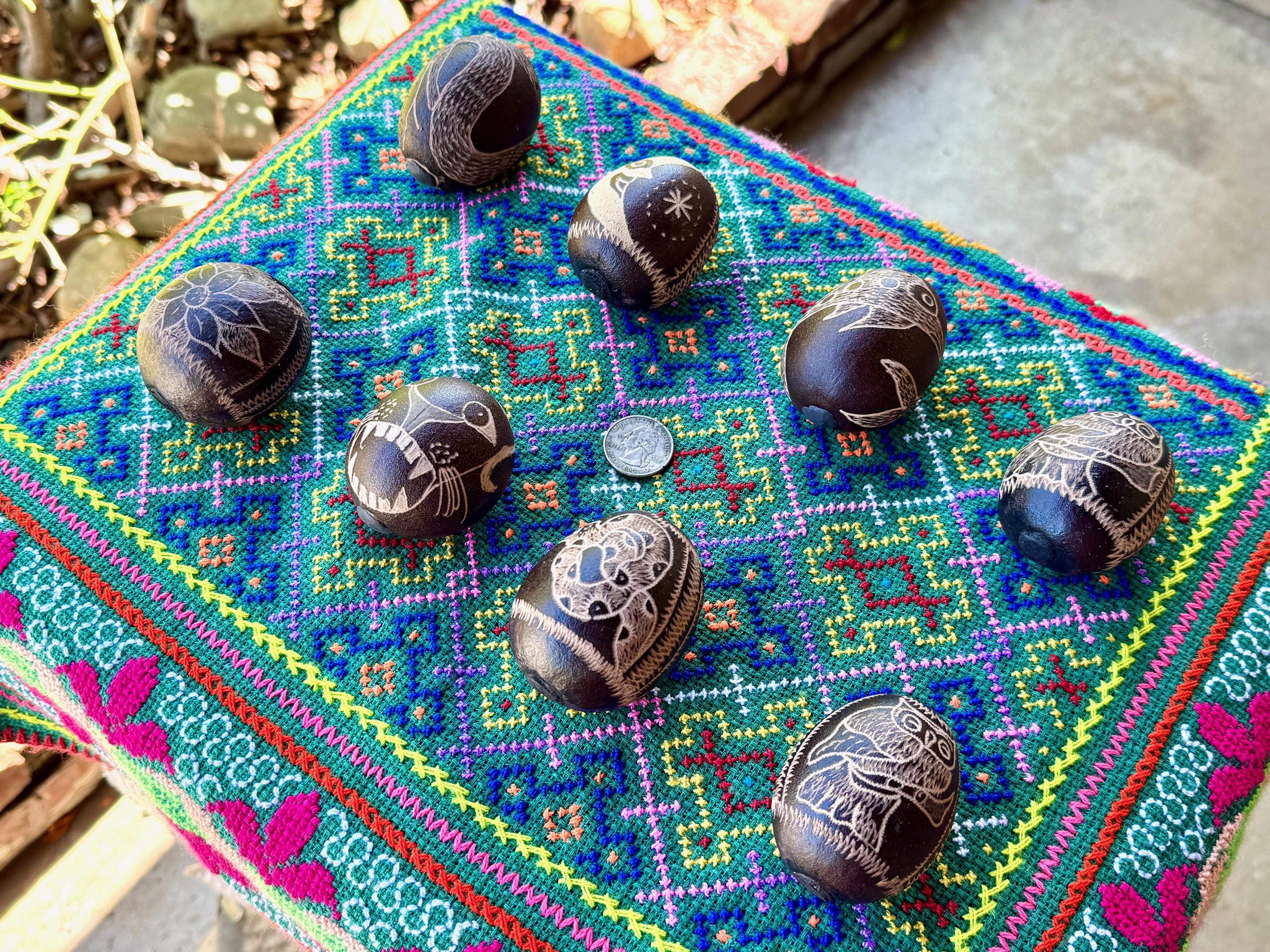 These adorable rattles/egg shakers were handcrafted from natural gourds collected from the rainforest floor. They are filled with seeds and/or beads and hand etched in a variety of designs. The sound is gentle, quiet and pleasant — more bassy and muted than the traditional plastic egg shakers found in music shops. They are ideal for accompanying quiet music and singing in or out of ceremony.