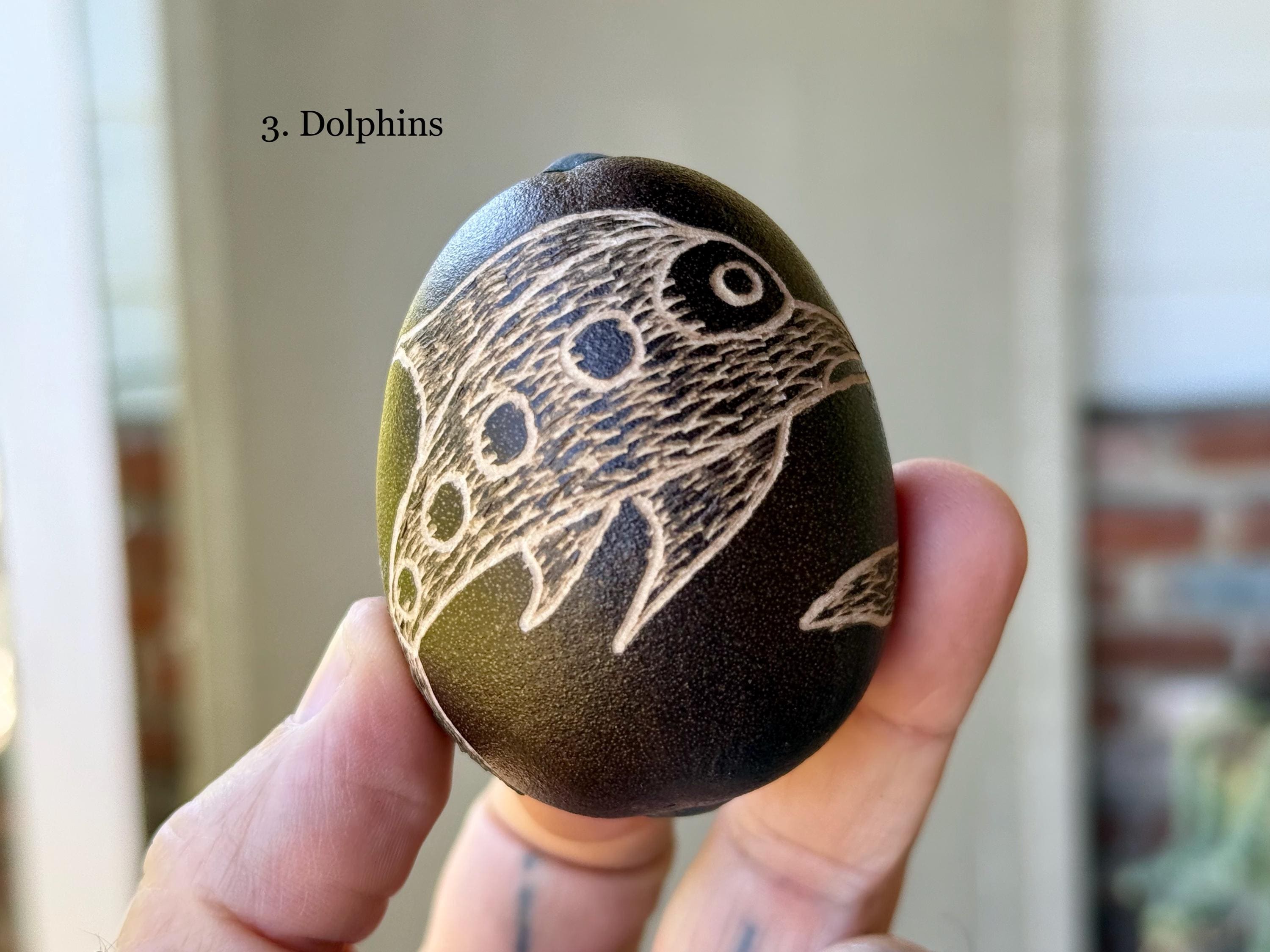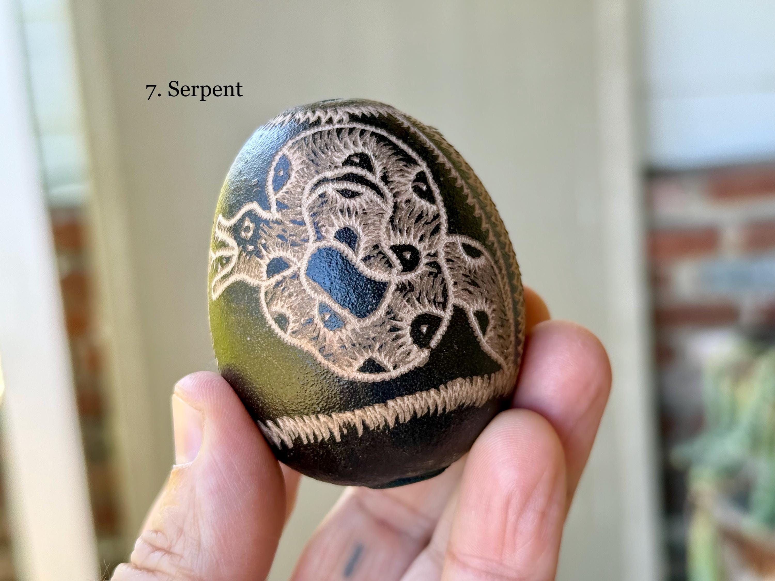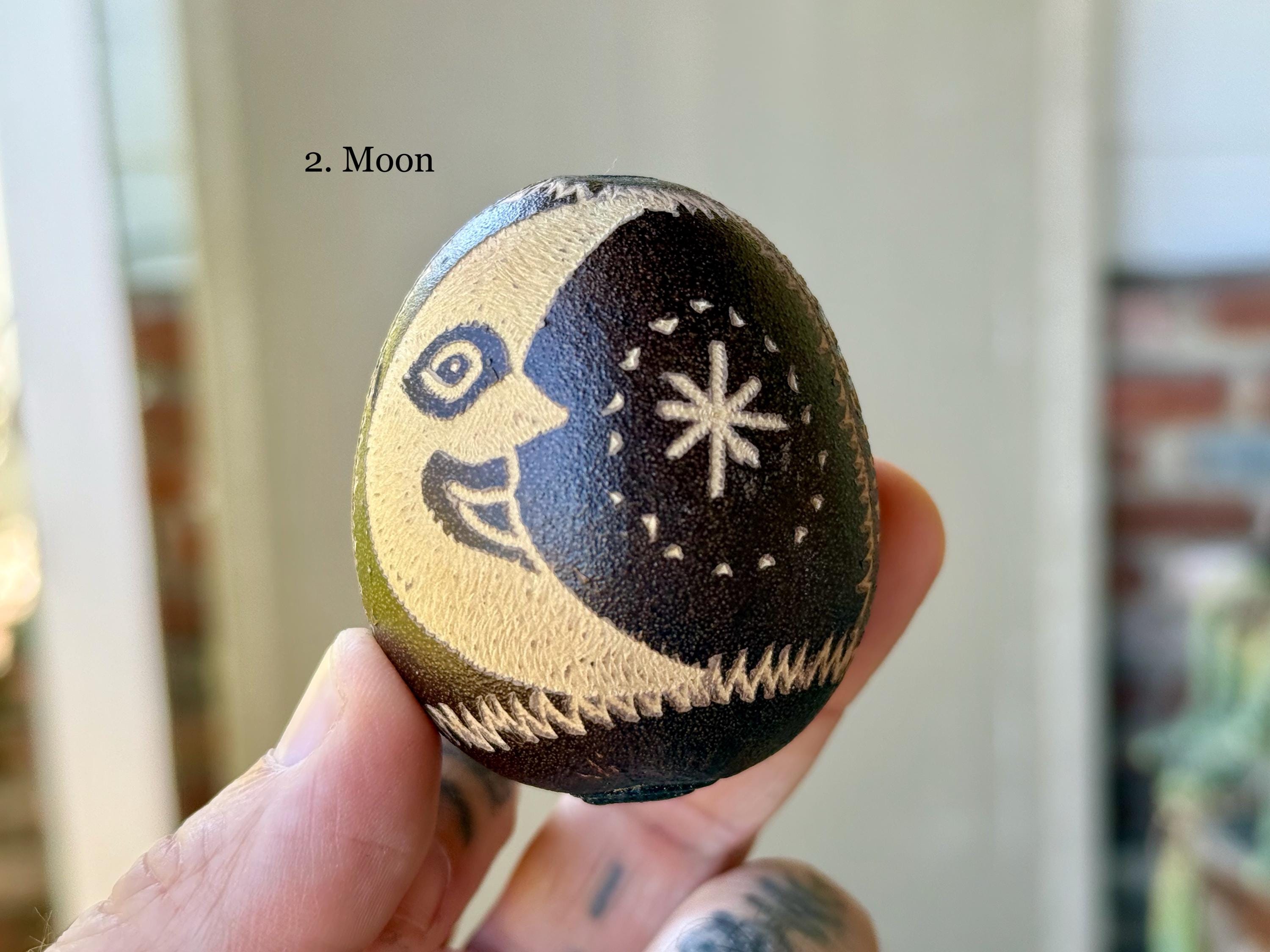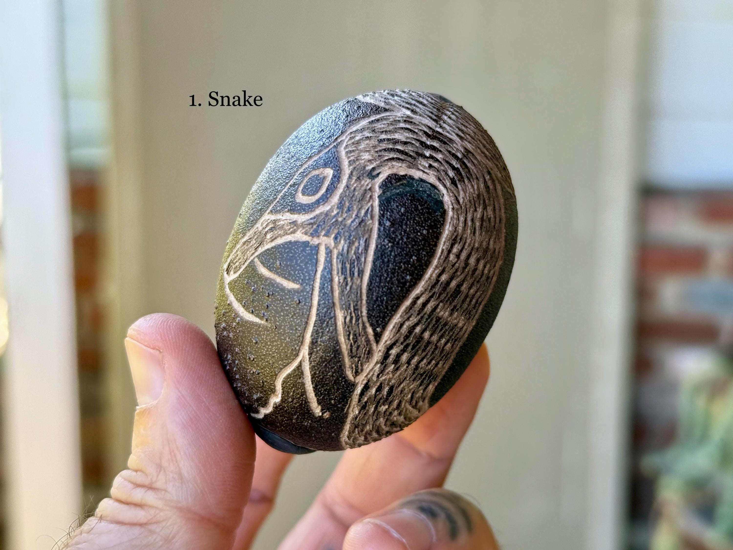 These adorable rattles/egg shakers were handcrafted from natural gourds collected from the rainforest floor. They are filled with seeds and/or beads and hand etched in a variety of designs. The sound is gentle, quiet and pleasant — more bassy and muted than the traditional plastic egg shakers found in music shops. They are ideal for accompanying quiet music and singing in or out of ceremony.