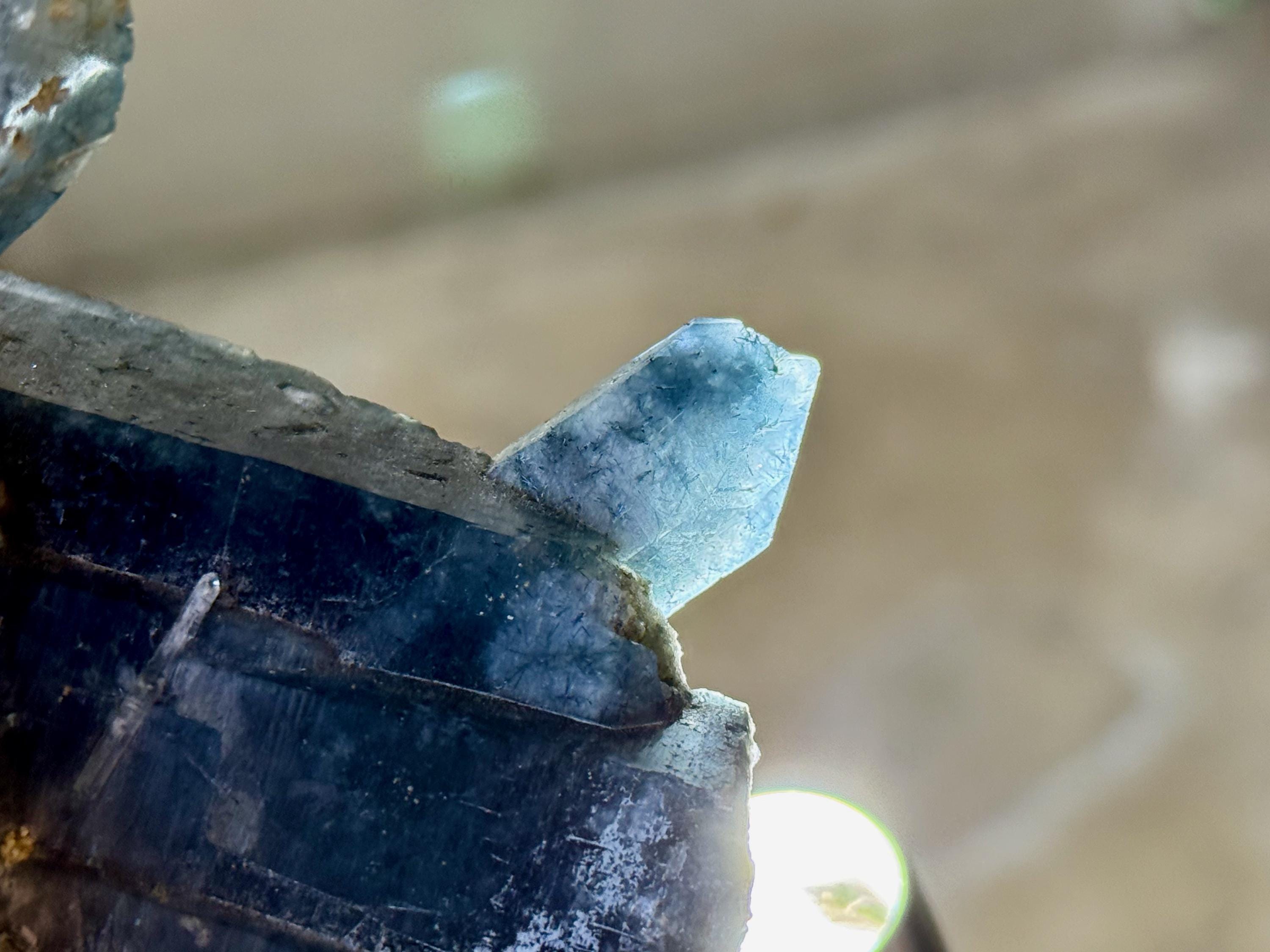 This Blue Tourmaline Quartz crystal comes from an old find in Jenipapo, Minas Gerais, Brazil. Blue Tourmaline (also known as Indicolite) is one of the preeminent stones to aid the expansion of psychic skills such as channeling and mediumship.