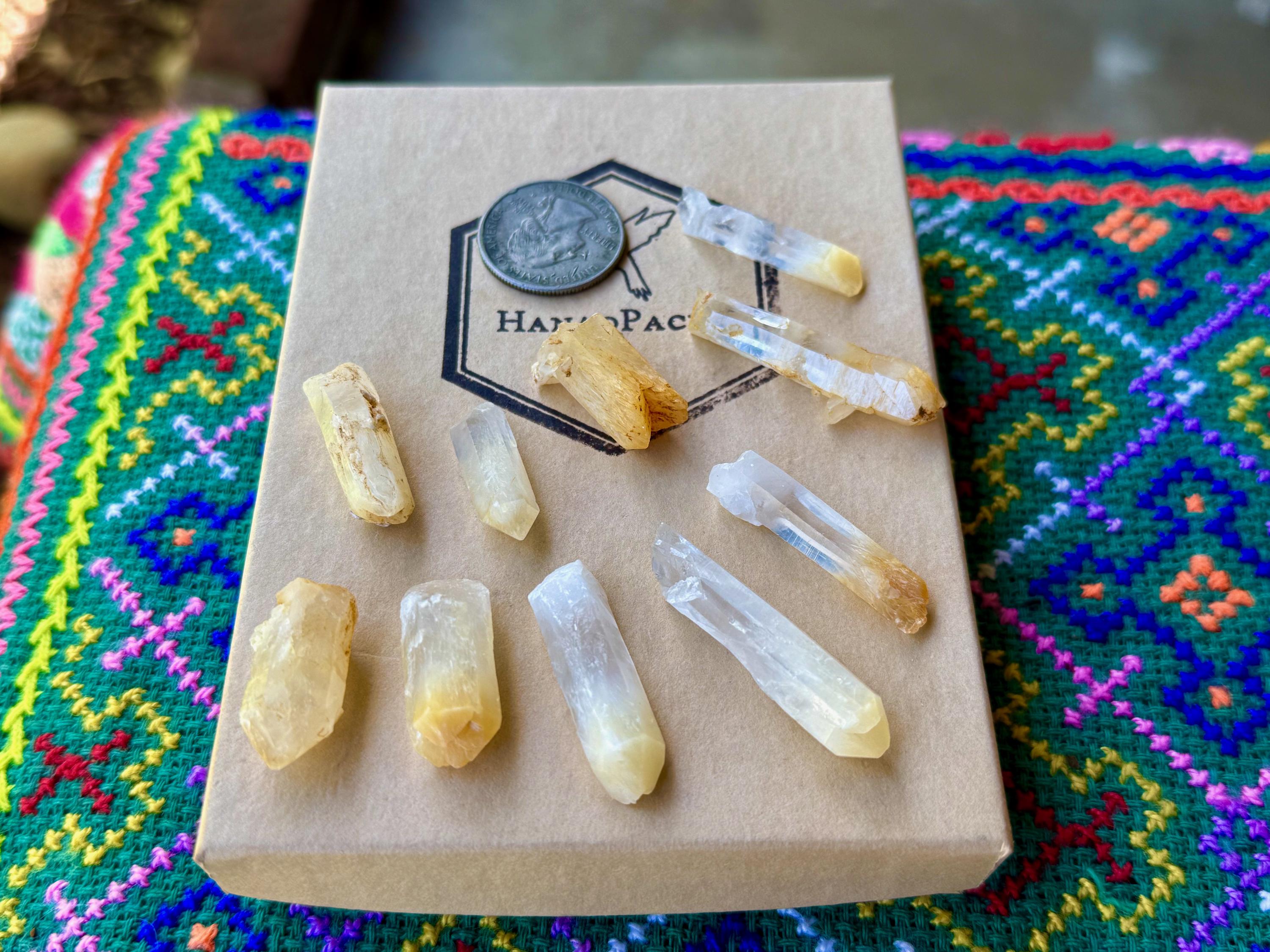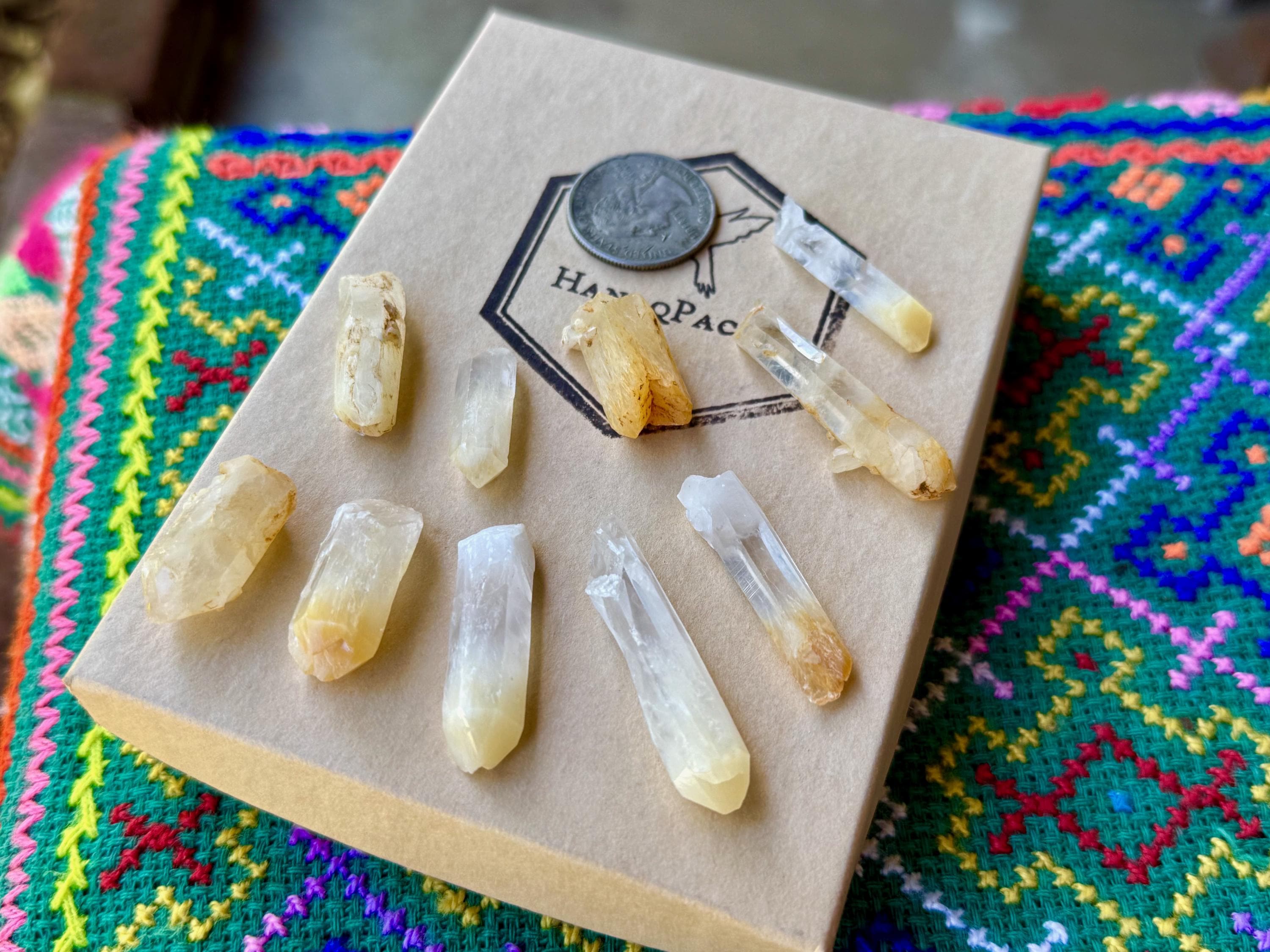 These natural Mango Quartz crystals come from a 2020 find in Quipama, Boyaca, Colombia. These crystals are sometimes known as "Corona Quartz" by the family who discovered them in their mine, due to their yellow-orange "crowns." They have also been called "Mango Quartz" by some for their vibrant orange-yellow color, which comes from the inclusion of a rare mineral Halloysite.
