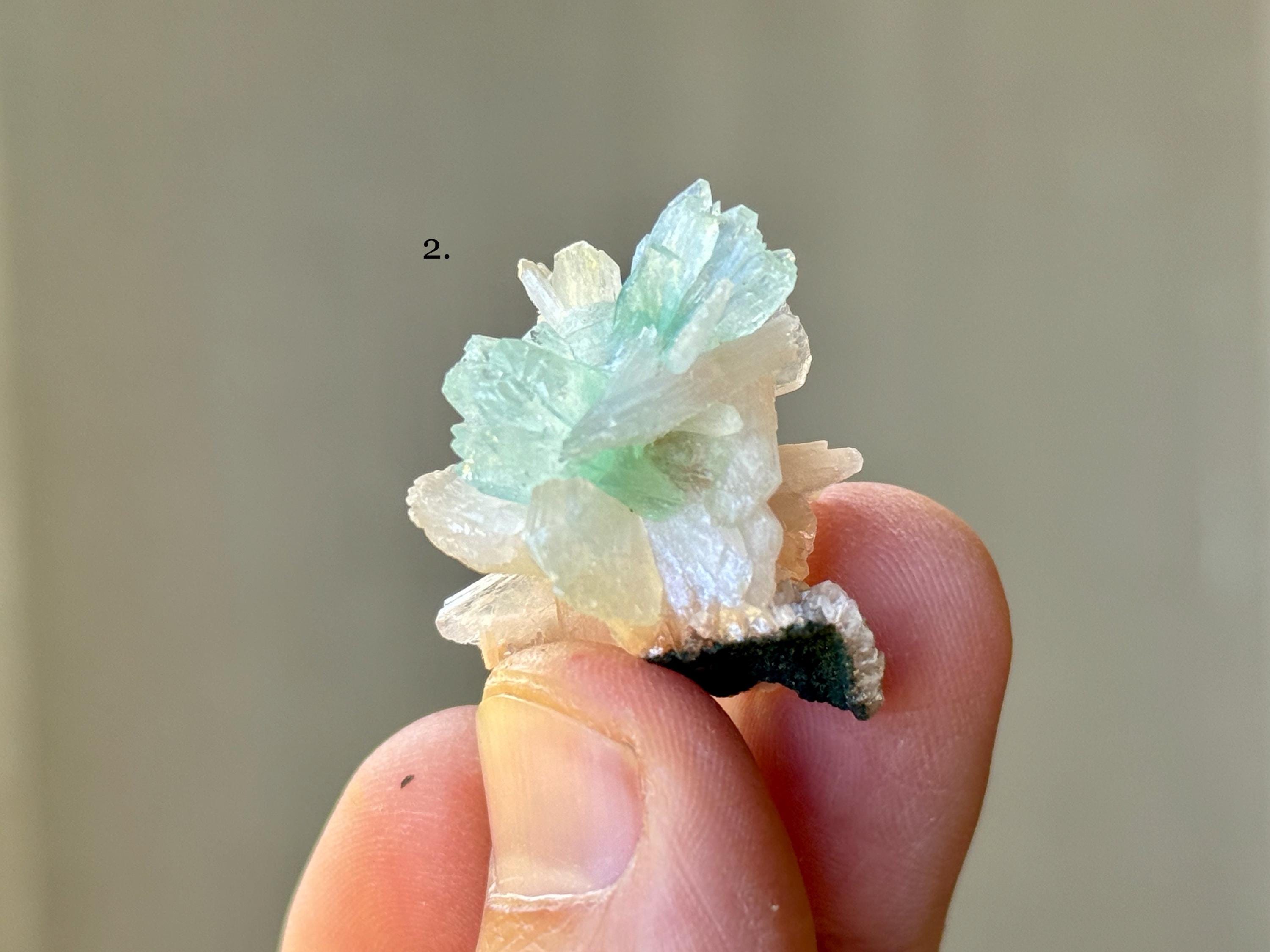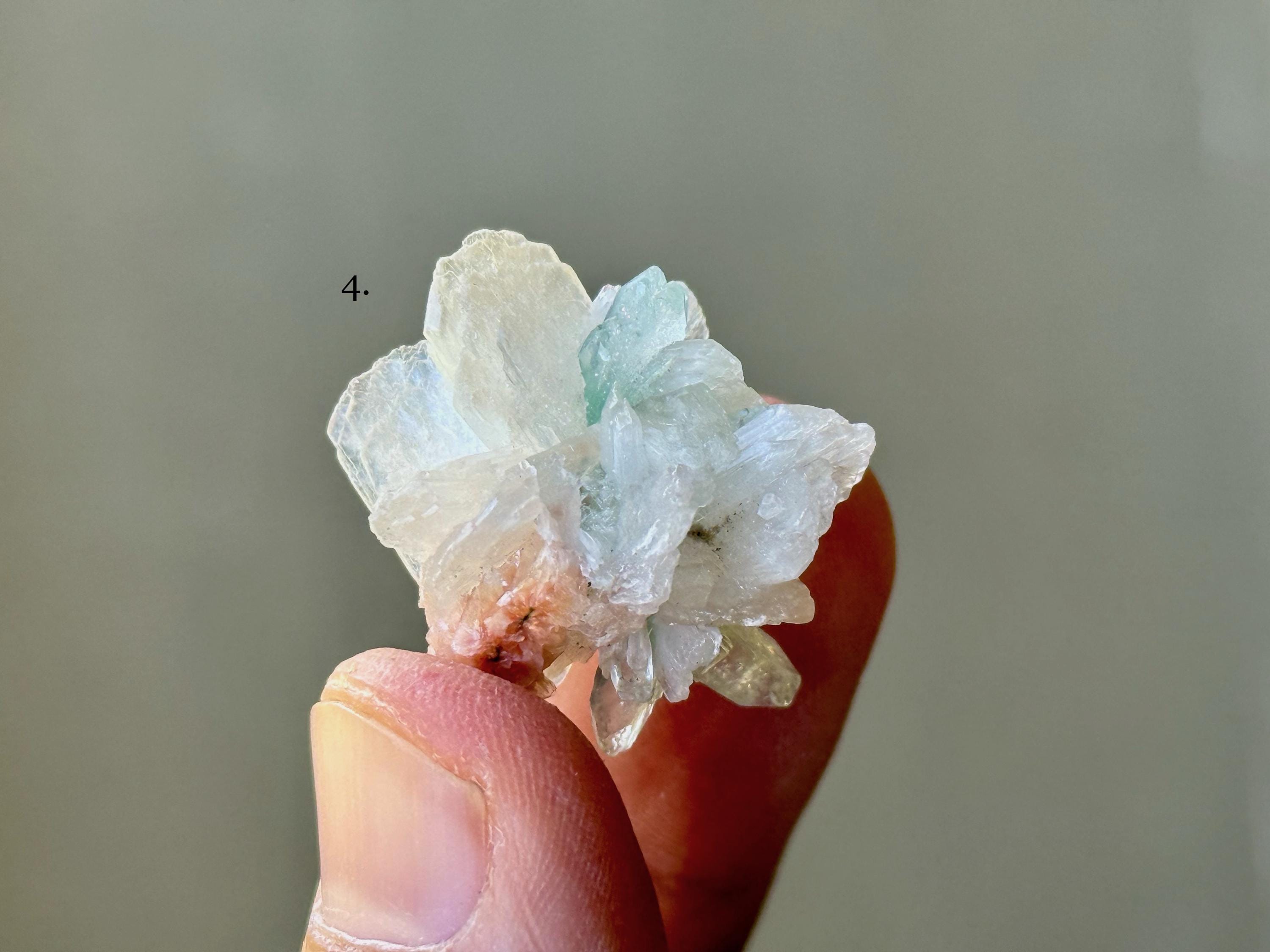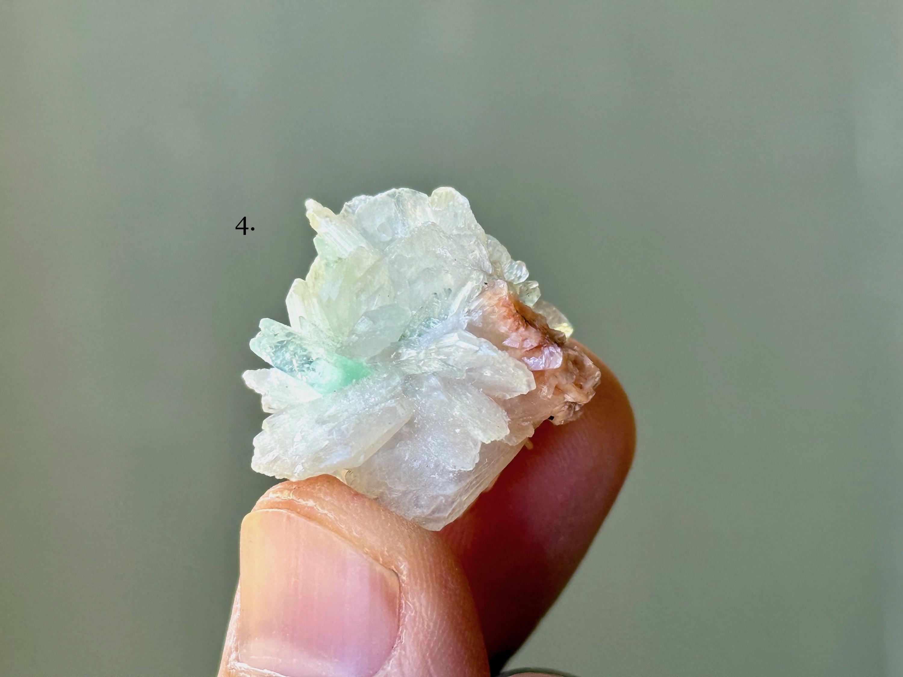 Green Apophyllite Quartz is the rarest of all colors of Apophyllite. Some say that this green hue comes from the inclusion of Celadonite, however we believe the more likely cause is the inclusion of Stillbite (which is often found near Apophyllite), which triggers a chemical reaction that causes this lovely green color.