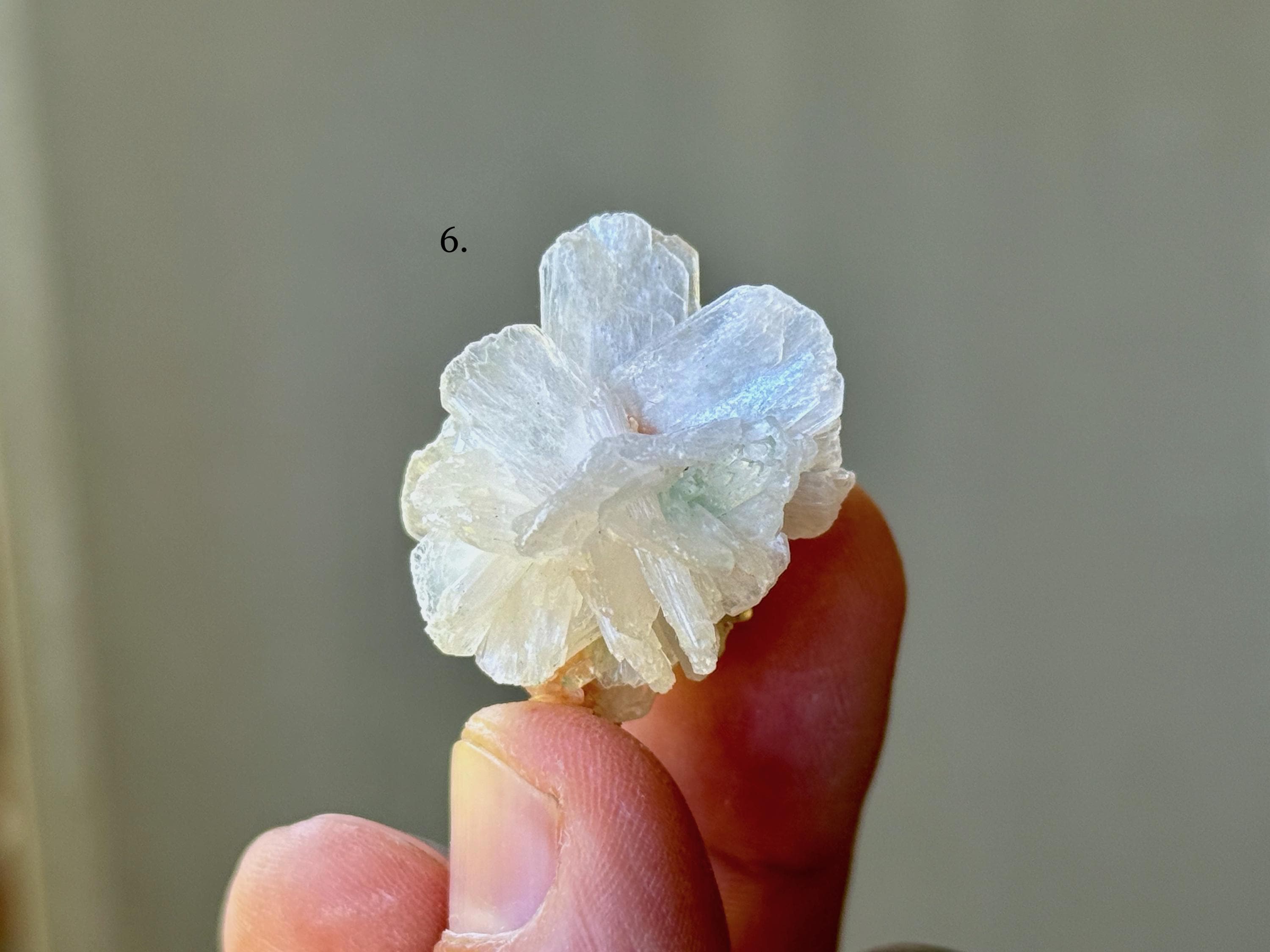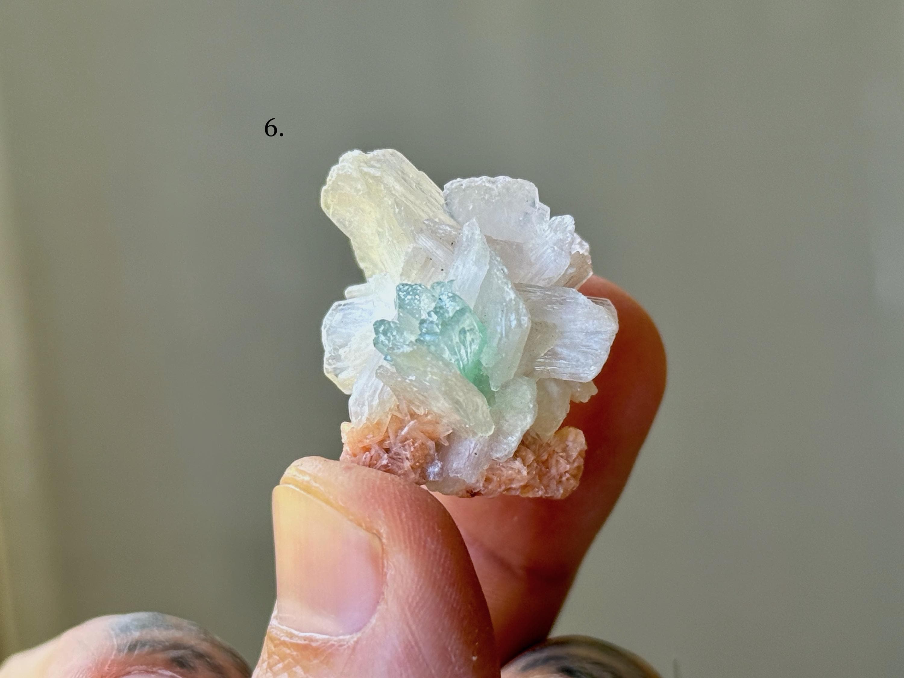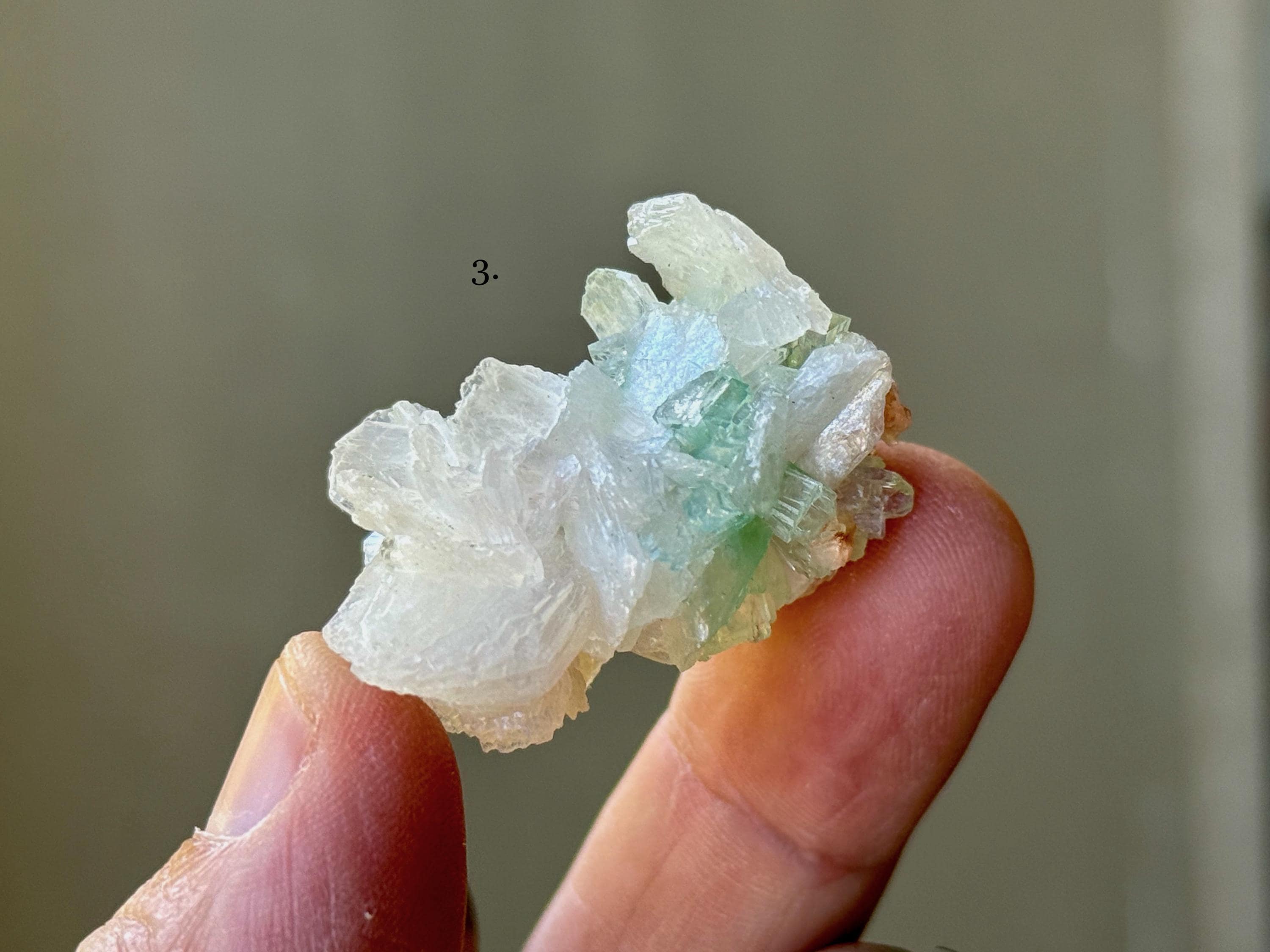 Green Apophyllite Quartz is the rarest of all colors of Apophyllite. Some say that this green hue comes from the inclusion of Celadonite, however we believe the more likely cause is the inclusion of Stillbite (which is often found near Apophyllite), which triggers a chemical reaction that causes this lovely green color.