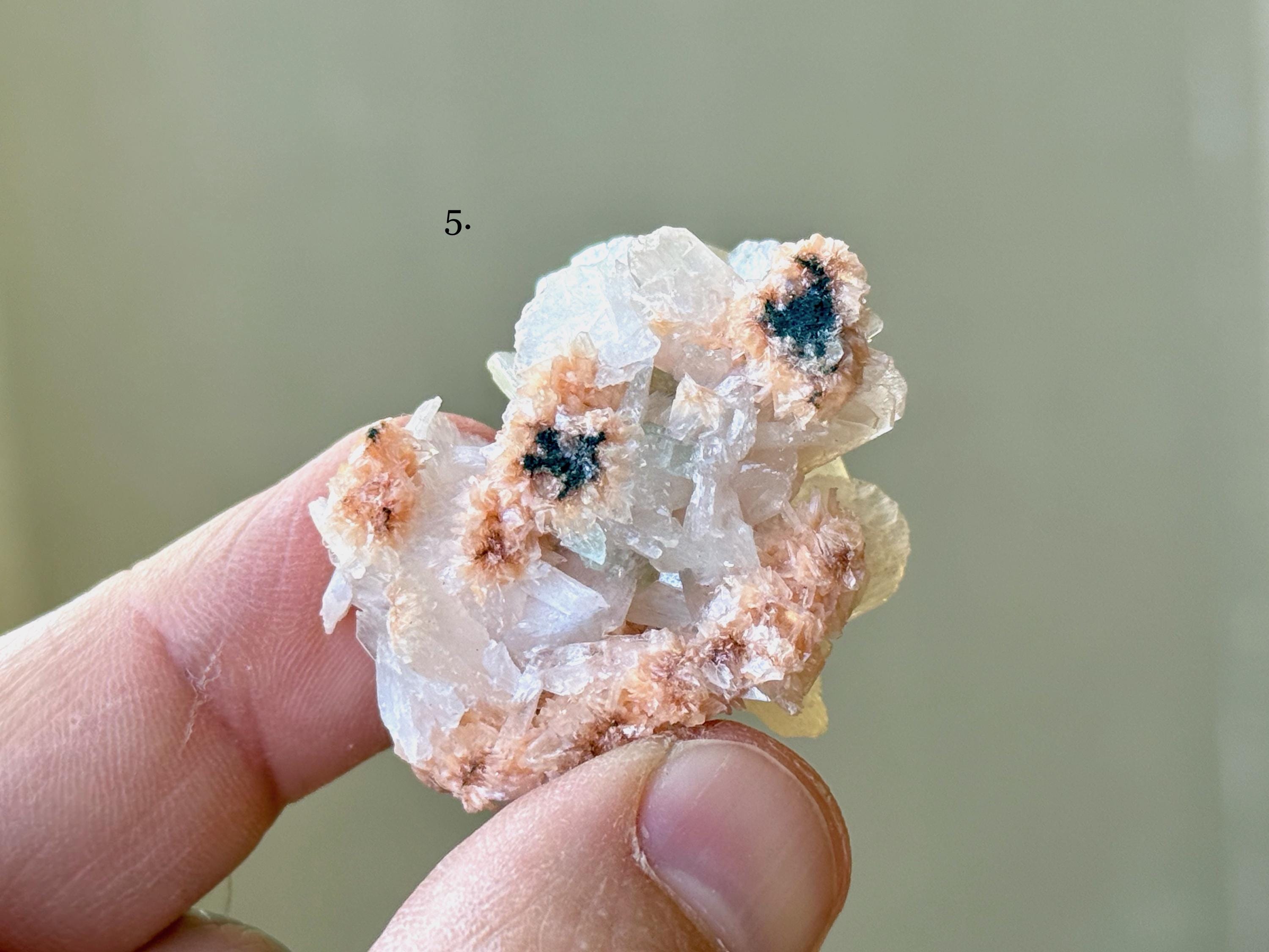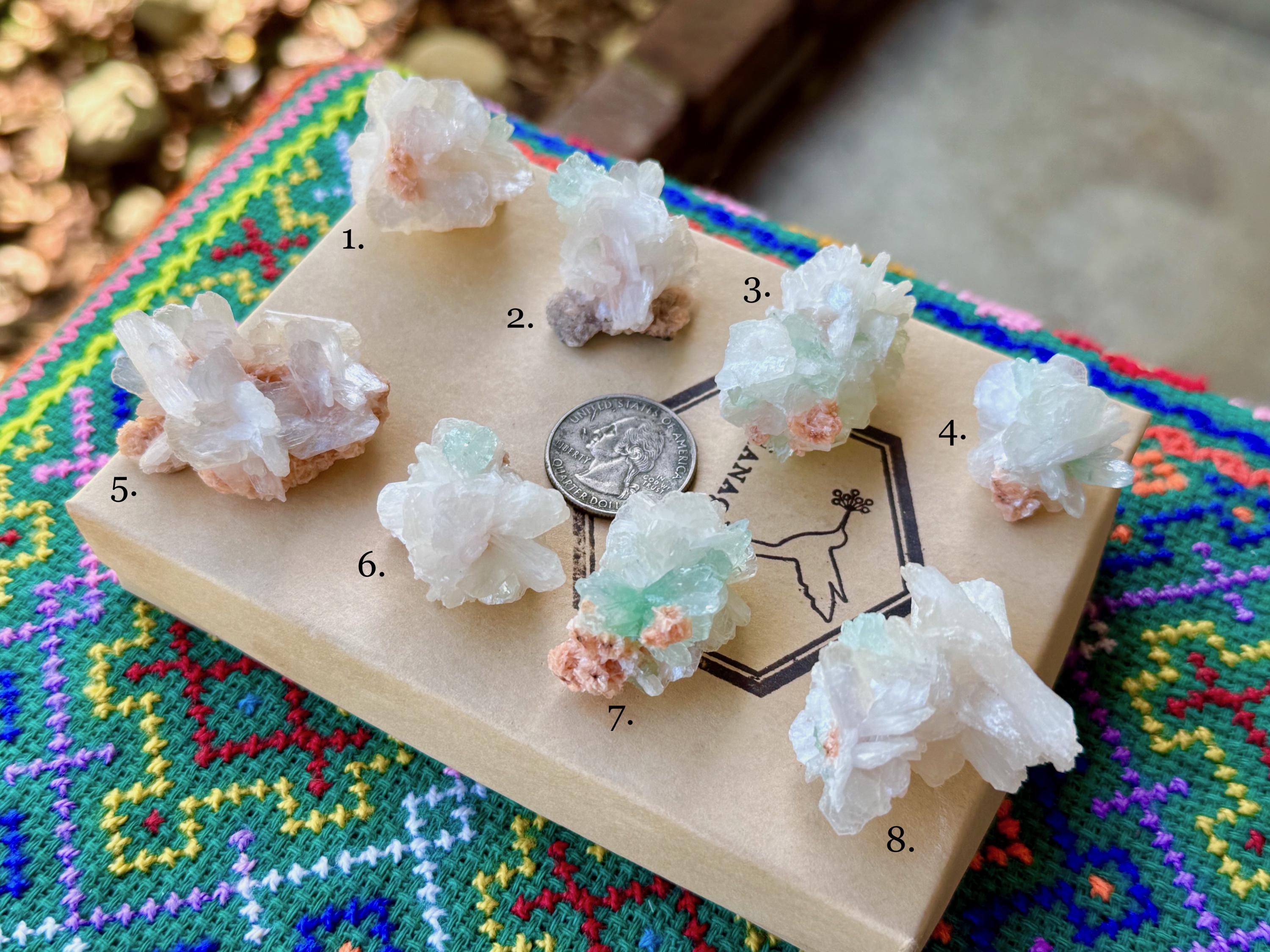 These natural Stillbite crystals with Green Apophyllite come from India. Each selection is numbered, simply select the one(s) you'd like from the dropdown.