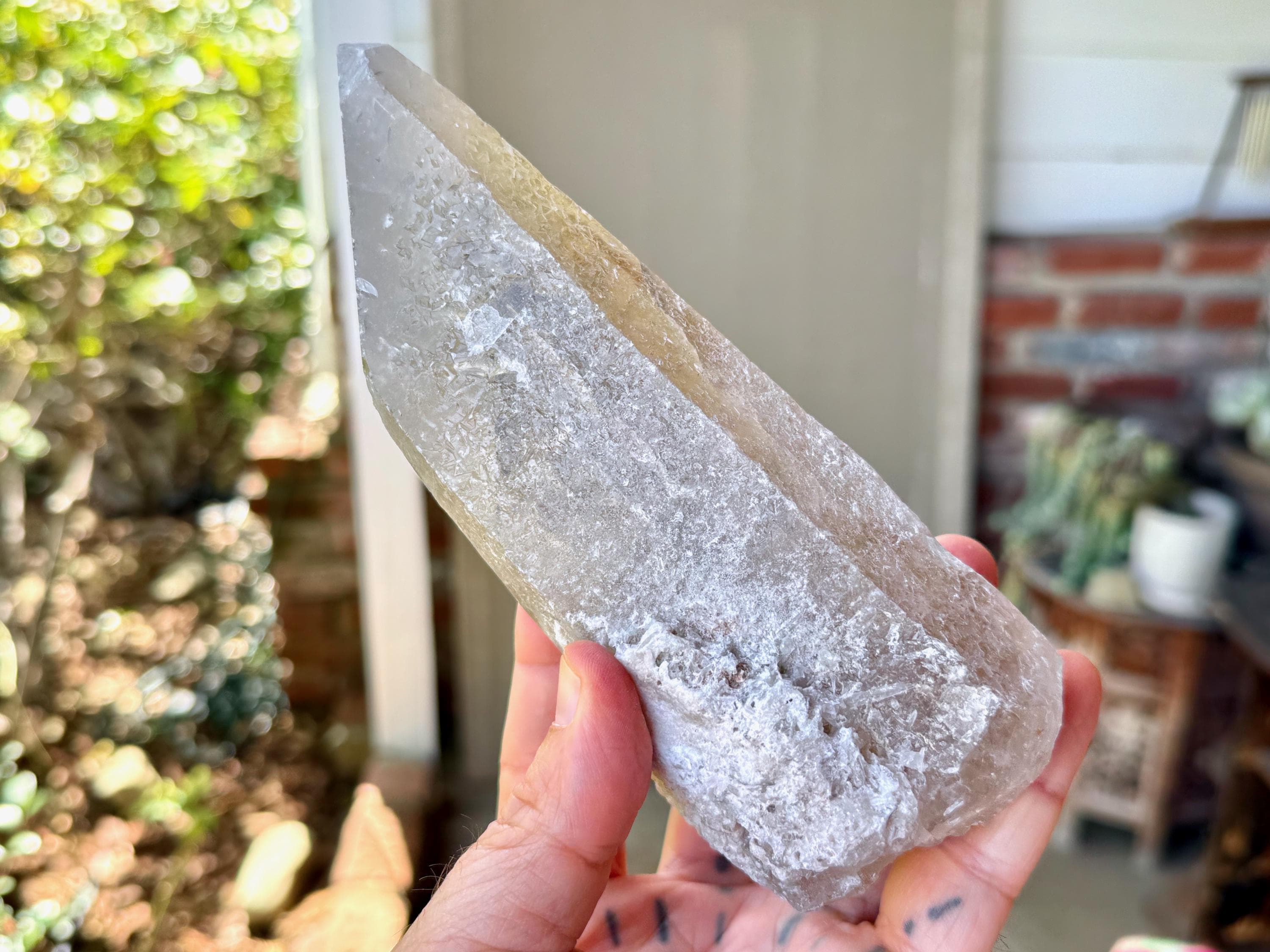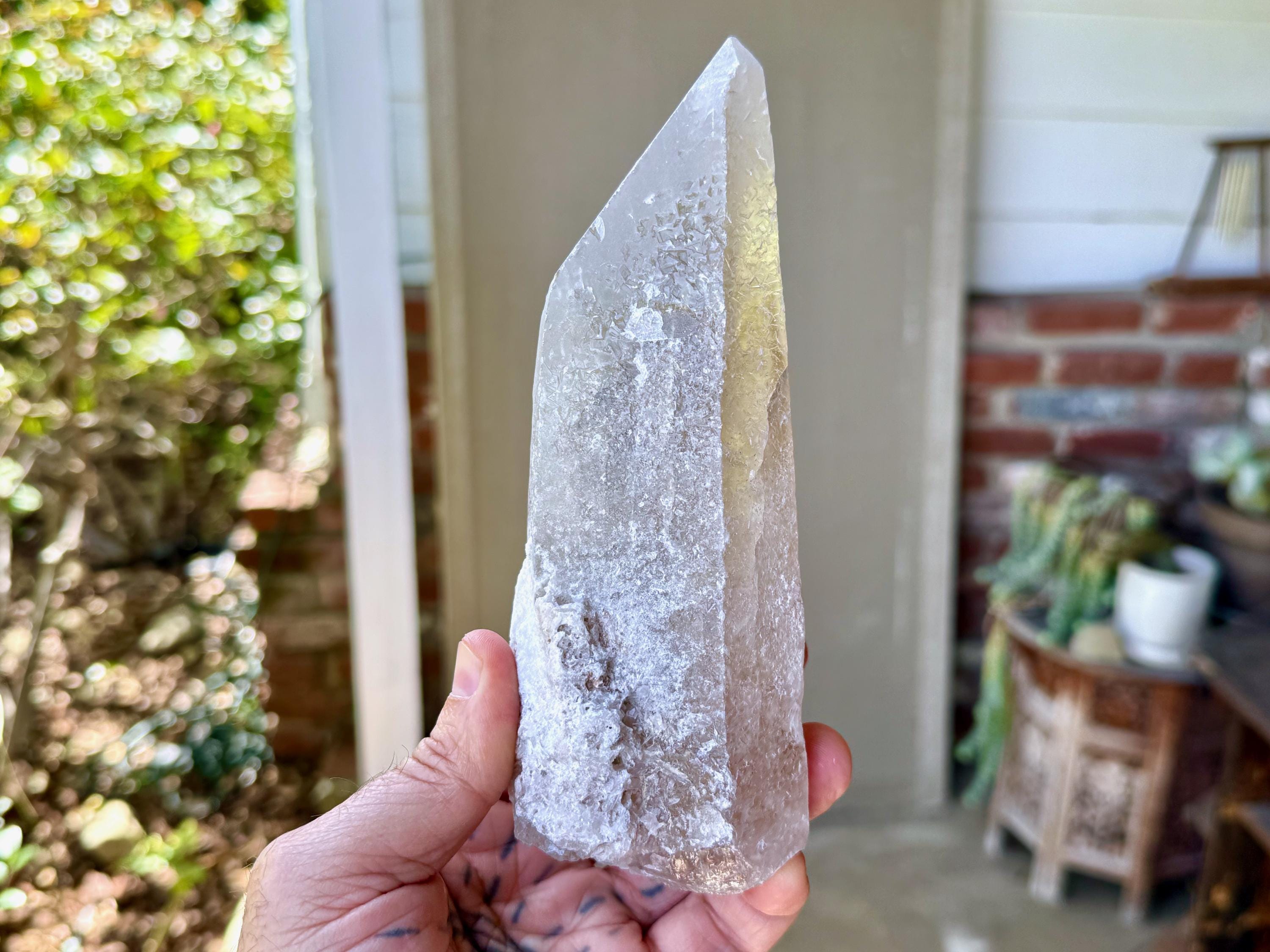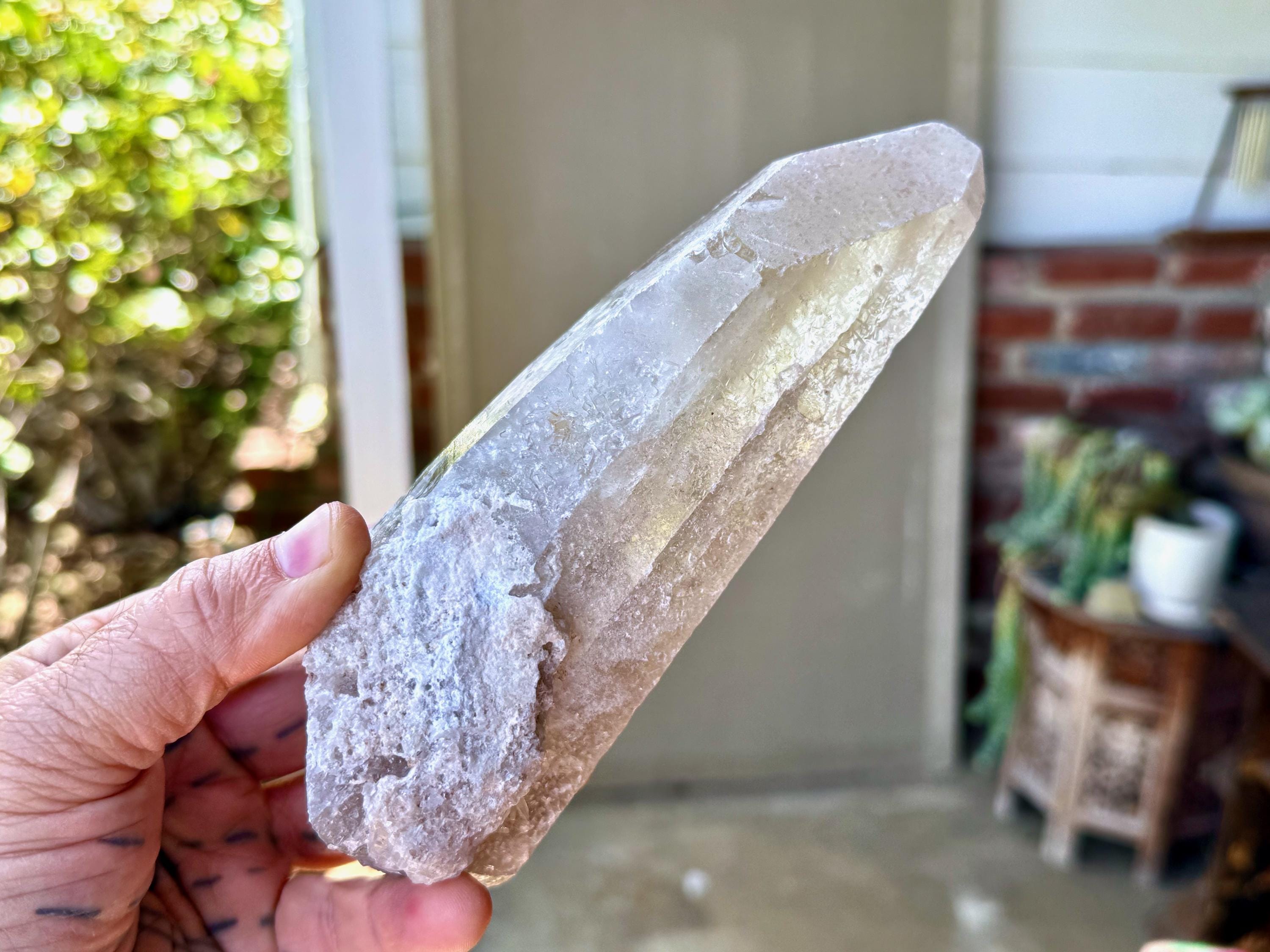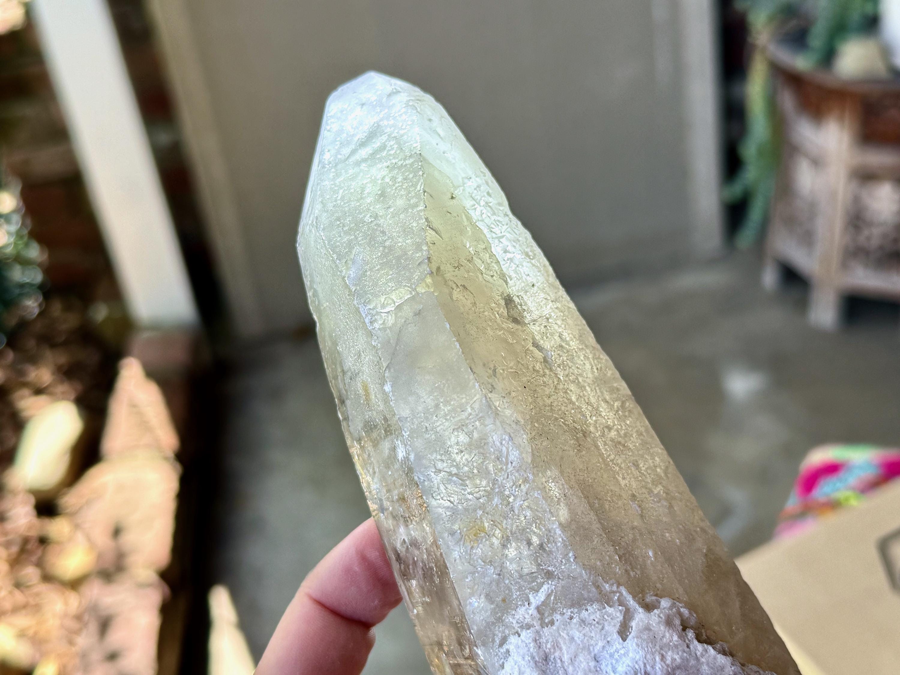 This one takes our breath away! The largest crystal we've seen so far from this collection, this Sacred Scribe Lemurian possesses a powerful, elongated formation and a lustrous, mildly golden-smoky complexion, contrasted with a subtle white "frost" over some portions of the exterior and main facet.