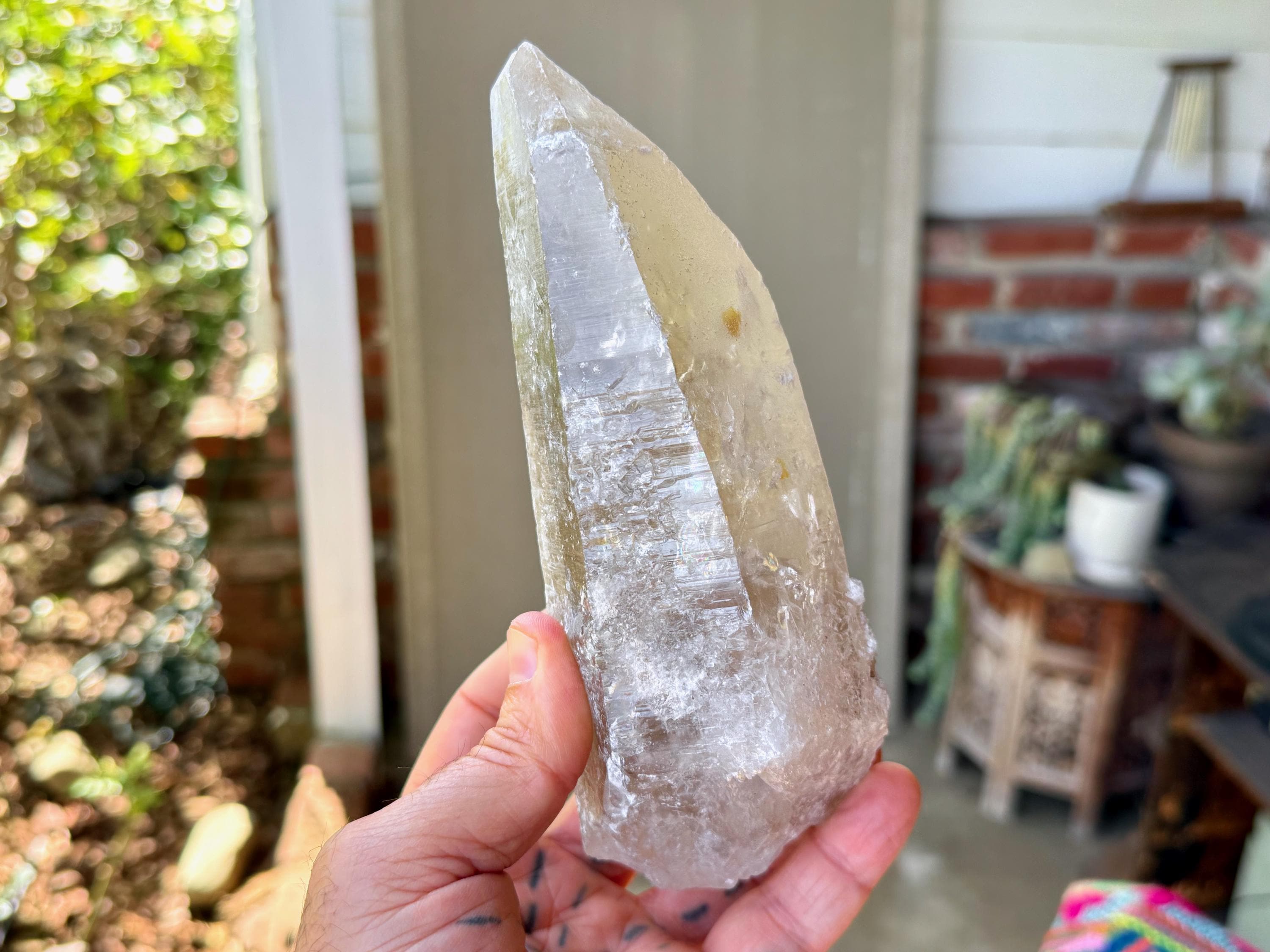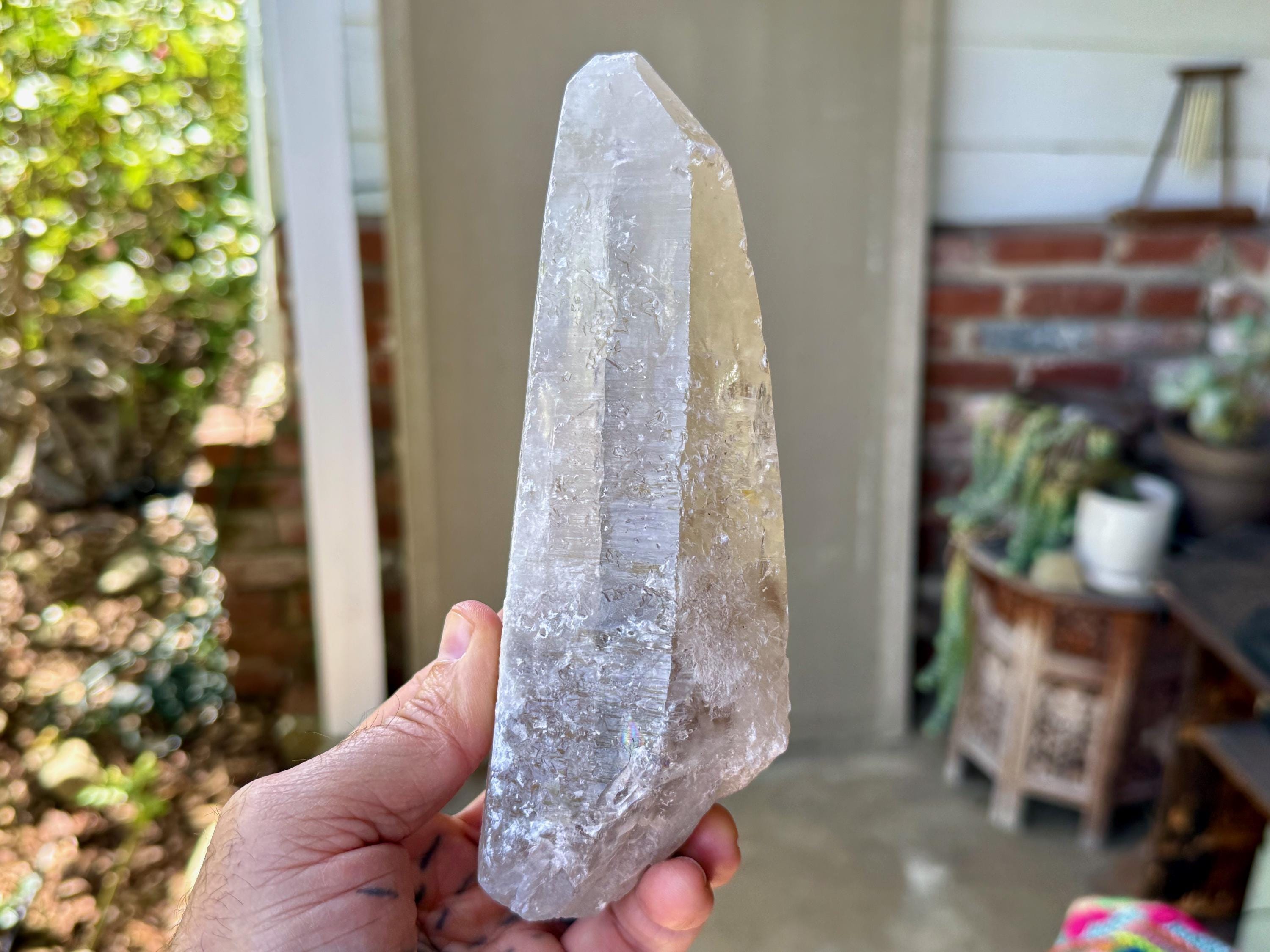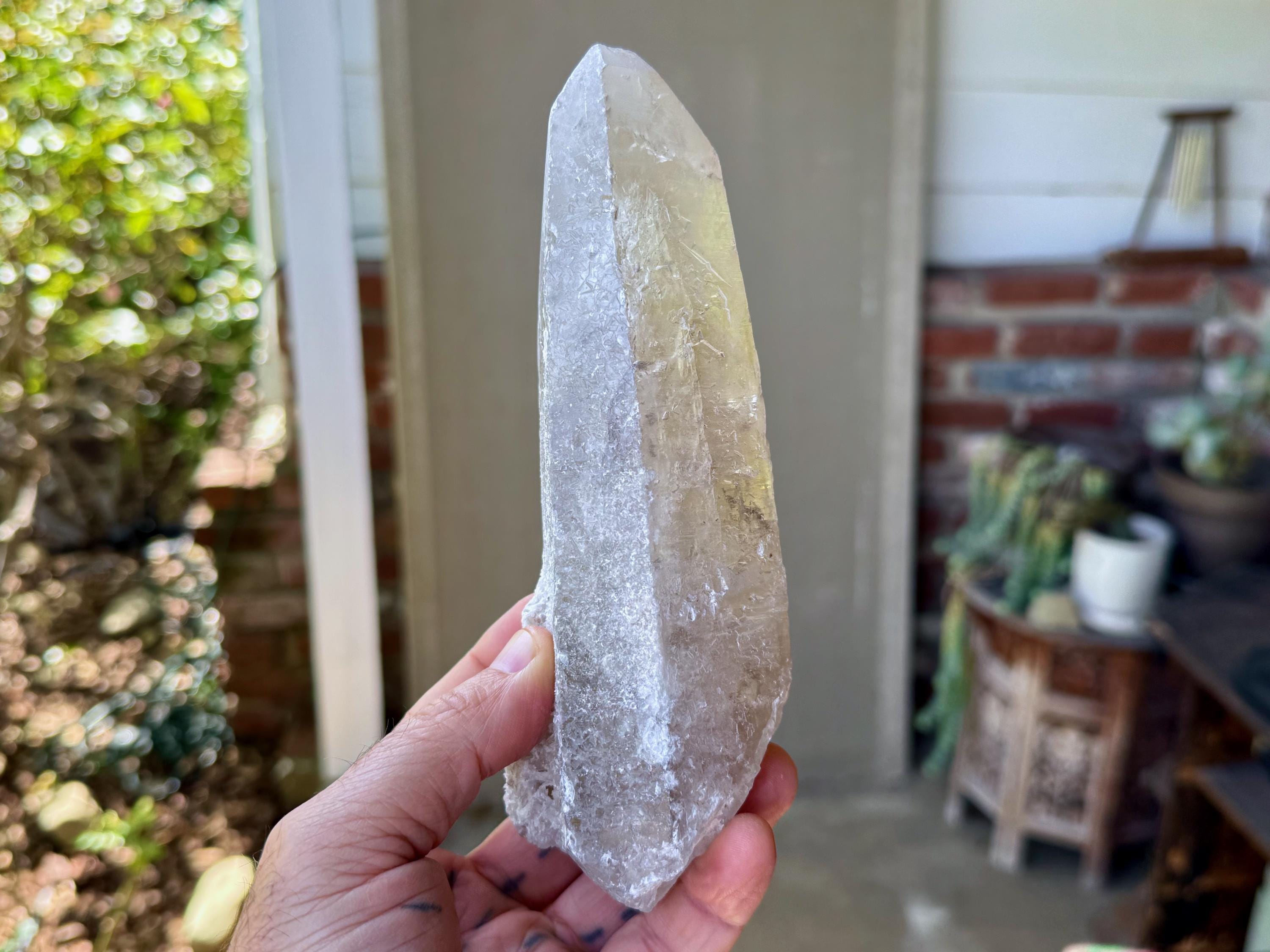 This one takes our breath away! The largest crystal we've seen so far from this collection, this Sacred Scribe Lemurian possesses a powerful, elongated formation and a lustrous, mildly golden-smoky complexion, contrasted with a subtle white "frost" over some portions of the exterior and main facet.