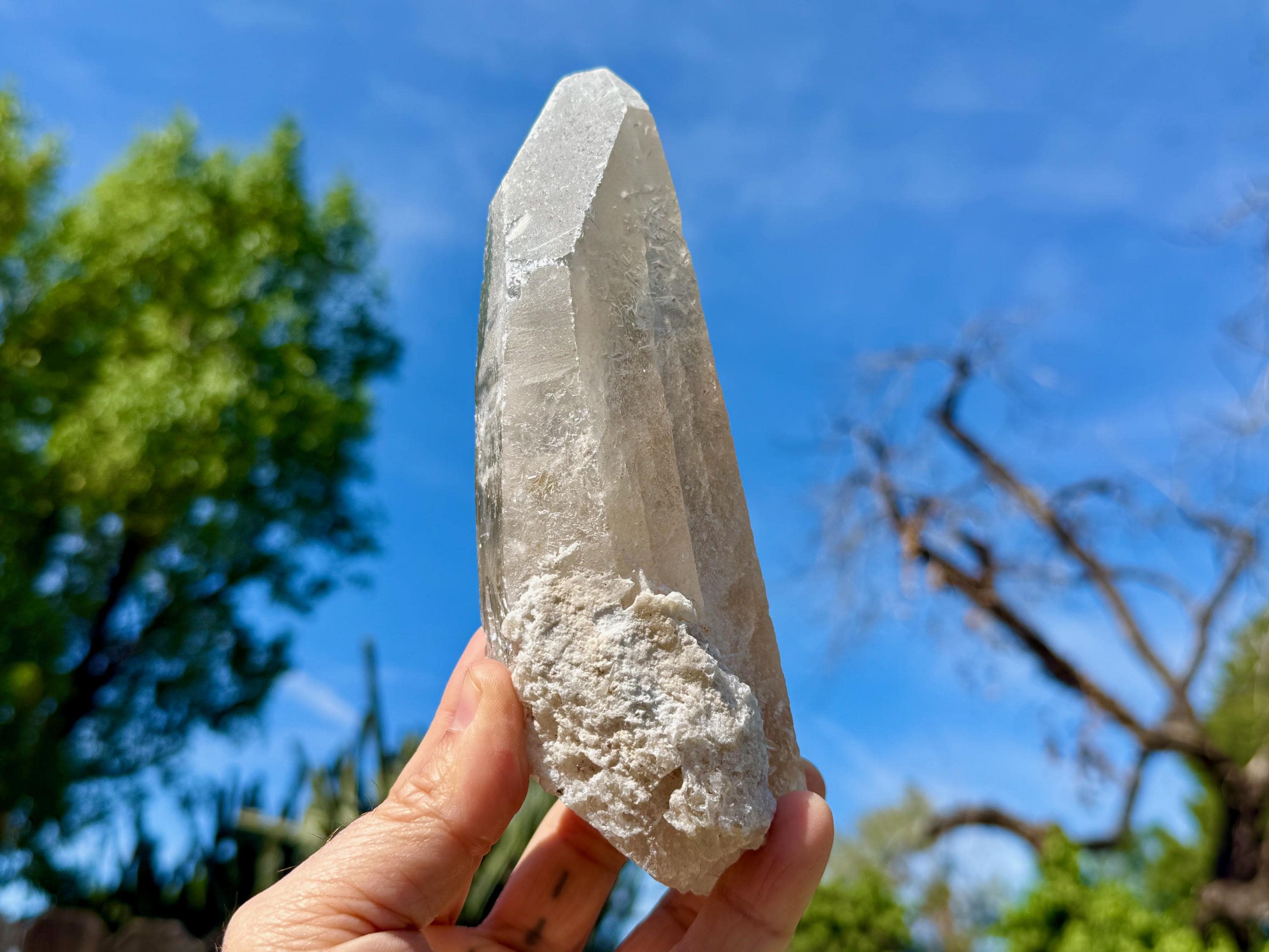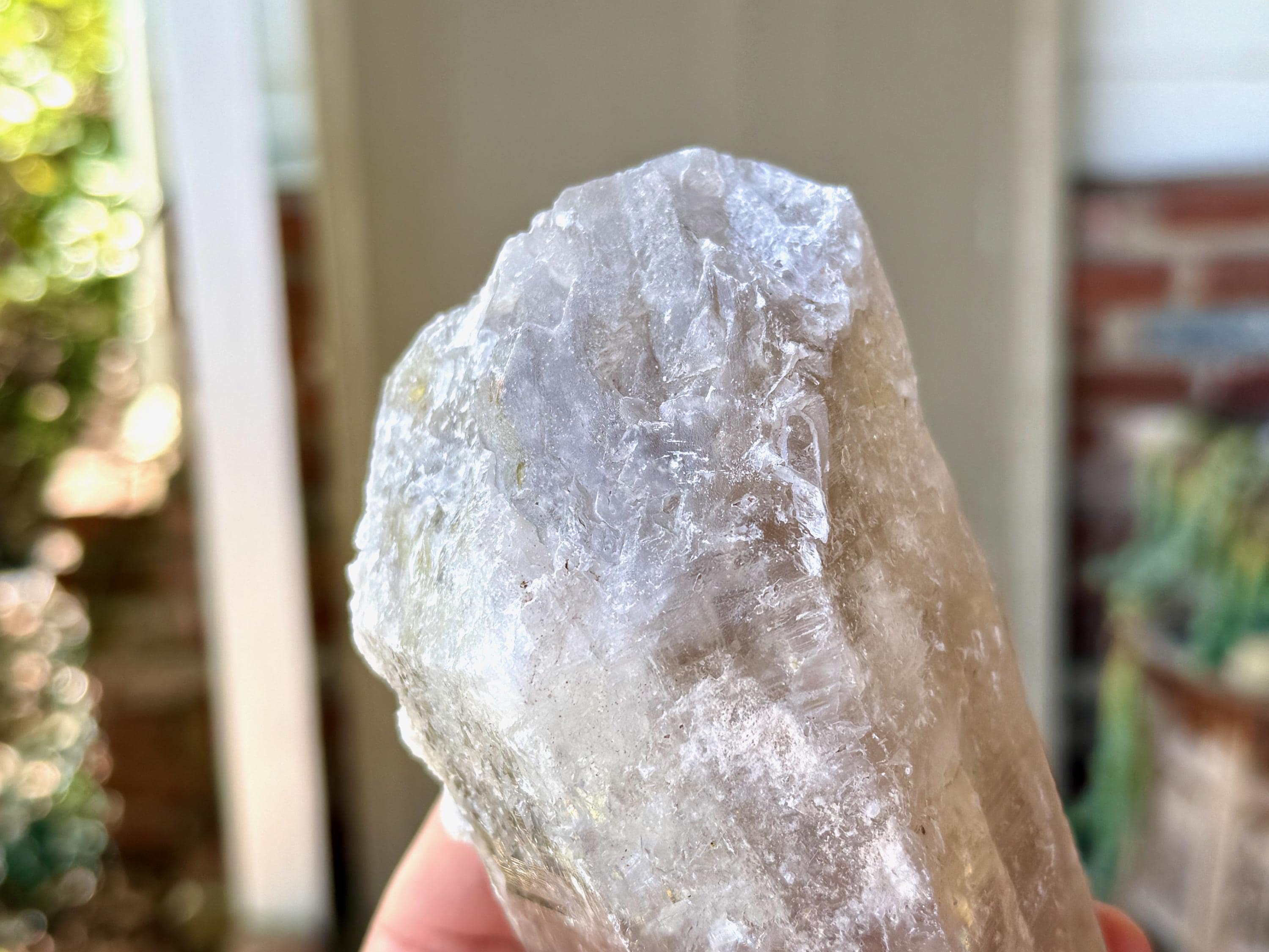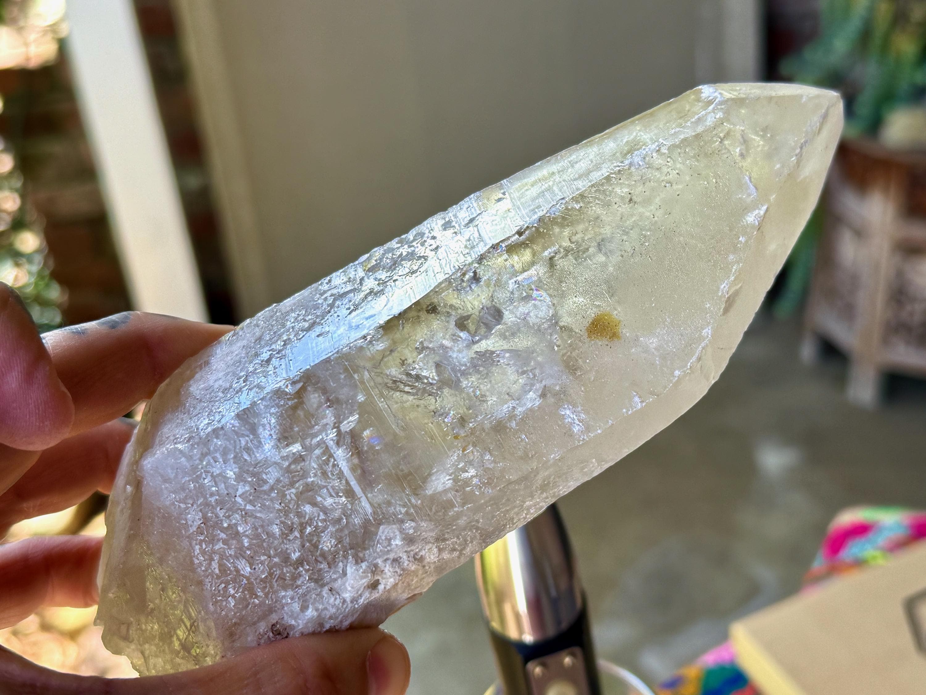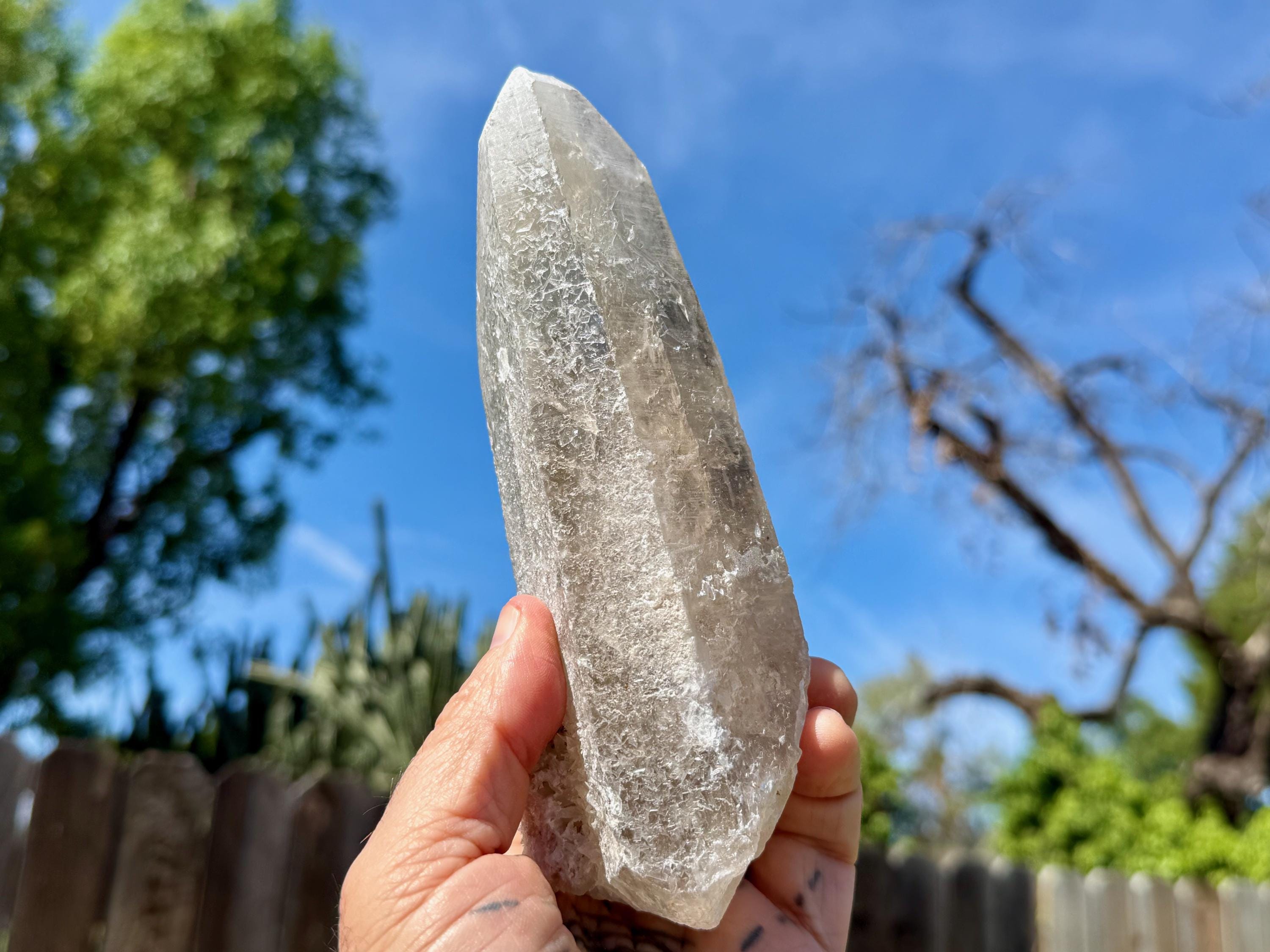 This one takes our breath away! The largest crystal we've seen so far from this collection, this Sacred Scribe Lemurian possesses a powerful, elongated formation and a lustrous, mildly golden-smoky complexion, contrasted with a subtle white "frost" over some portions of the exterior and main facet.
