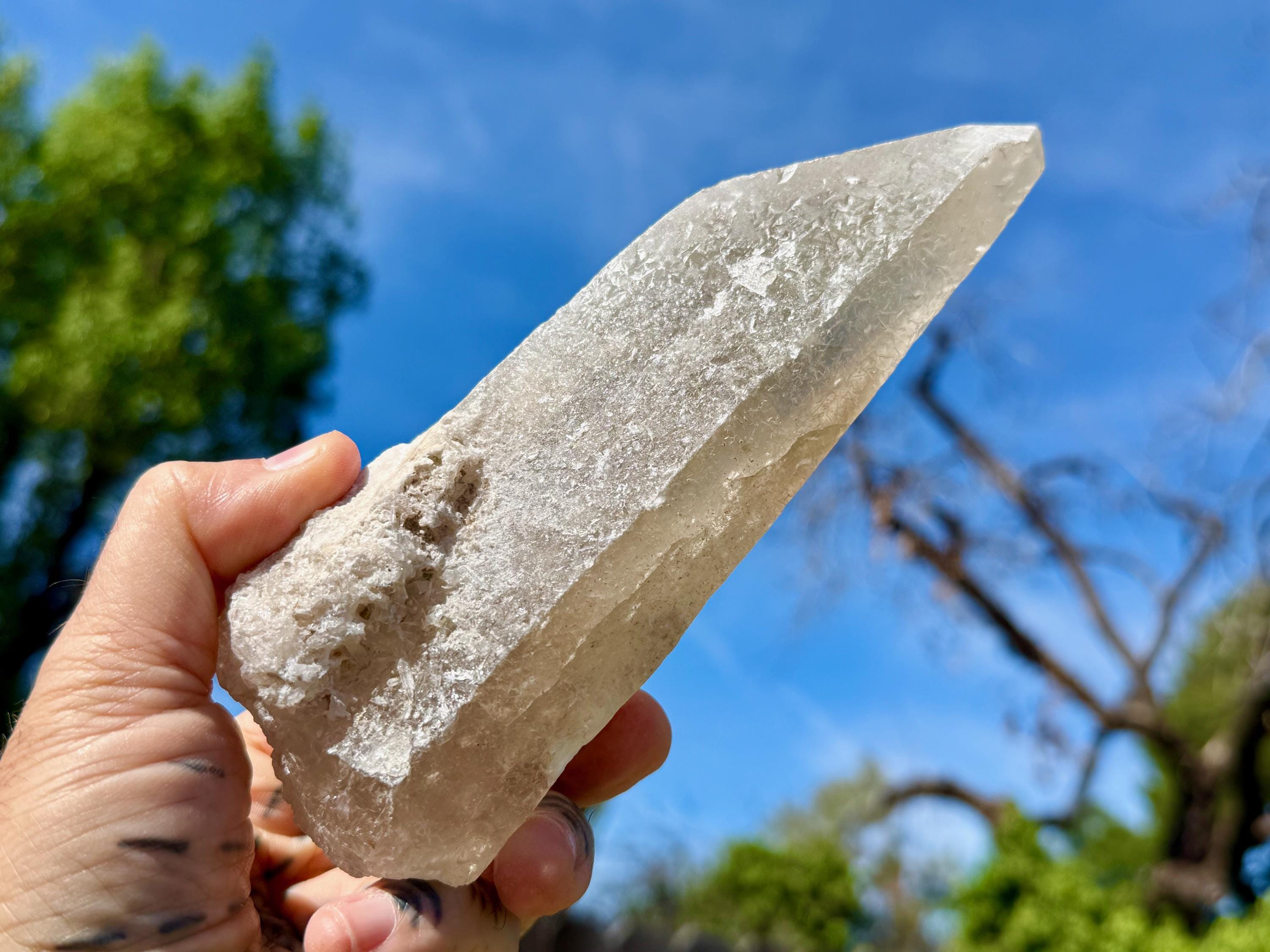 Lemurian Quartz resonates with all chakras, but primarily the Crown Chakra. It has one of the highest vibrations of any crystal and is a beautiful companion for meditation and to realign energies in the body. It can assist in clearing blockages in one's energy field and/or chakras, dispelling heavy energies from the body. If there is stagnant energy in the body, it can help to increase Prana (life force) energy to get things moving properly again. Meditating with Lemurian Crystals can allow us to connect with higher-dimensional spirit guides and connect to Divine realms, as well as to decode the information they contain within.