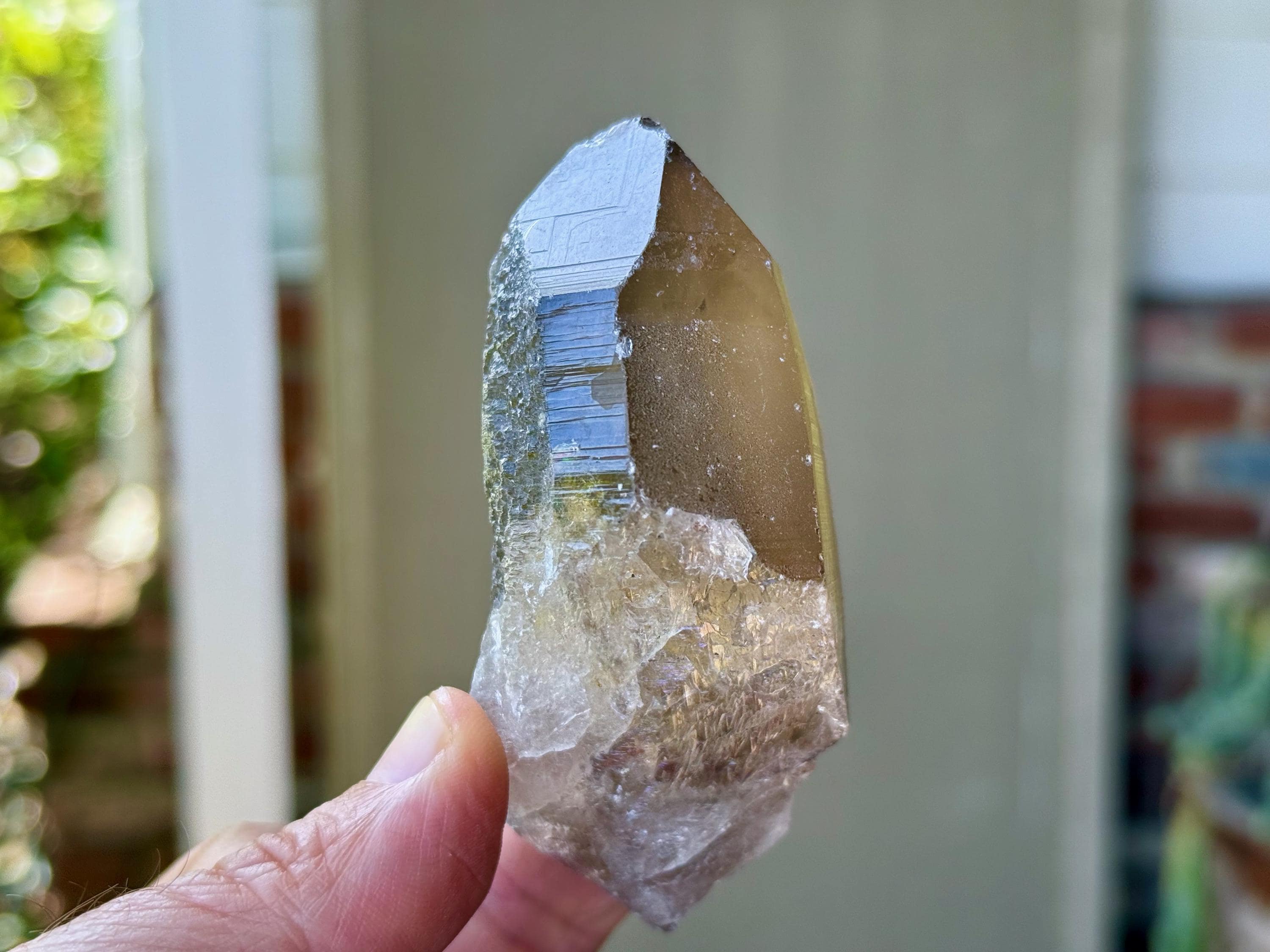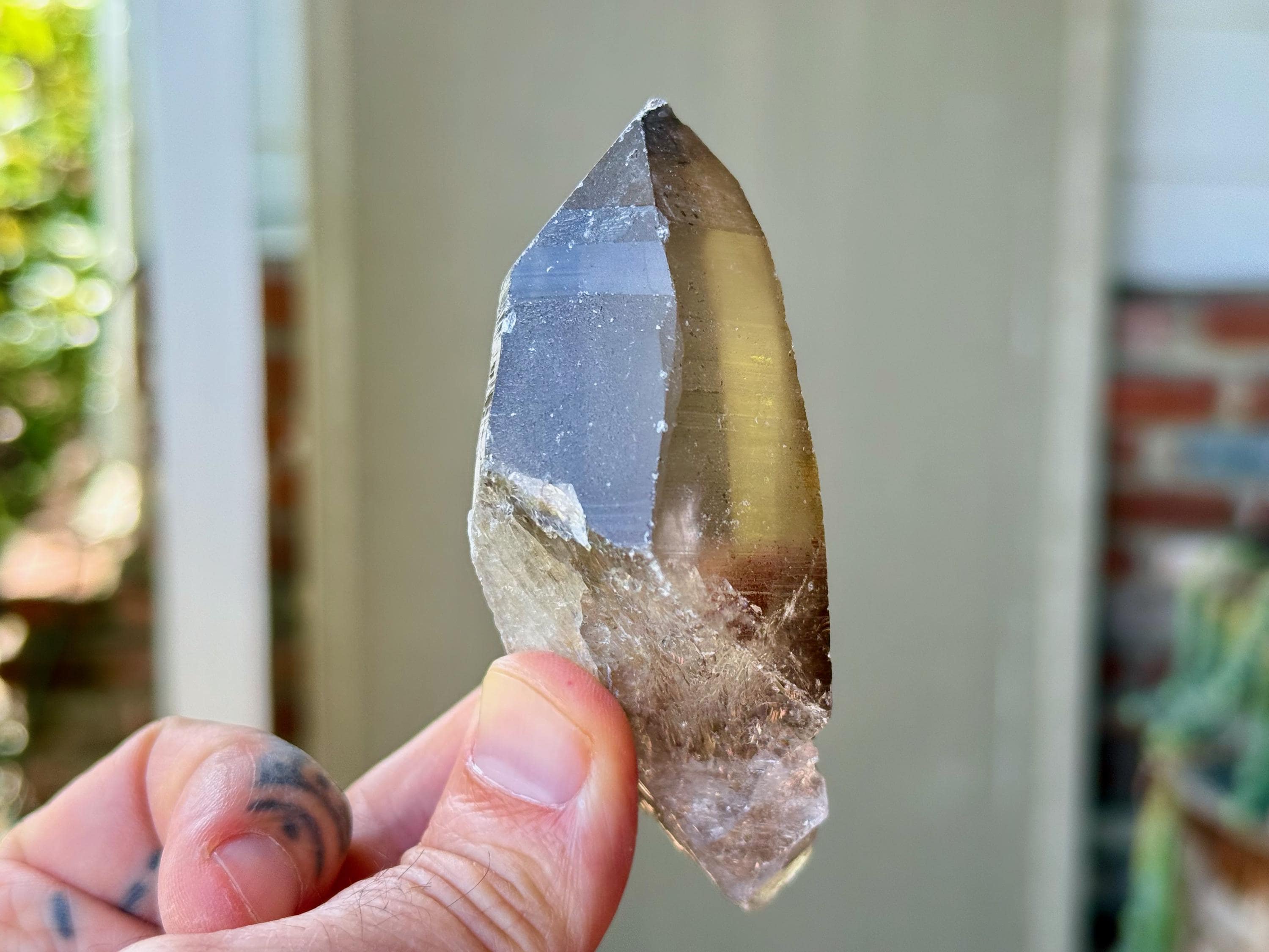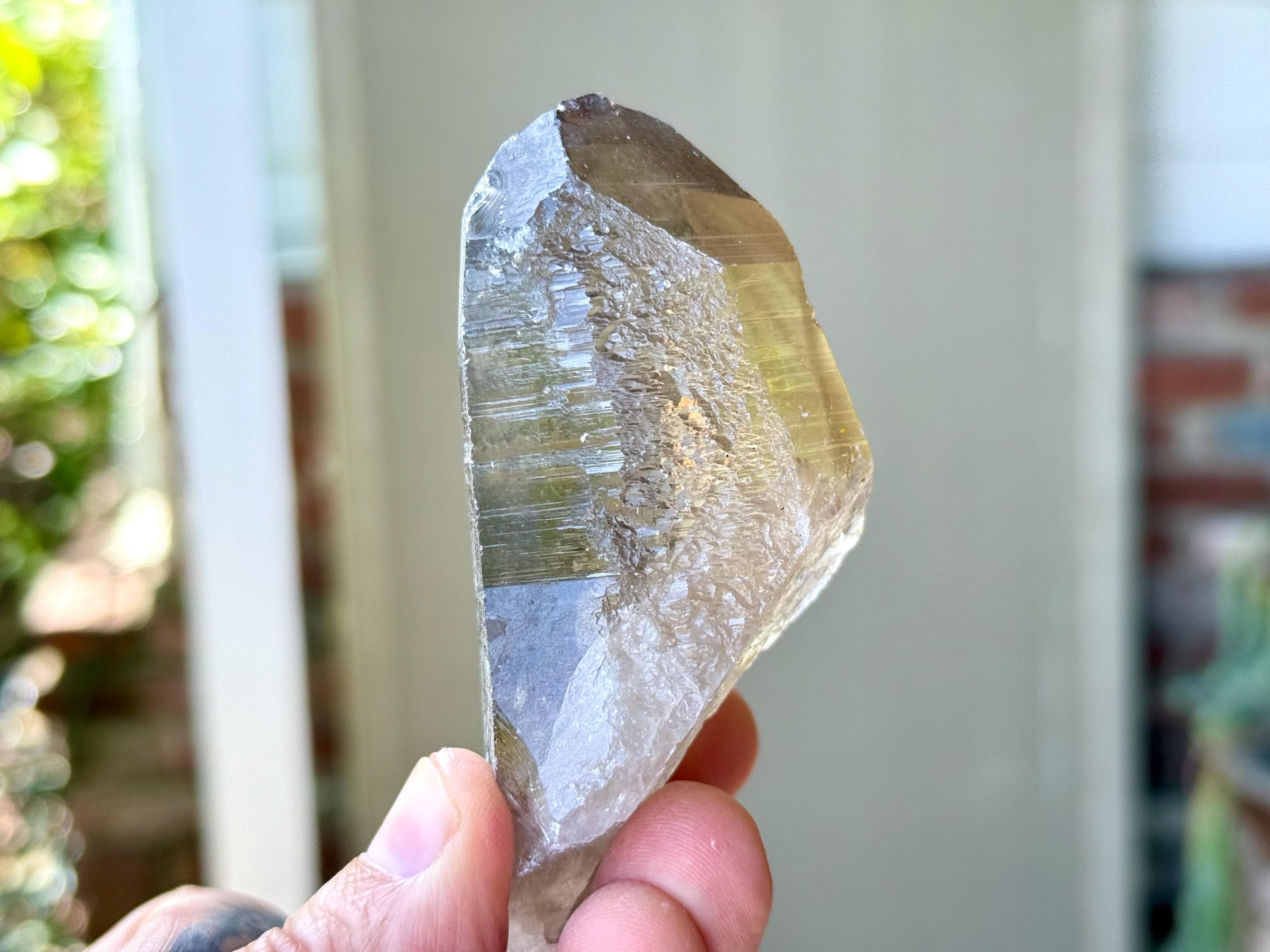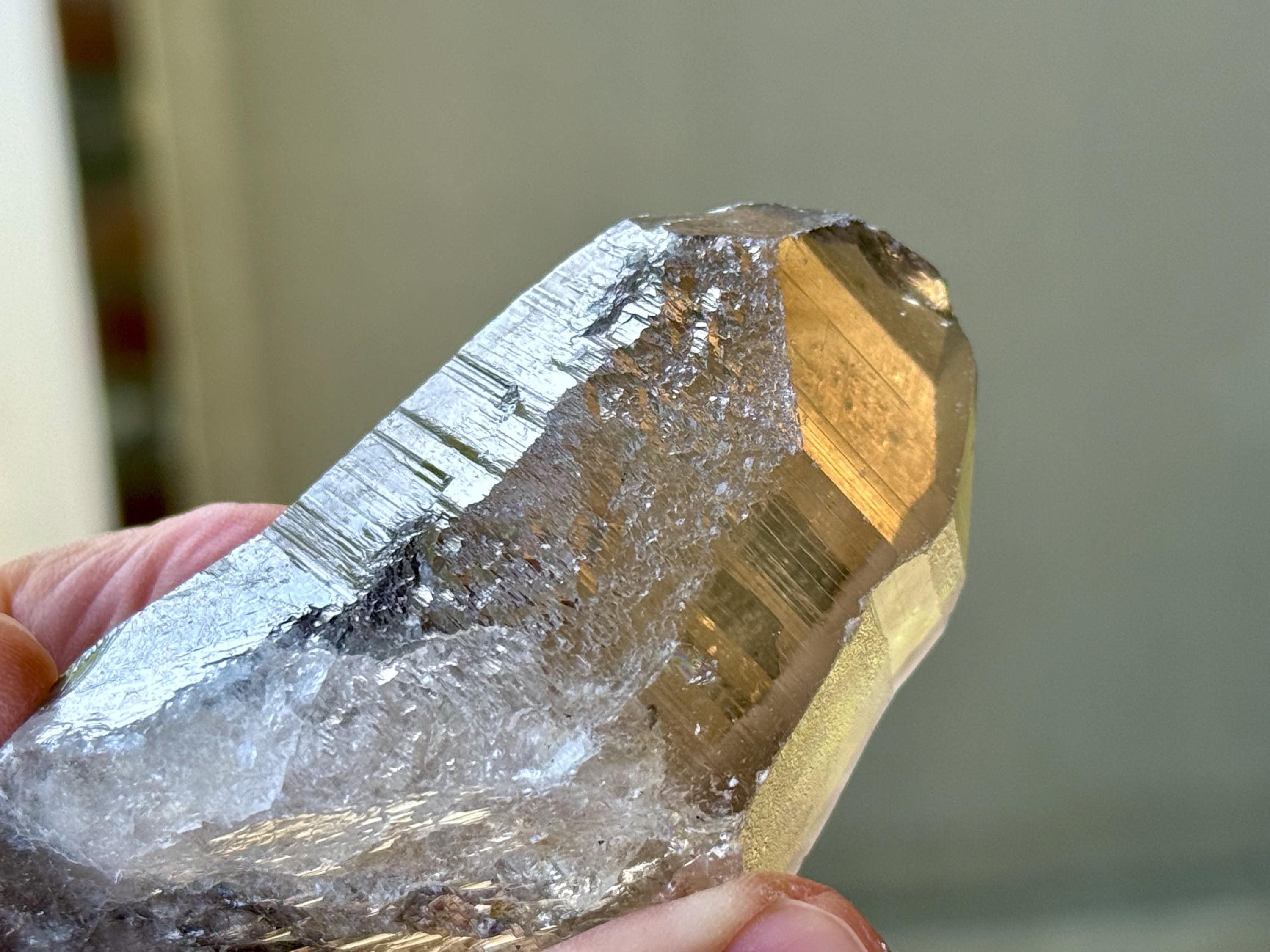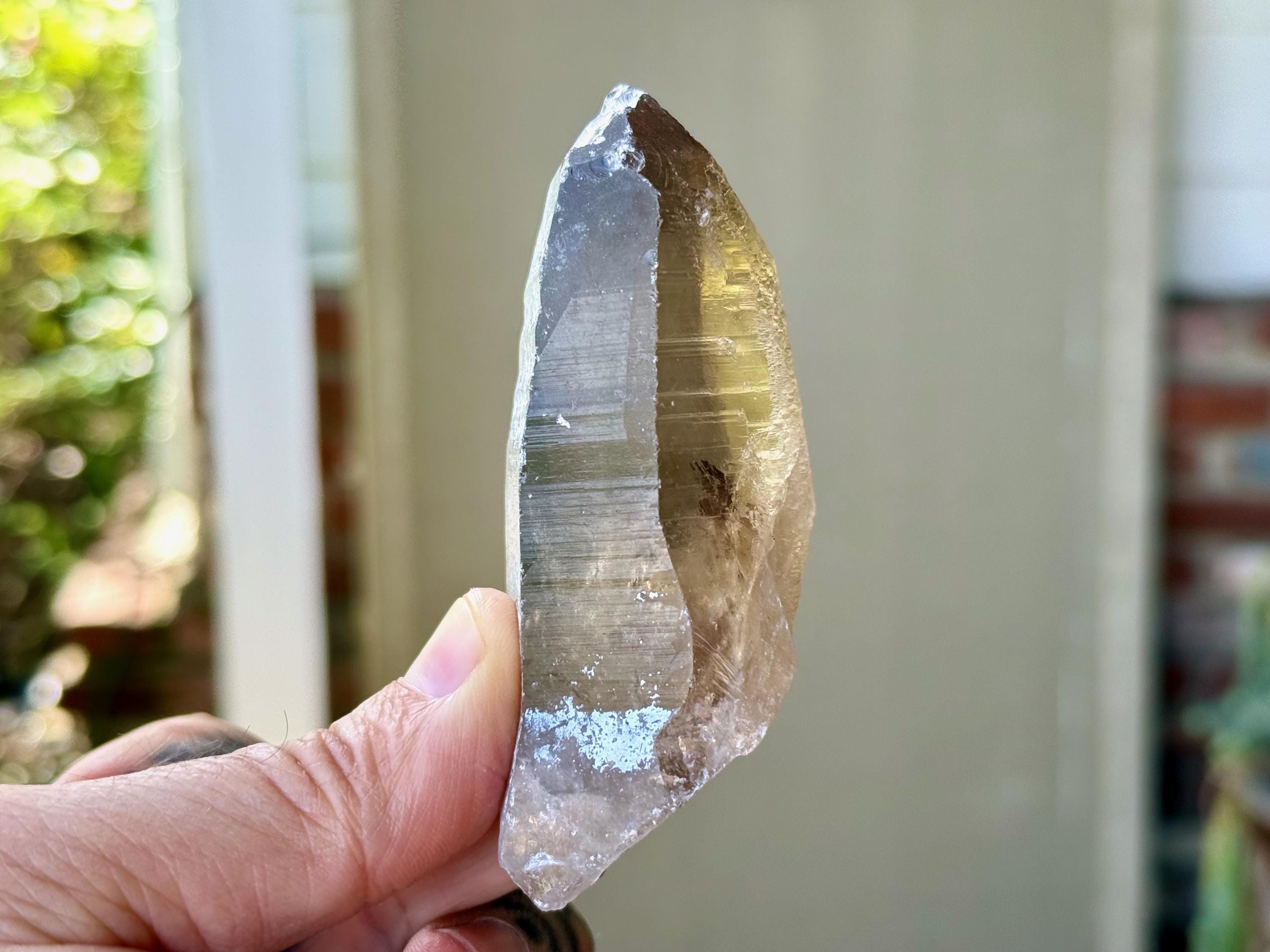 An elegant smoky-golden hue, exquisite clarity and brilliant luster to this exceptional Sacred Scribe Lemurian Quartz. This crystal possesses traditional Lemurian striations on its sides, interrupted only by a beautiful textural self-healed area that runs from bottom to main facet on the left front side.