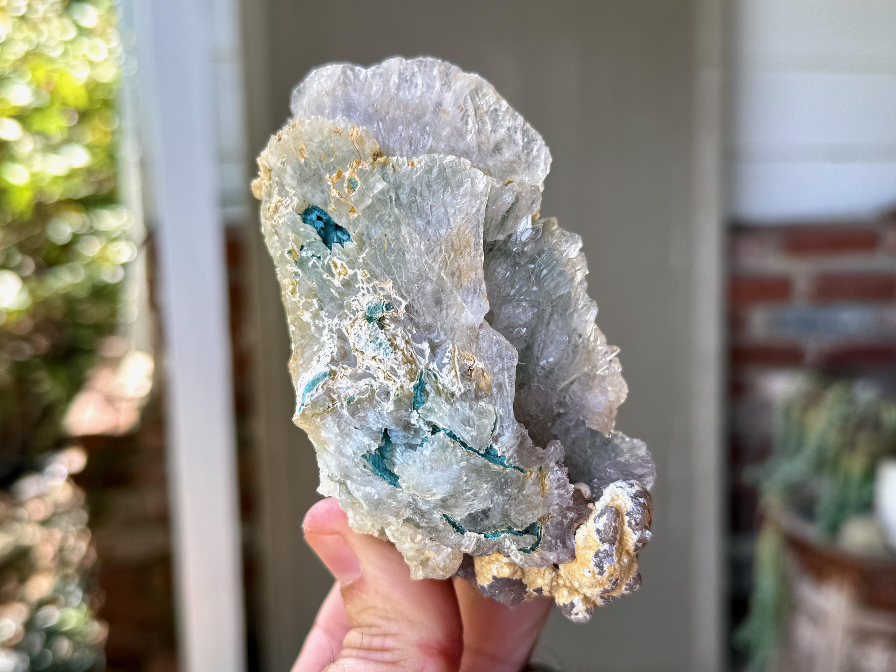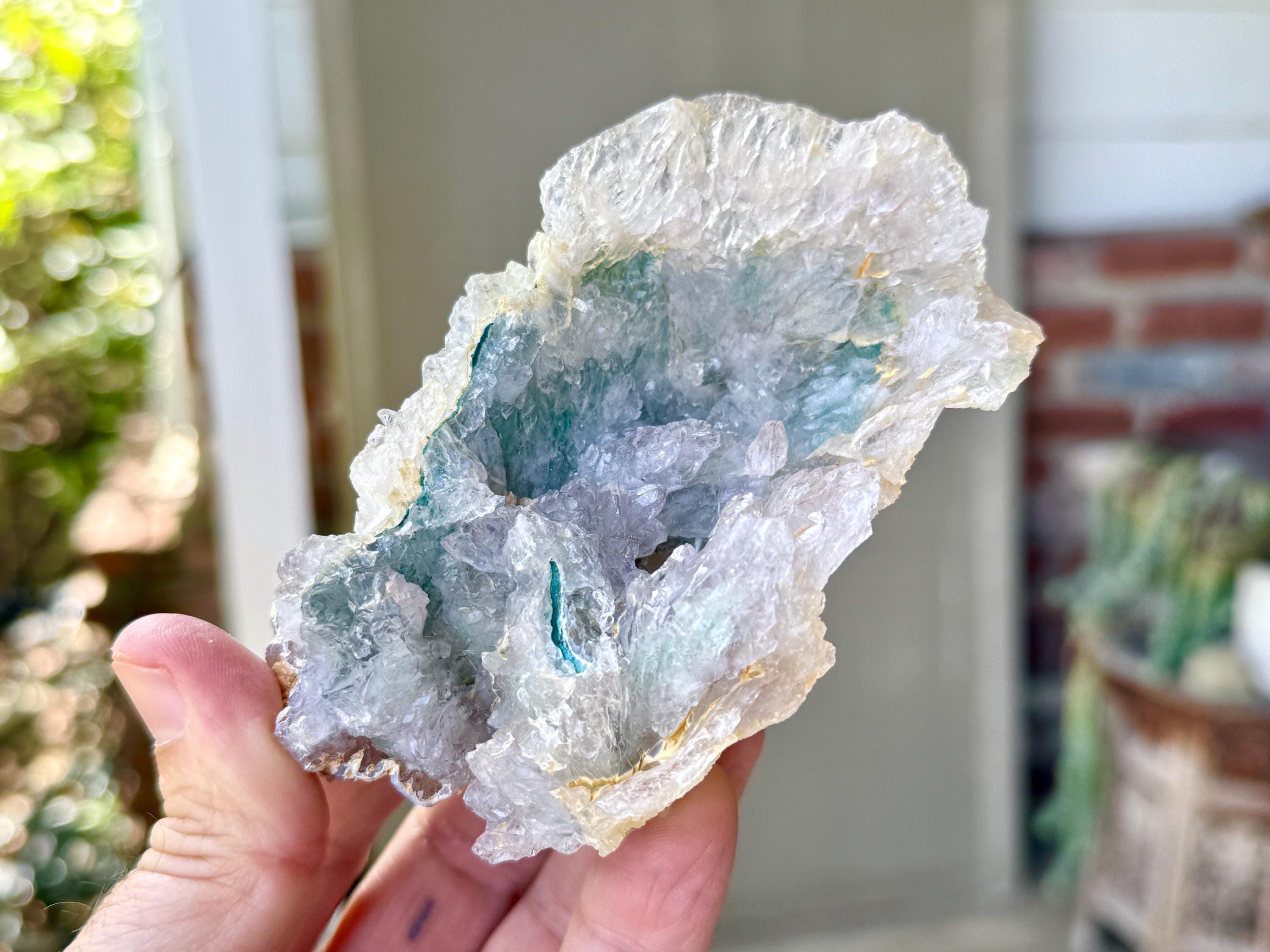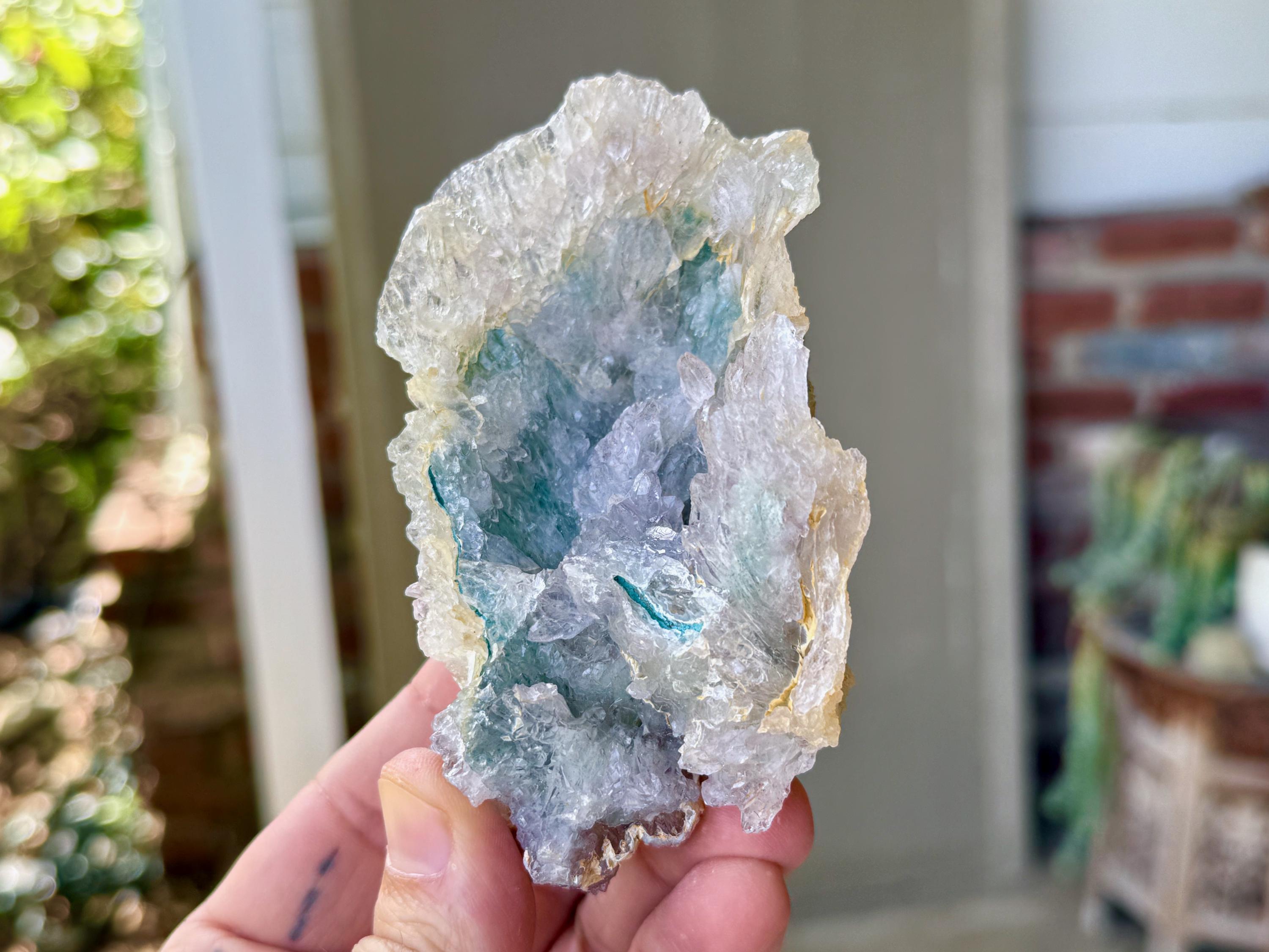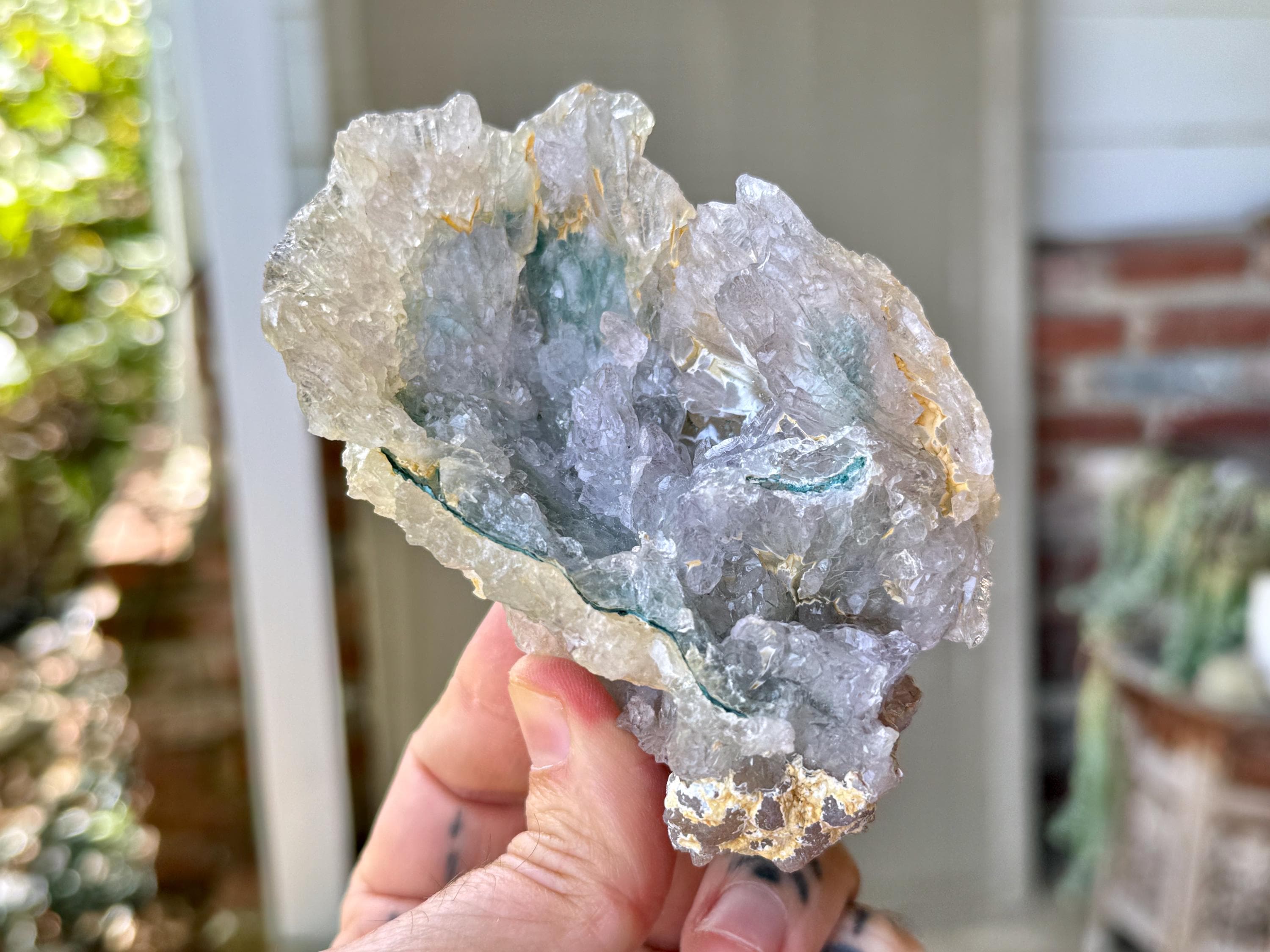 This crystal embodies all the things we love about these crystals, the curved crystalline growth, forming a bit of a "bowl," and the gentle lilac hue in the center that radiates more clear on the edges. On this piece, there are multiple layers of Quartz growth, and between them is a bright green vein of Celadonite. When we backlight the crystal, all these colors light up beautifully (Photos 3-4).
