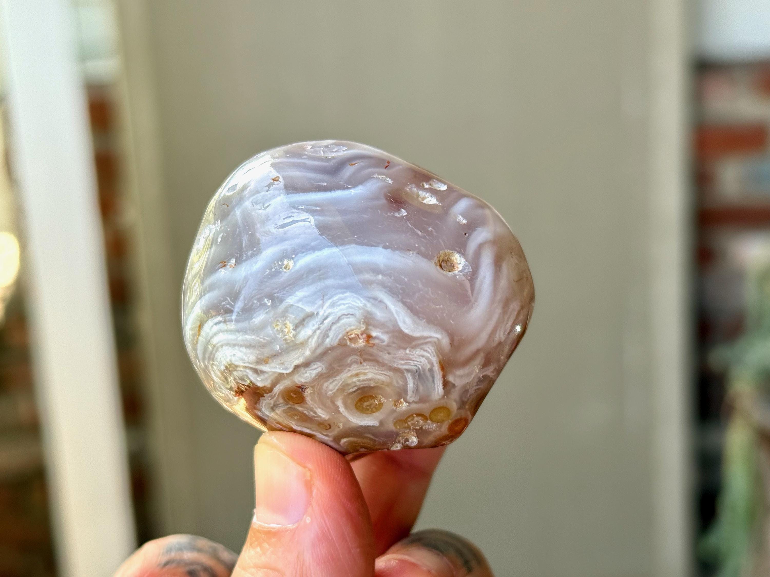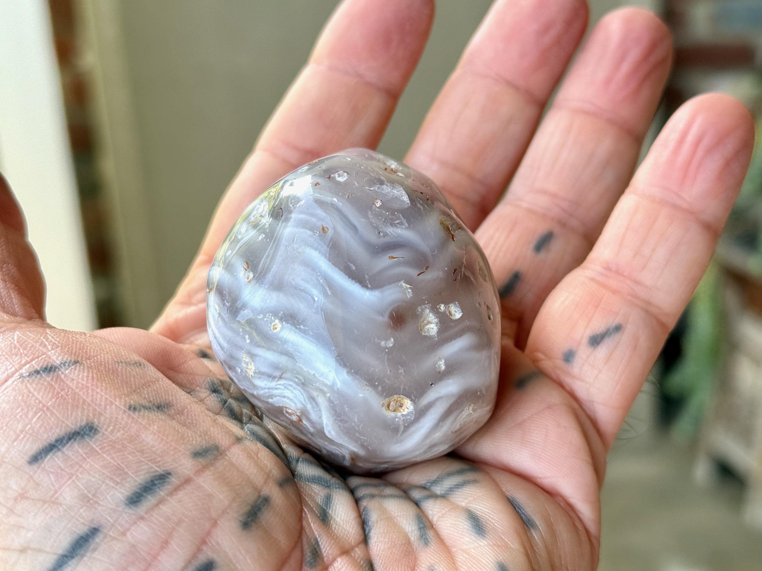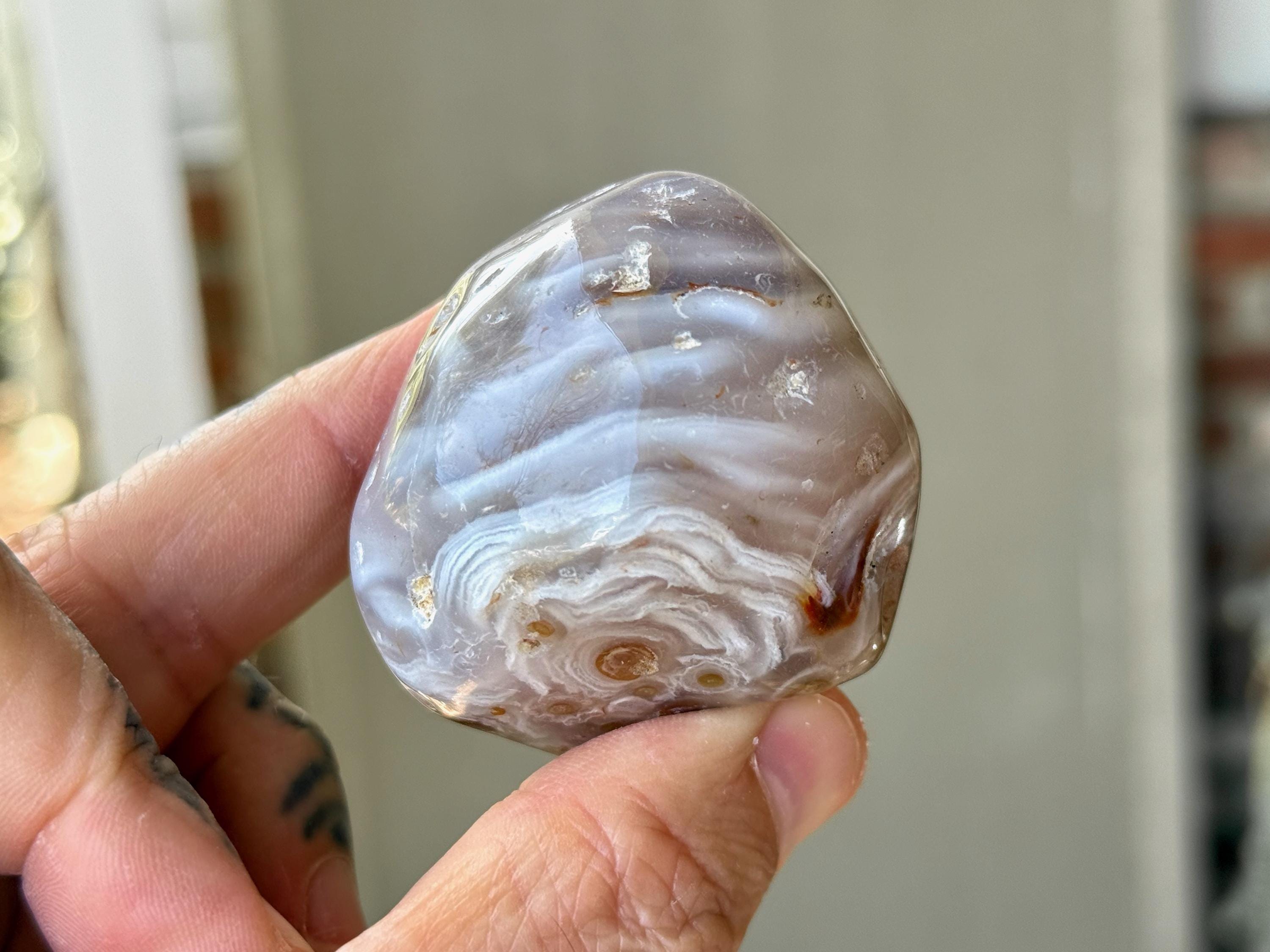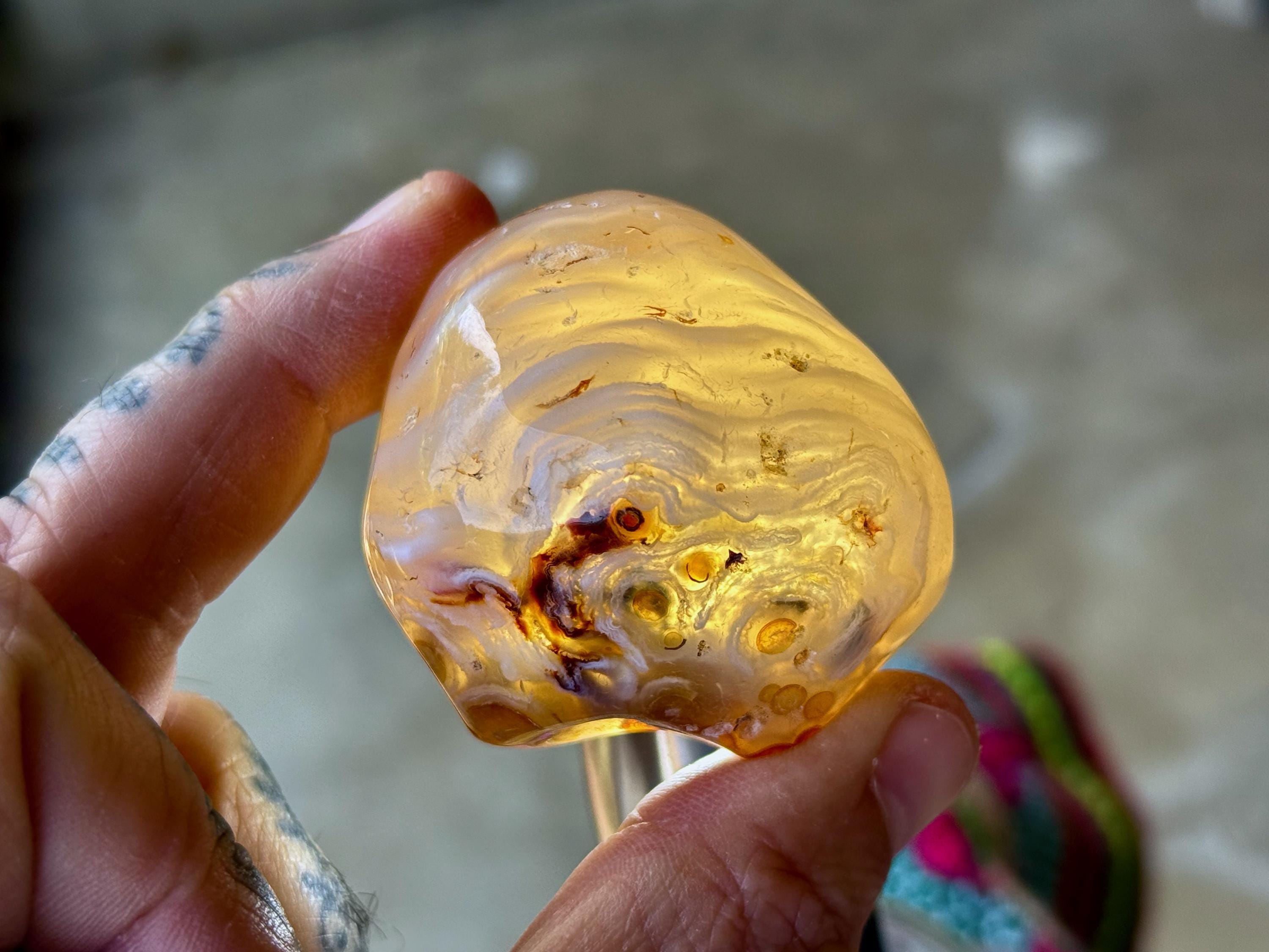 This Agate has outstanding translucency when backlit, which makes it easy to see the water swishing inside. The video shows this and it will be much more evident in person. We recommend using a strong light to backlight and doing so in a darkened room to fully appreciate the water within. We've also included photos of this piece with backlighting (Photos 2-3).