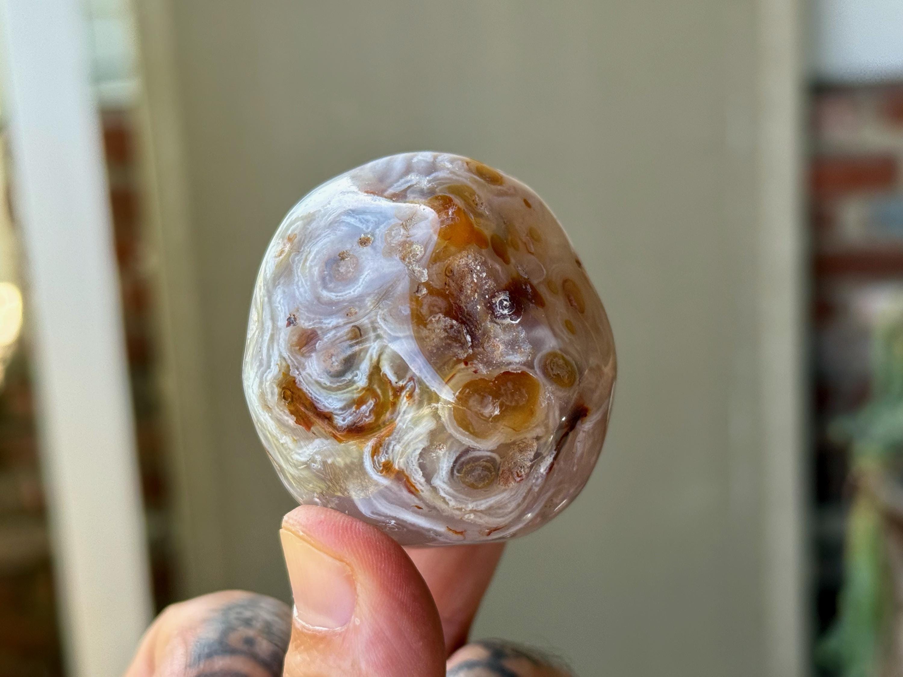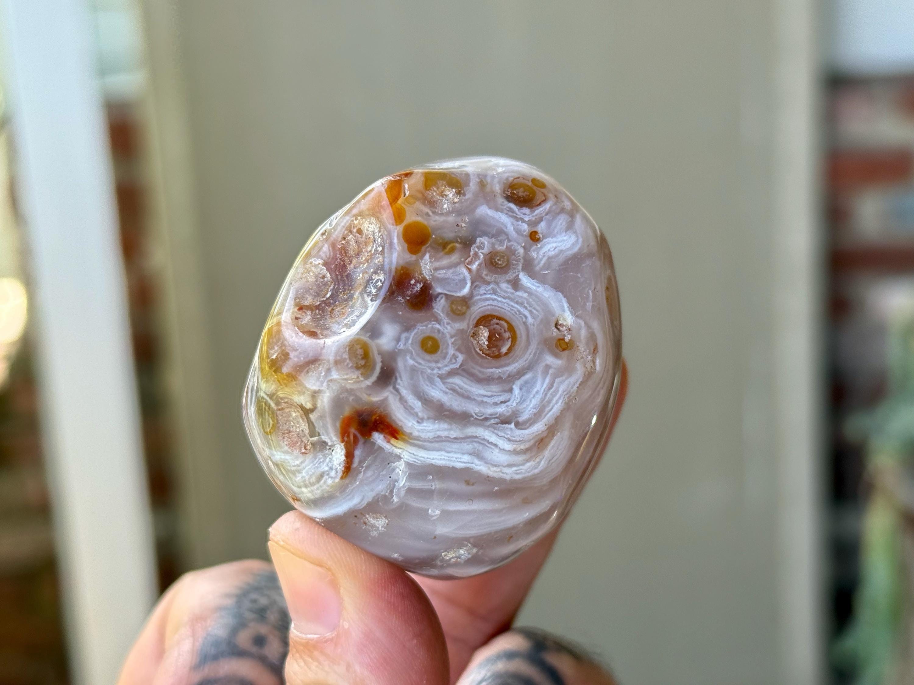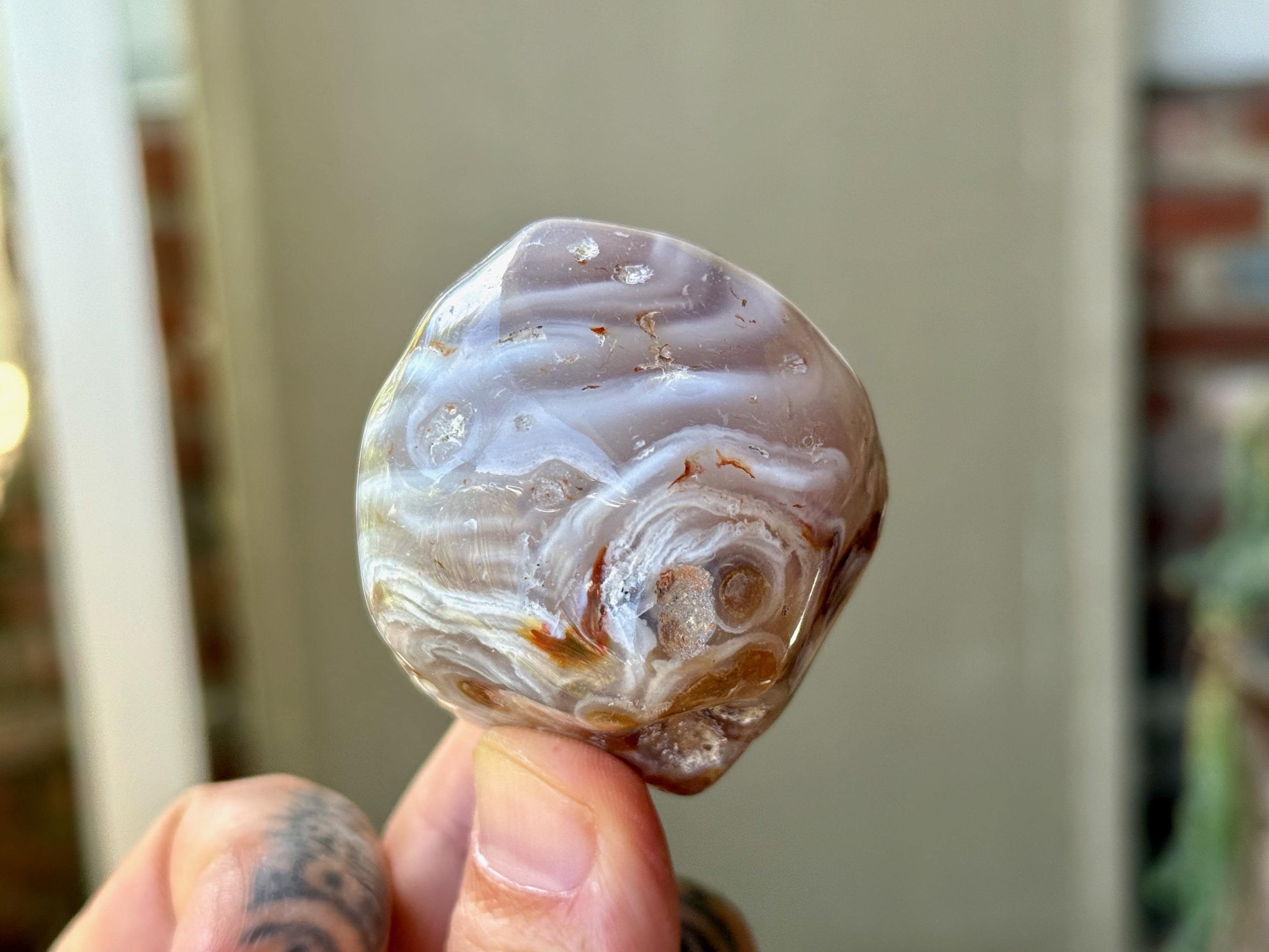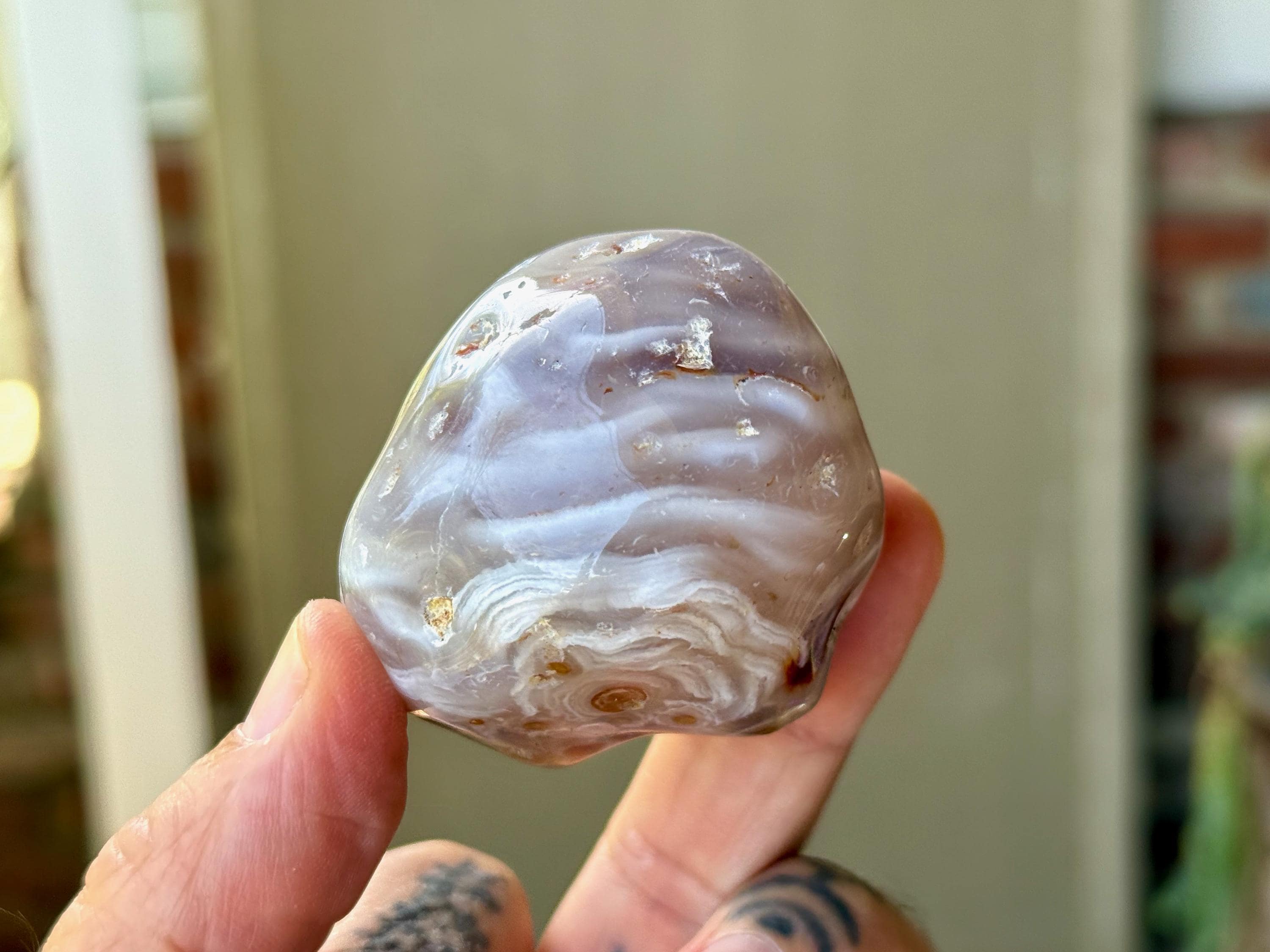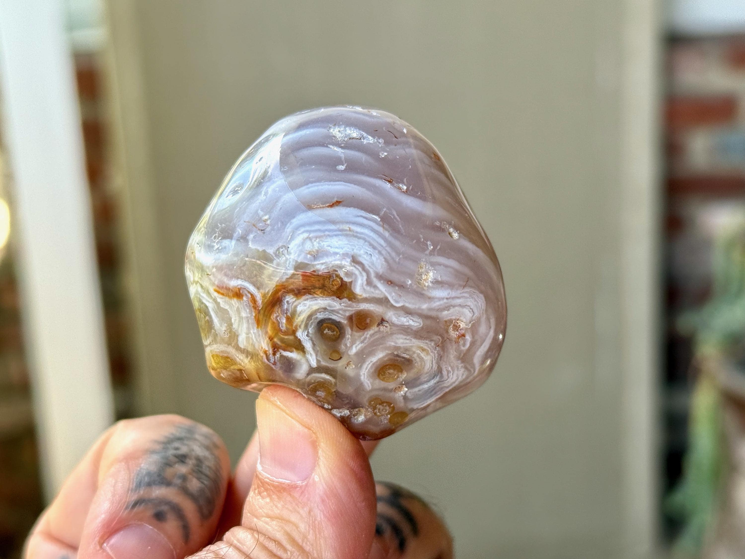 This Agate has outstanding translucency when backlit, which makes it easy to see the water swishing inside. The video shows this and it will be much more evident in person. We recommend using a strong light to backlight and doing so in a darkened room to fully appreciate the water within. We've also included photos of this piece with backlighting (Photos 2-3).