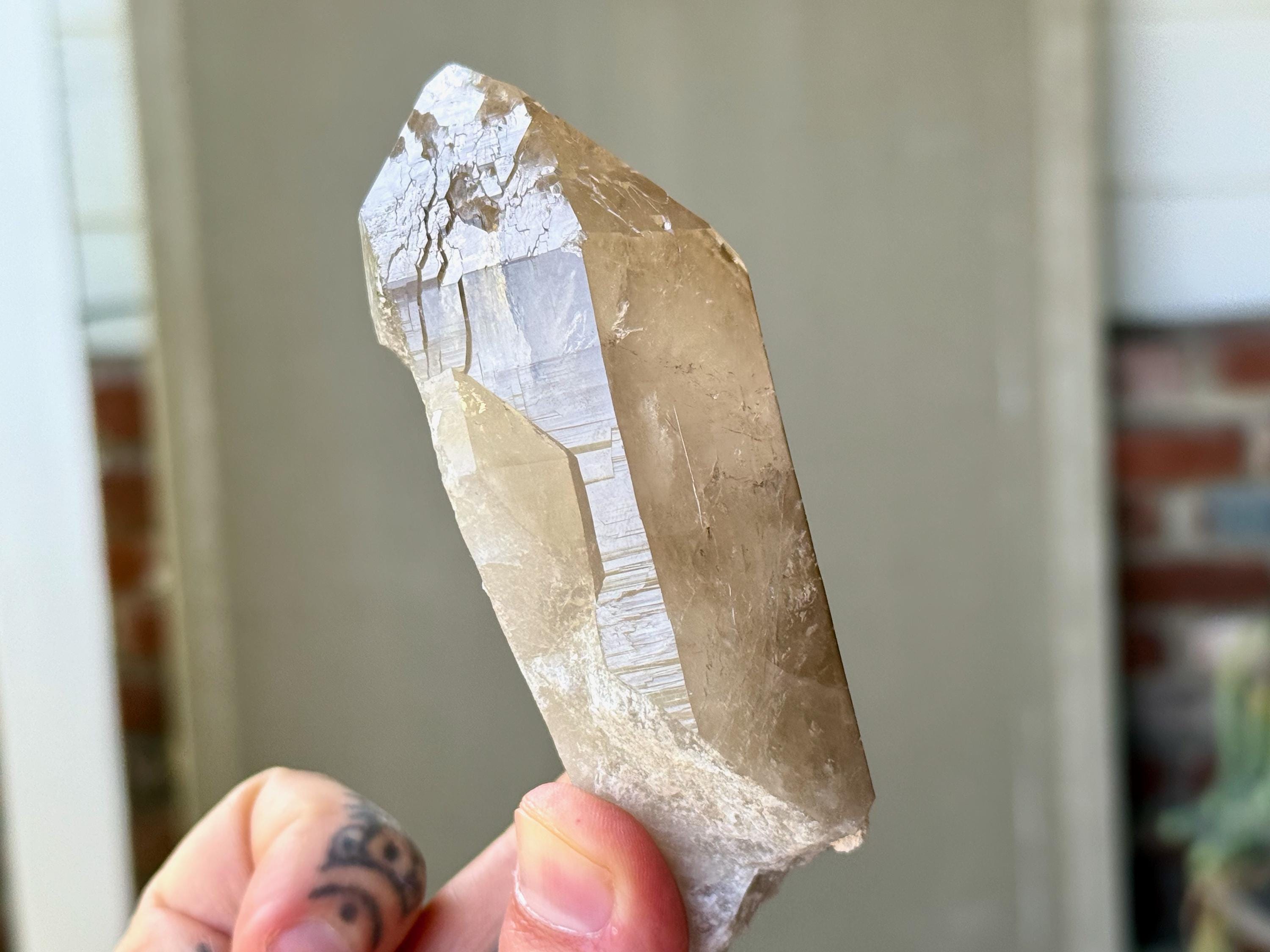 Brilliant luster and a mild smoky hue to this handsome Smoky Cathedral Quartz crystal. This piece has some Elestial qualities, but it also features the classic "barcode"-like cathedralization on its sides and unique impressions on its main facets.