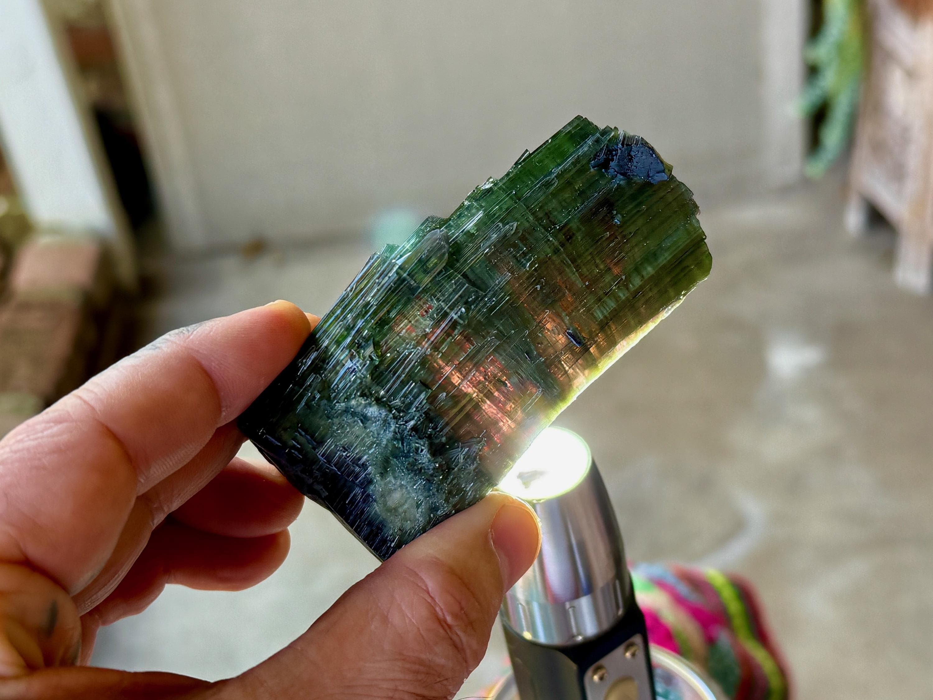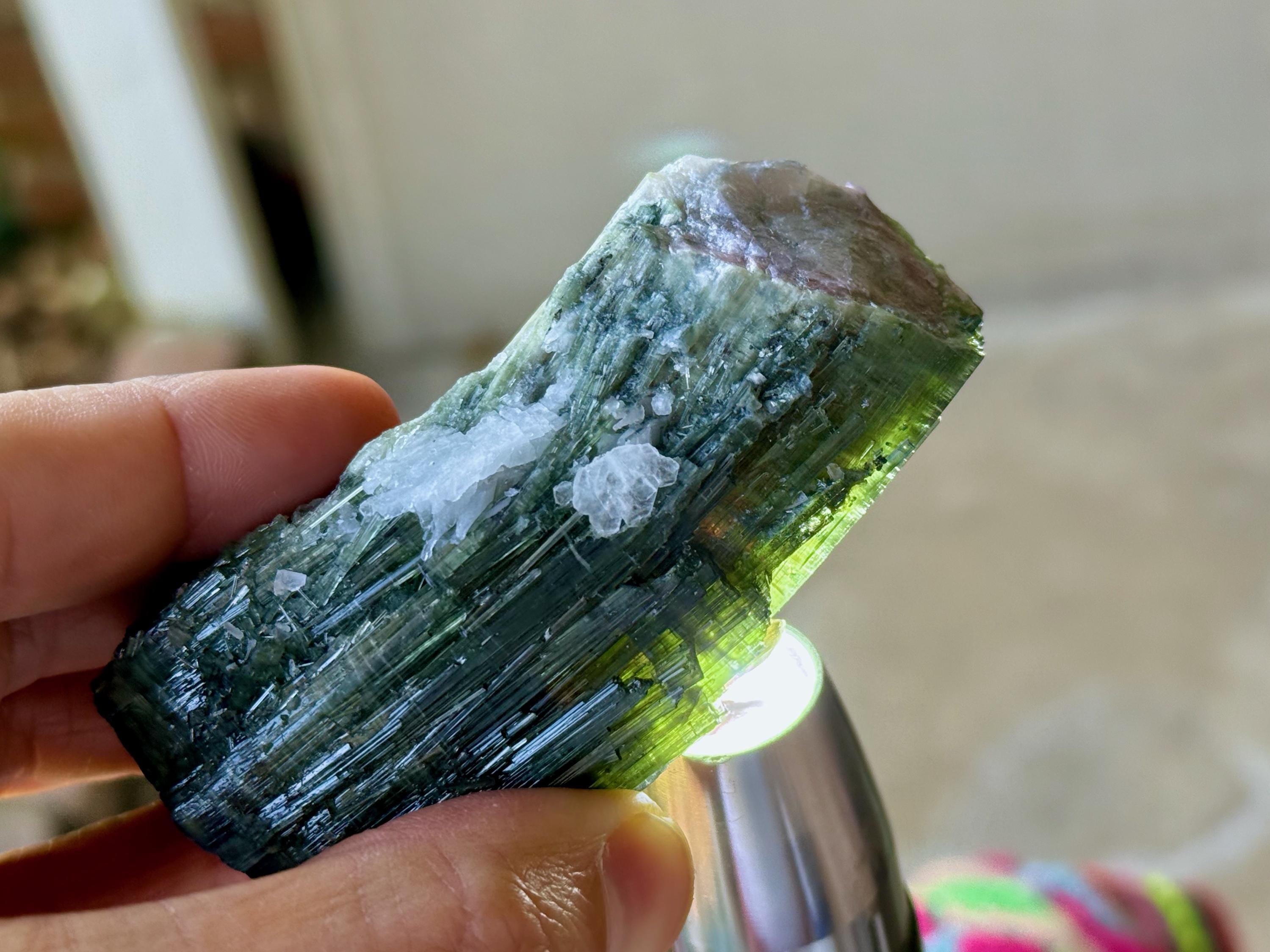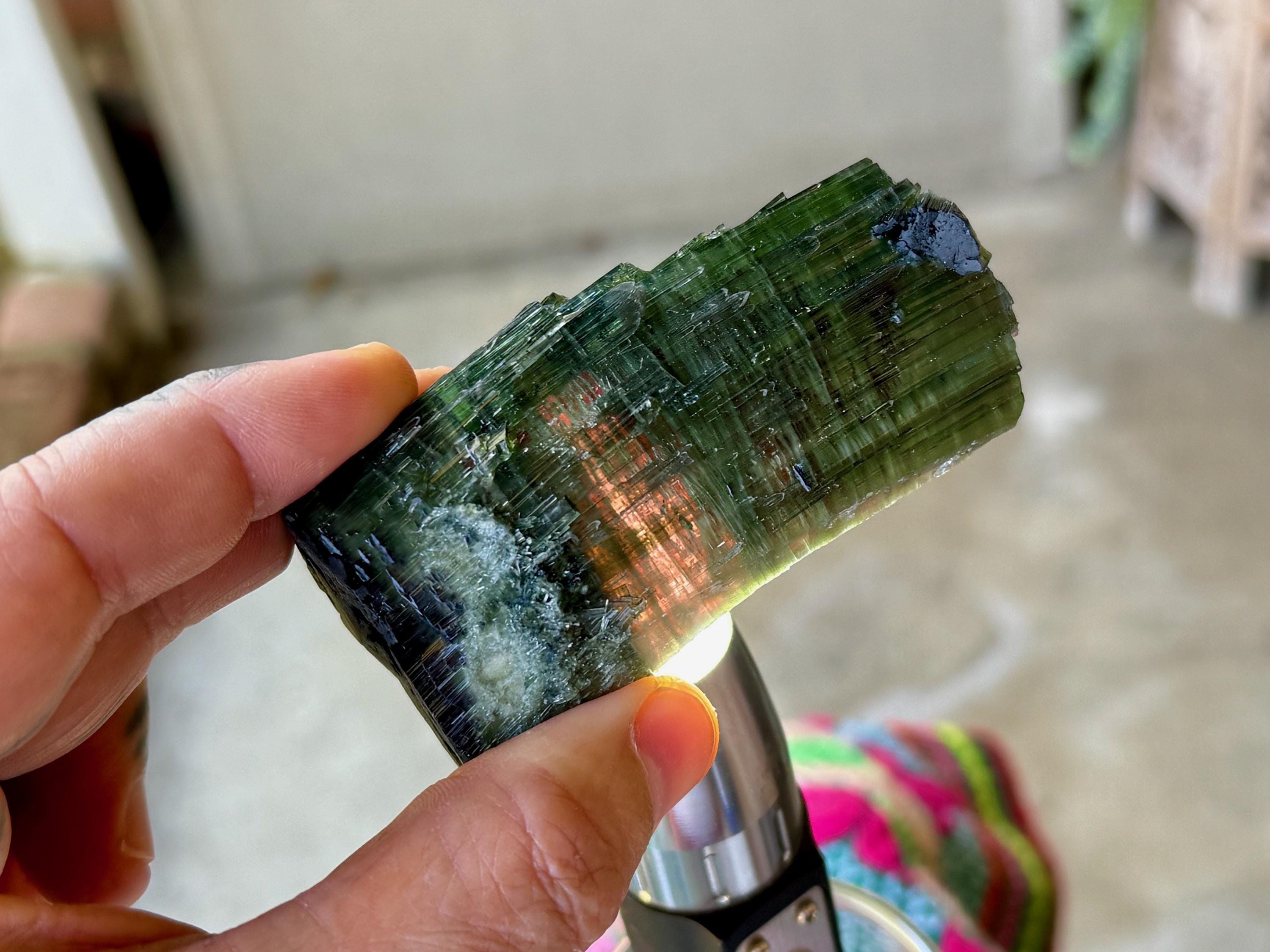 Green Tourmaline purifies and strengthens, allowing one to energetically carry greater amounts of Life Force (Prana Energy). As more energy is carried within the physical body, higher degrees of consciousness can be maintained. It is a wonderful protection stone, deal for sealing holes in the aura that leave one vulnerable to negativity.