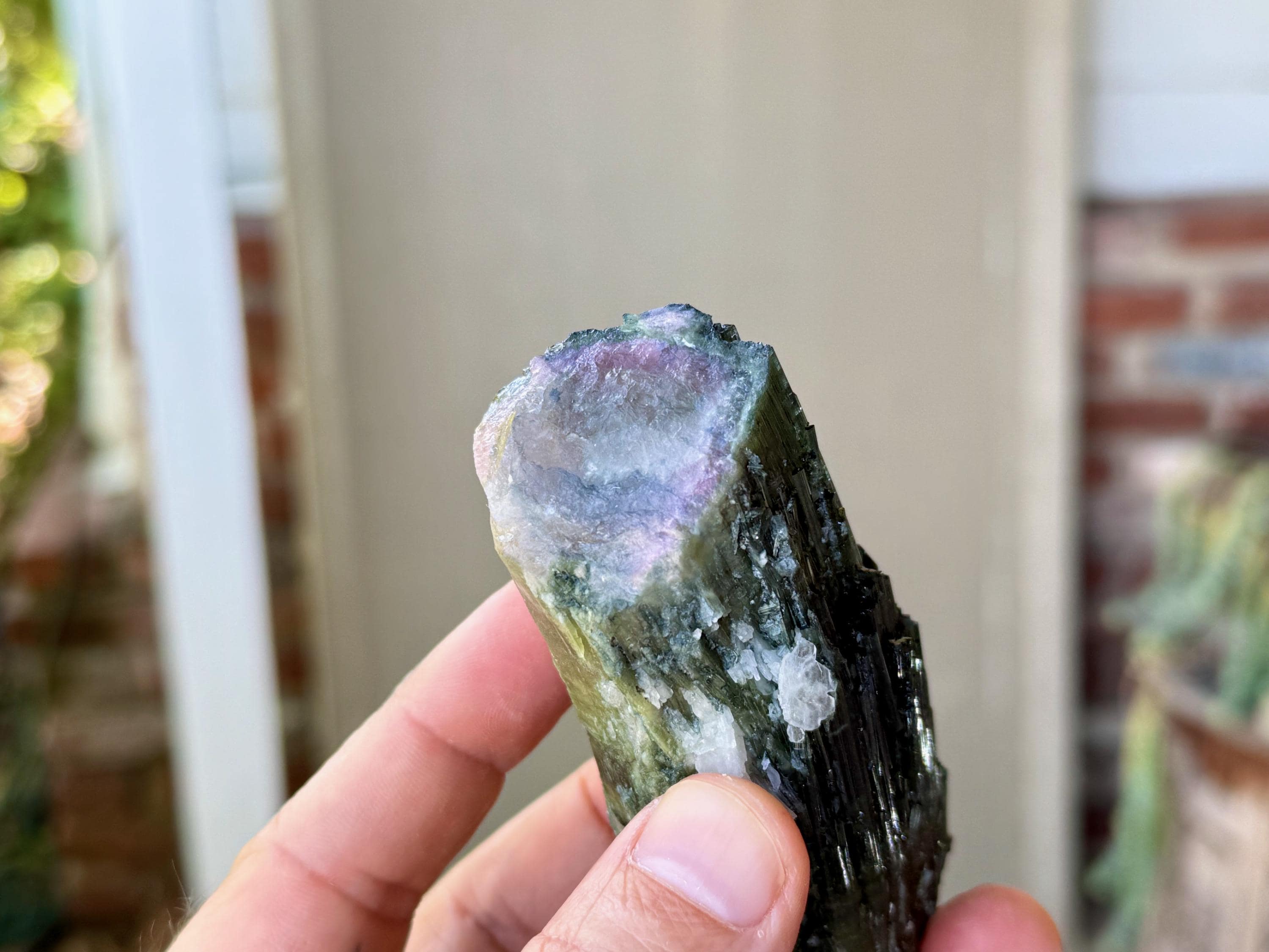 This piece has a rich Pink Tourmaline core, which we can see peeking out at the top (Photo 6) and at the upper portion of the backside. The big surprise in this piece is that despite its thickness, it has some wonderful translucency when backlit, which also allows us to see this pink "heart" of the crystal (see Photos 3-5).