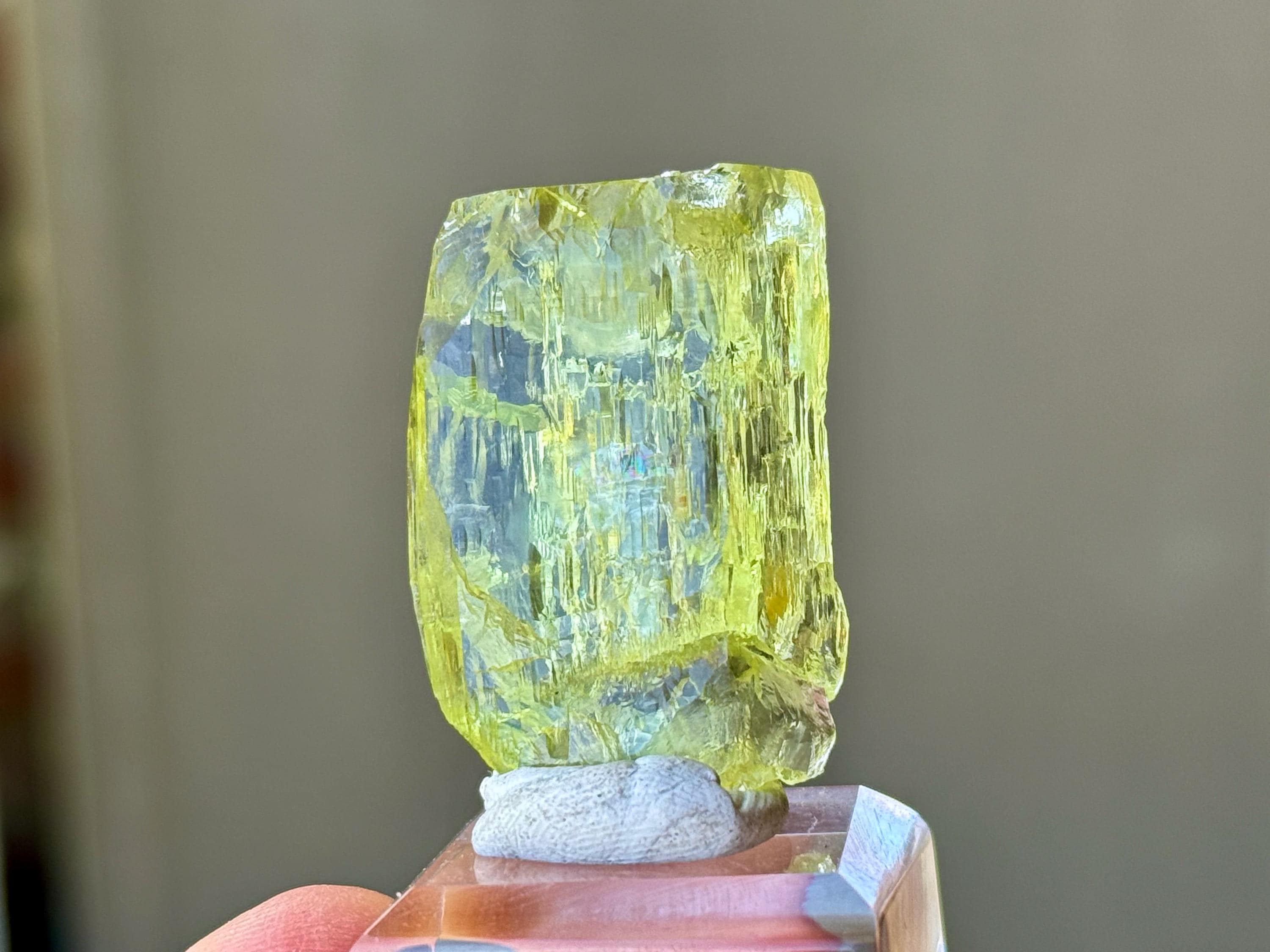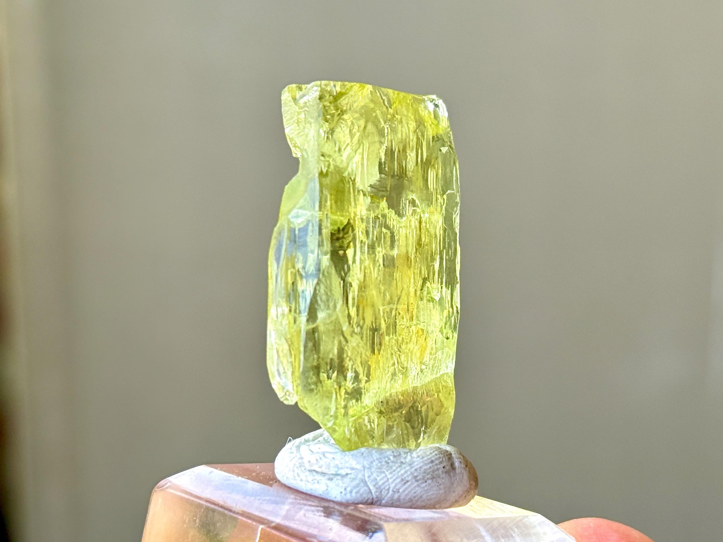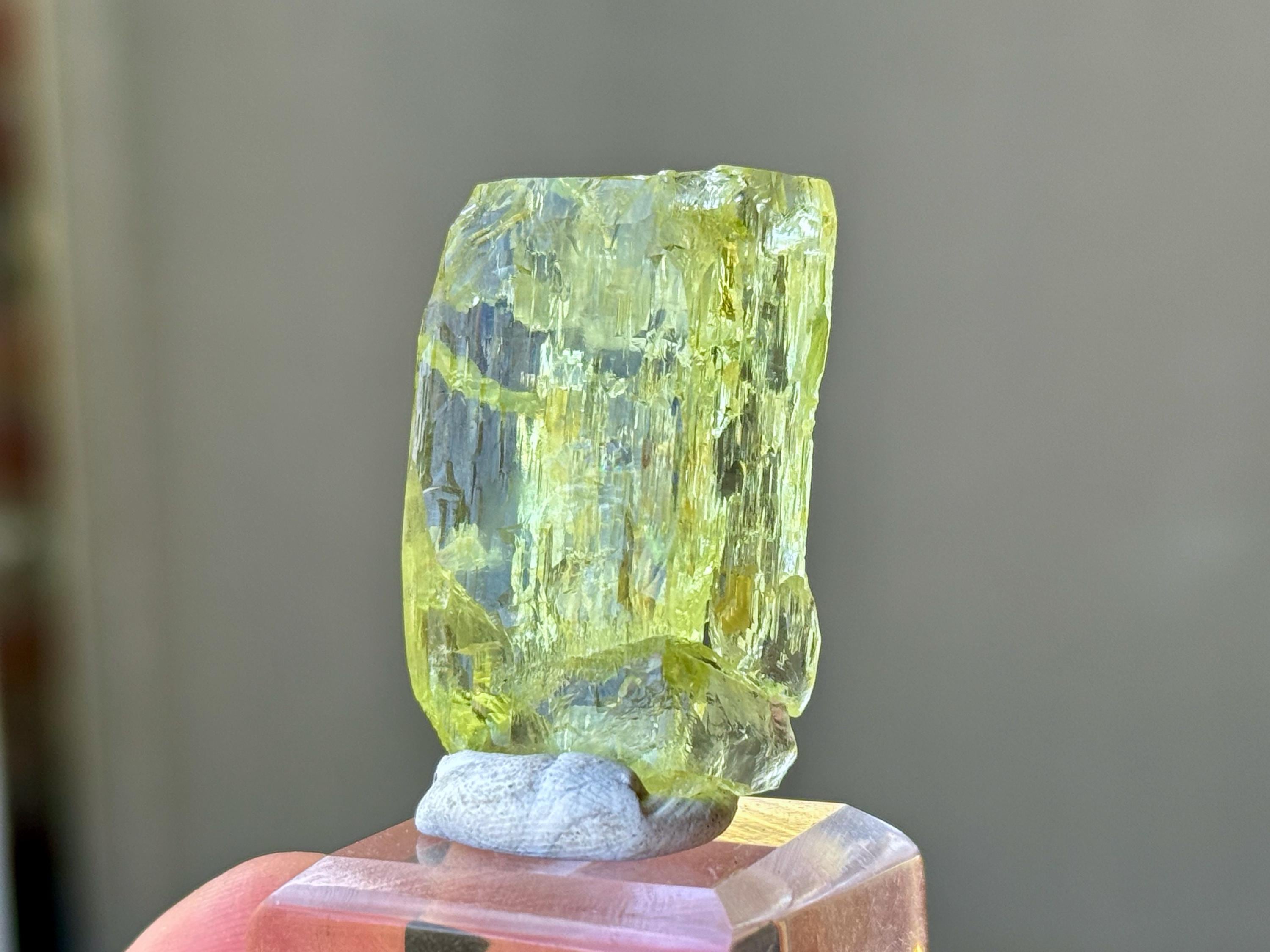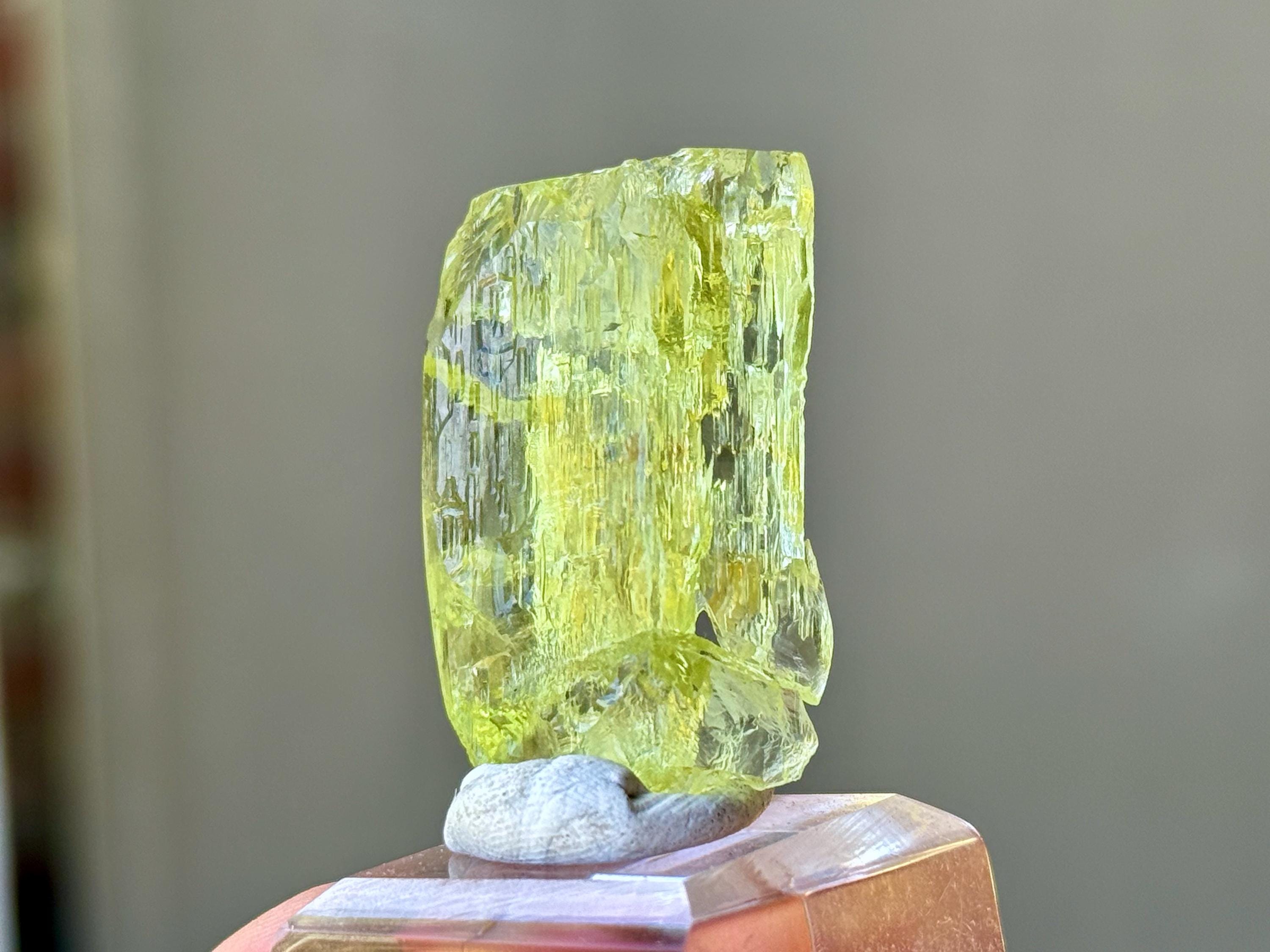 Superb quality to this stunning Heliodor crystal with a glassy complexion and vibrant Chartreuse yellow hue. It features a broad formation with beautiful vertical striations and mysterious etchings throughout.